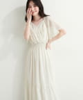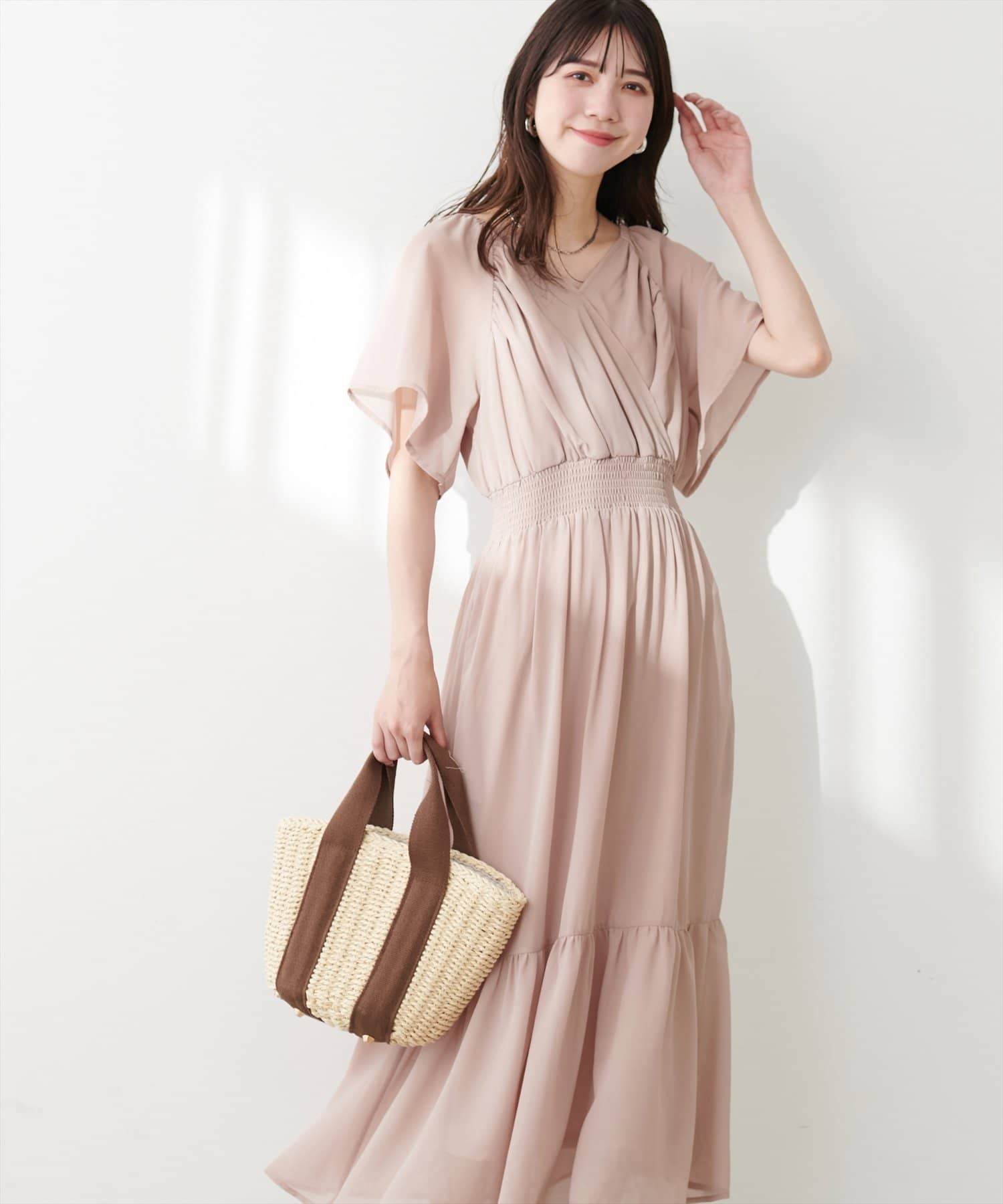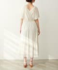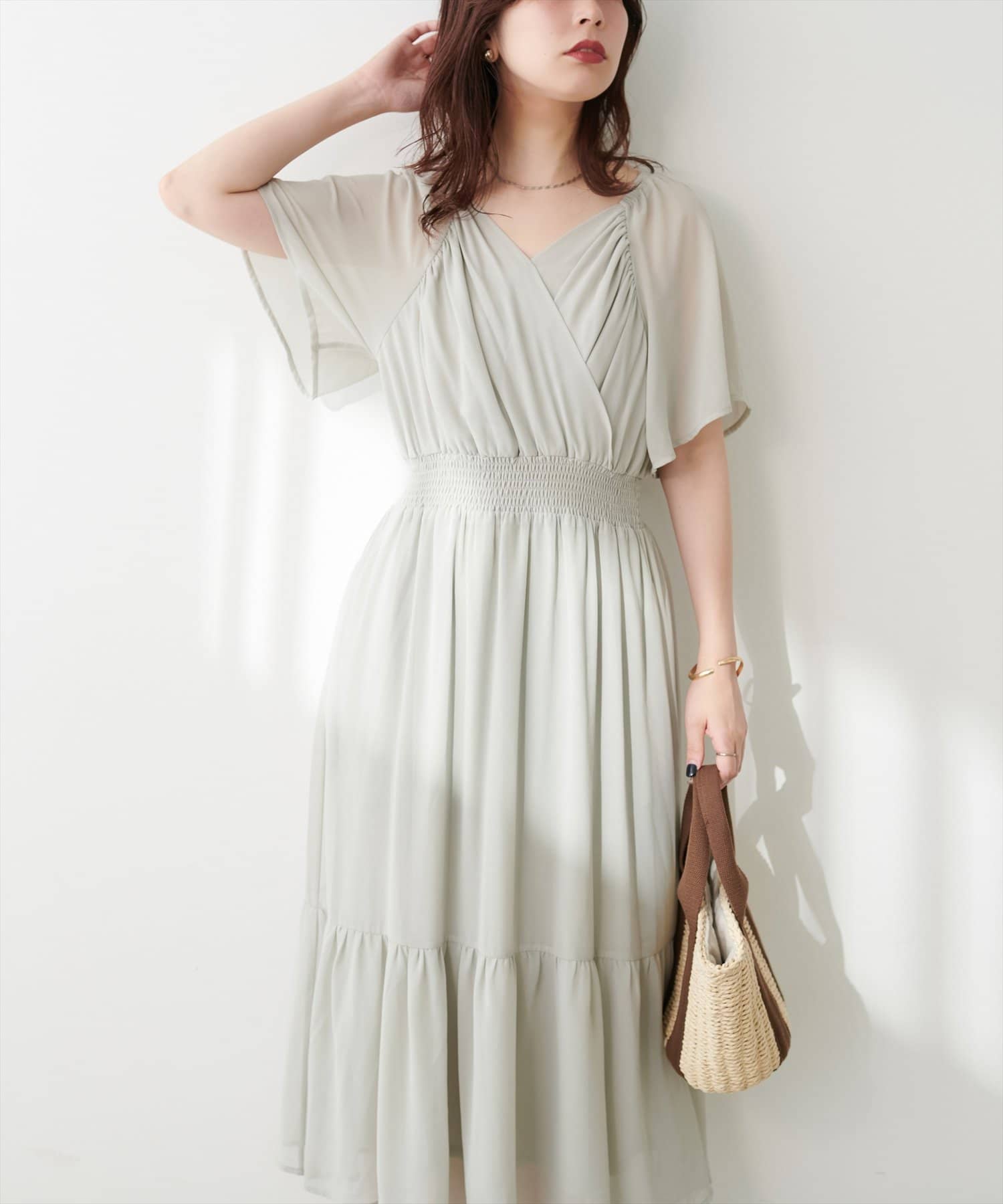 胸元のカシュクール部分はボリューム感を抑え顔周りがスッキリ見えするデザインに。