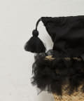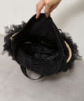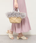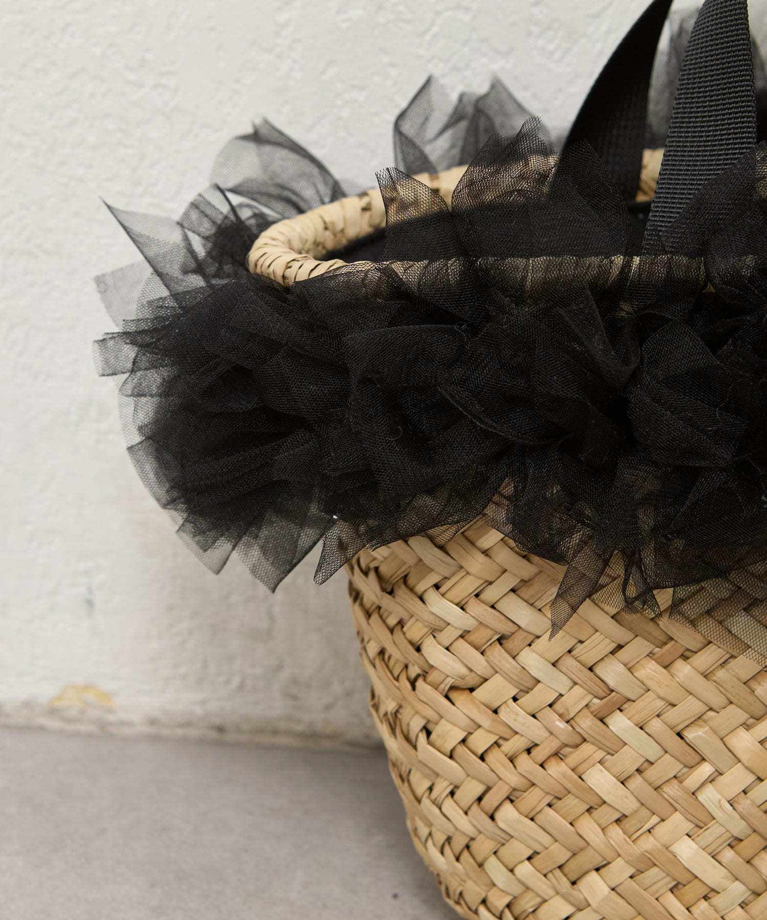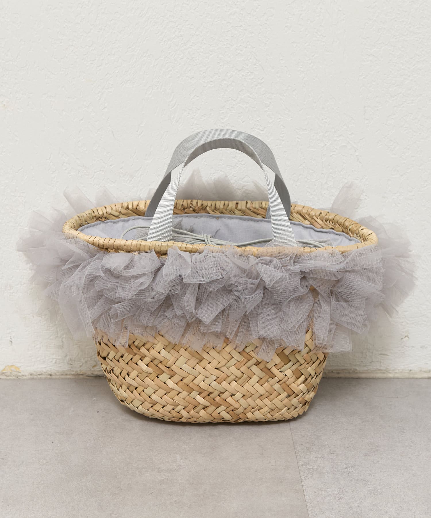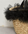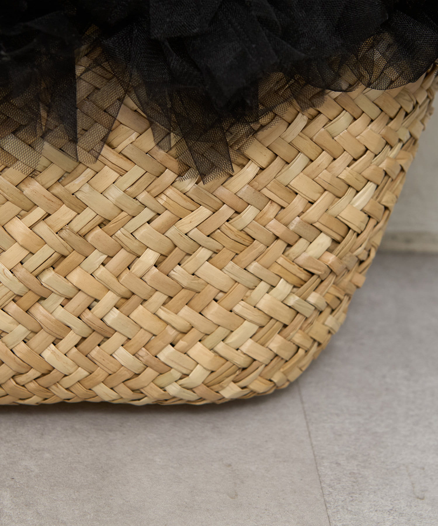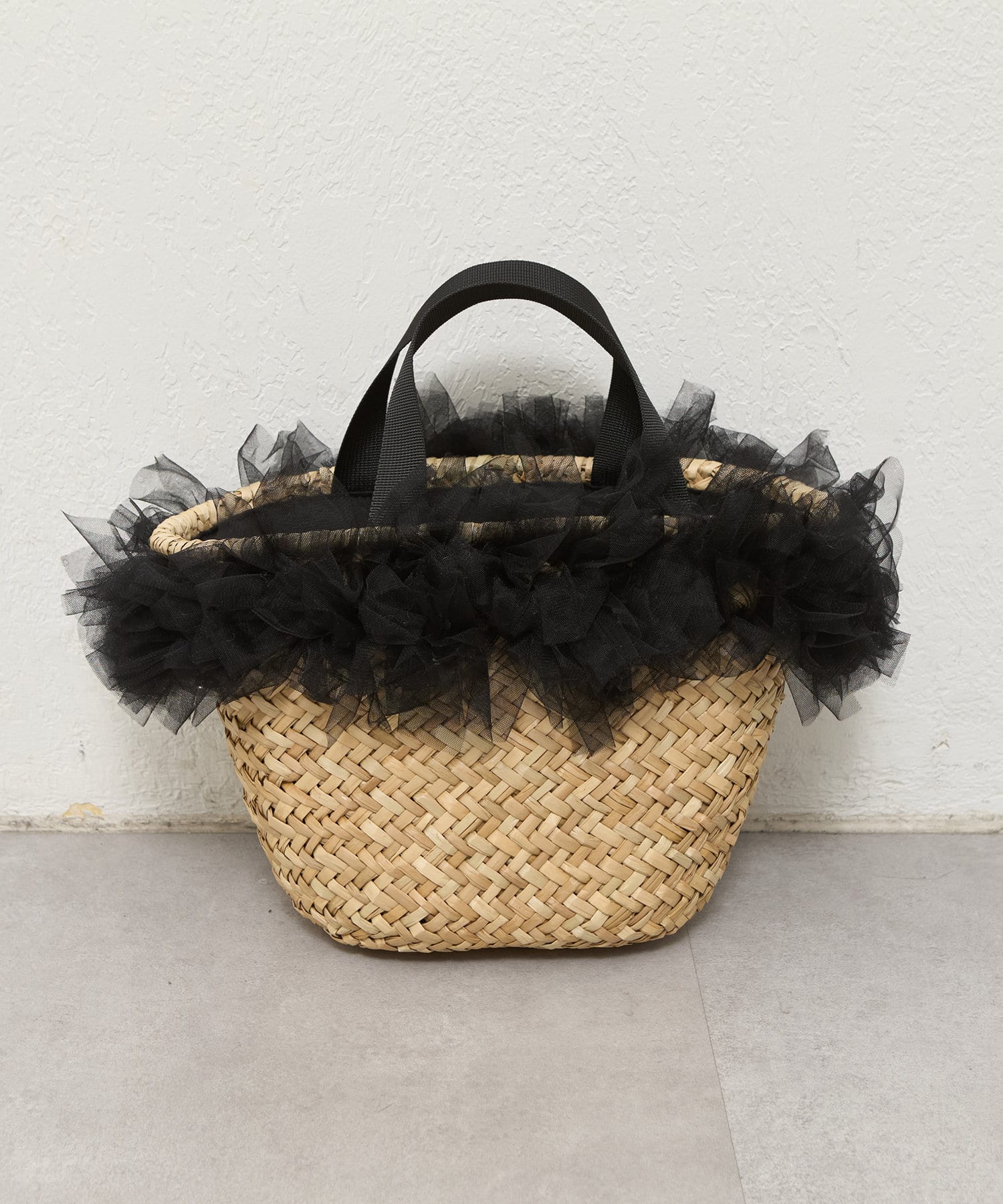 どこか夏を感じさせるカゴバッグに、トレンドライクなチュールフリンジをプラスしてフェミニンに。