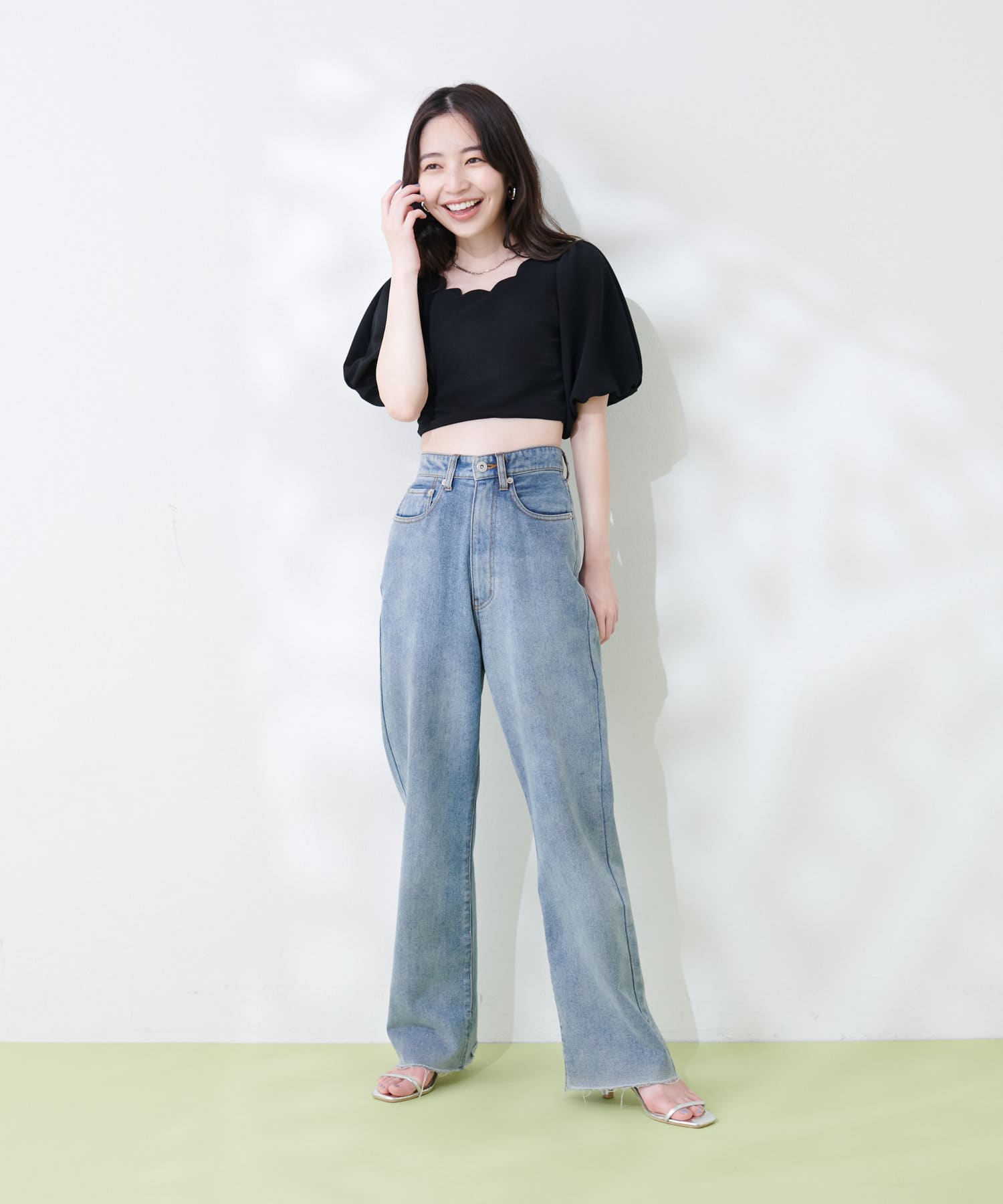パンツはハイウエスト仕様にすることでお腹がすっきり見えるデザインに◎