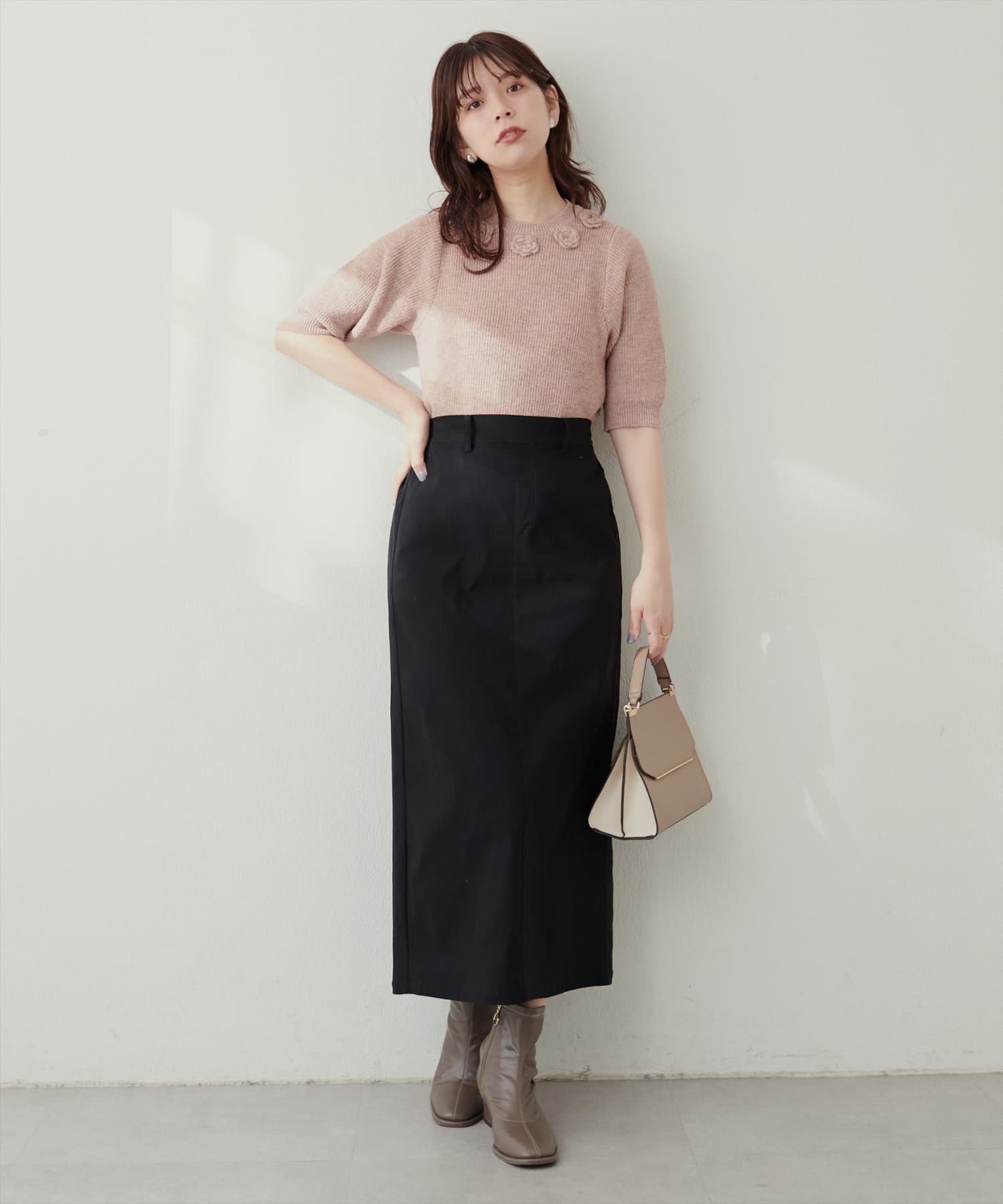 ストンと落ちてすっきりとした印象のシルエットながら、ボディラインを拾いにくくスタイルアップが叶うのが魅力。