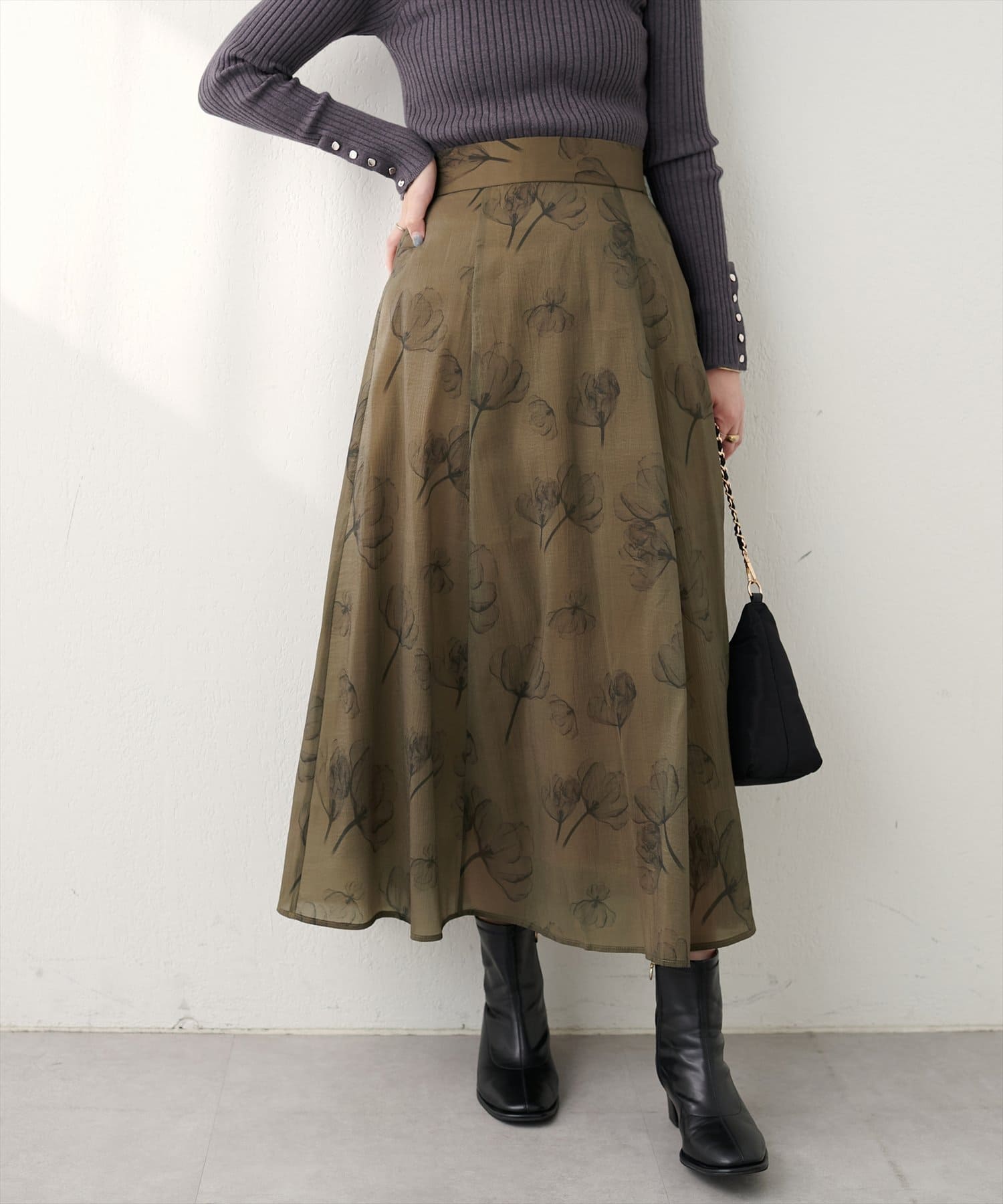 さらふわな揺れ感とややツヤっとした表面感が大人上品なスカート。