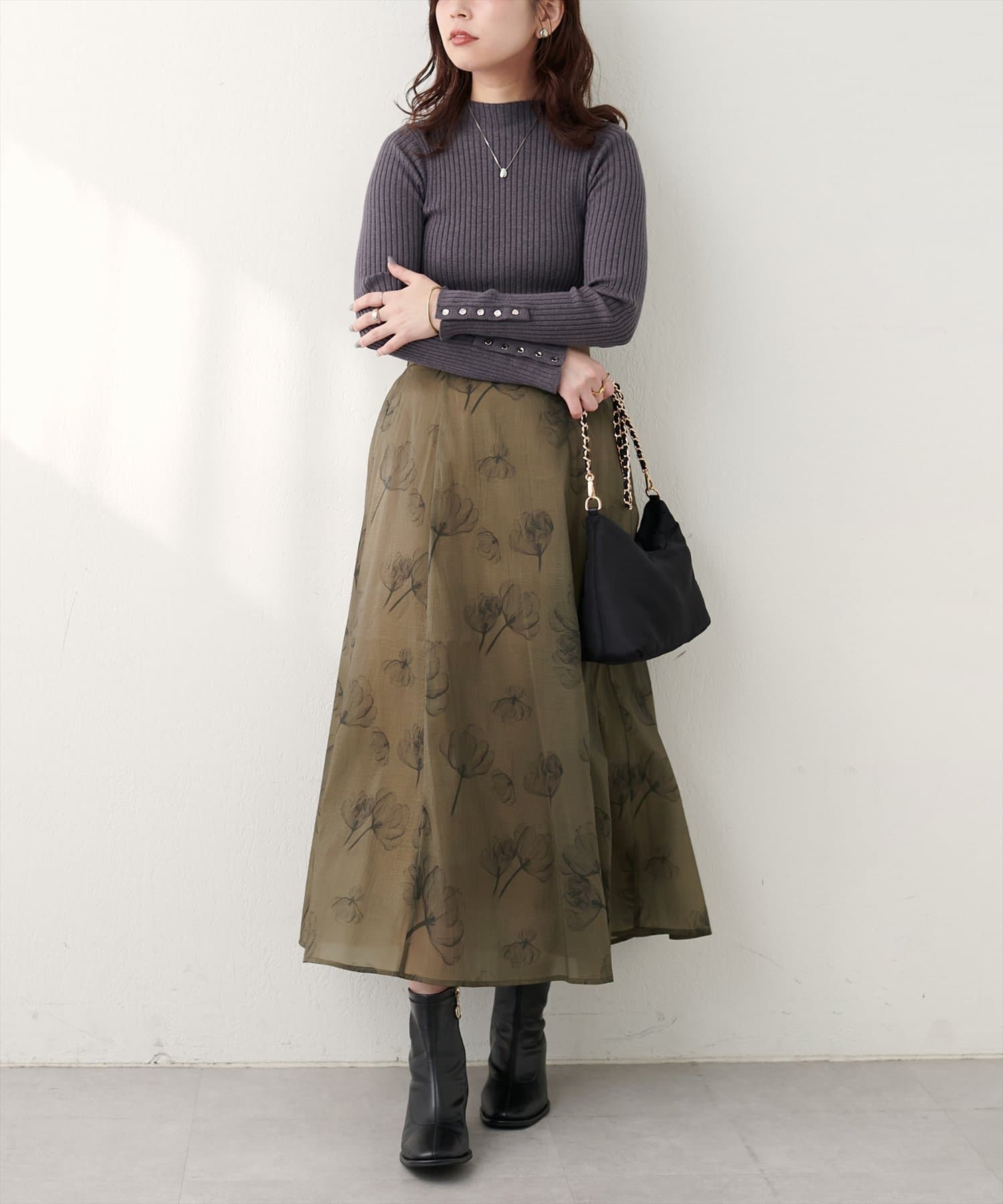 存在感のあるスカートは、シンプルなシャツやブラウスをウエストインしてきれいめに着て頂くのはもちろん、