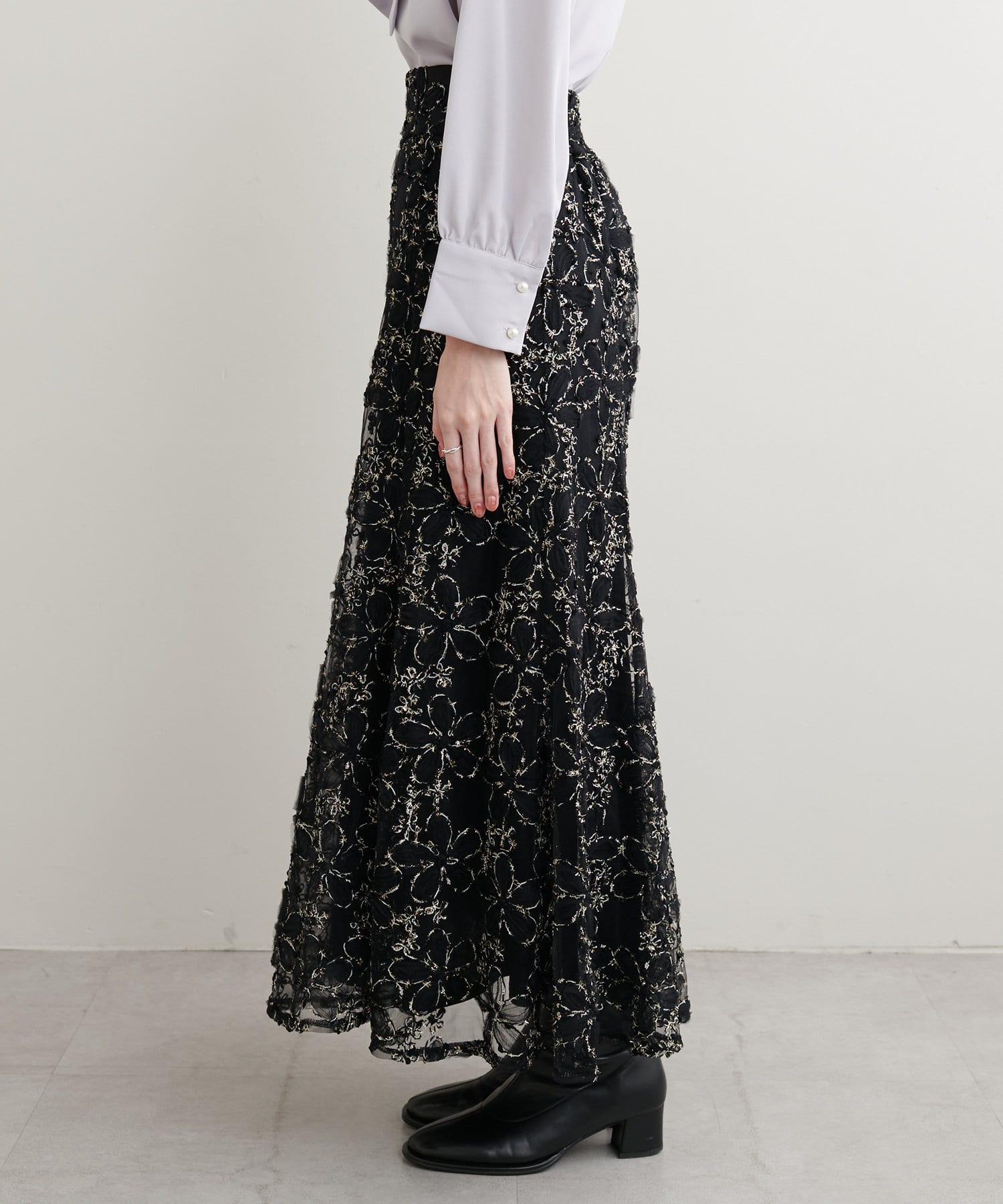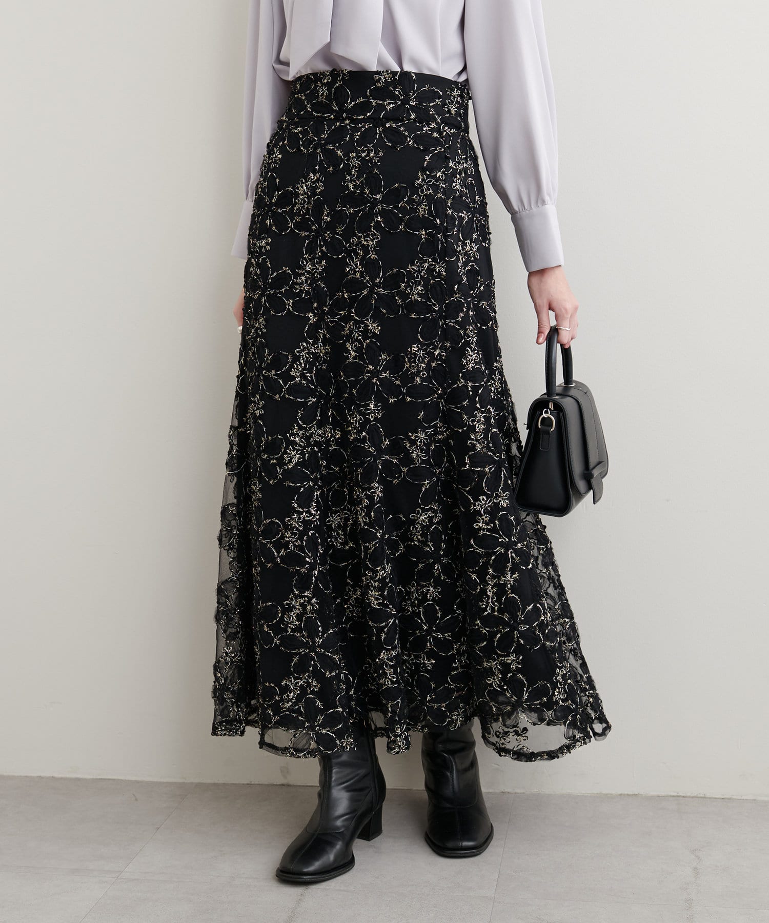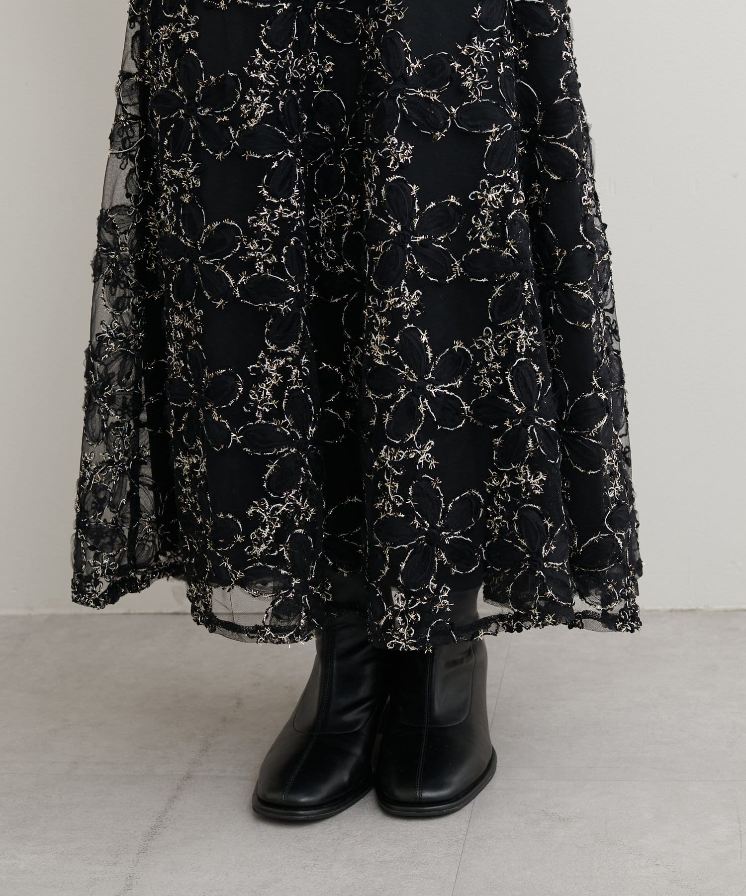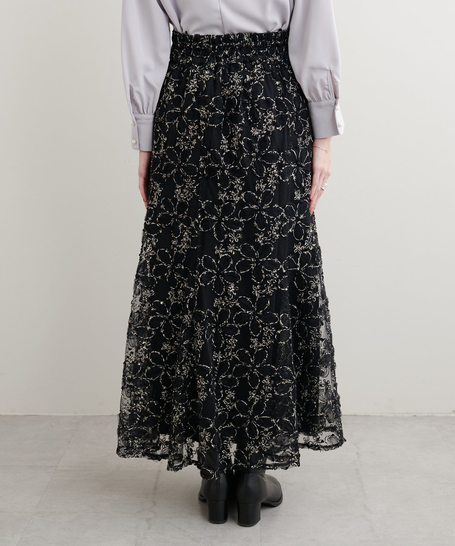 柔らかなレースにラメ糸を使用し花柄を施したお上品スカート。