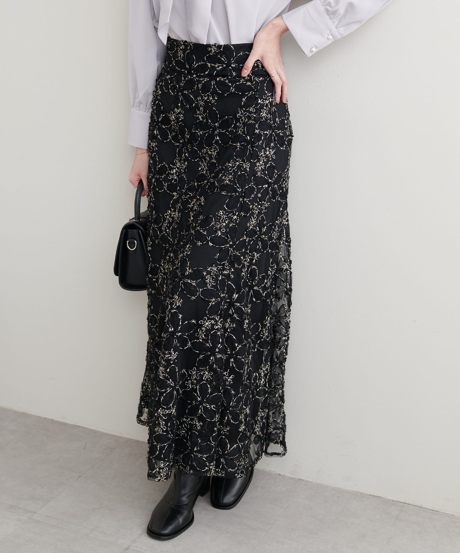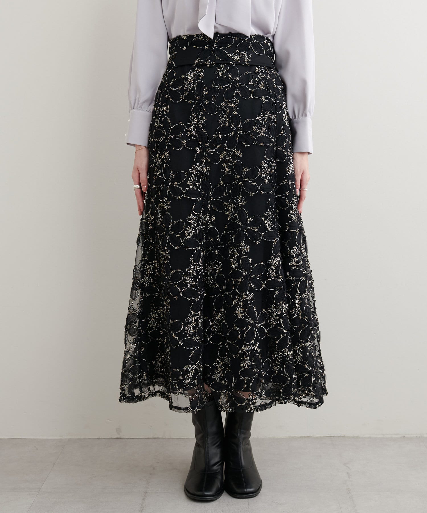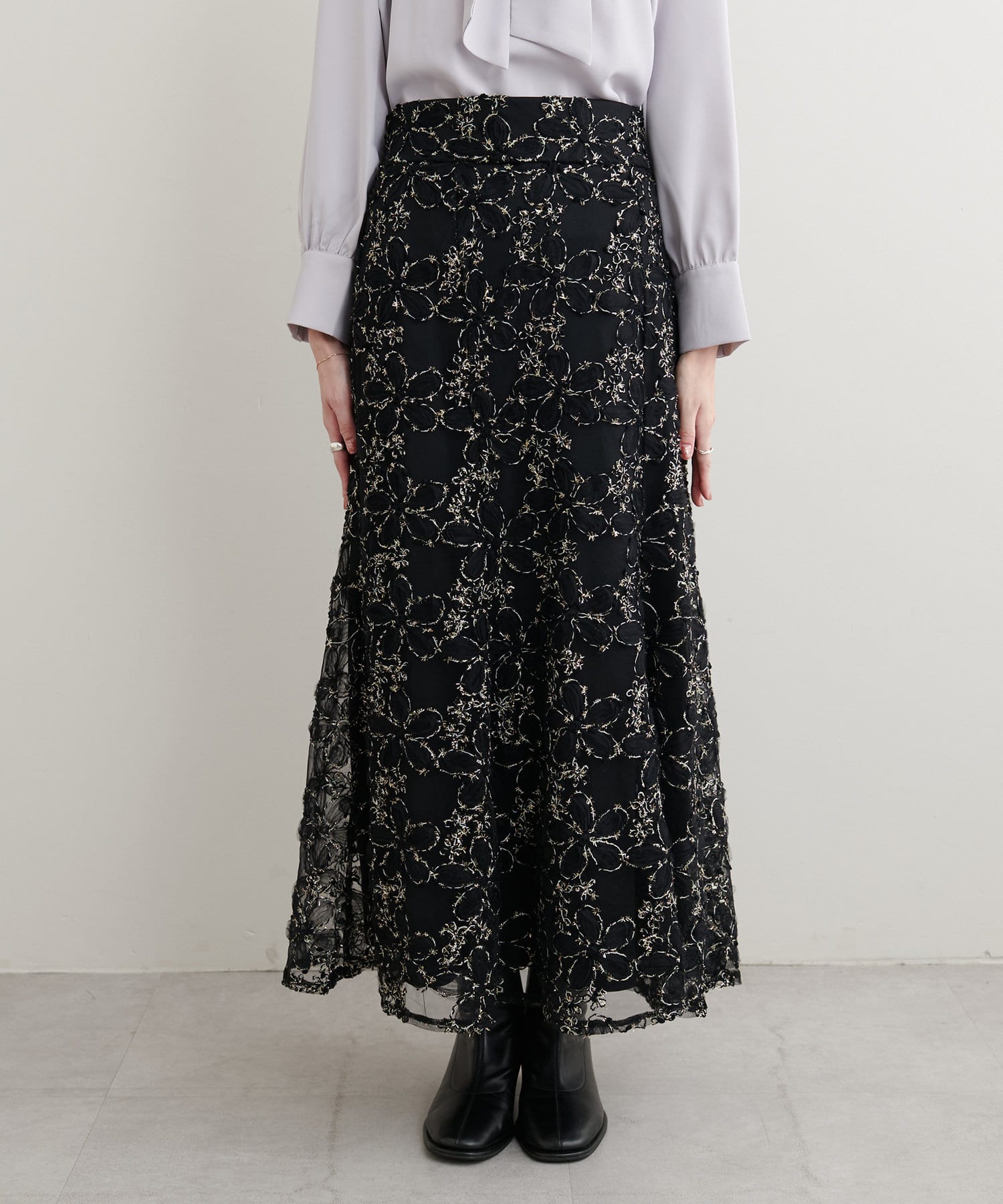 柔らかなレースにラメ糸を使用し花柄を施したお上品スカート。