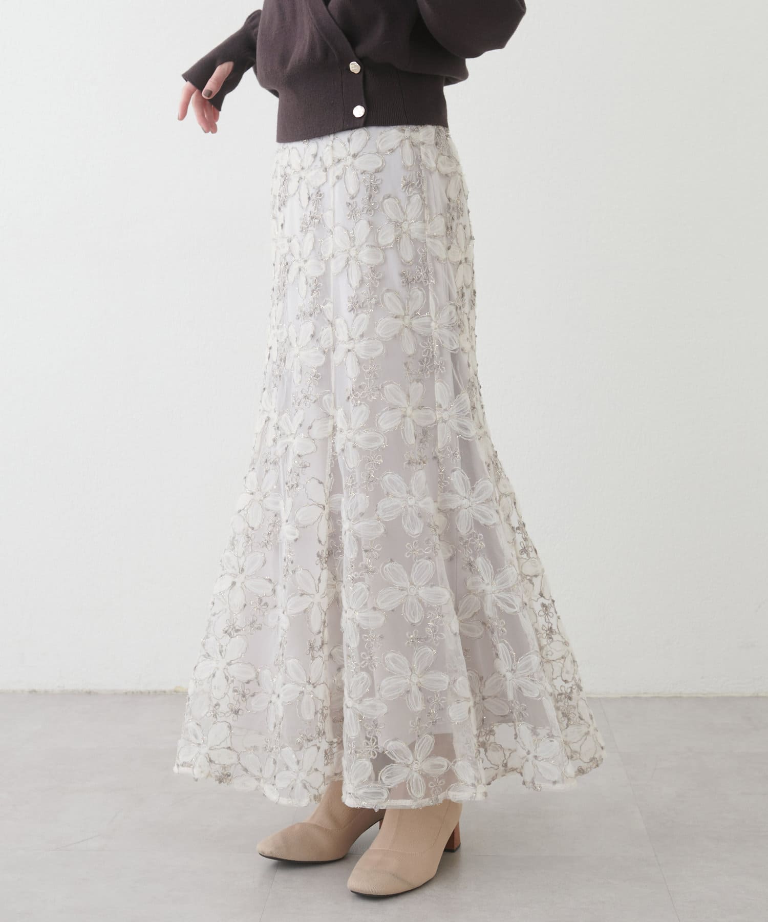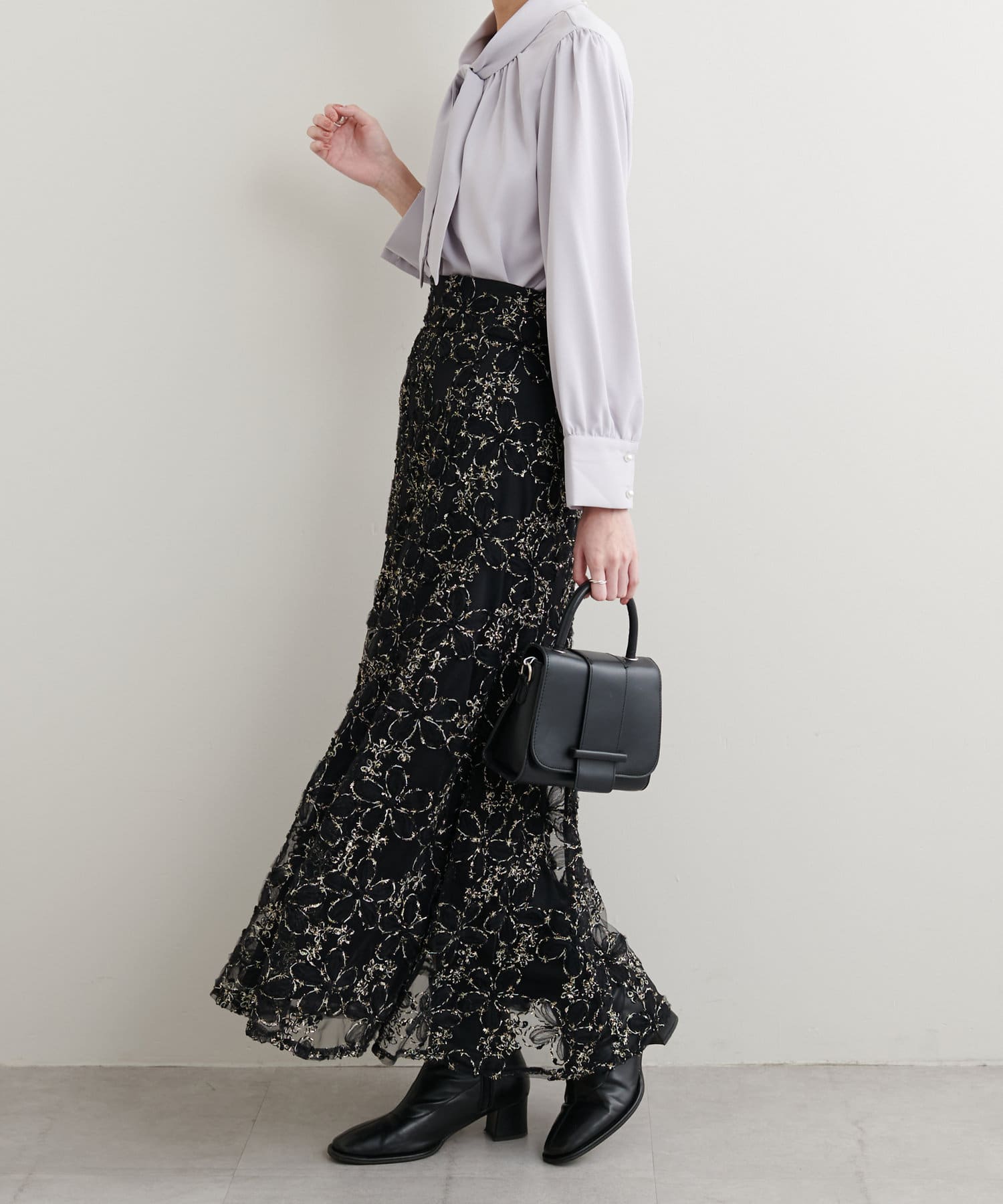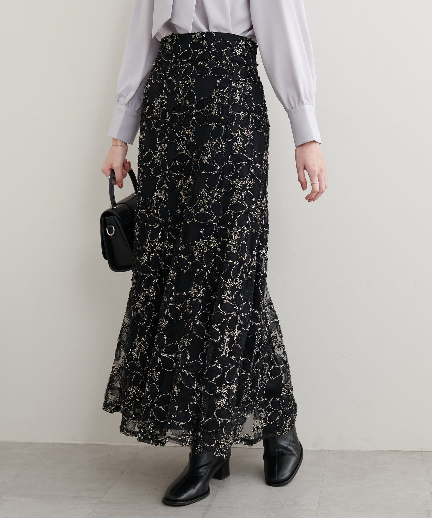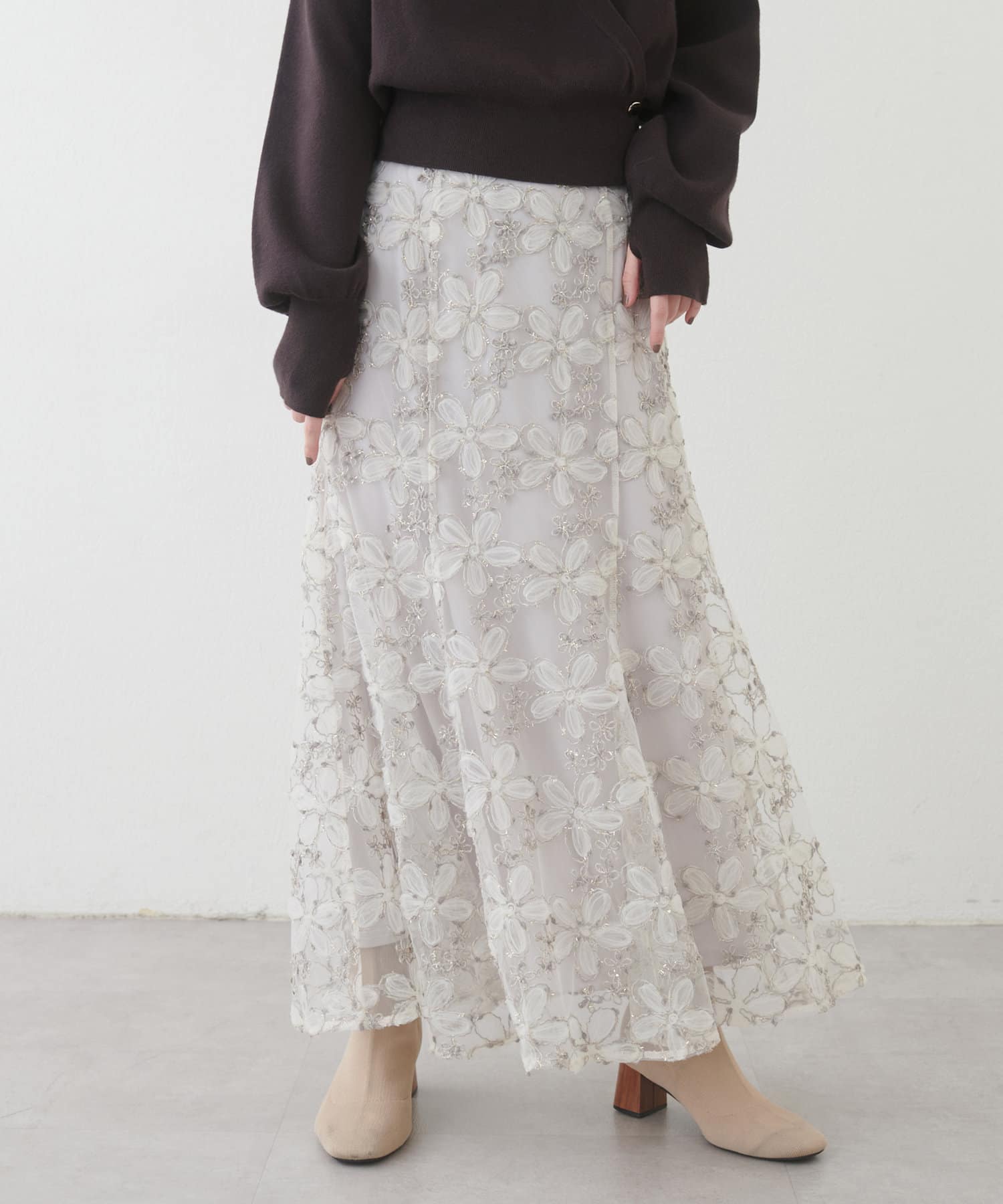 柔らかなレースにラメ糸を使用し花柄を施したお上品スカート。