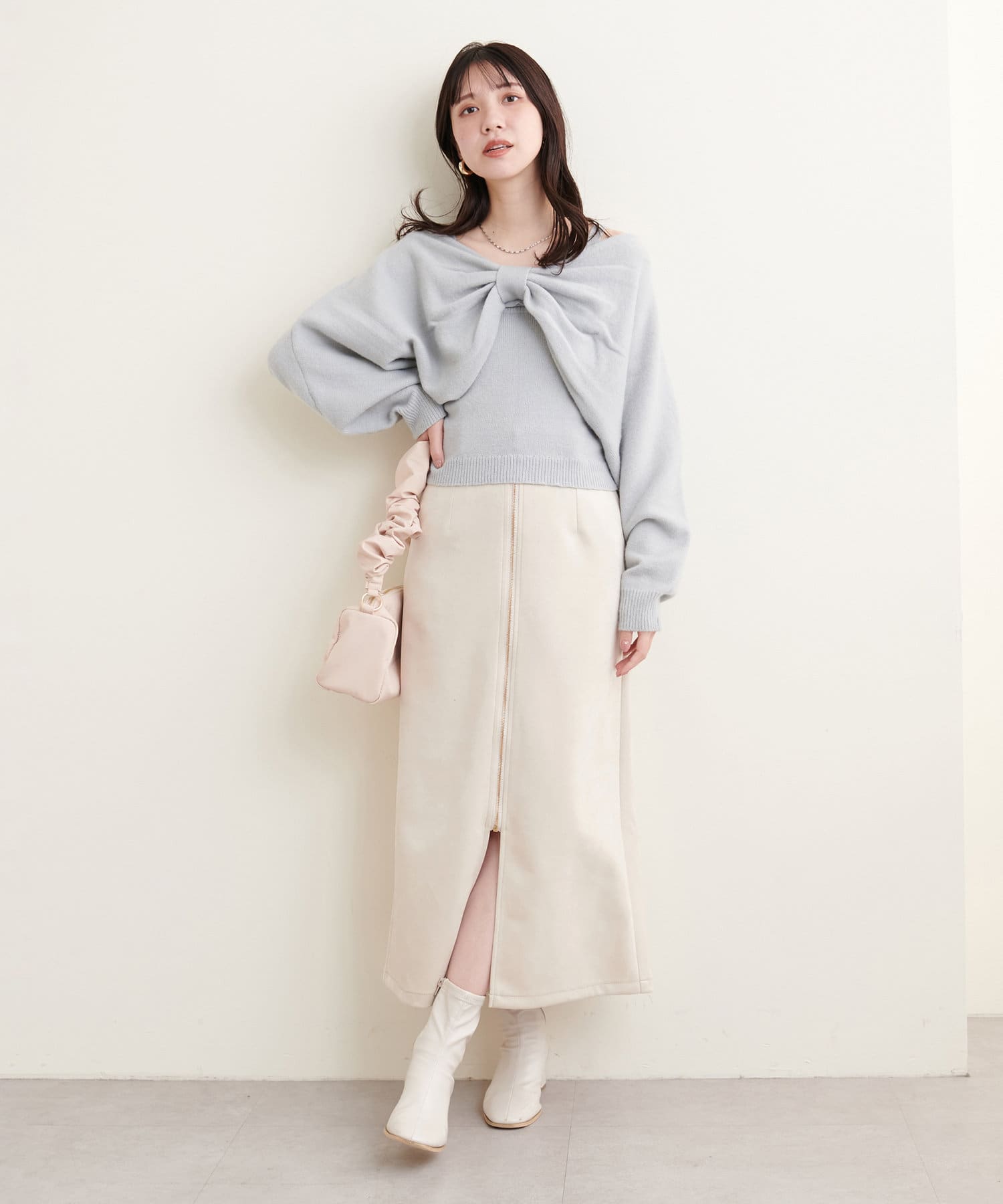 毛足のあるふんわりとしたニットでフェミニンにきめるのはもちろん、