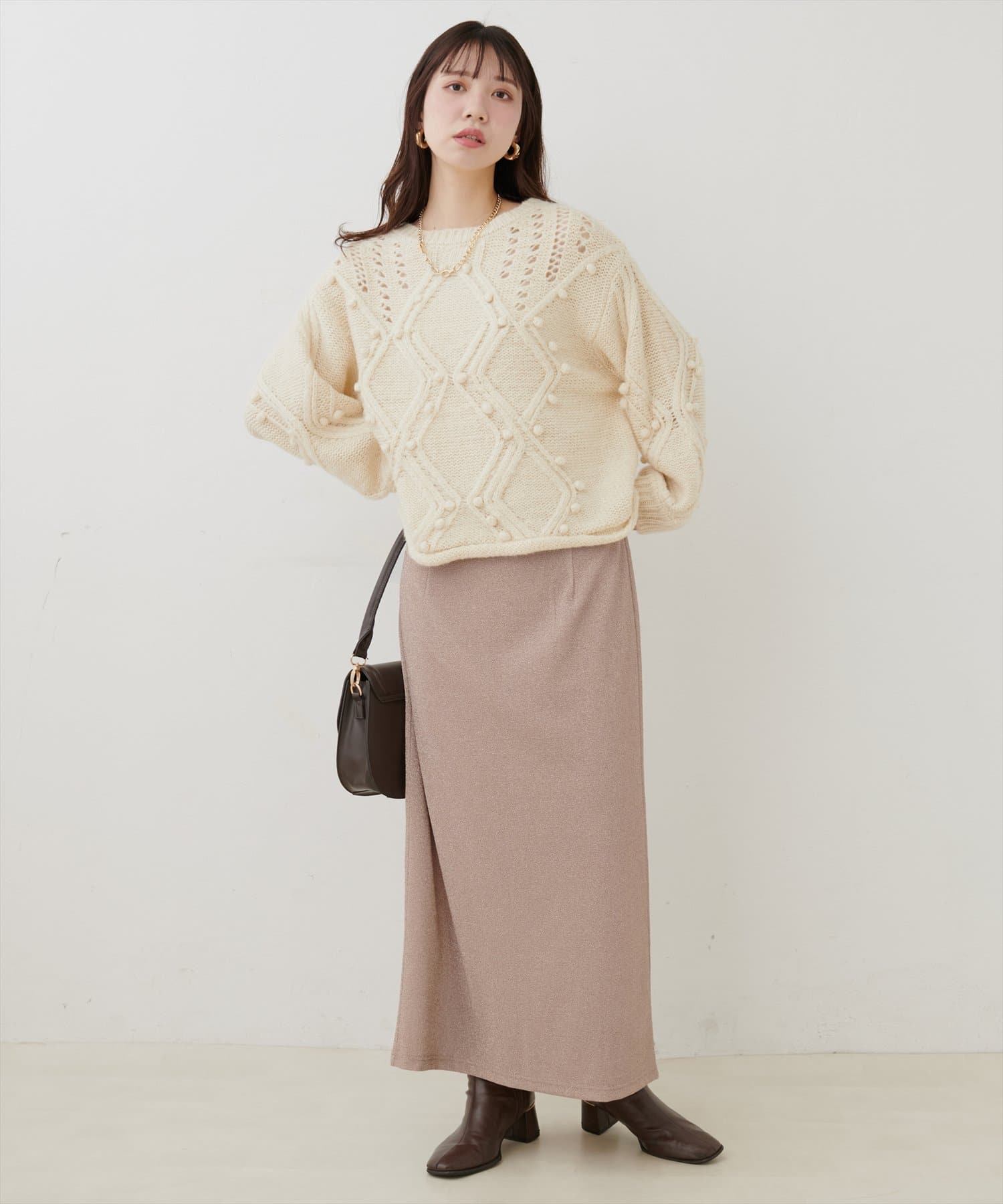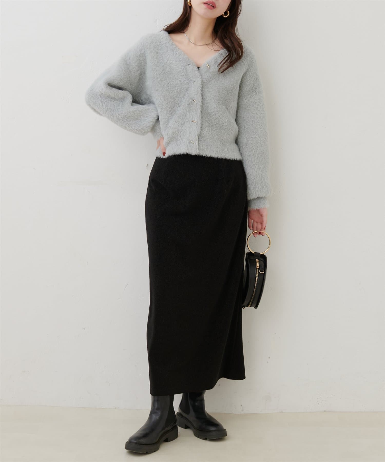 主役級で存在感があるアイテムなので、シンプルなニットやブラウス、