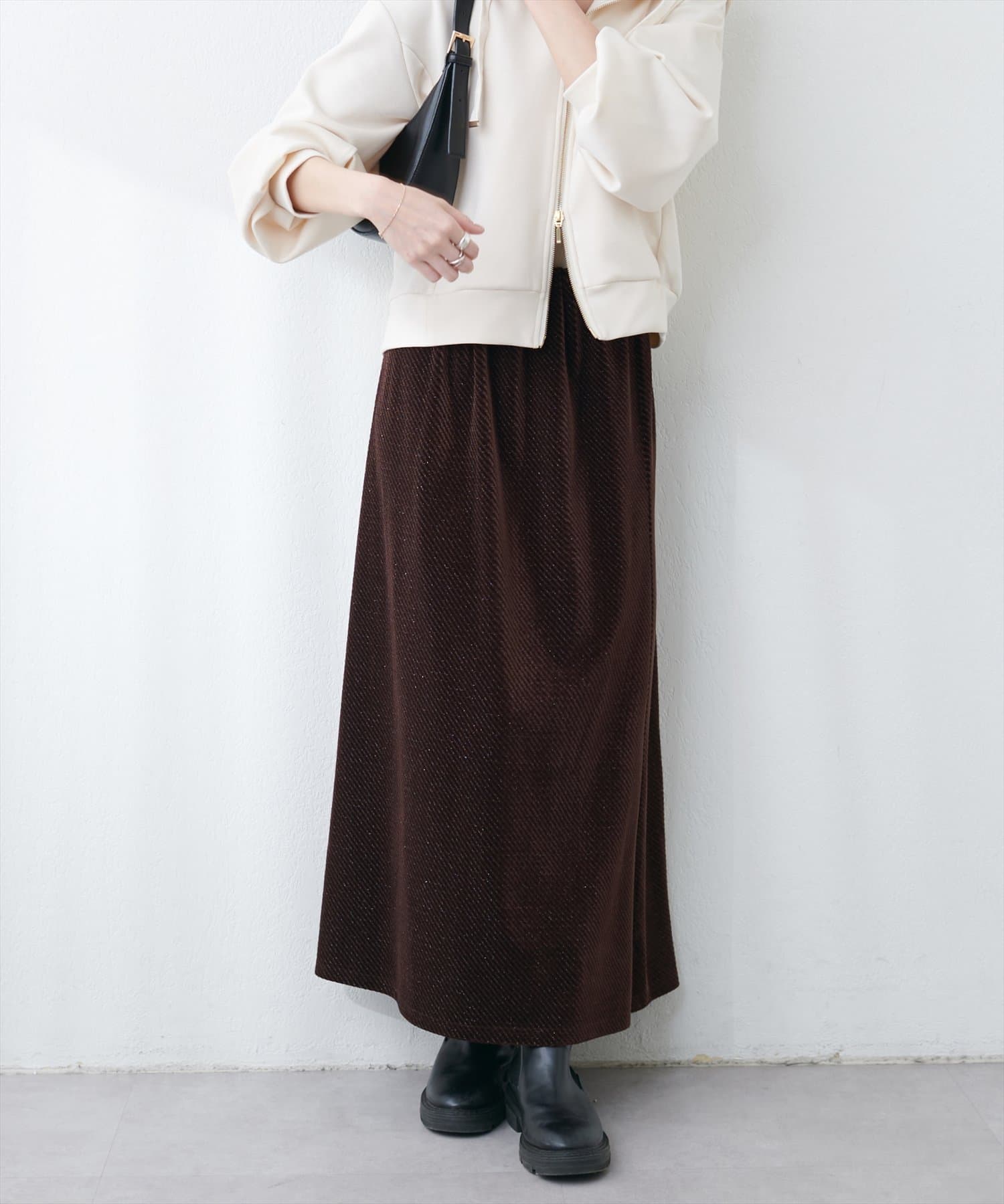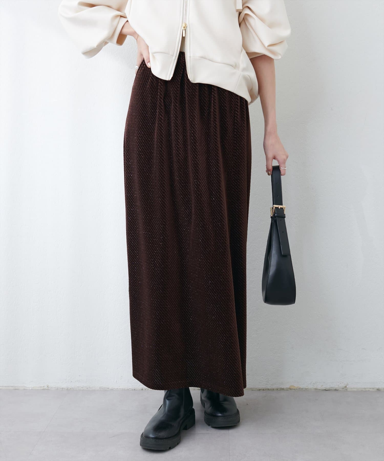 ベロアならではの艶感と、織り込まれたラメ糸の輝きが上品な1枚。