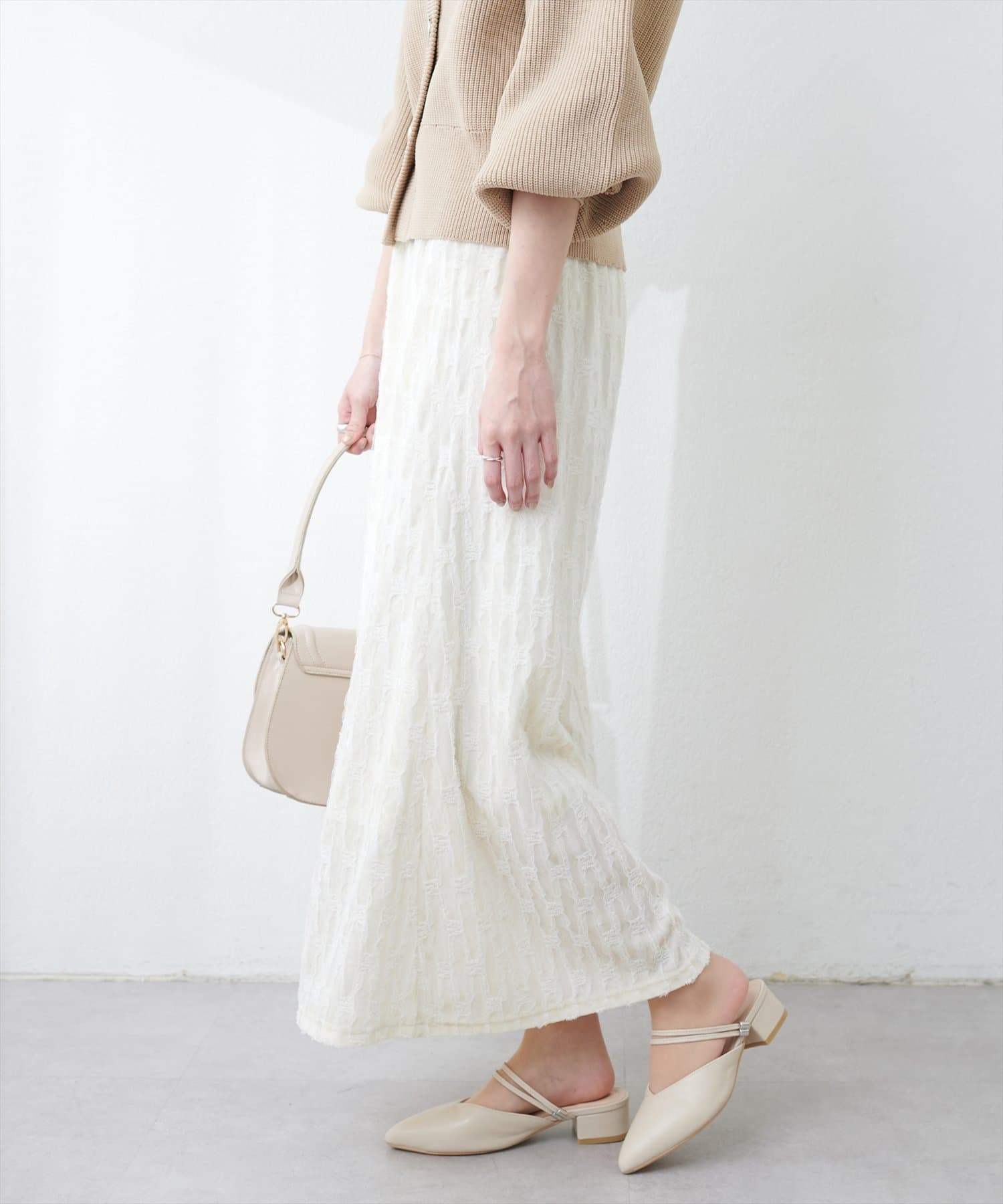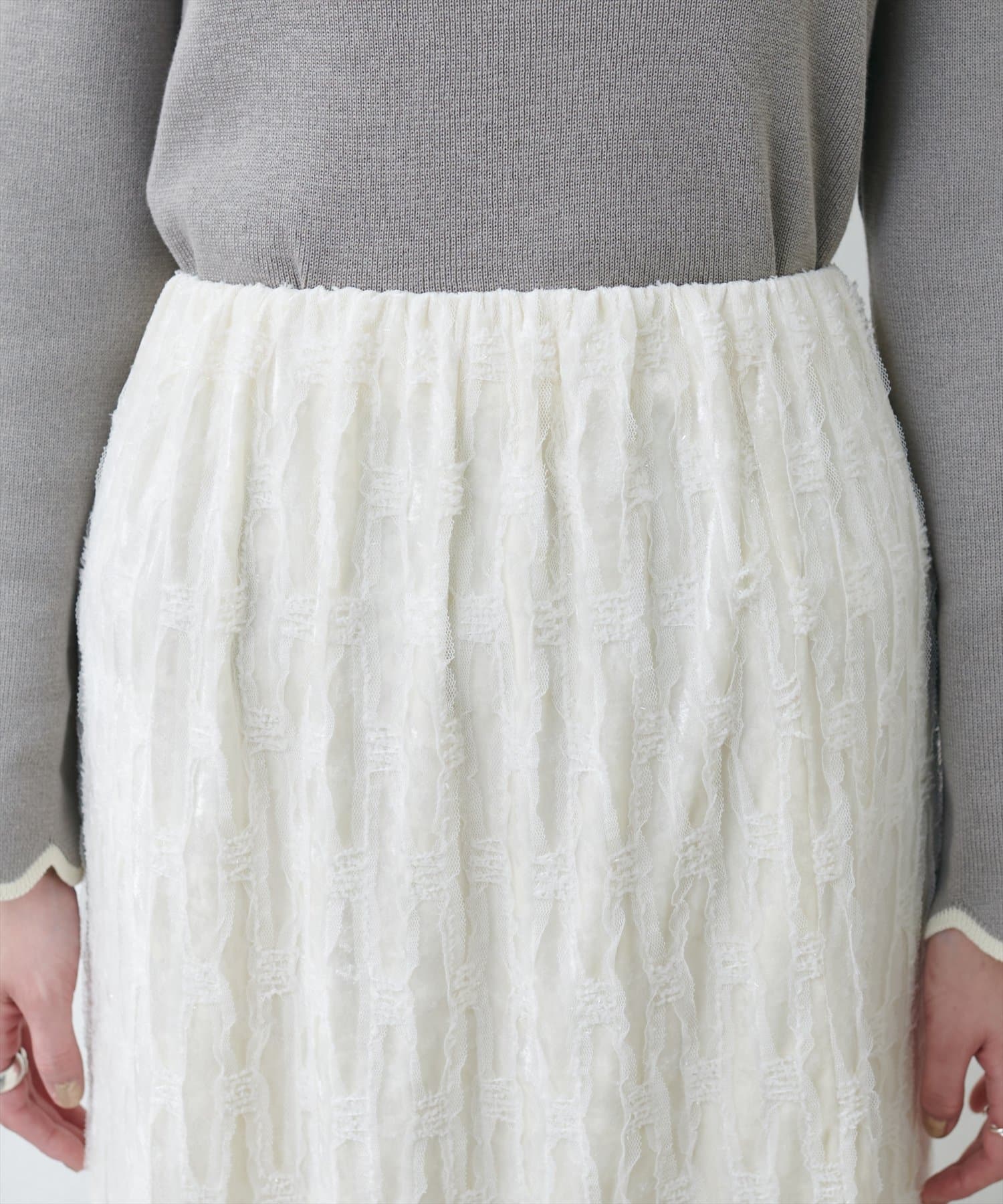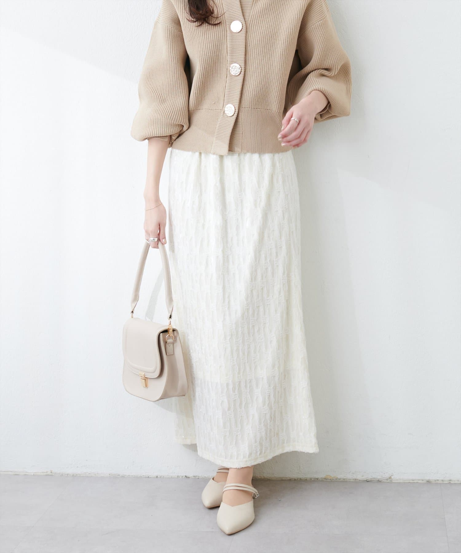 オフホワイトはレースデザインが施されよりフェミニンな印象に。