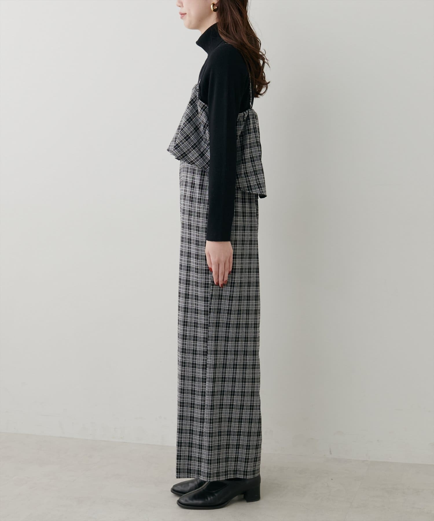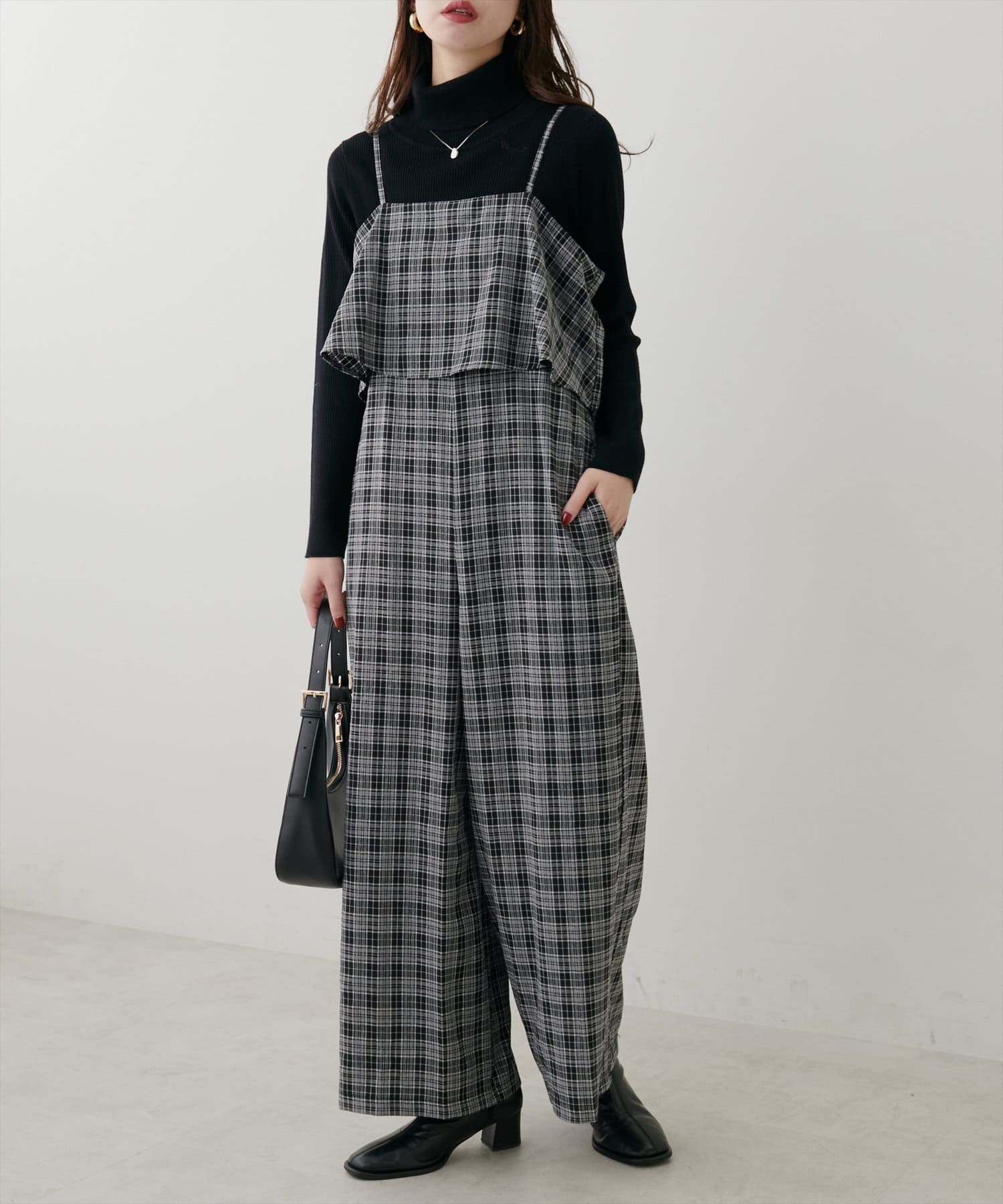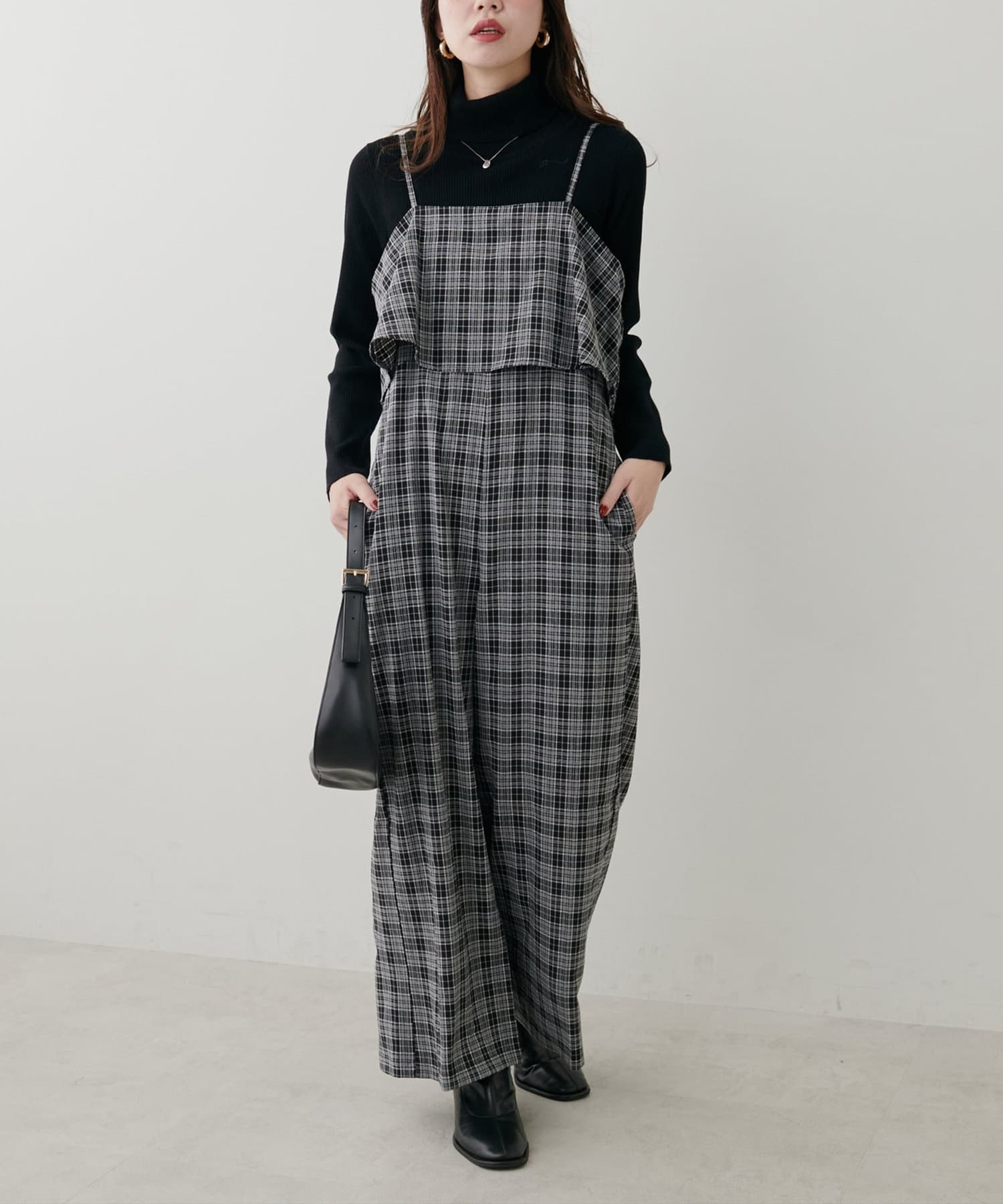 1枚で決まるサロペットなので、タートルネックや