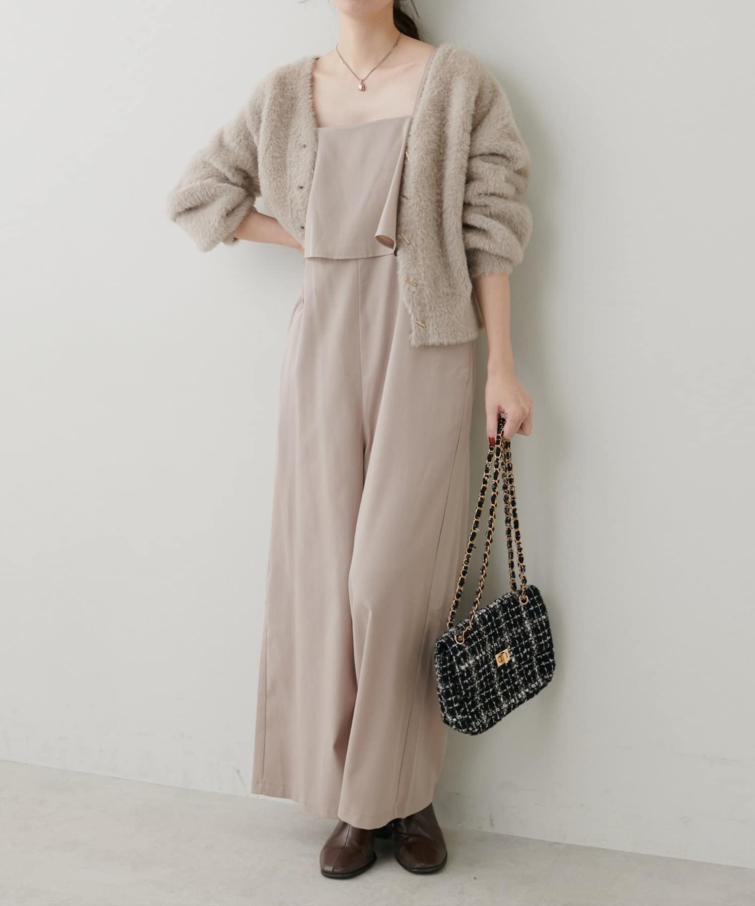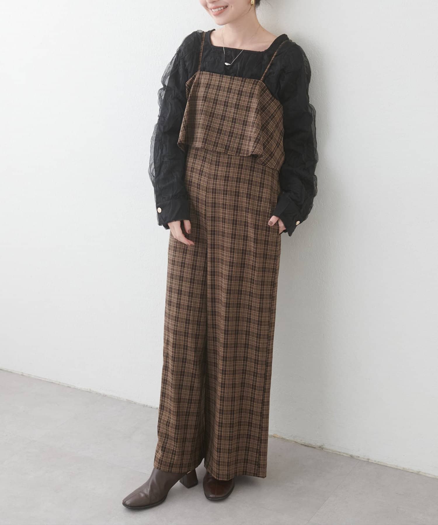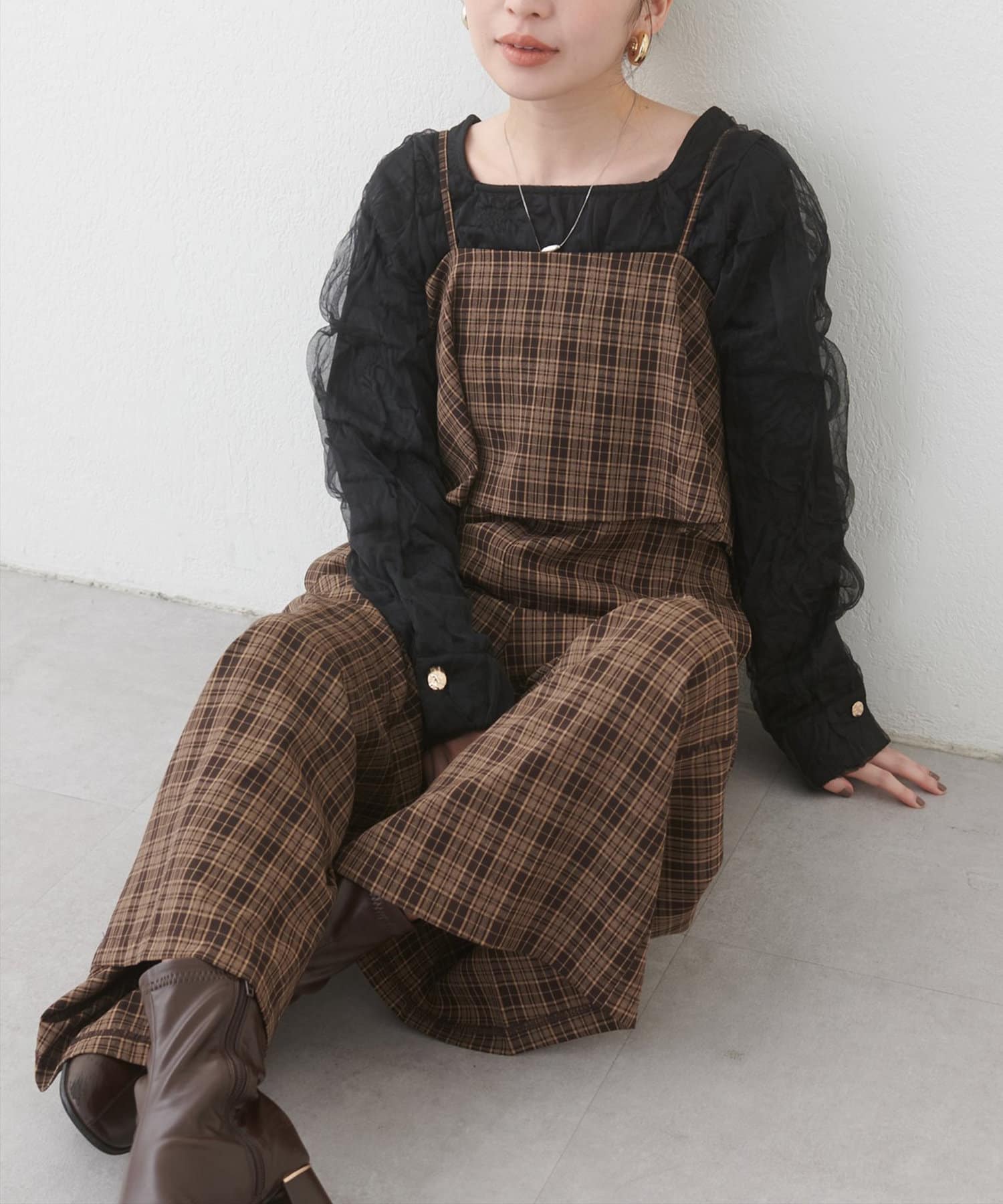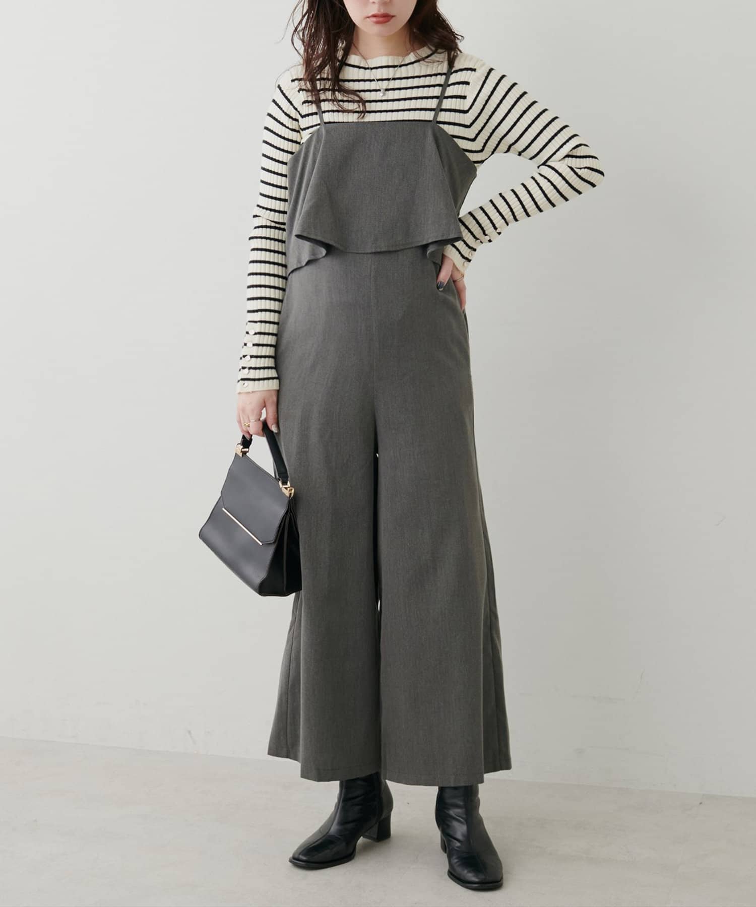1枚で決まるサロペットなので、タートルネックや