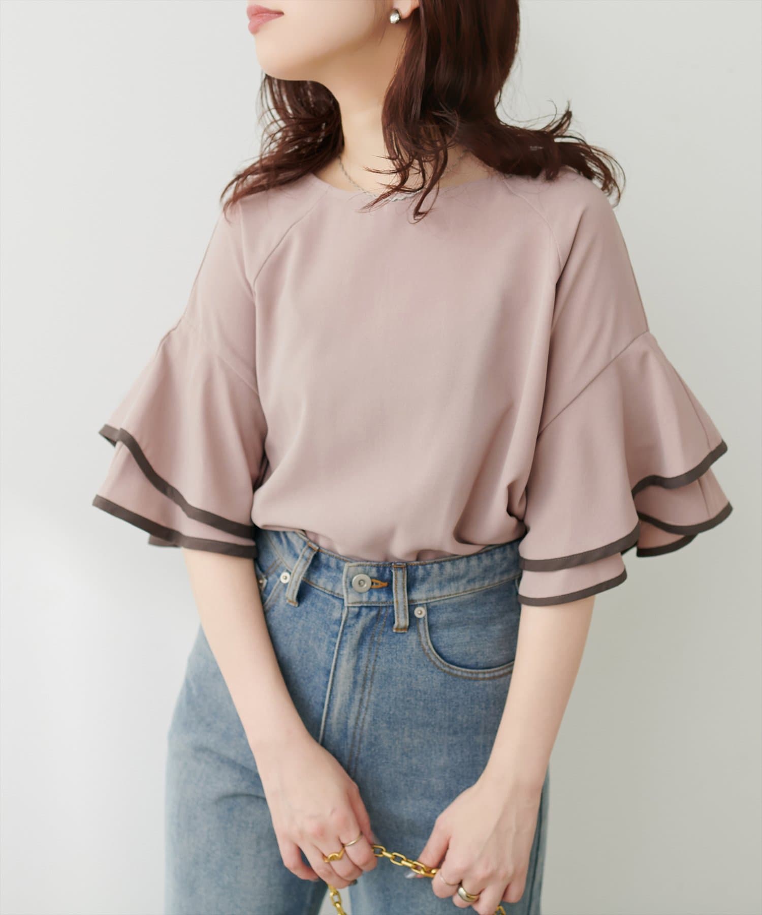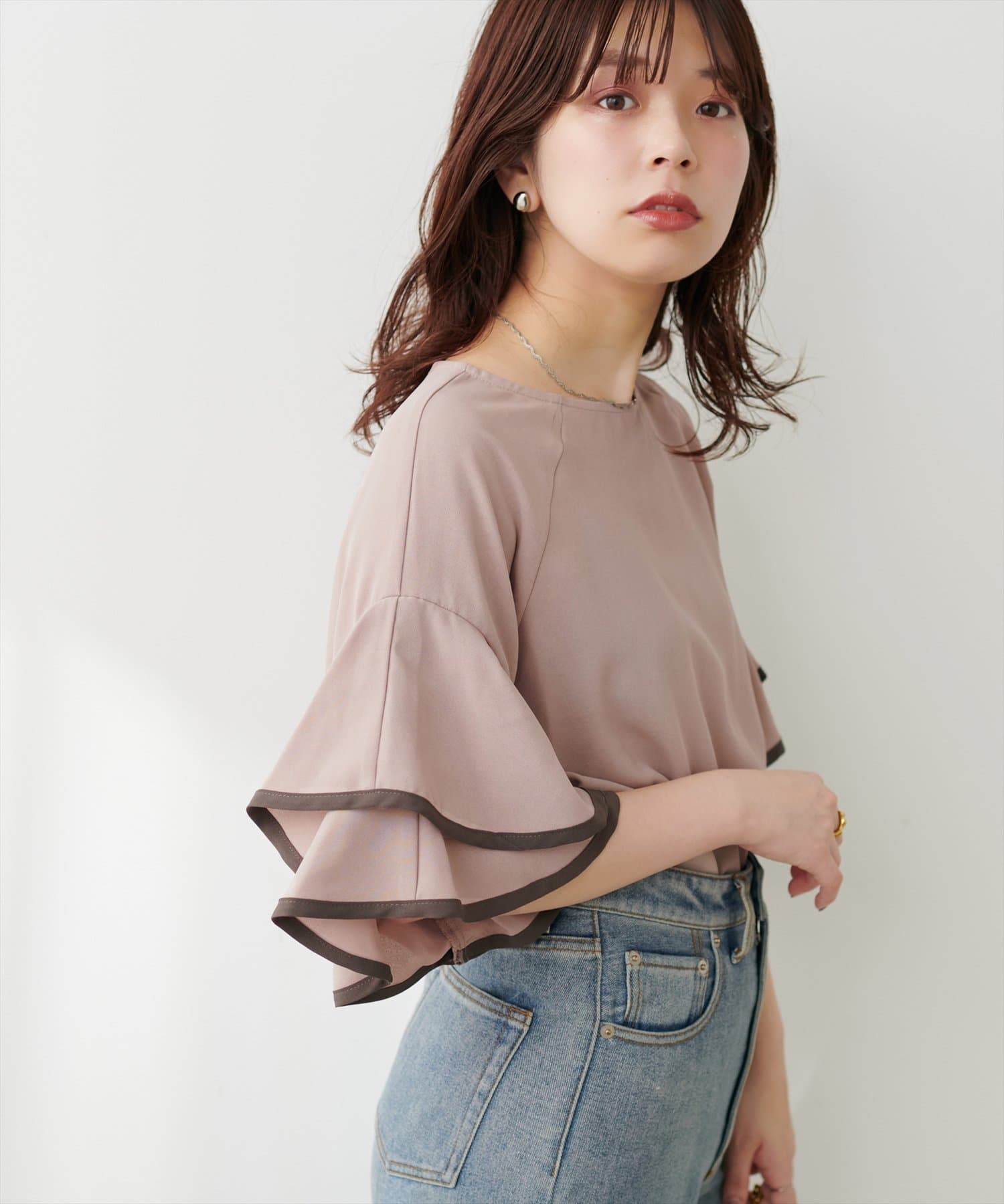 コーデに加えるだけでほんのり甘さをプラスしてくれる、ラッフルスリーブデザインが魅力なブラウス。