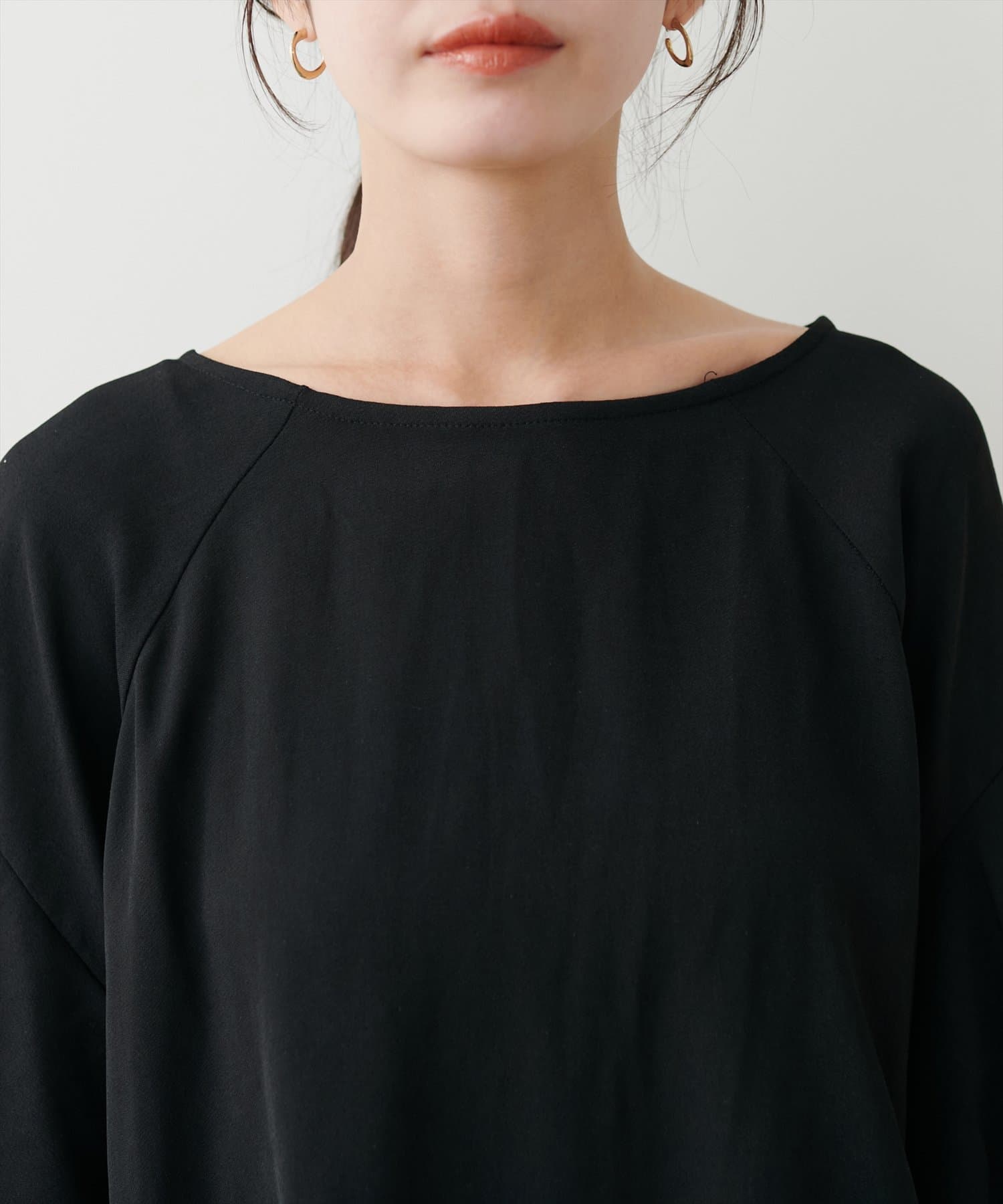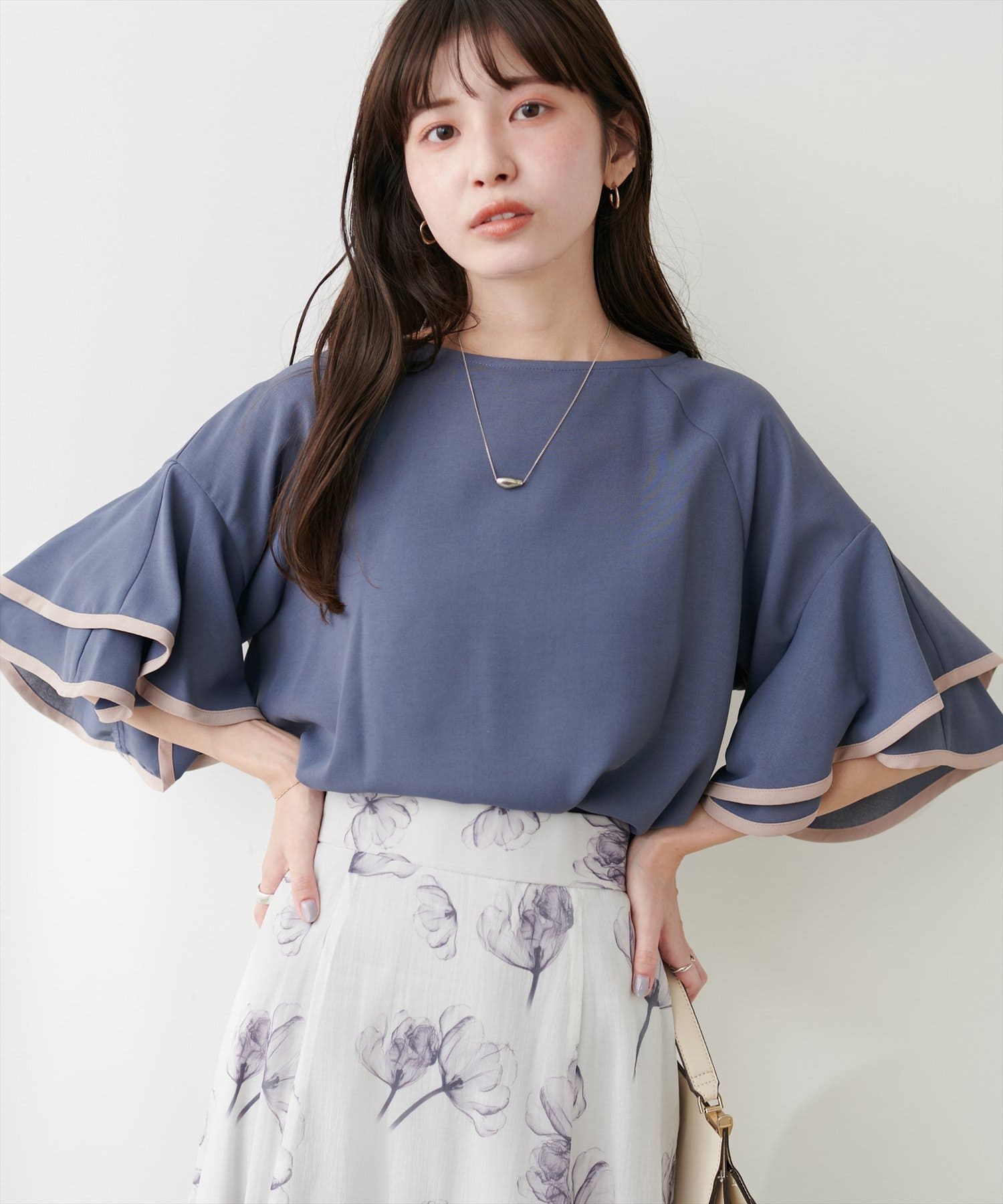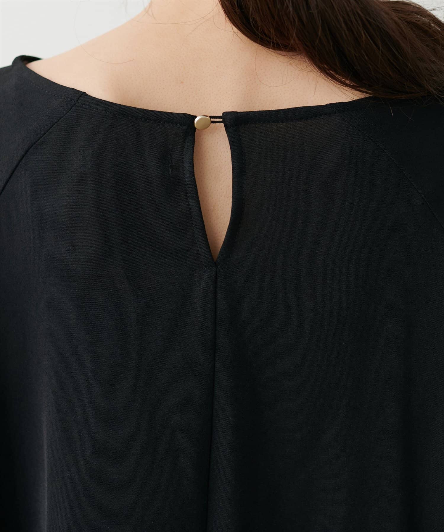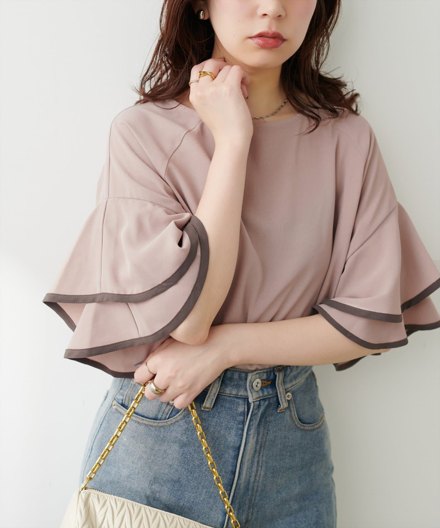 袖口ラッフルにパイピングが施されており、無地でも目を惹くデザイン。