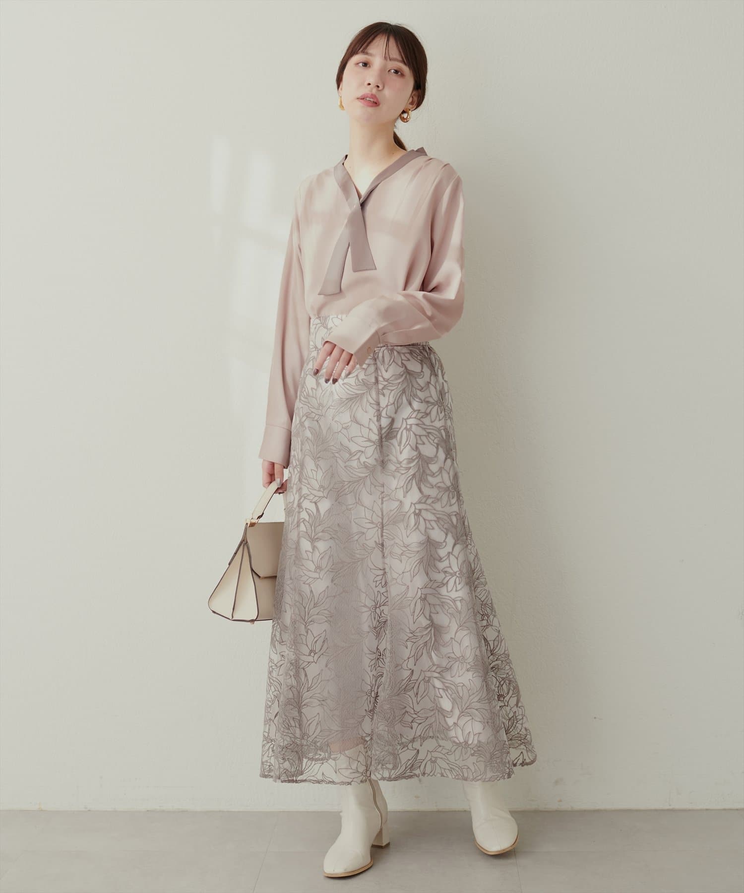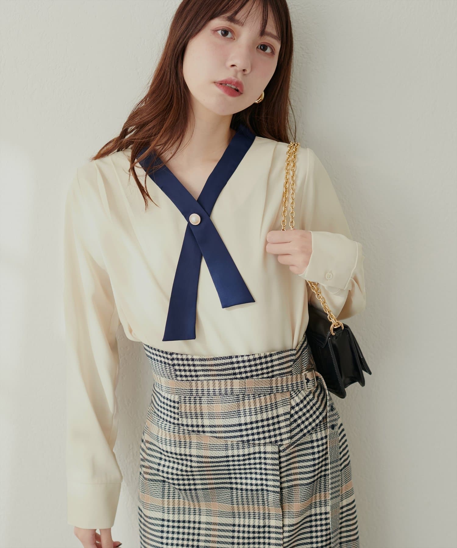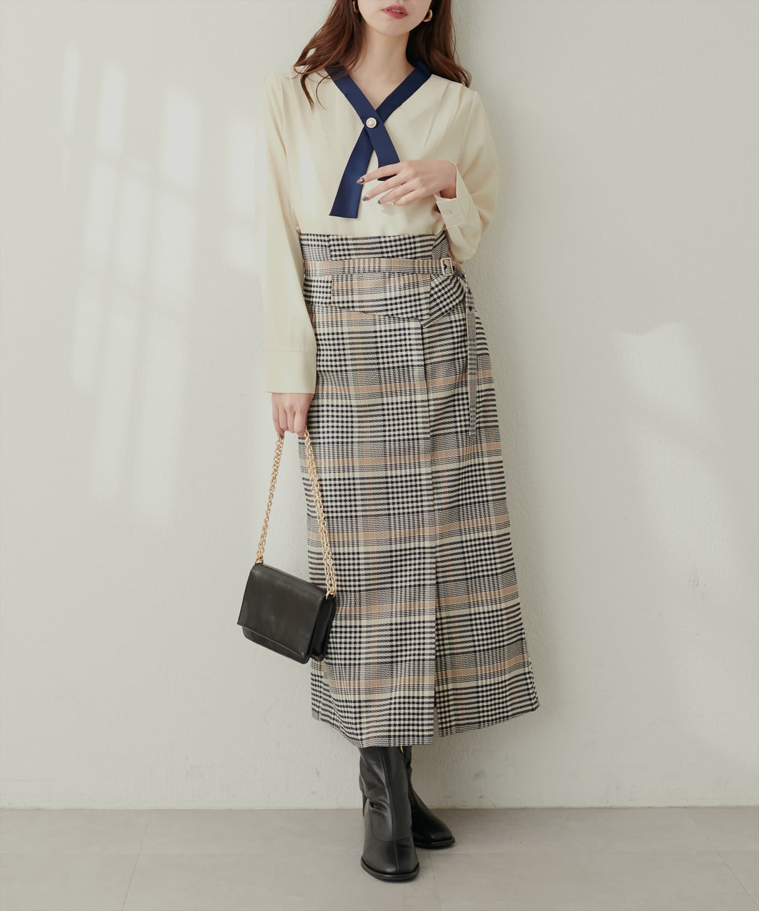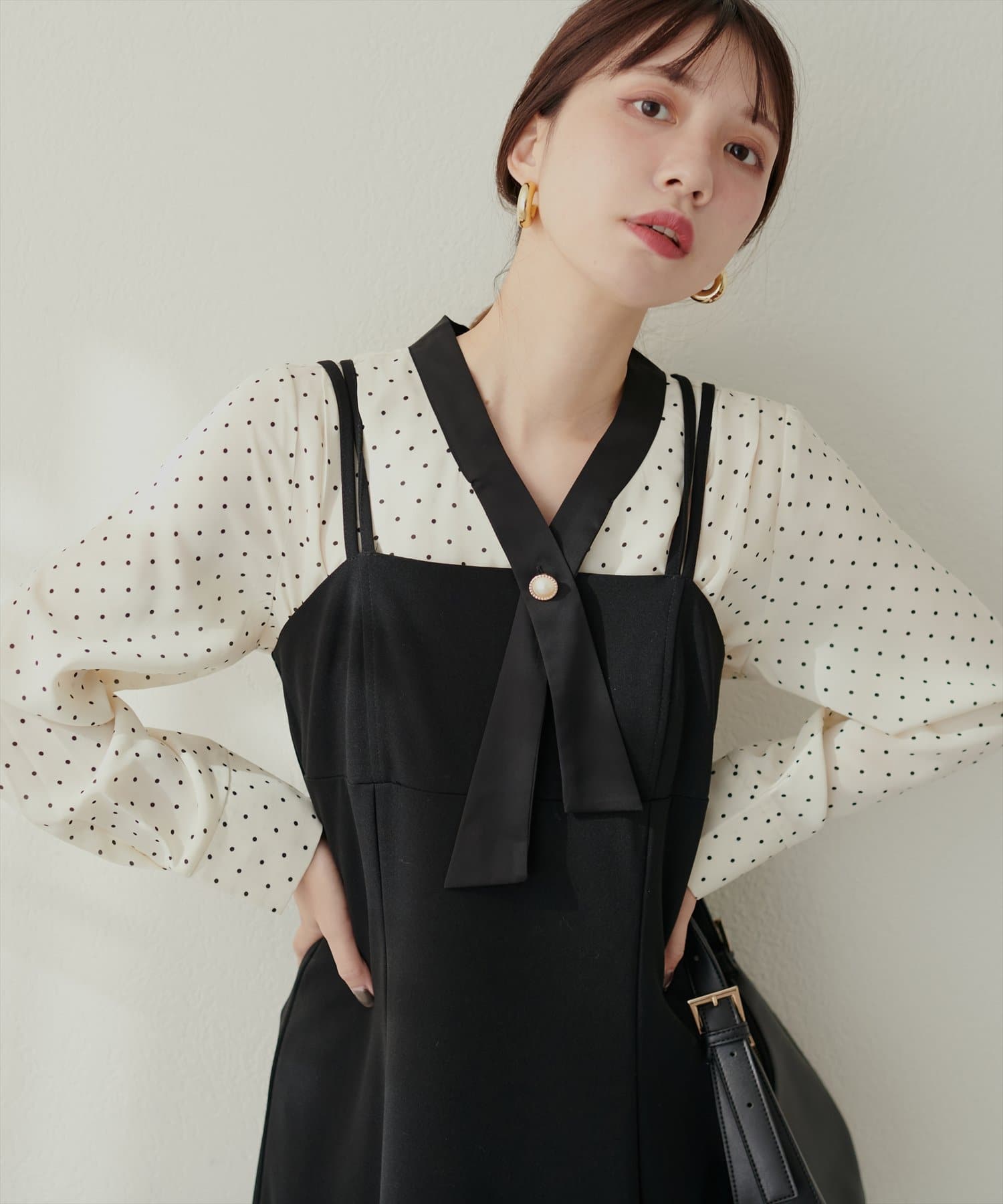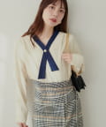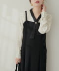 クロスボータイが洗練された印象に仕上げてくれるのでハイウエストのロングスカートやジャンパースカート、