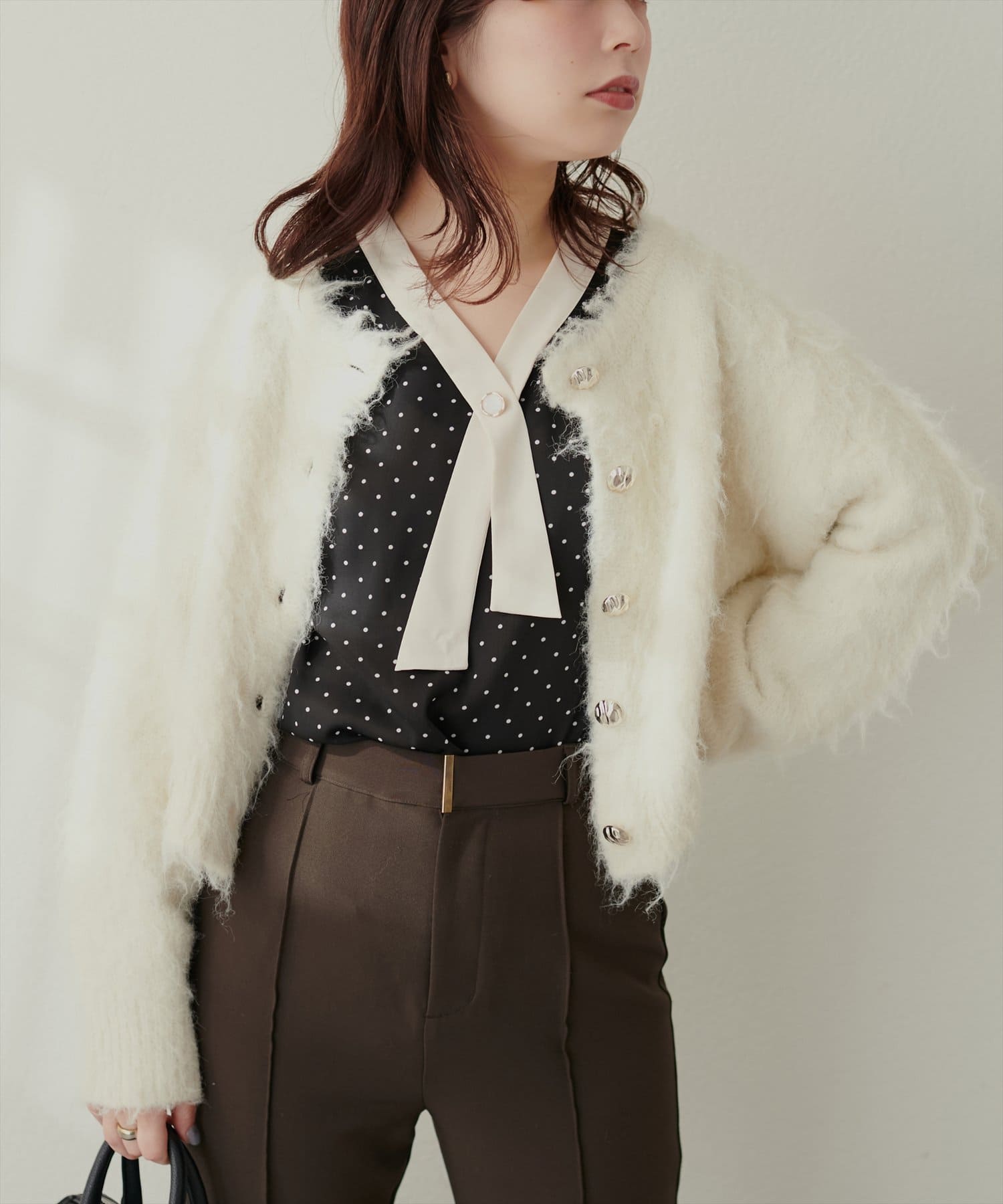 こだわりの胸元で留めるボタンは、取り外しが可能で2WAYなっておりシーンや気分によって変えてお楽しみ頂けます。