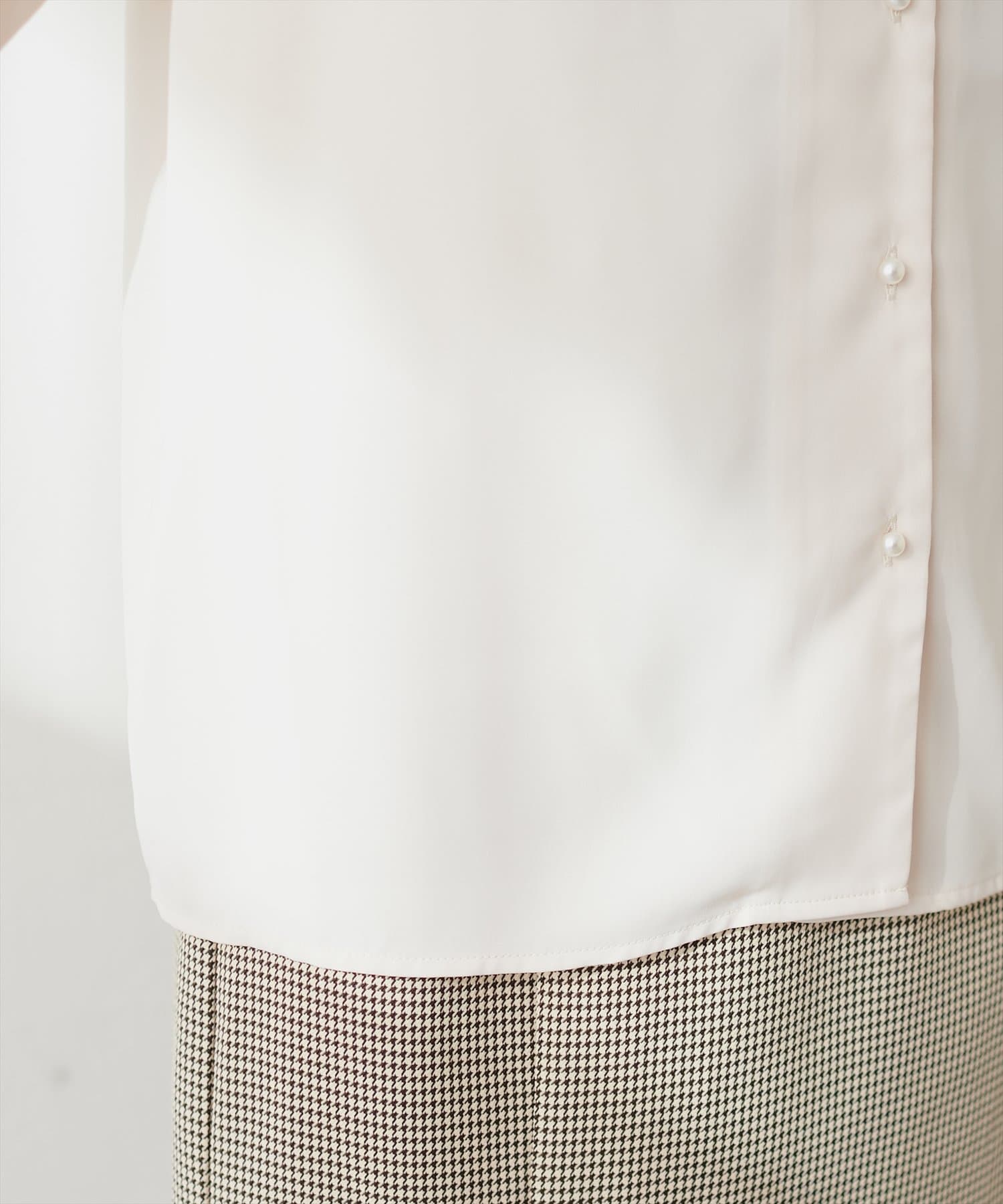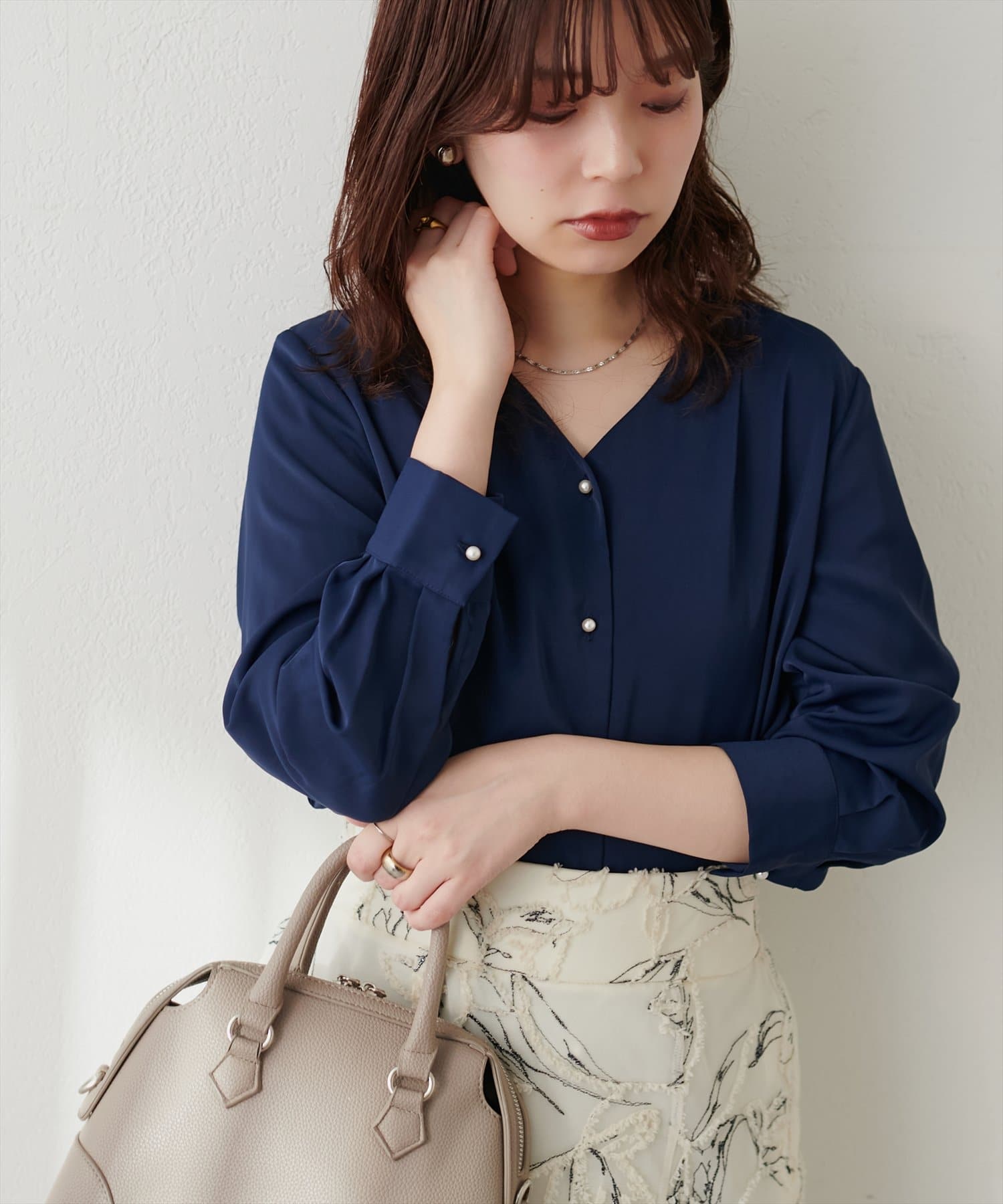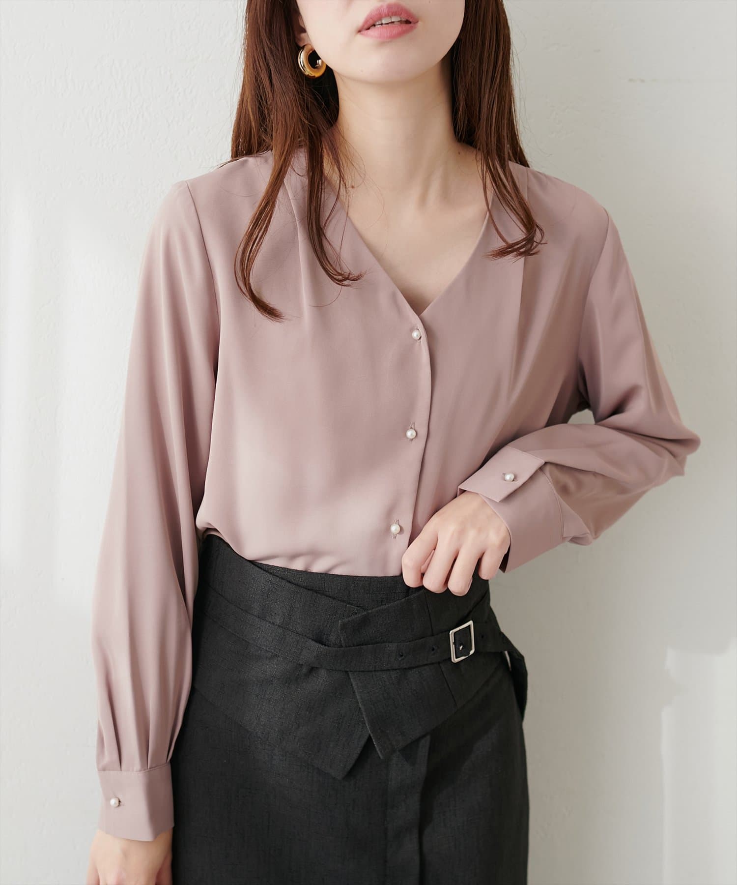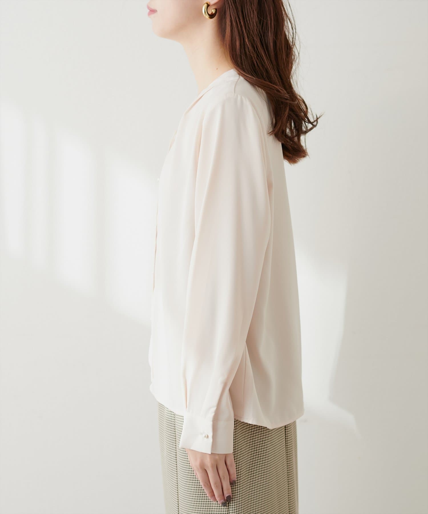 滑らかで落ち感のある着心地の良い生地に、フロントをパール釦使いに仕上げた、大人上品なブラウス。