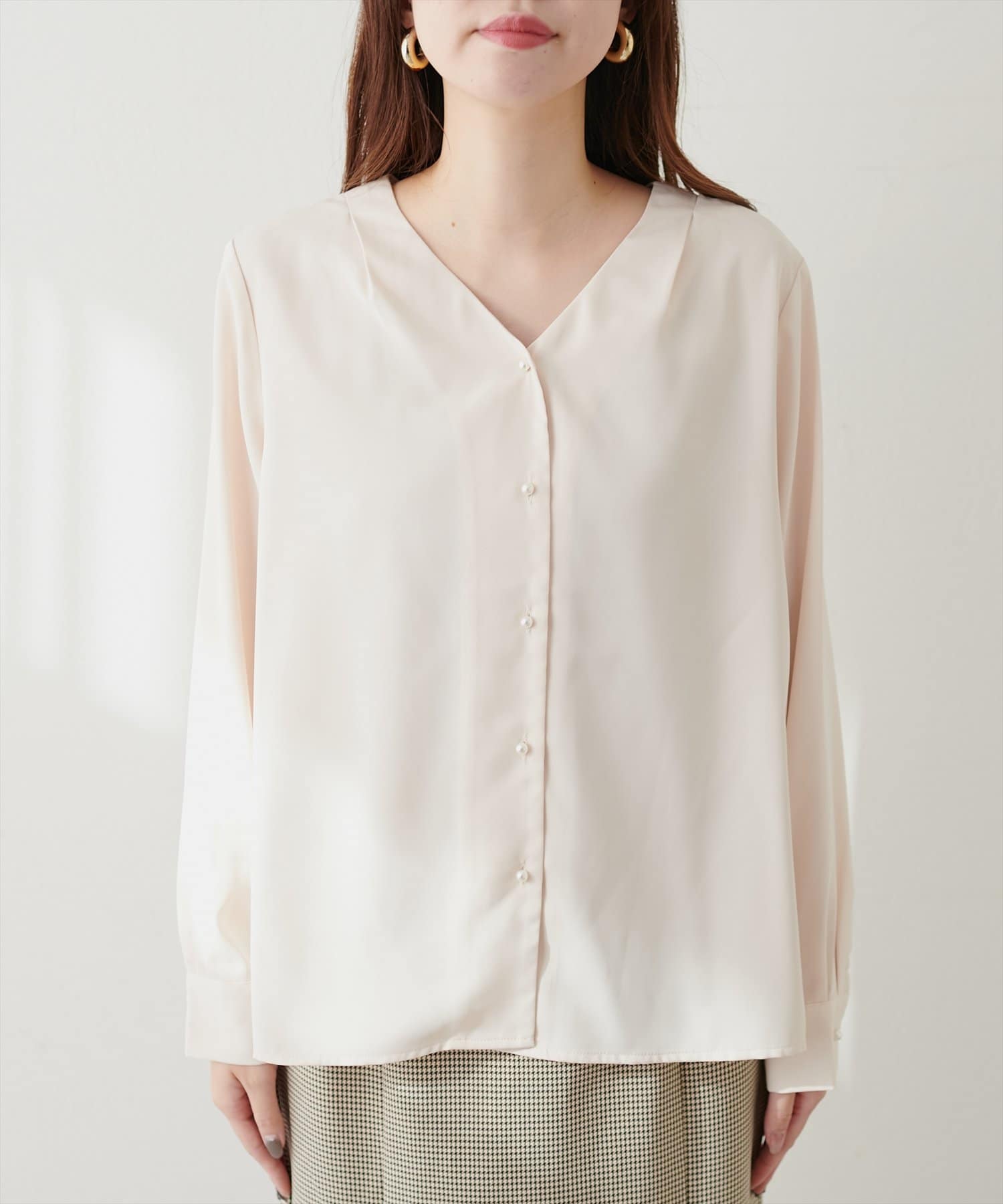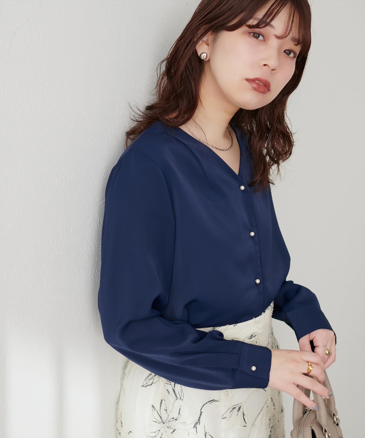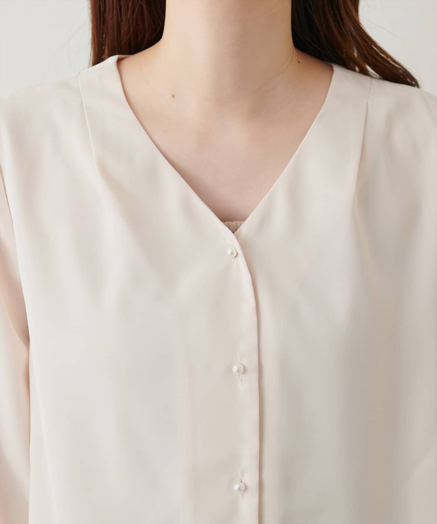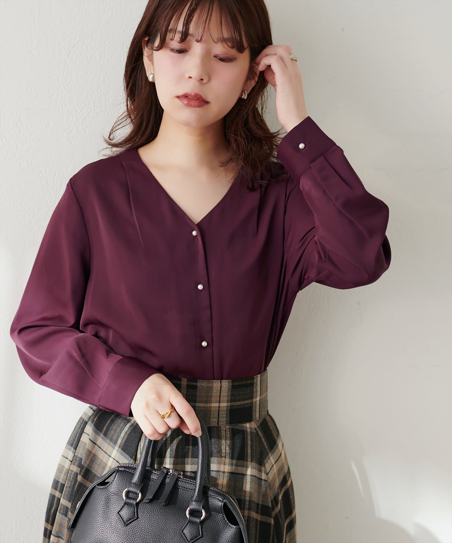 滑らかで落ち感のある着心地の良い生地に、フロントをパール釦使いに仕上げた、大人上品なブラウス。