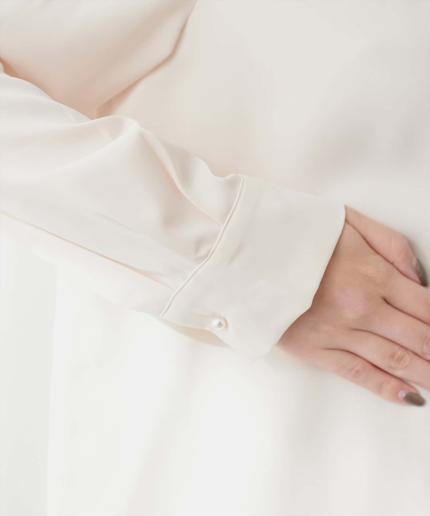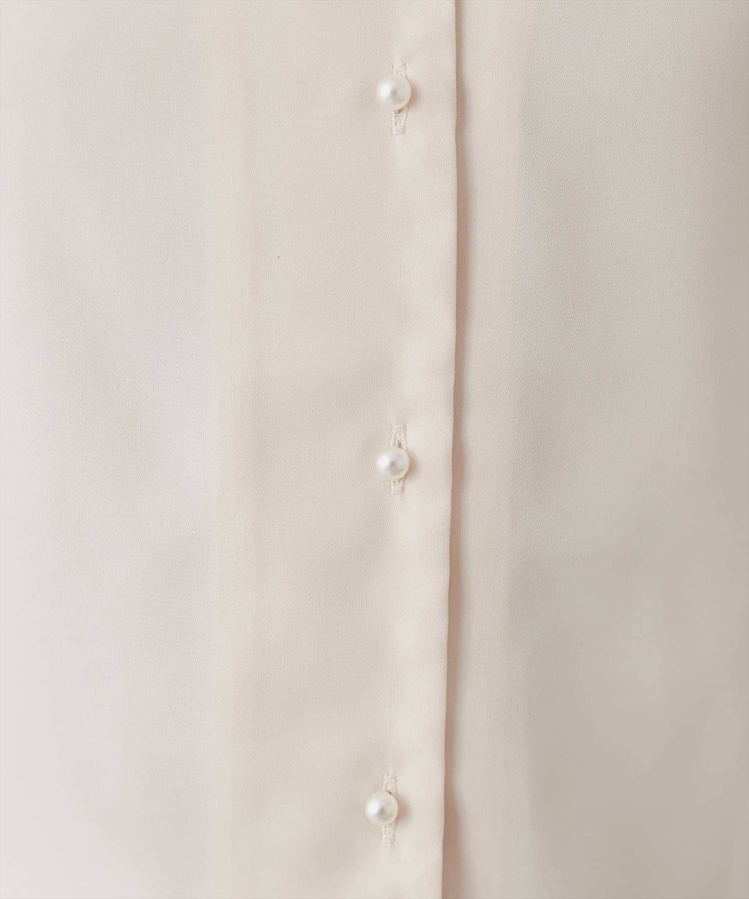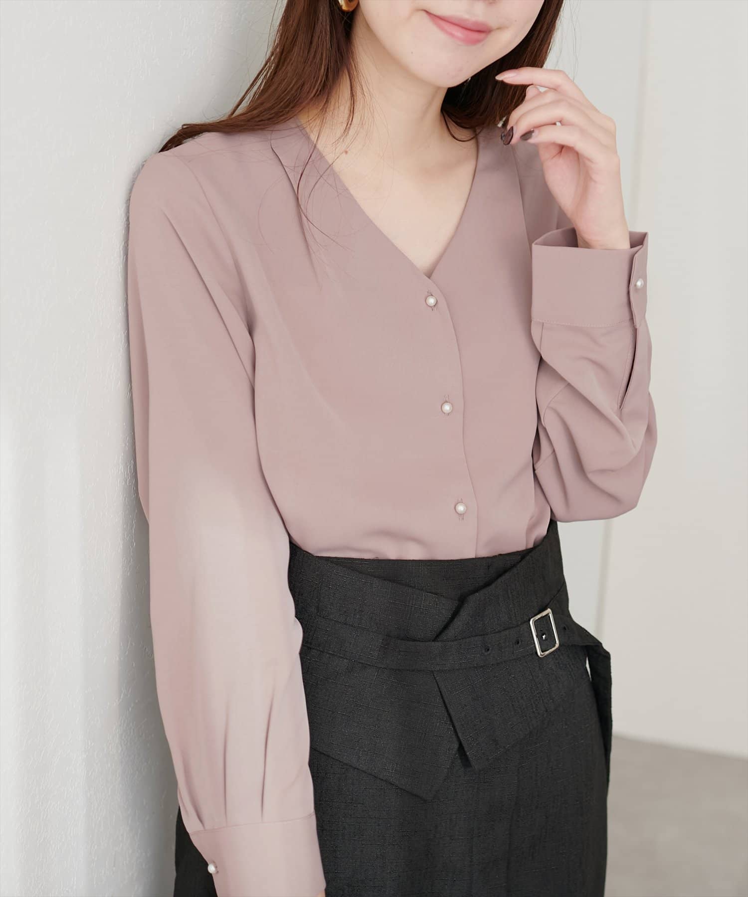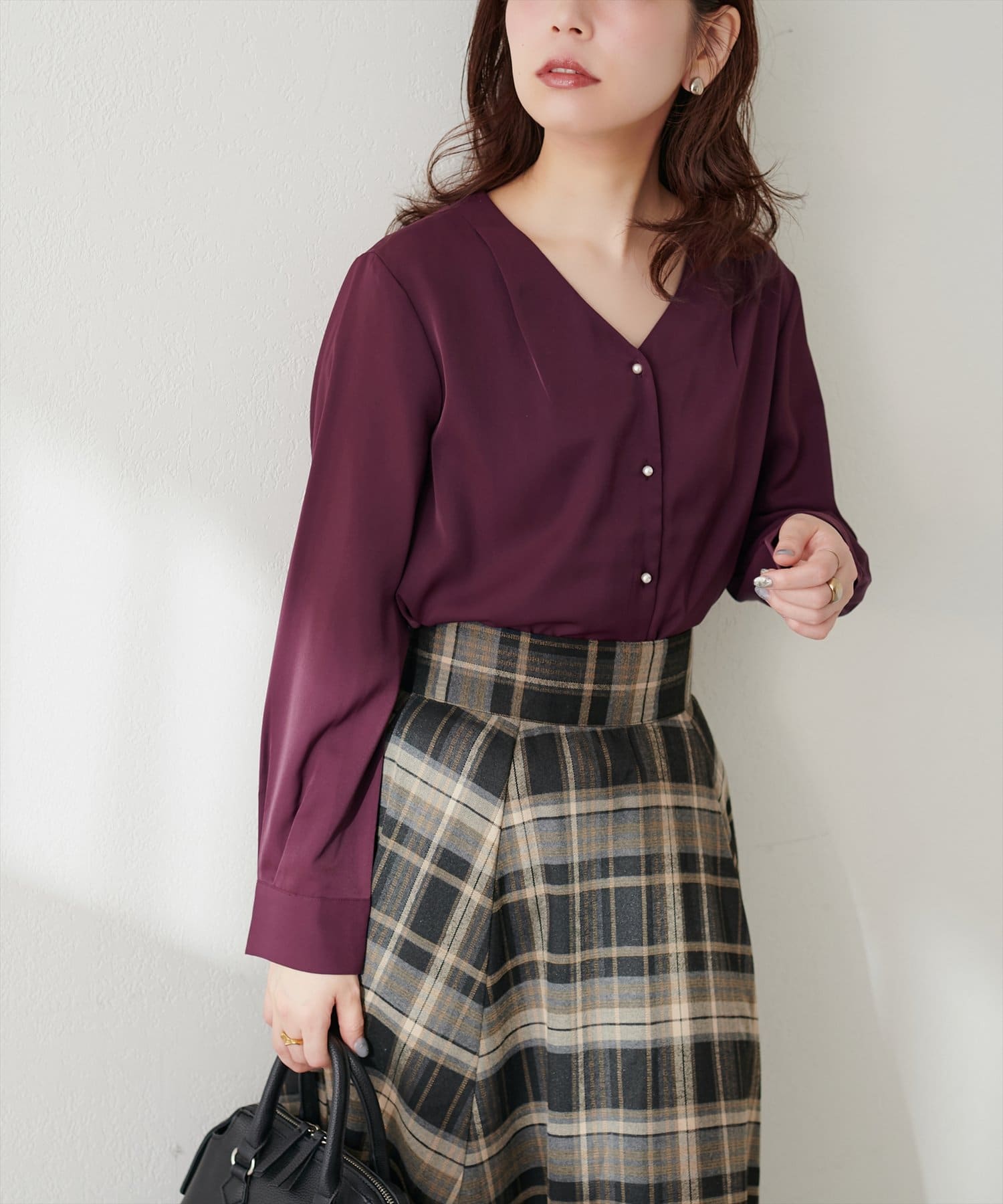 滑らかで落ち感のある着心地の良い生地に、フロントをパール釦使いに仕上げた、大人上品なブラウス。