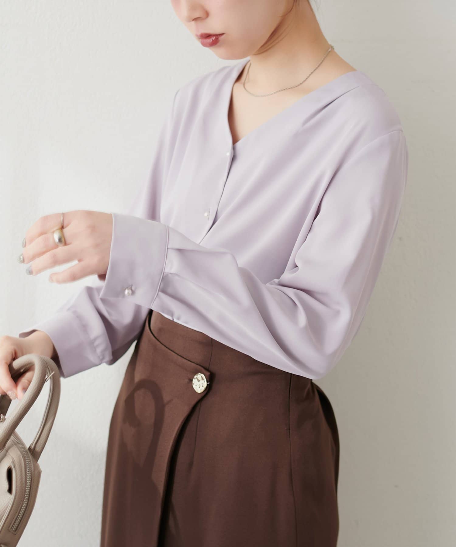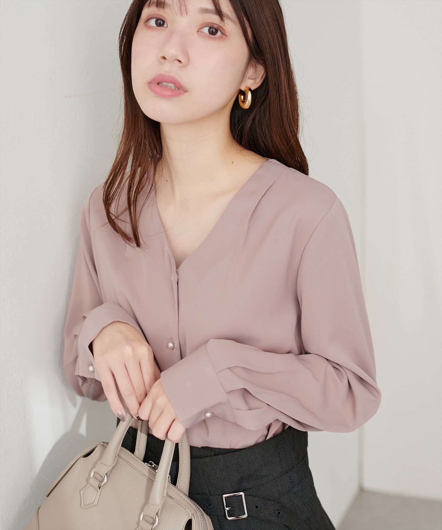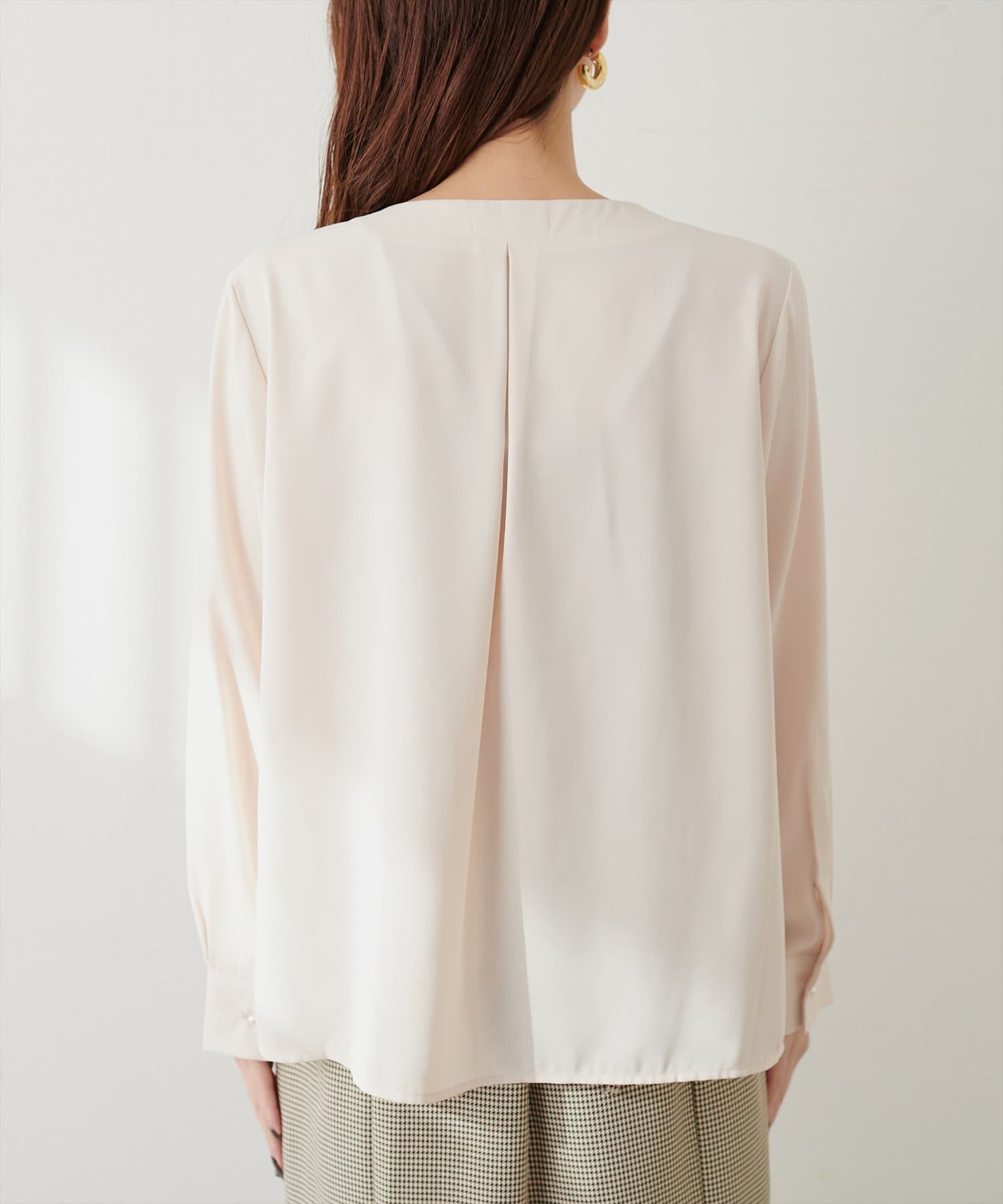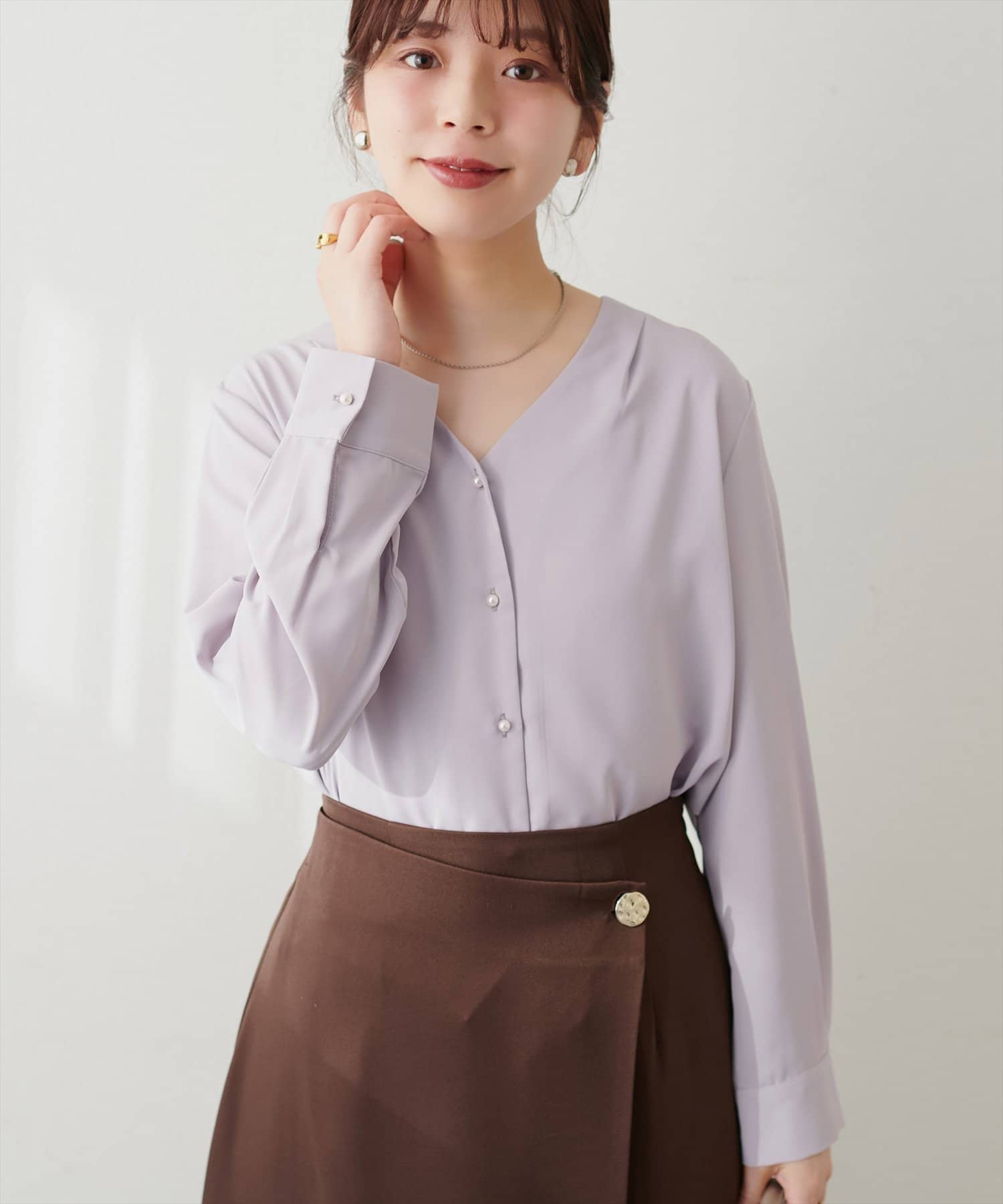 滑らかで落ち感のある着心地の良い生地に、フロントをパール釦使いに仕上げた、大人上品なブラウス。