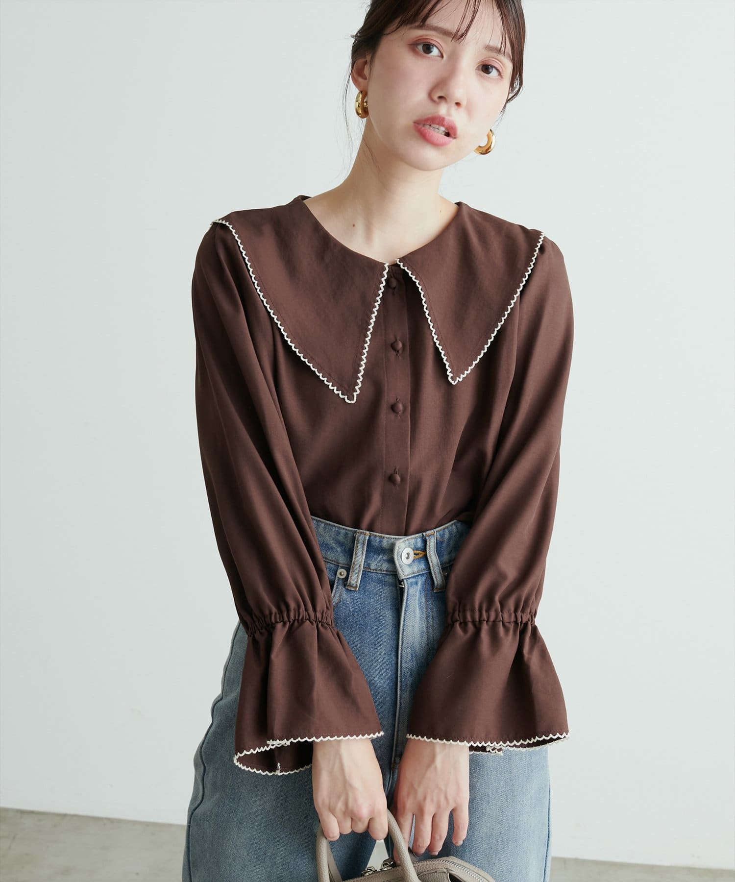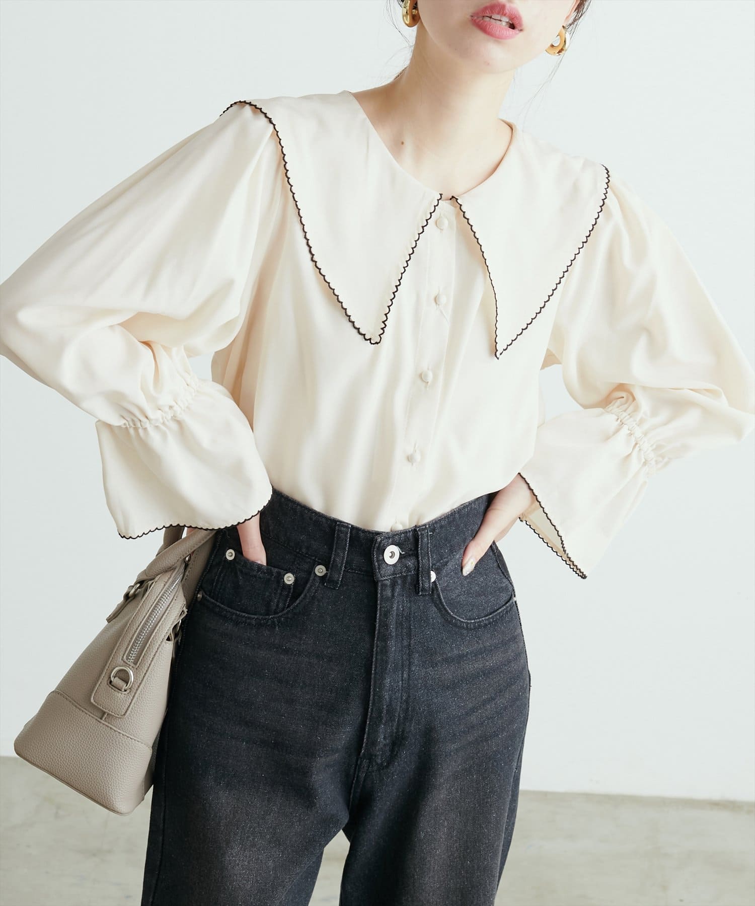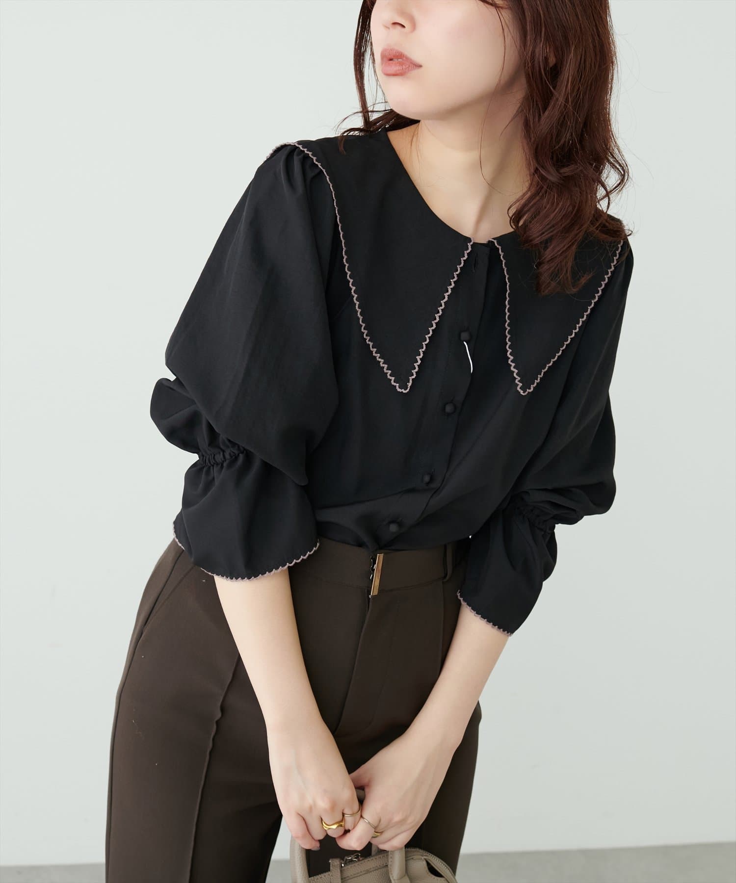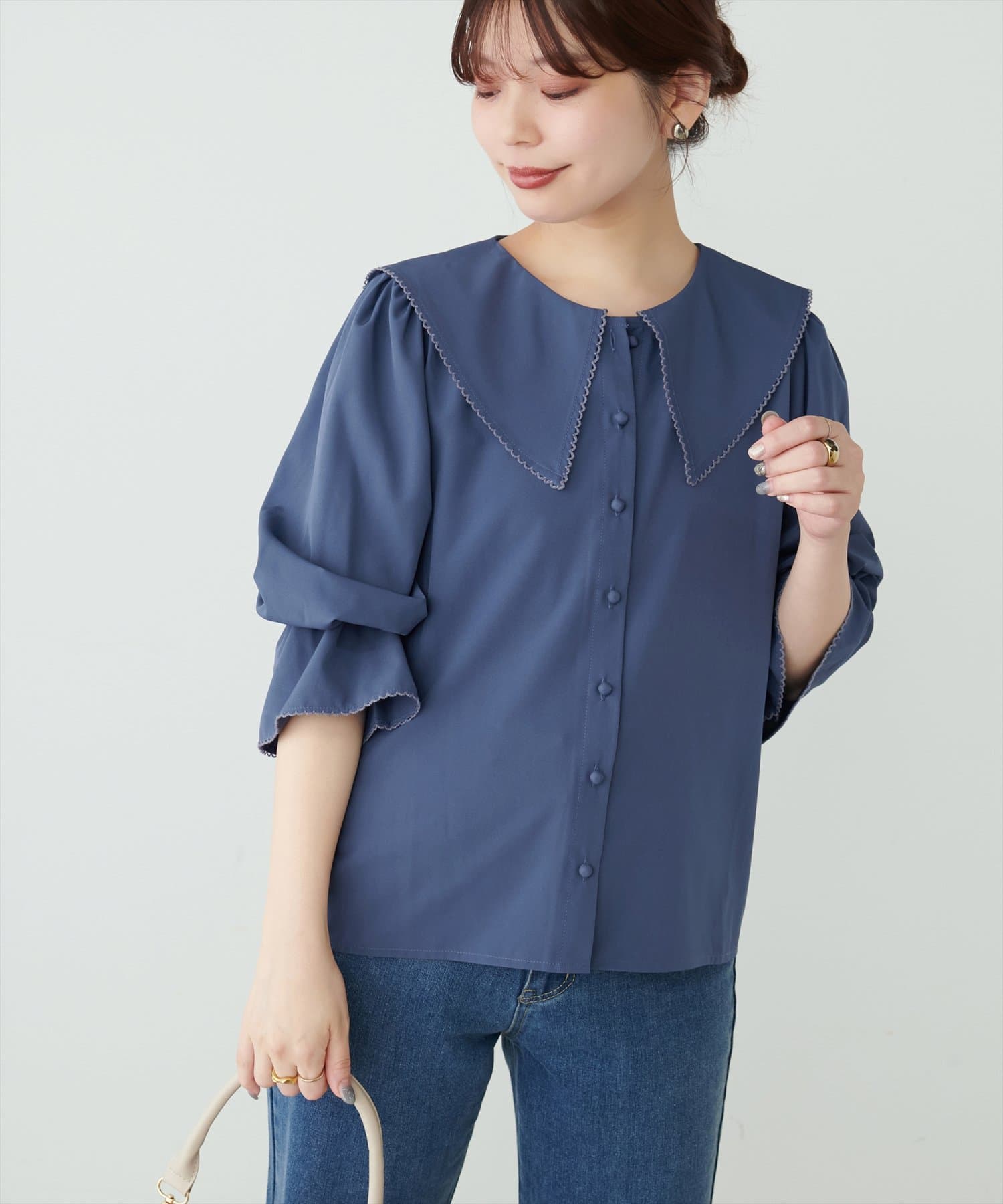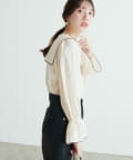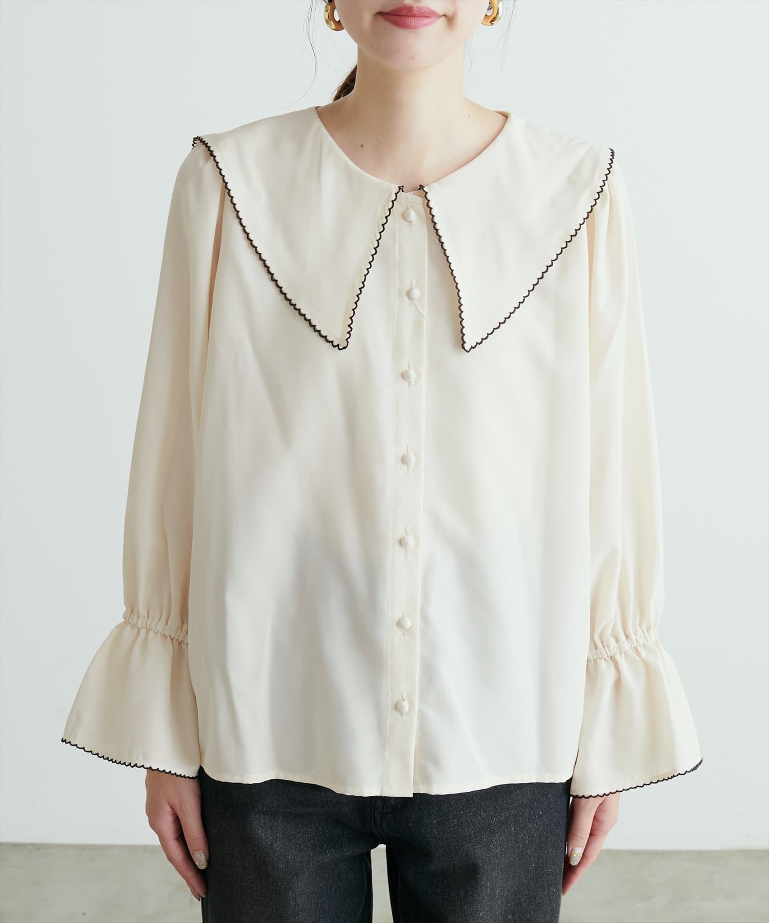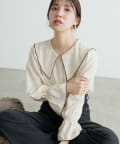 衿端と袖口にあしらったスカラップ刺繍がキャチーなブラウス。