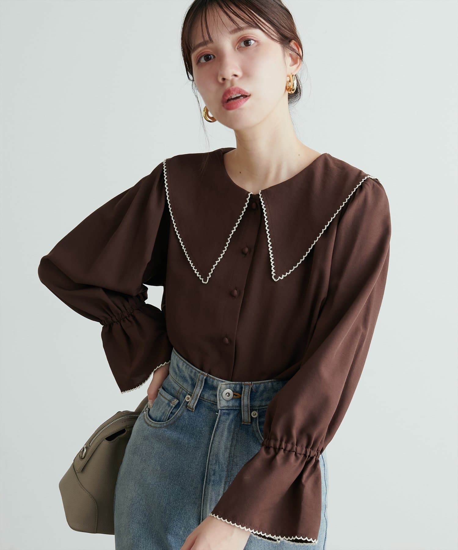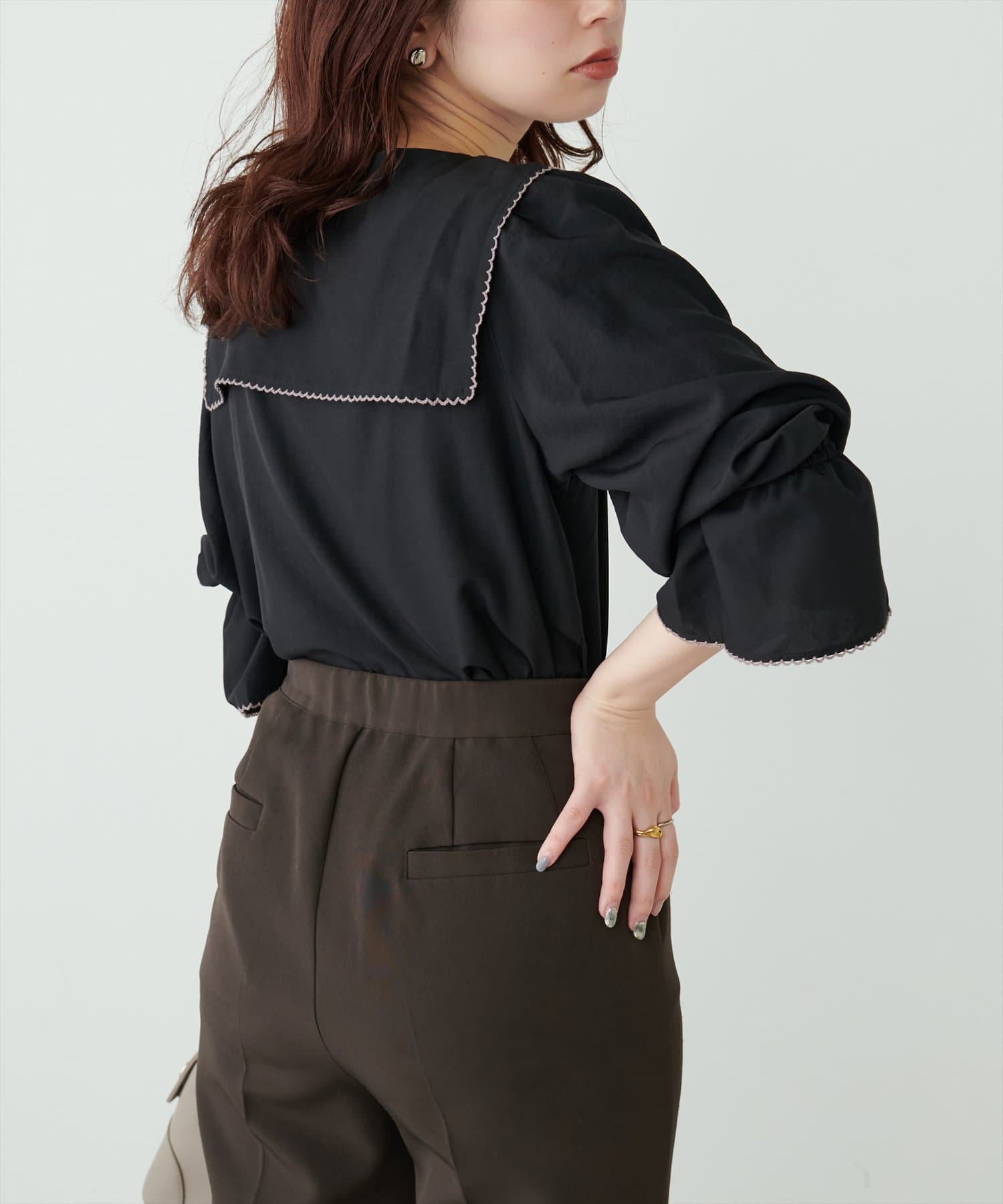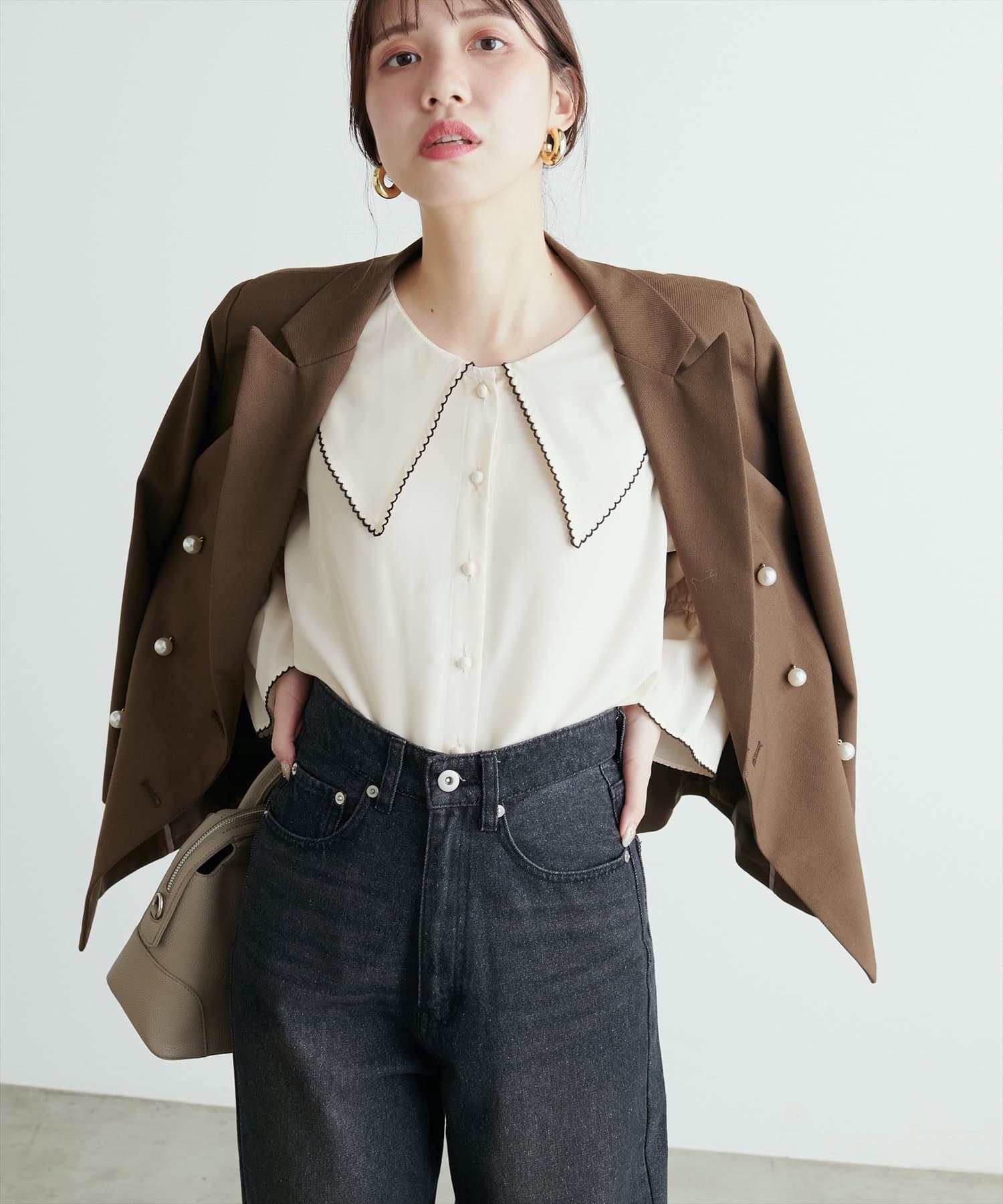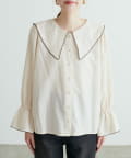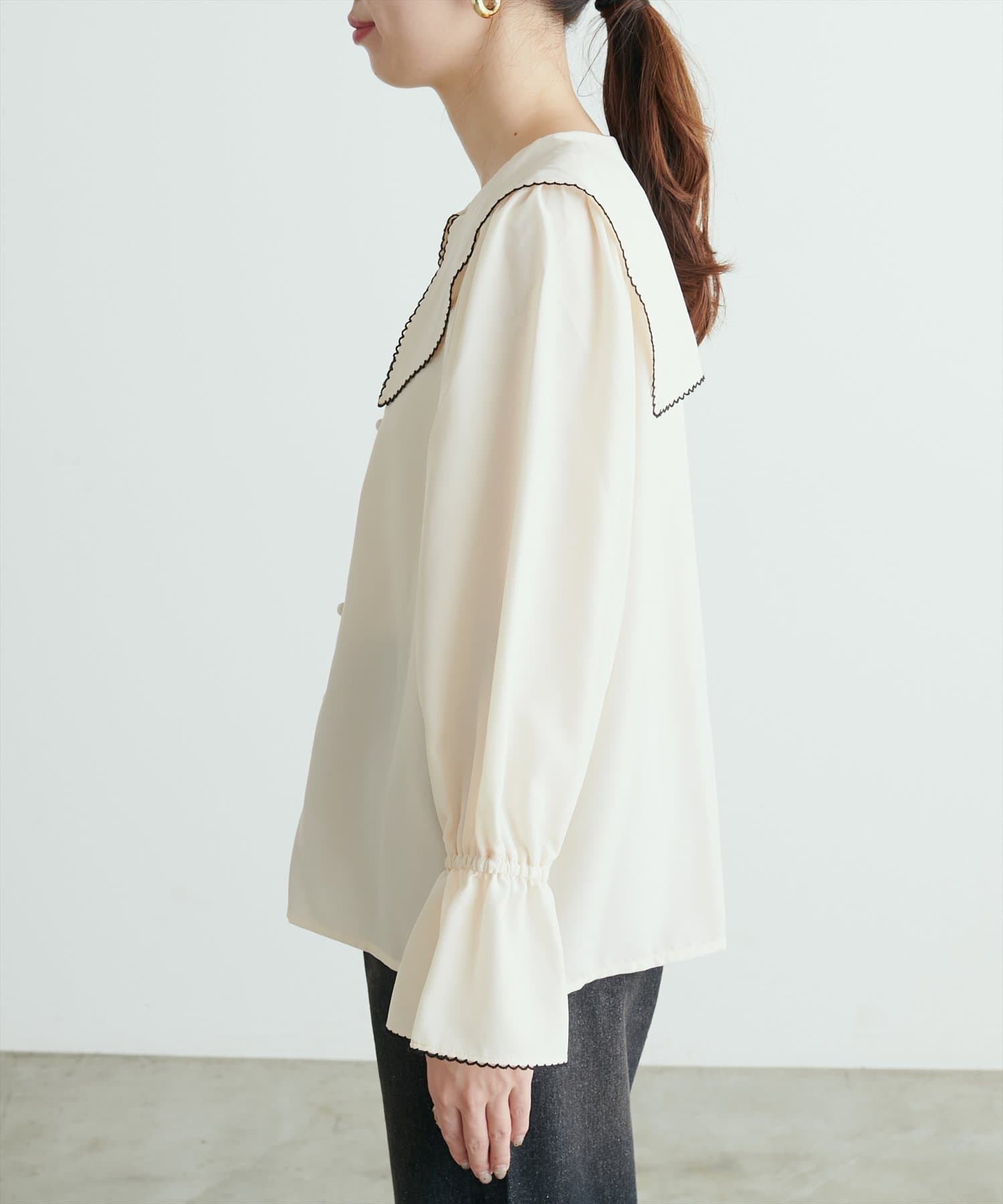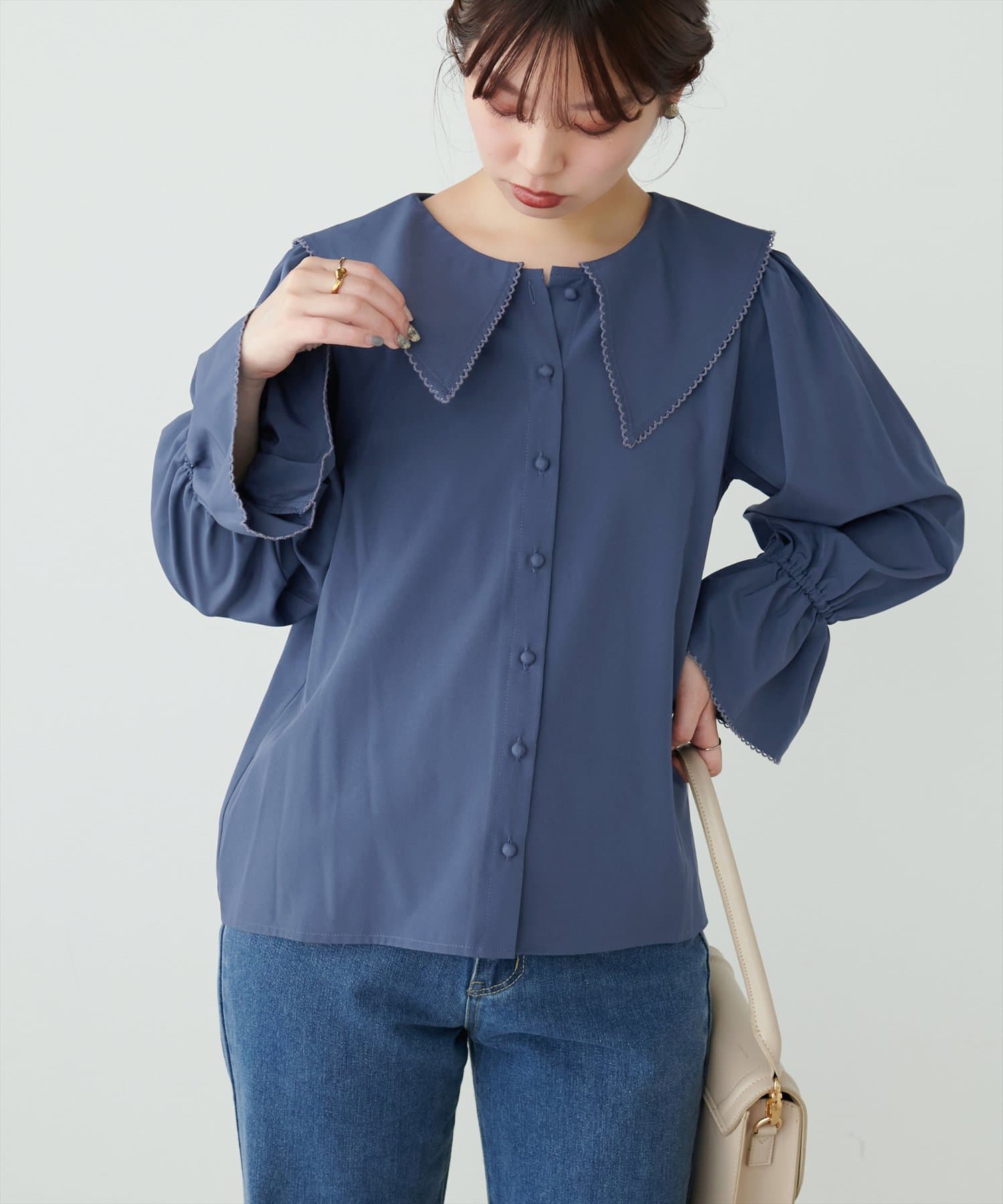 衿端と袖口にあしらったスカラップ刺繍がキャチーなブラウス。