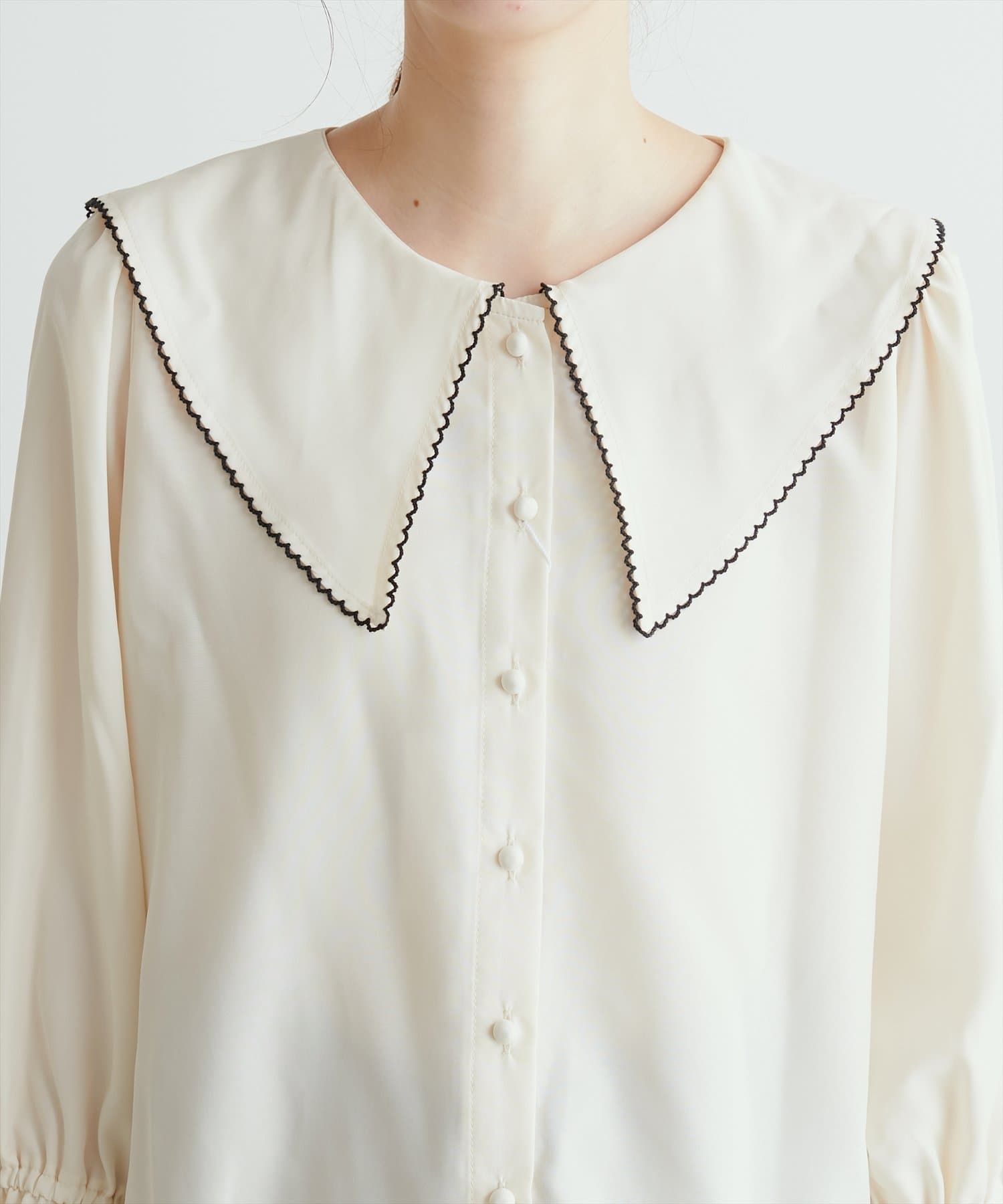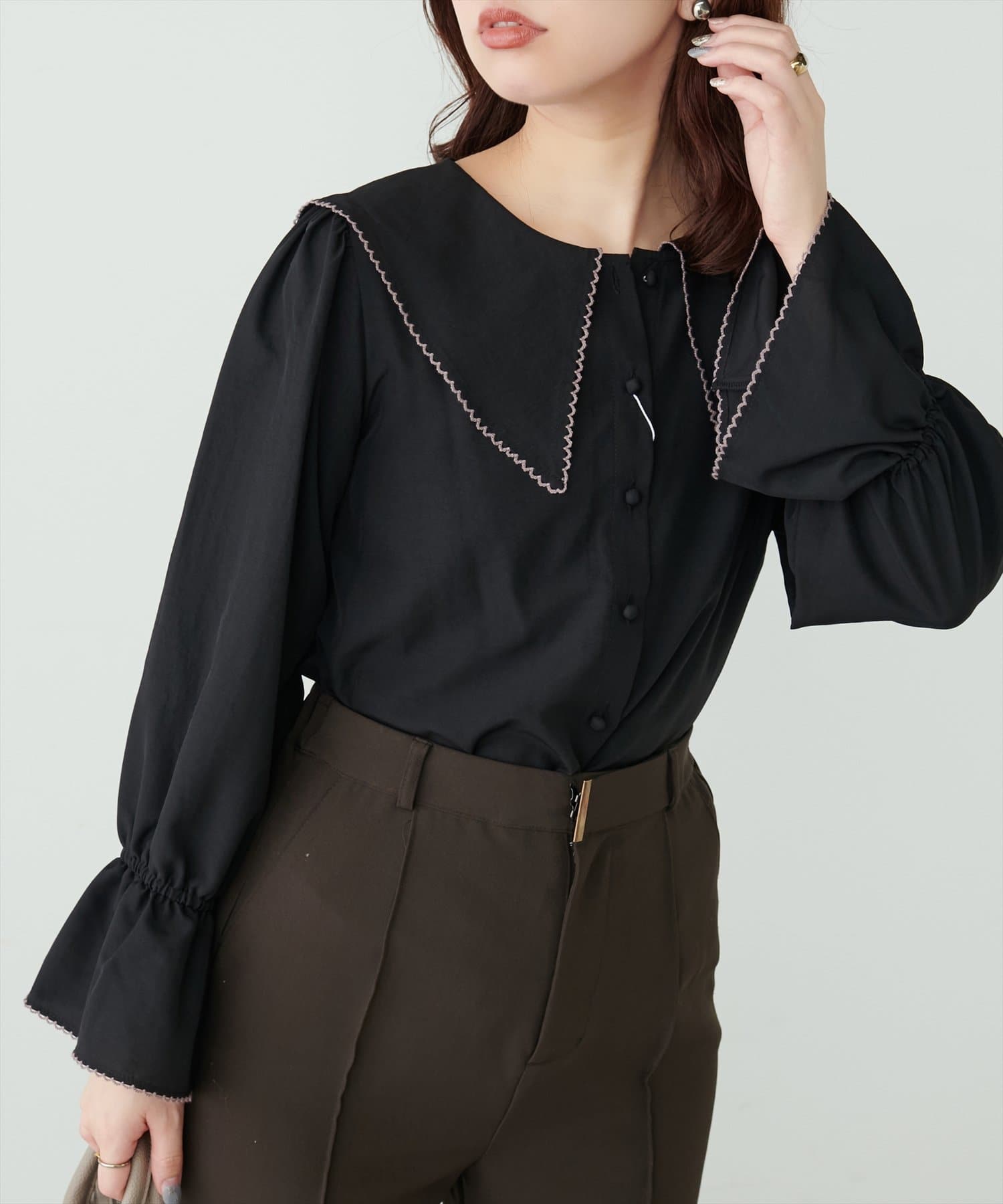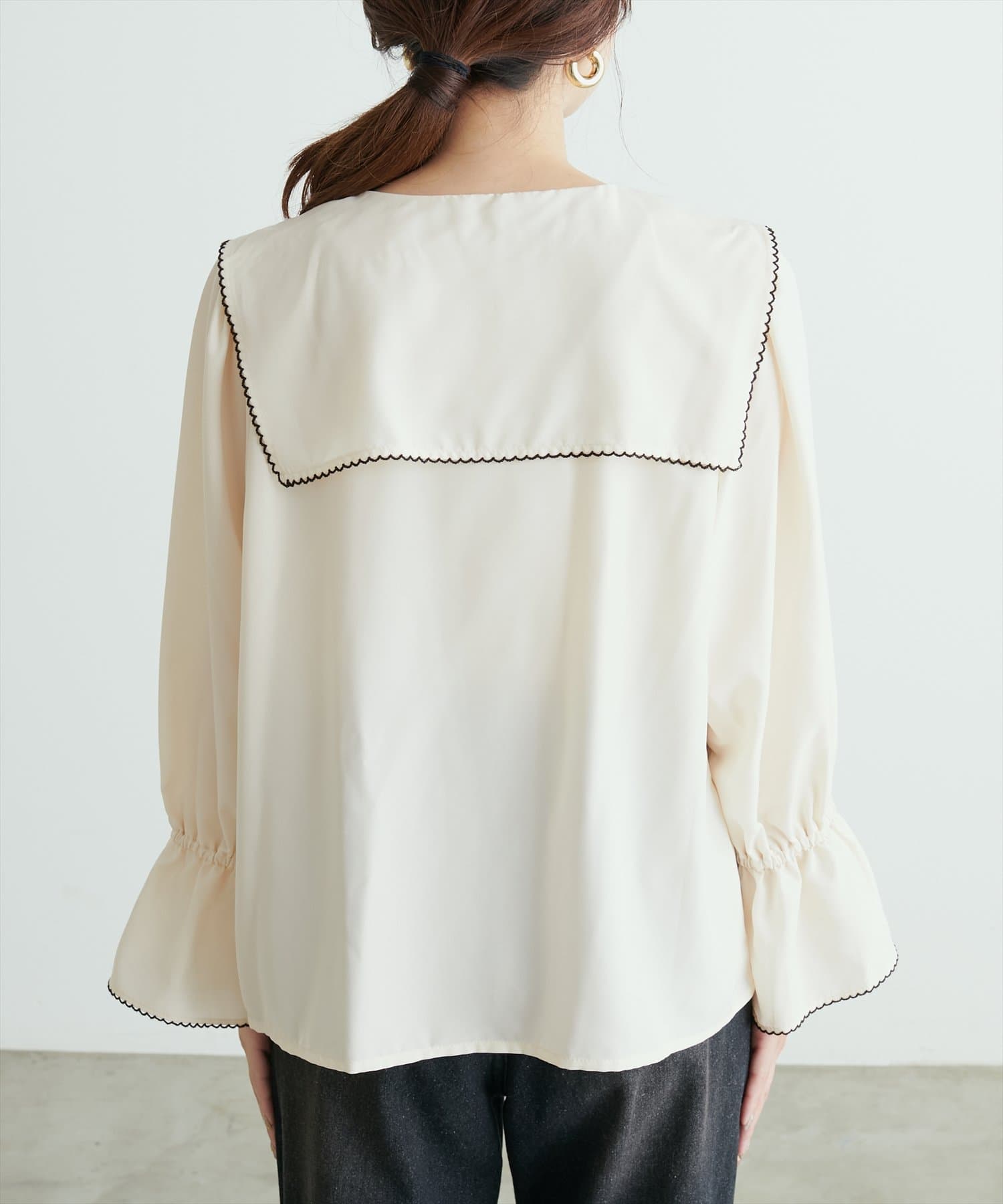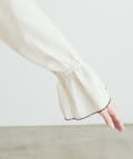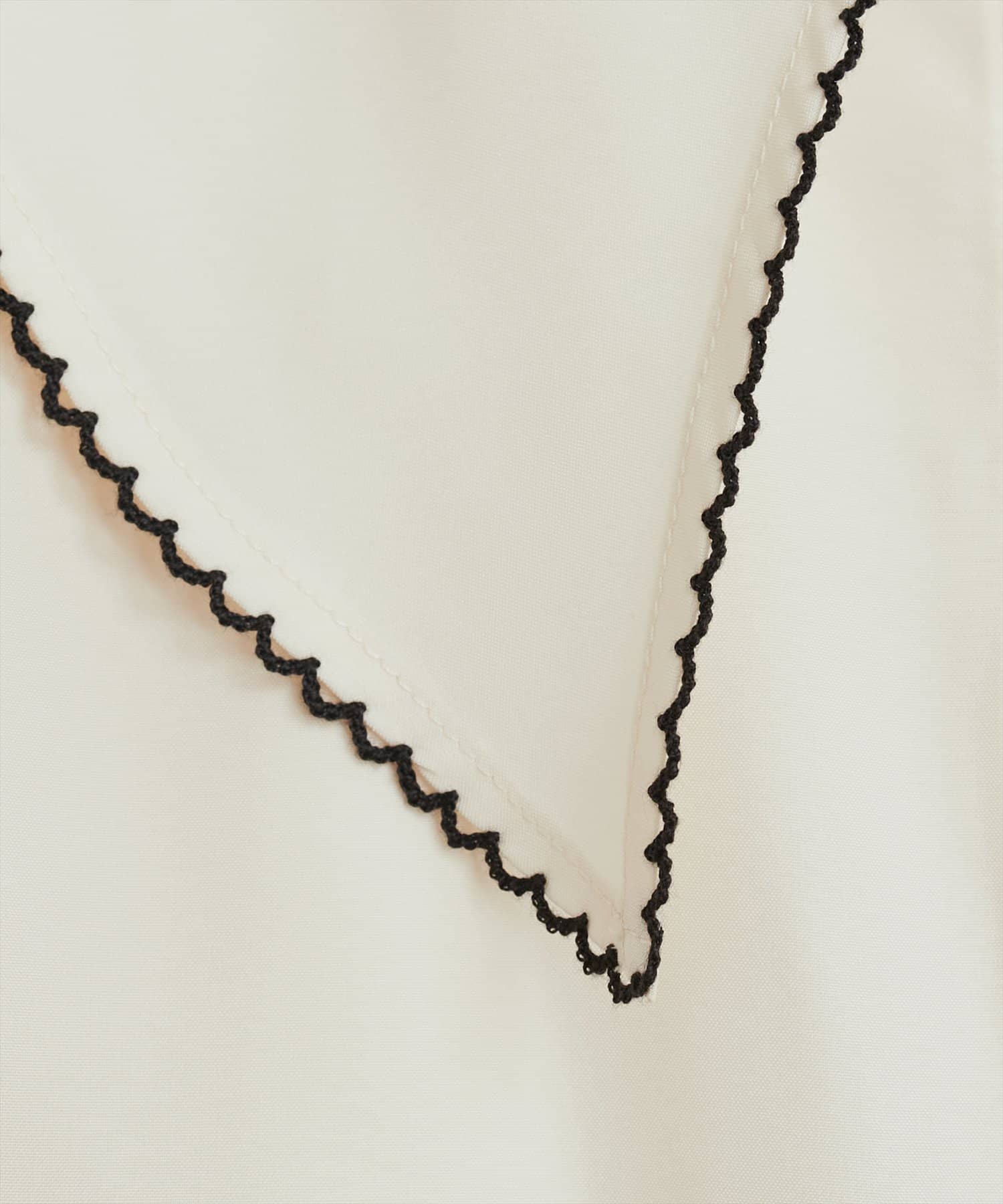 衿端と袖口にあしらったスカラップ刺繍がキャチーなブラウス。