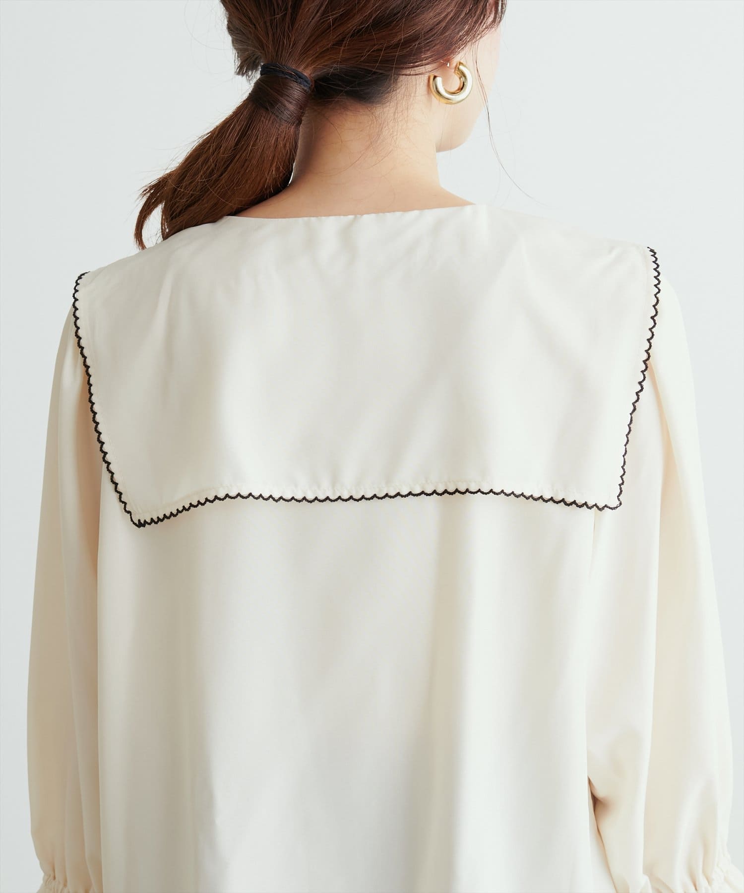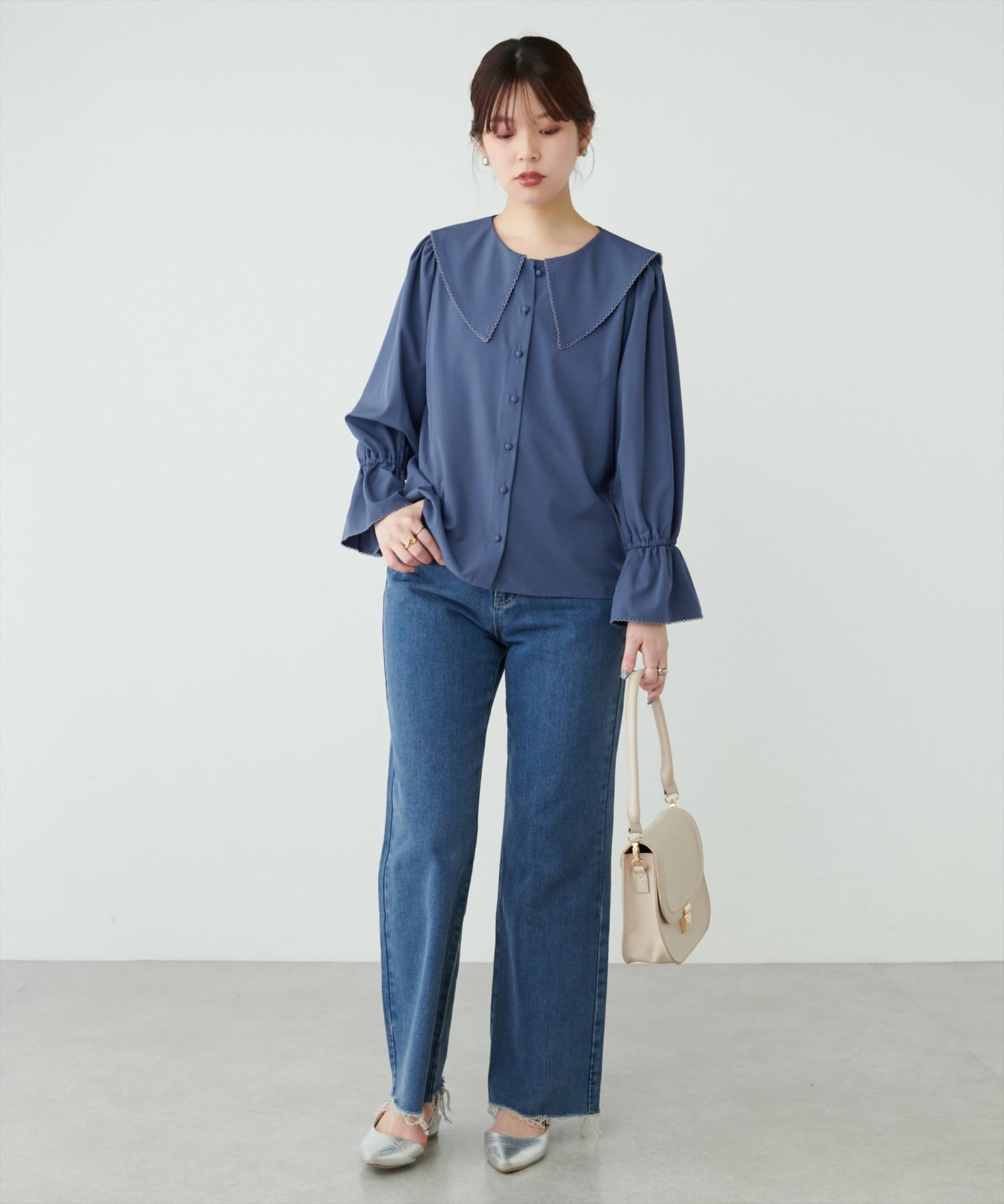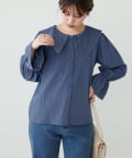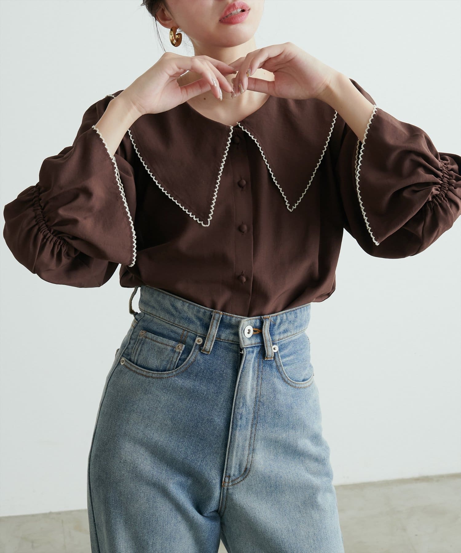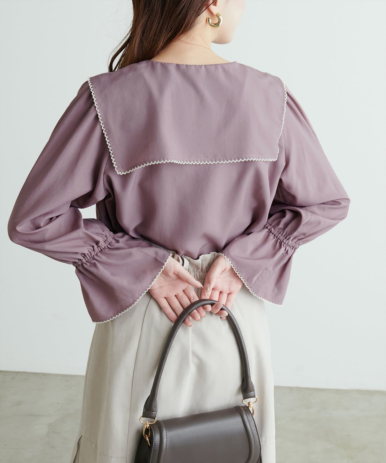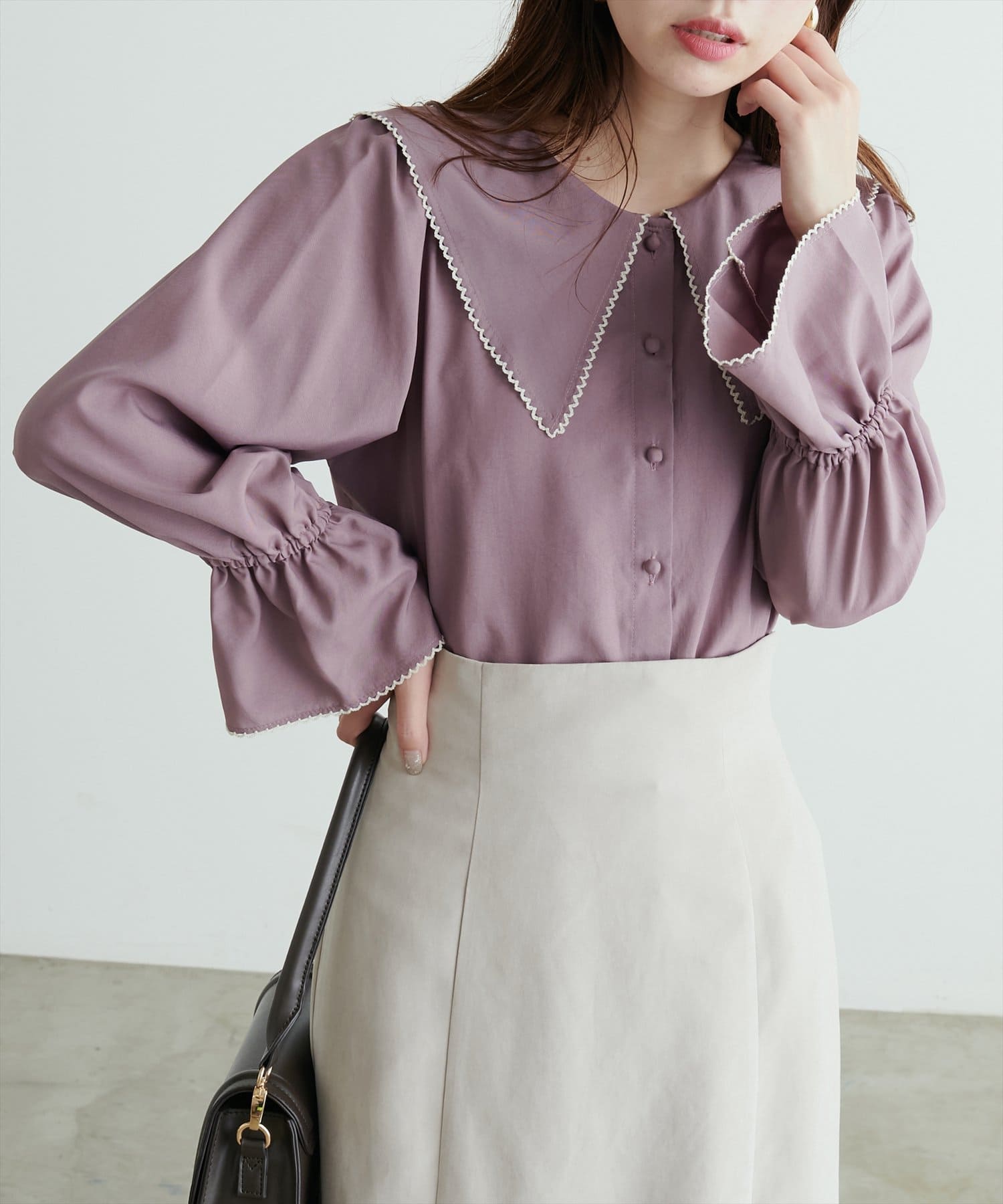 衿端と袖口にあしらったスカラップ刺繍がキャチーなブラウス。