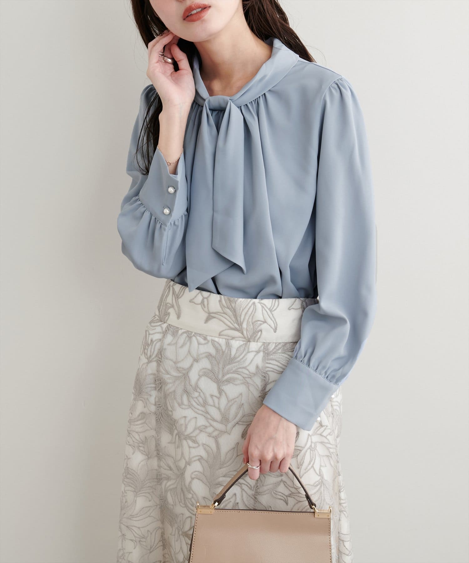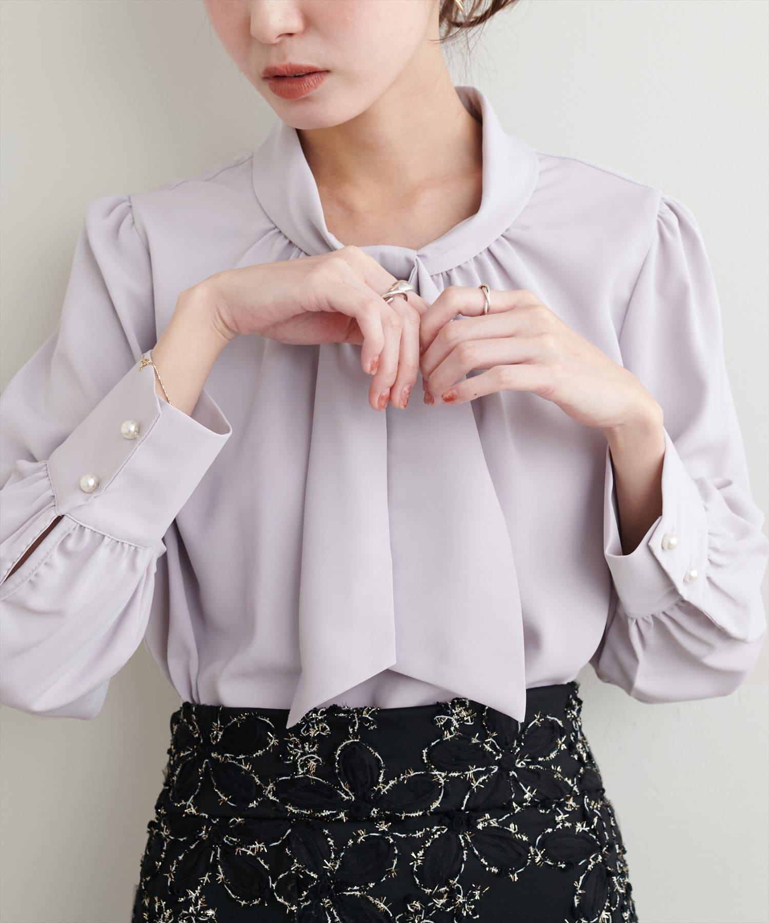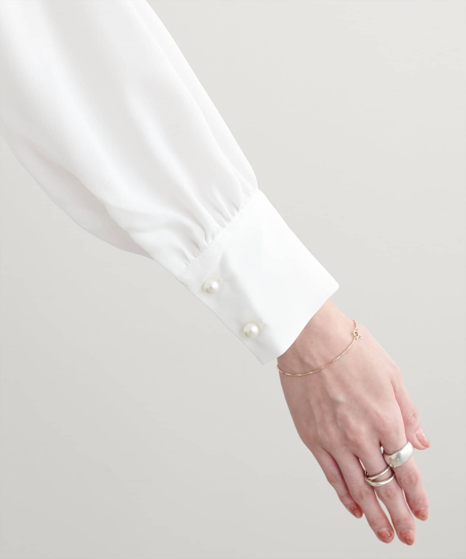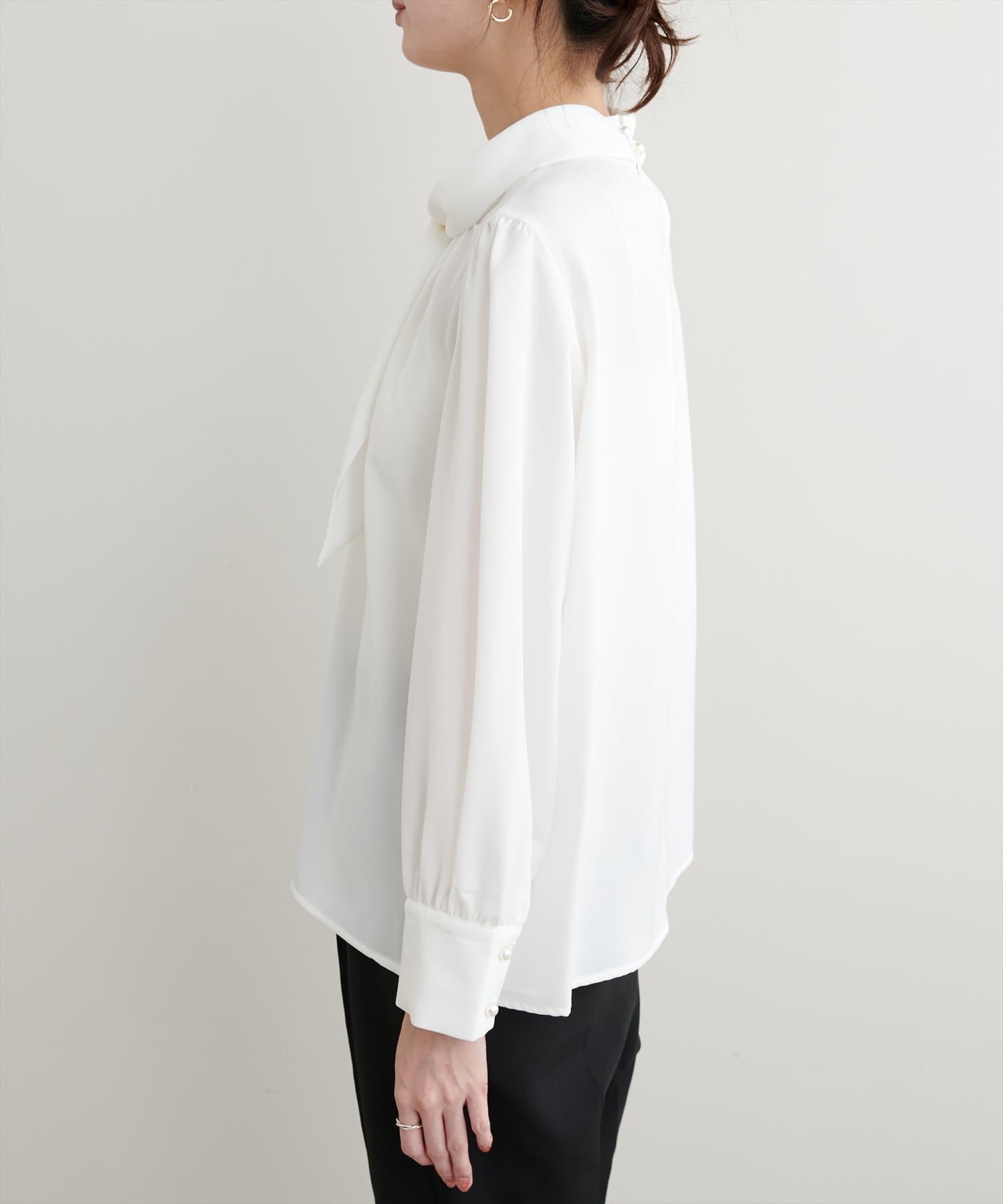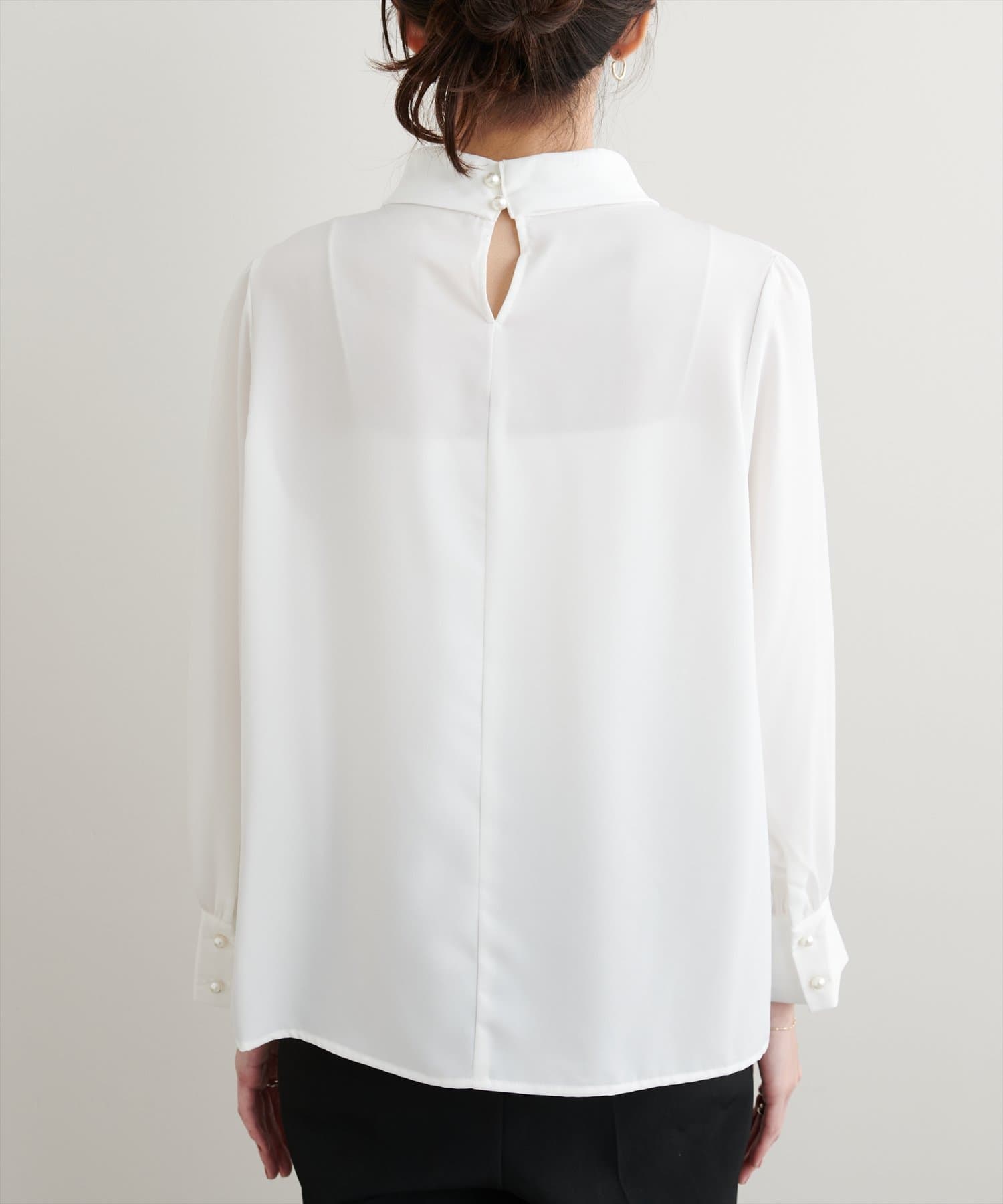 ネック部分と袖口に施したパールが大人上品な、デザイナー一押しの今季注目ブラウス。