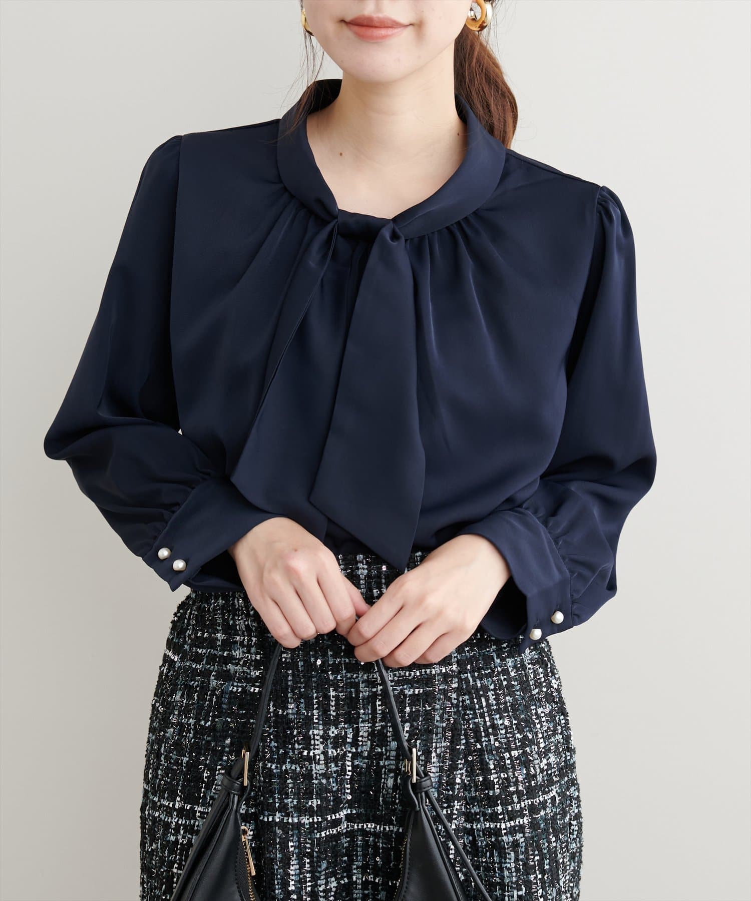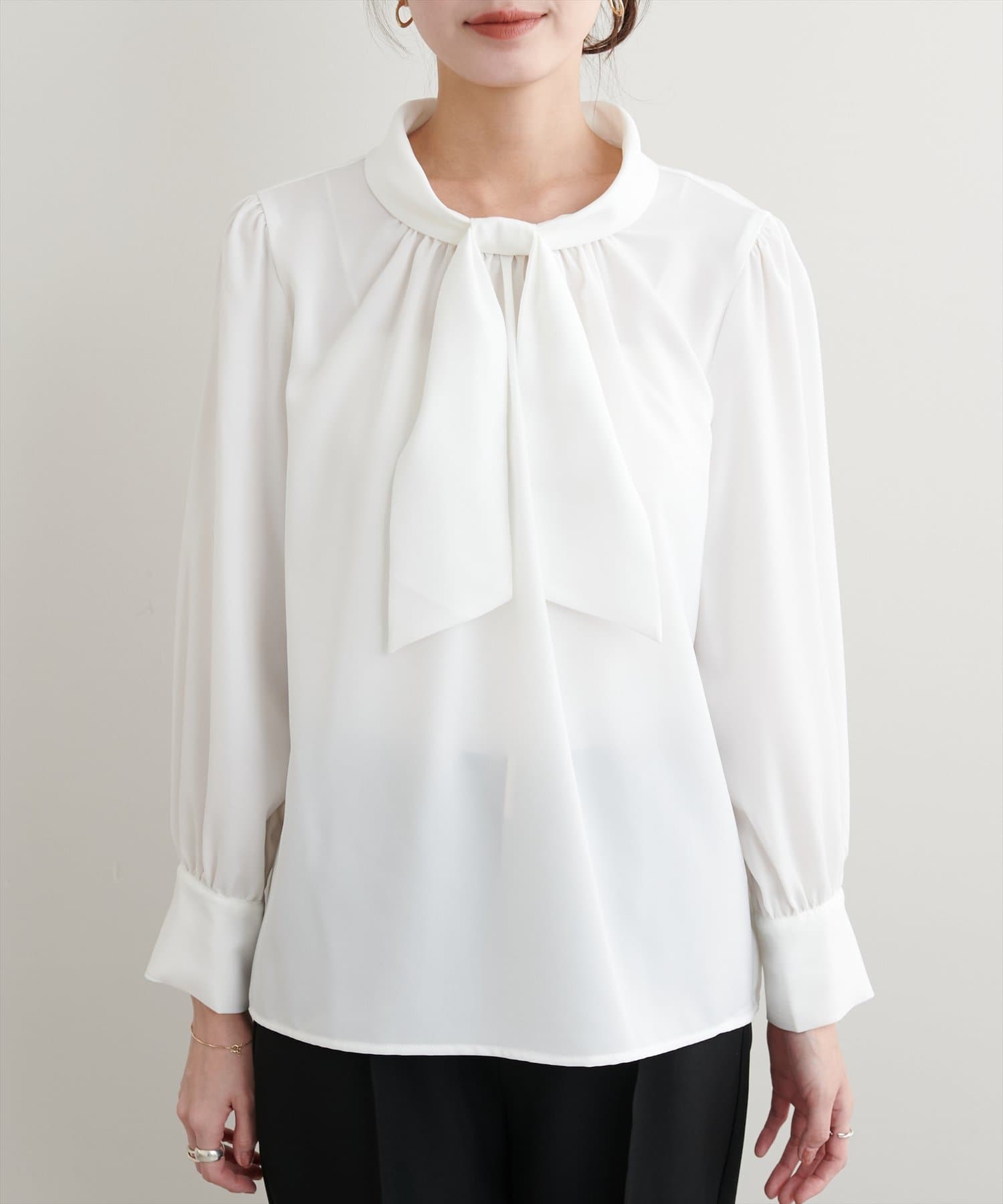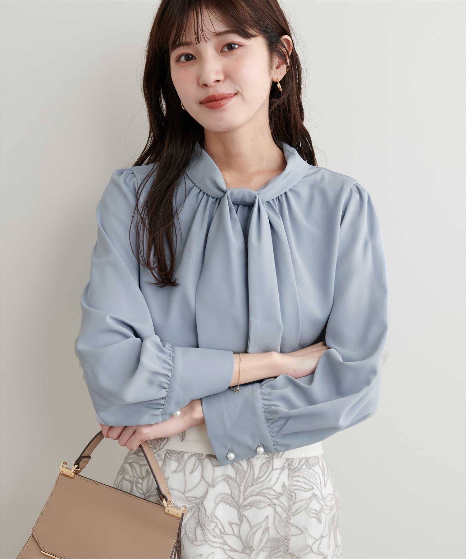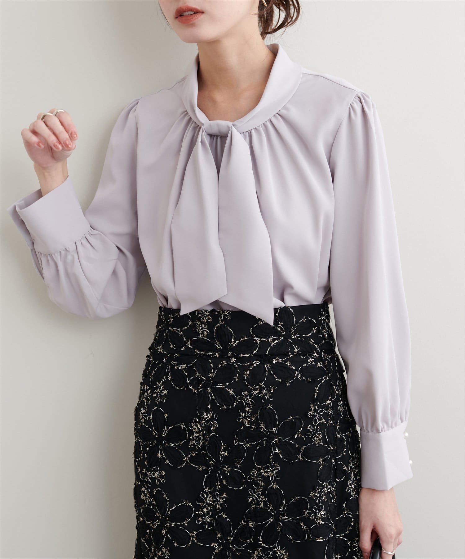 ネック部分と袖口に施したパールが大人上品な、デザイナー一押しの今季注目ブラウス。