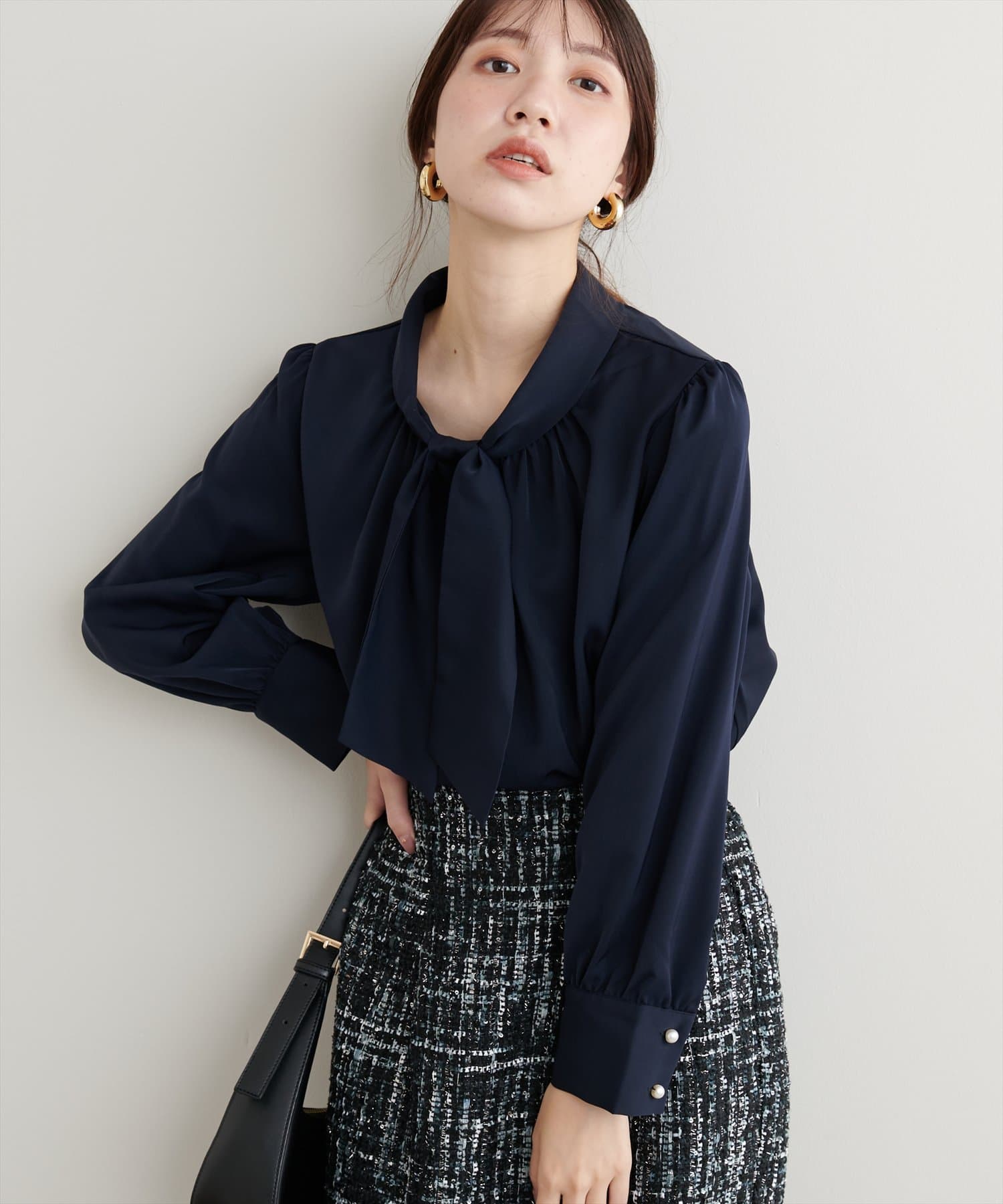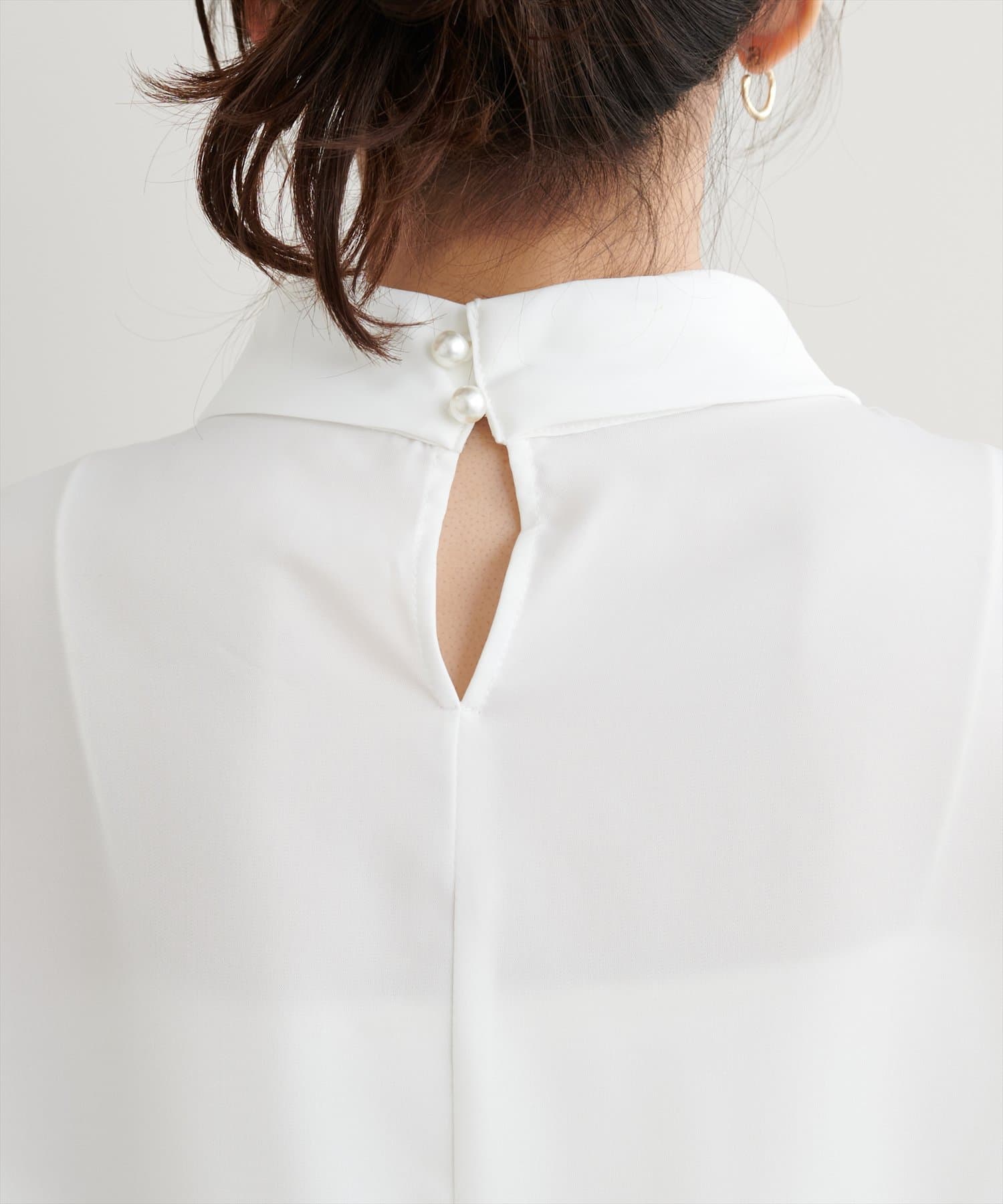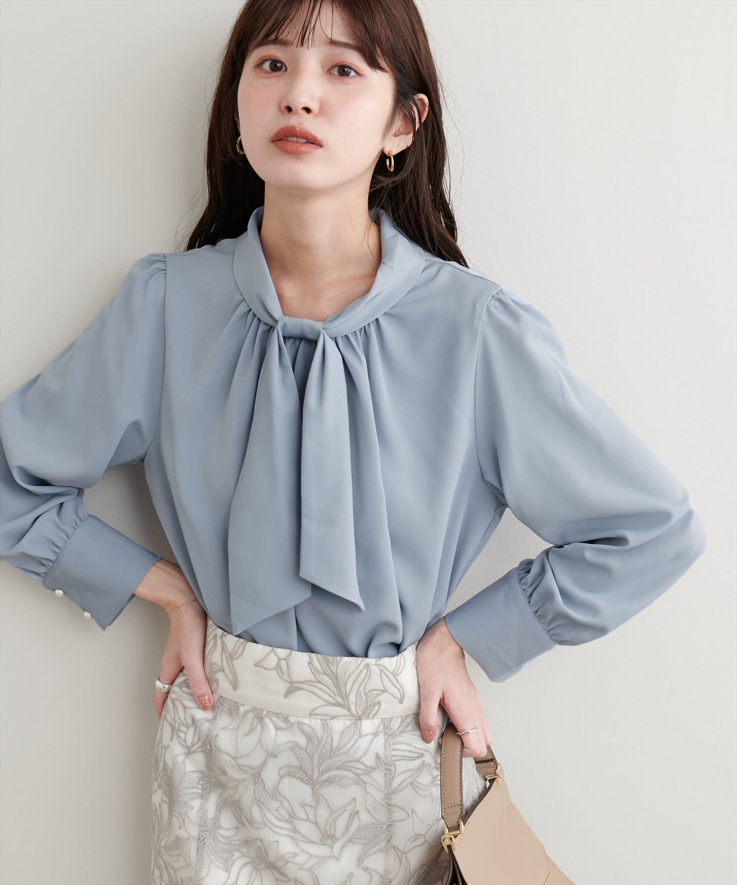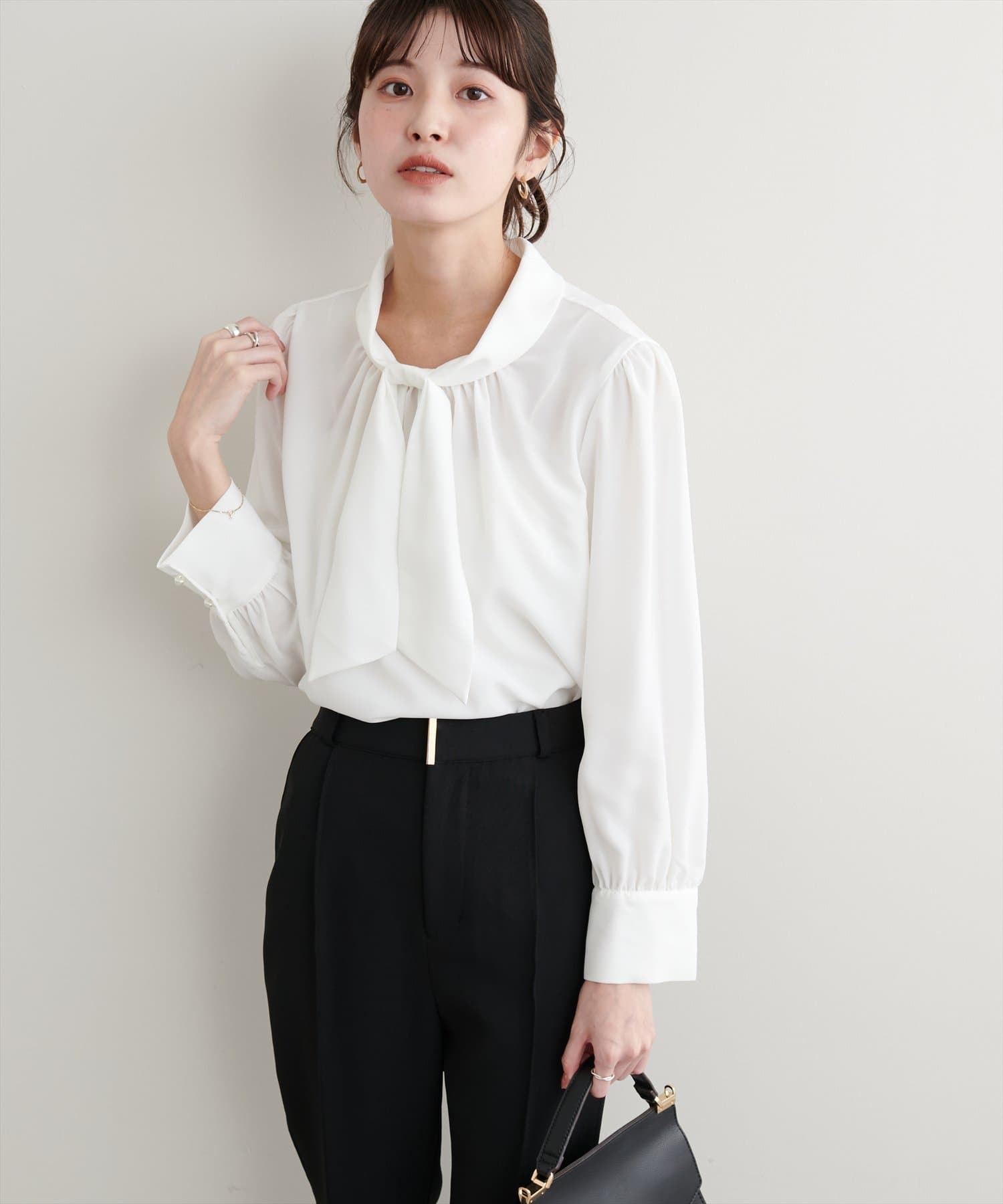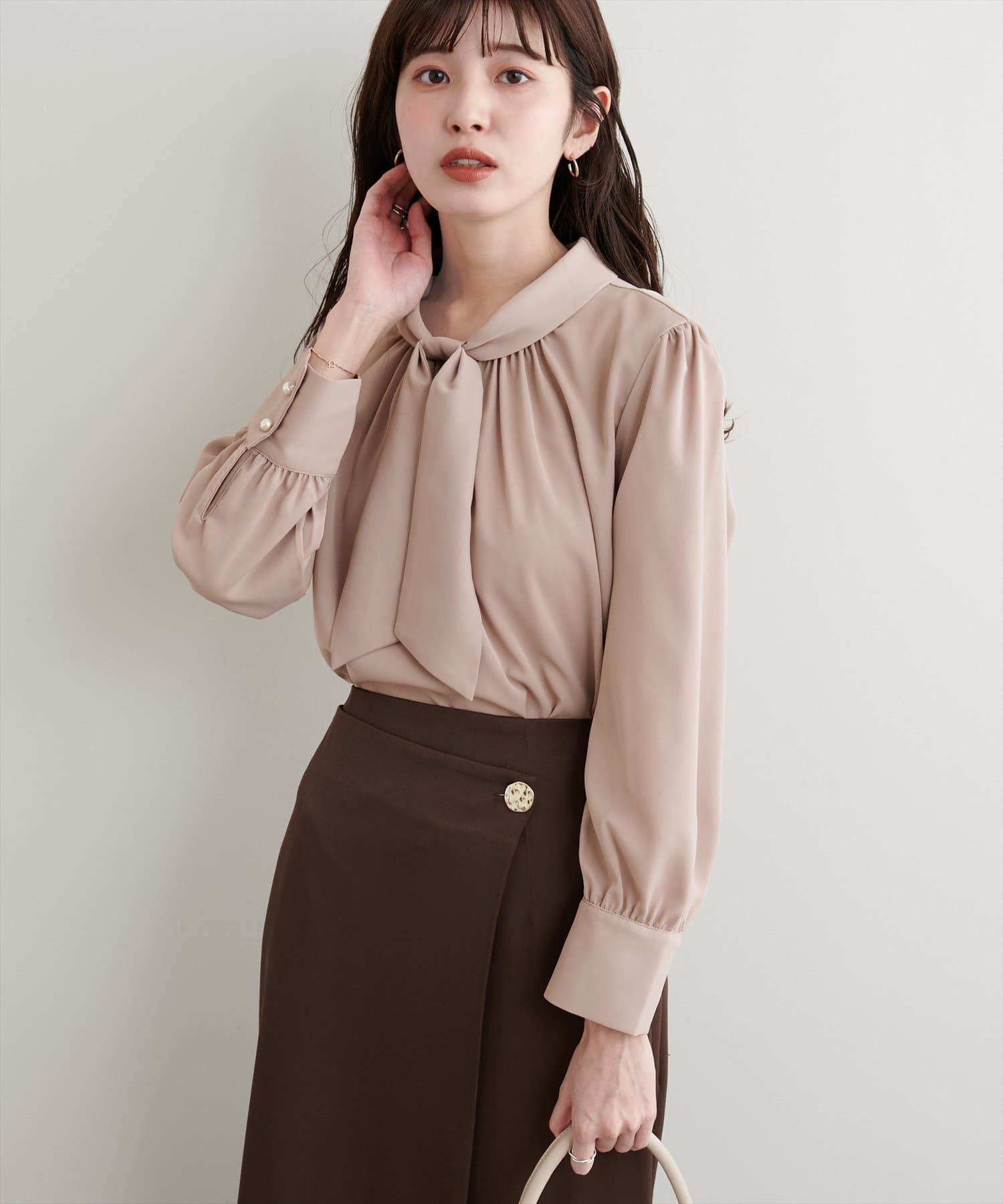 ネック部分と袖口に施したパールが大人上品な、デザイナー一押しの今季注目ブラウス。