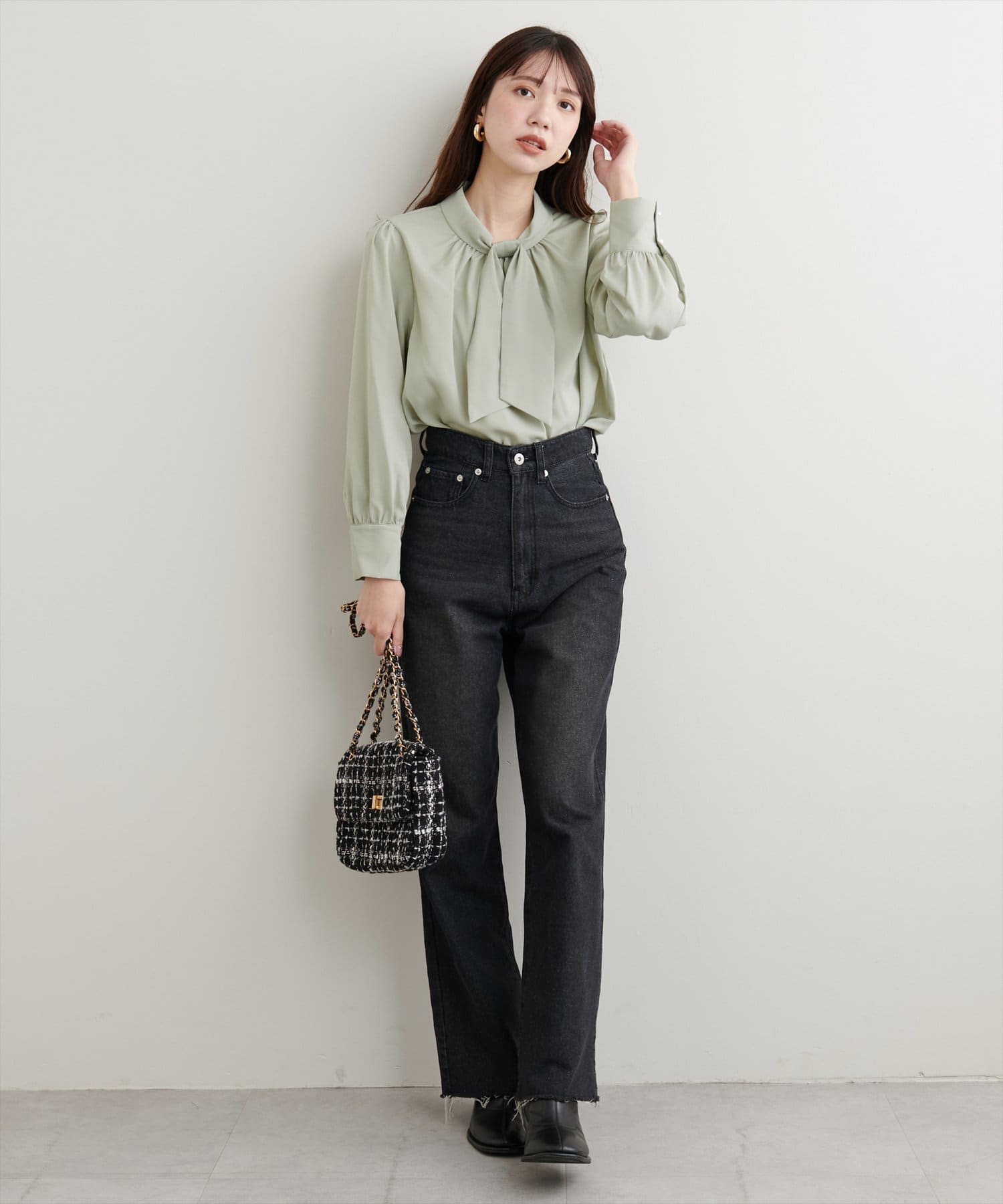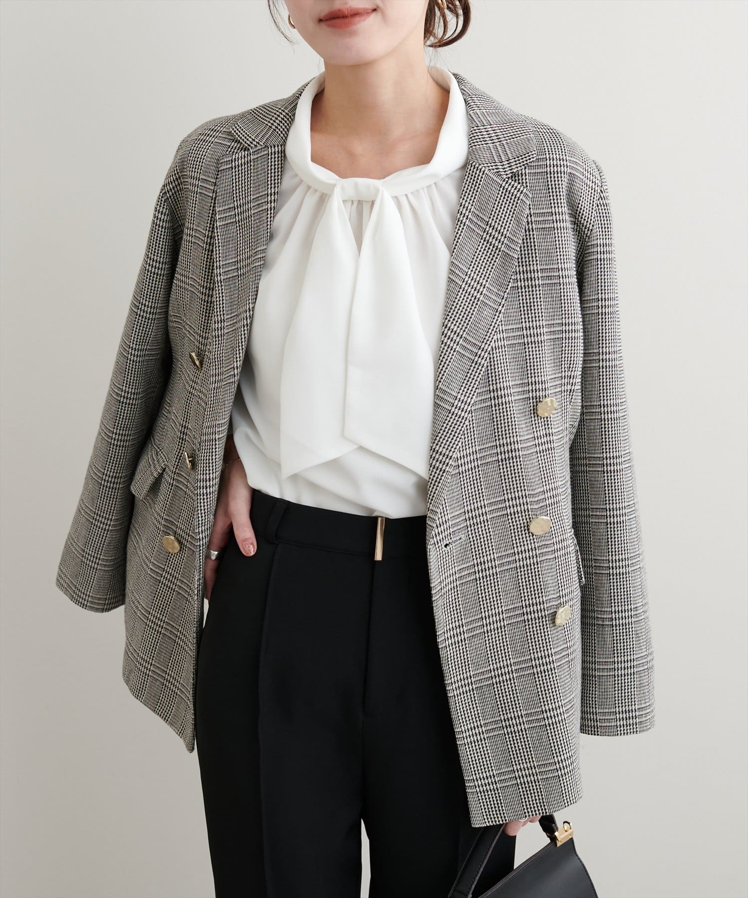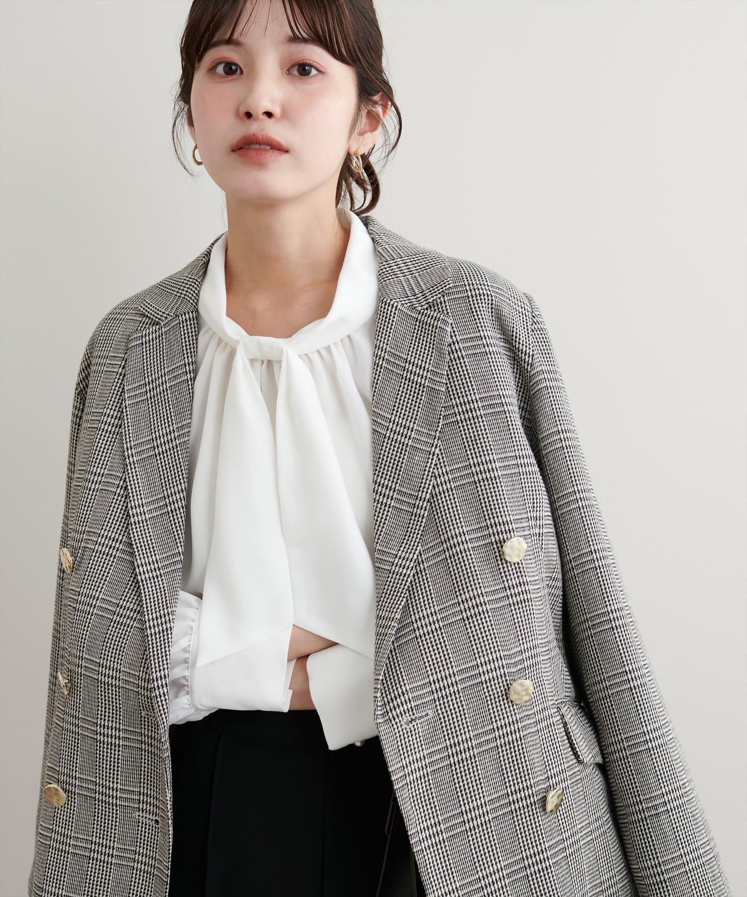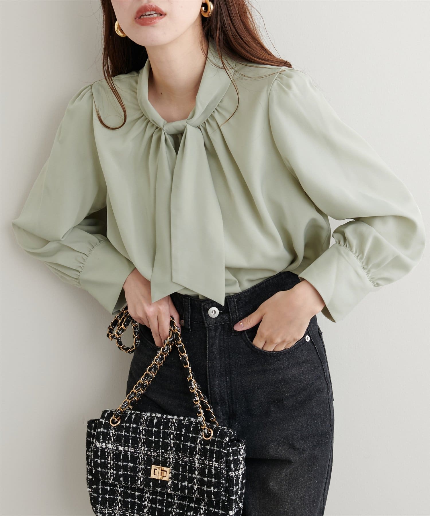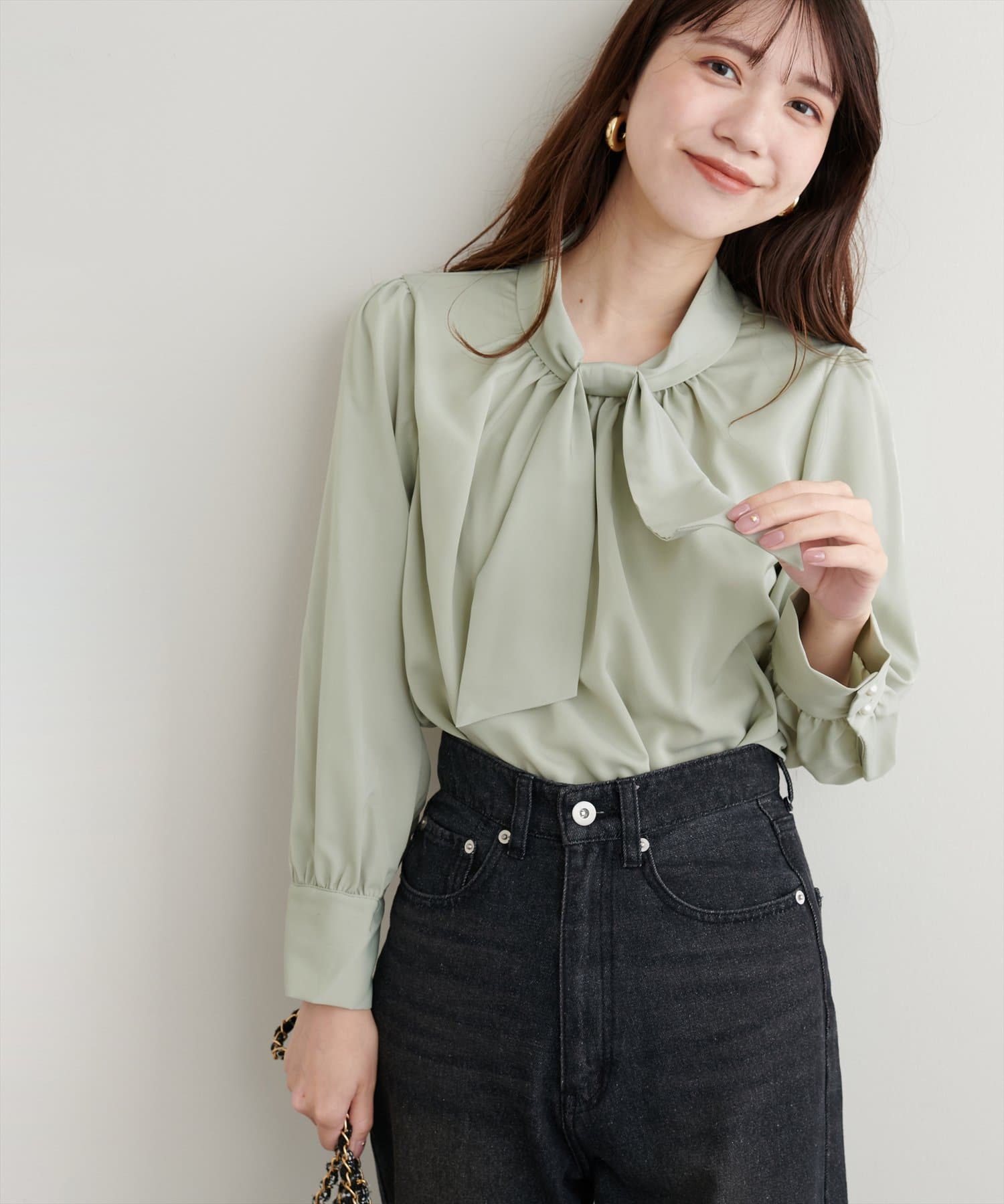 ネック部分と袖口に施したパールが大人上品な、デザイナー一押しの今季注目ブラウス。