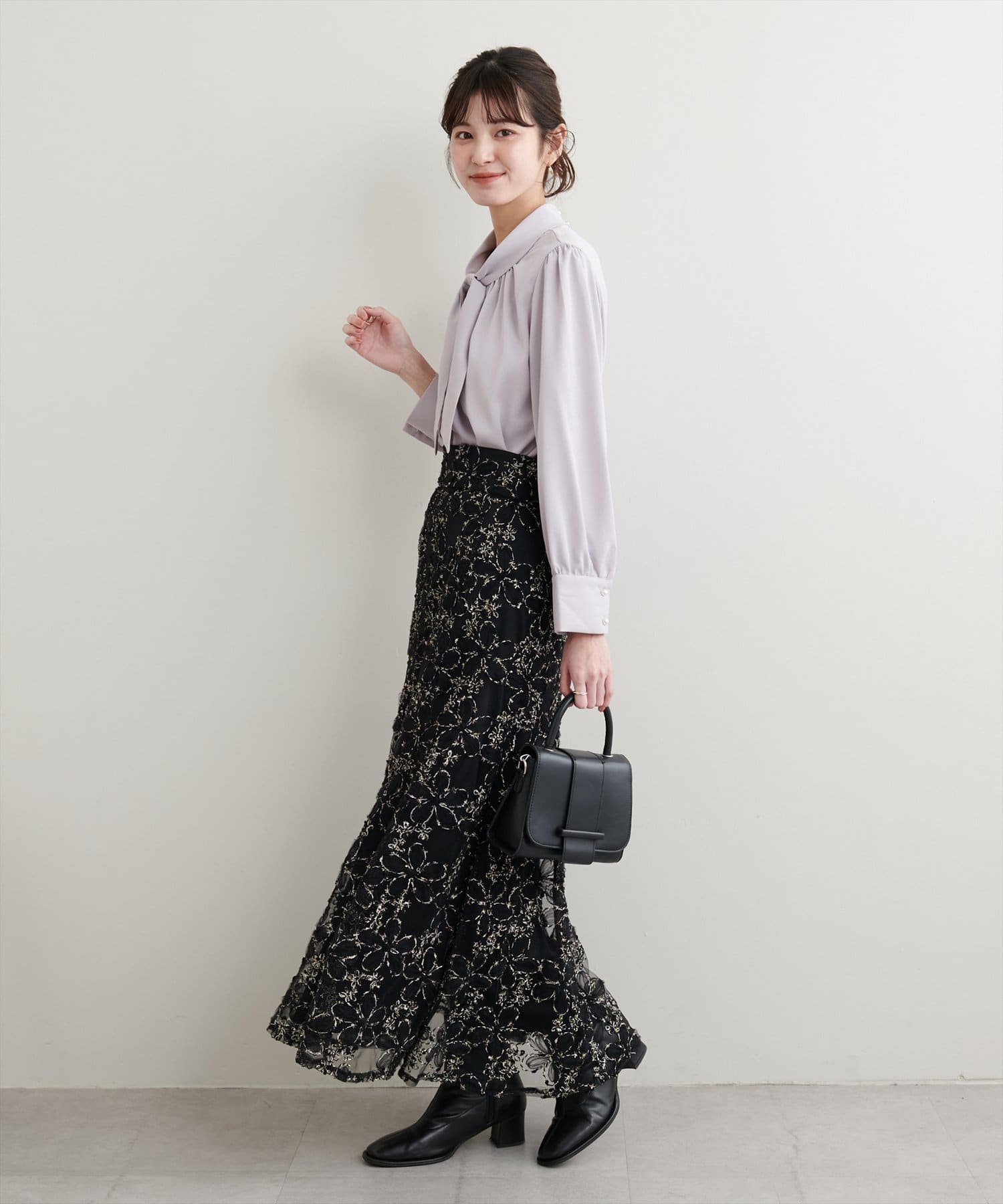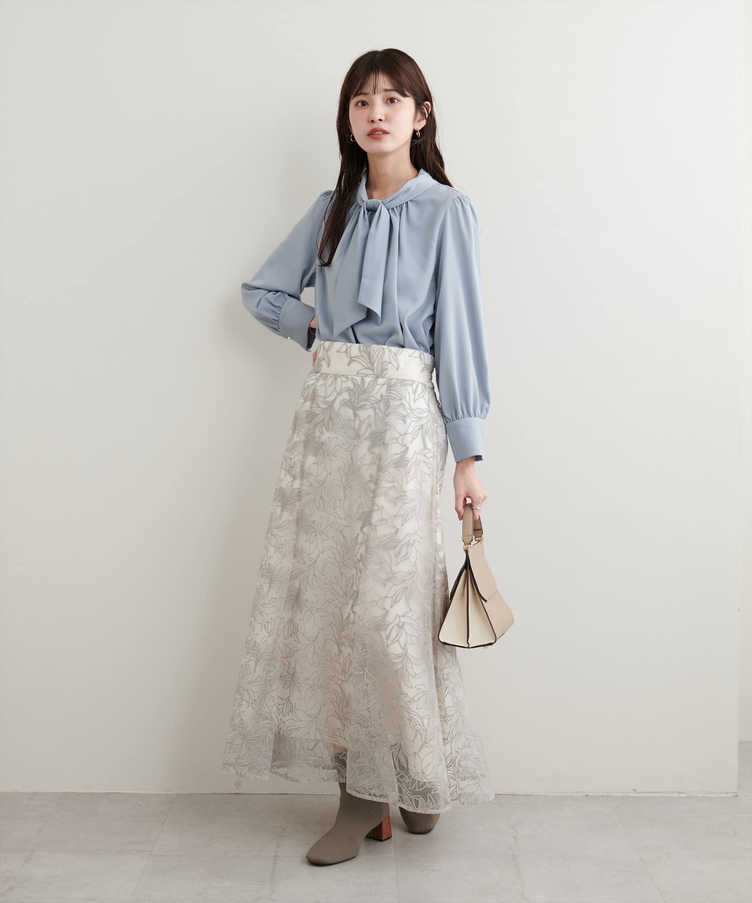 マーメイドシルエットやフレアラインのスカートにウエストインして頂くと、
