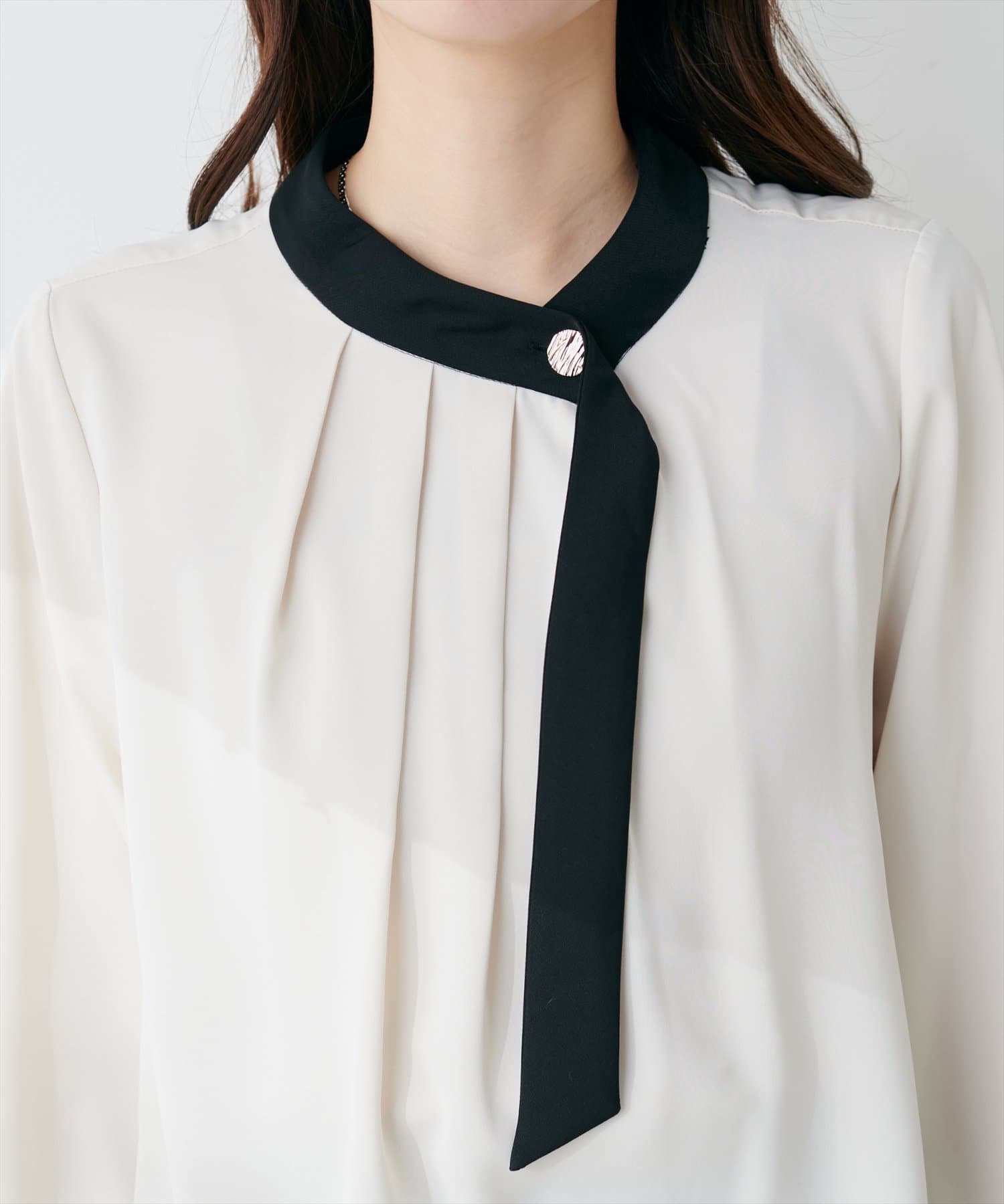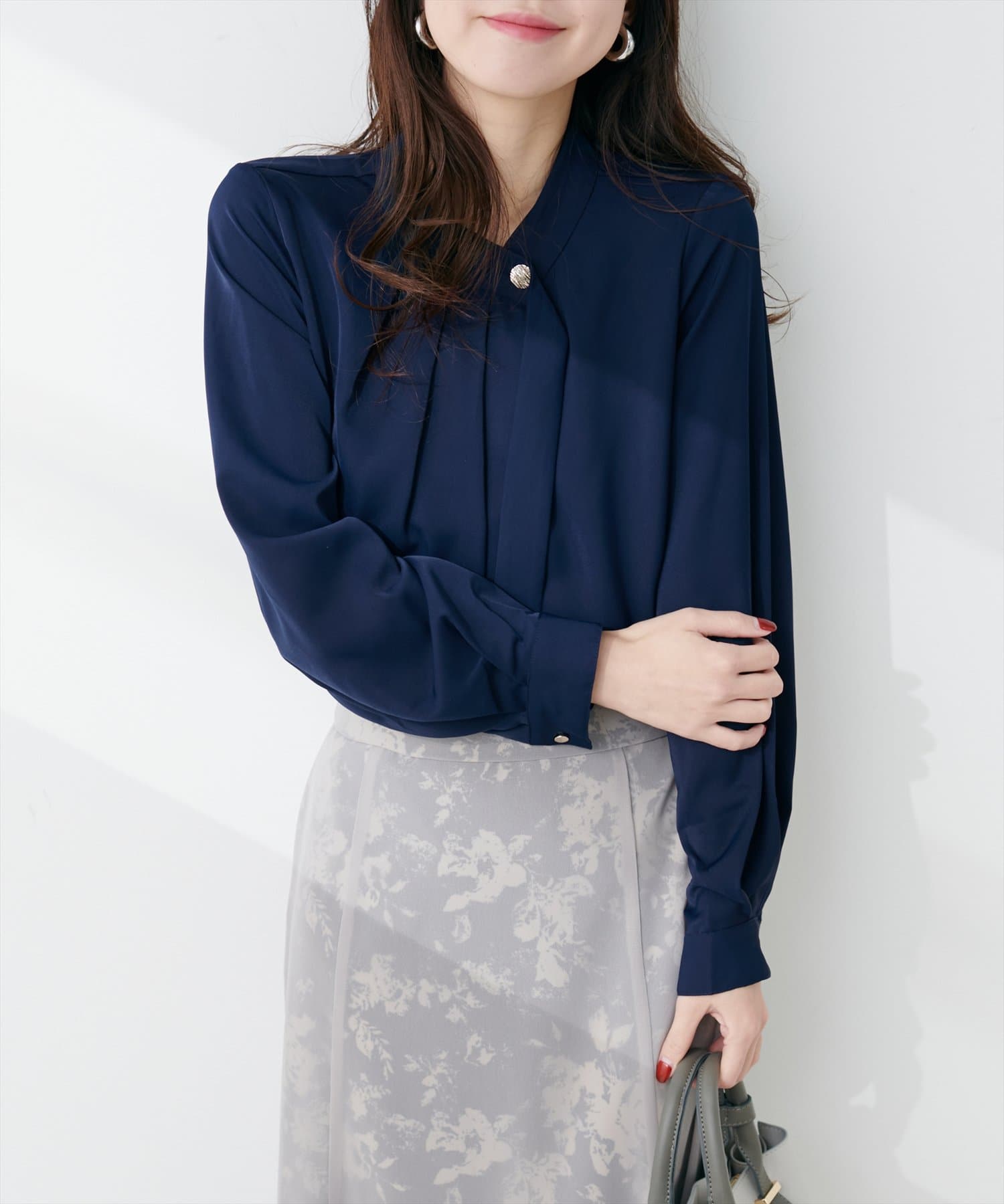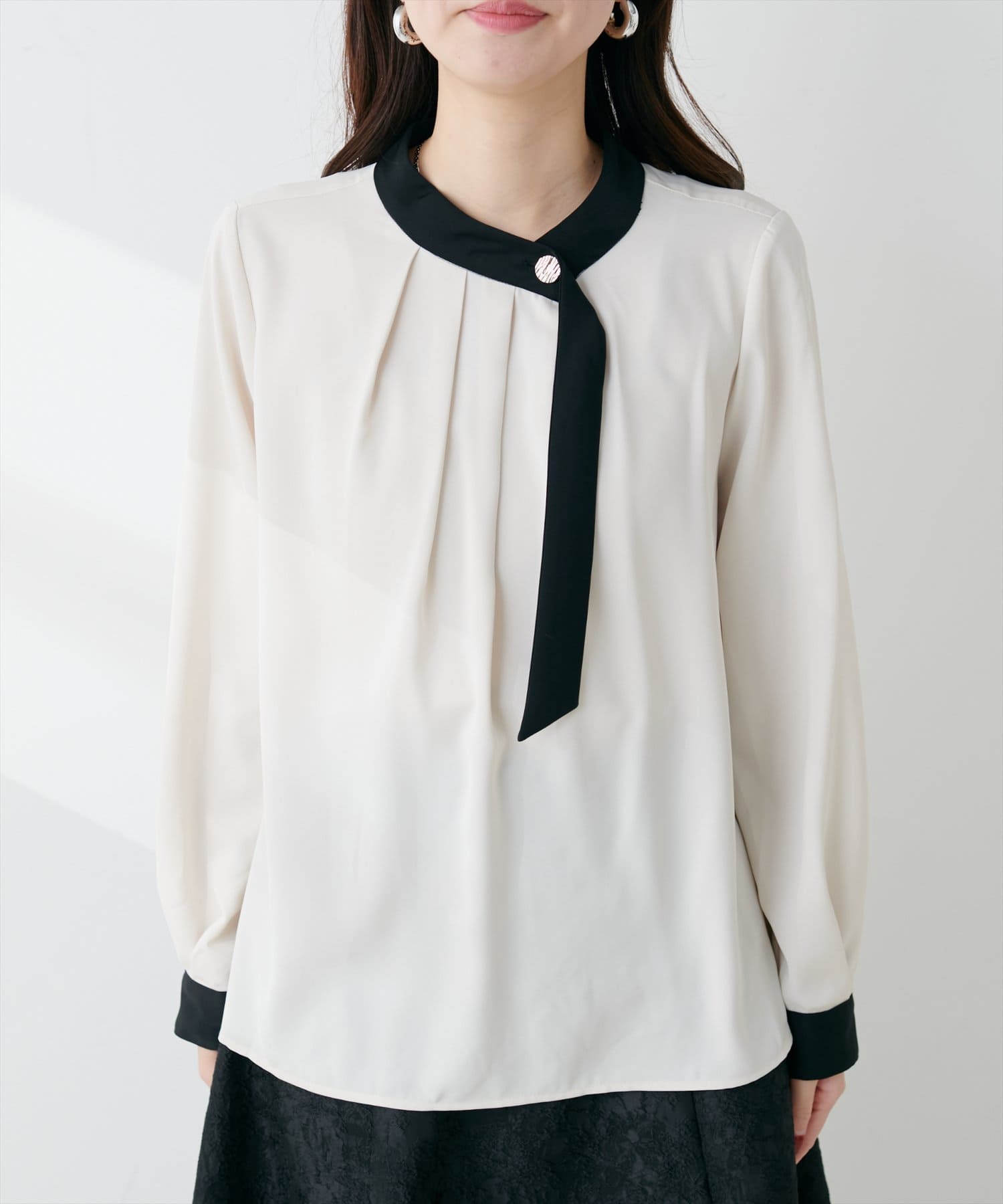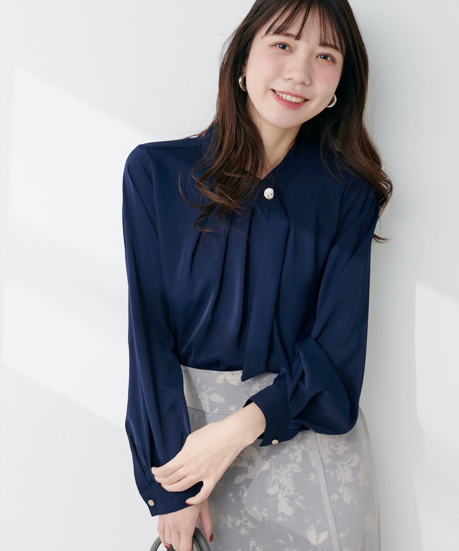 金釦とアシメネックボウタイがポイントの大人上品ブラウス。