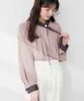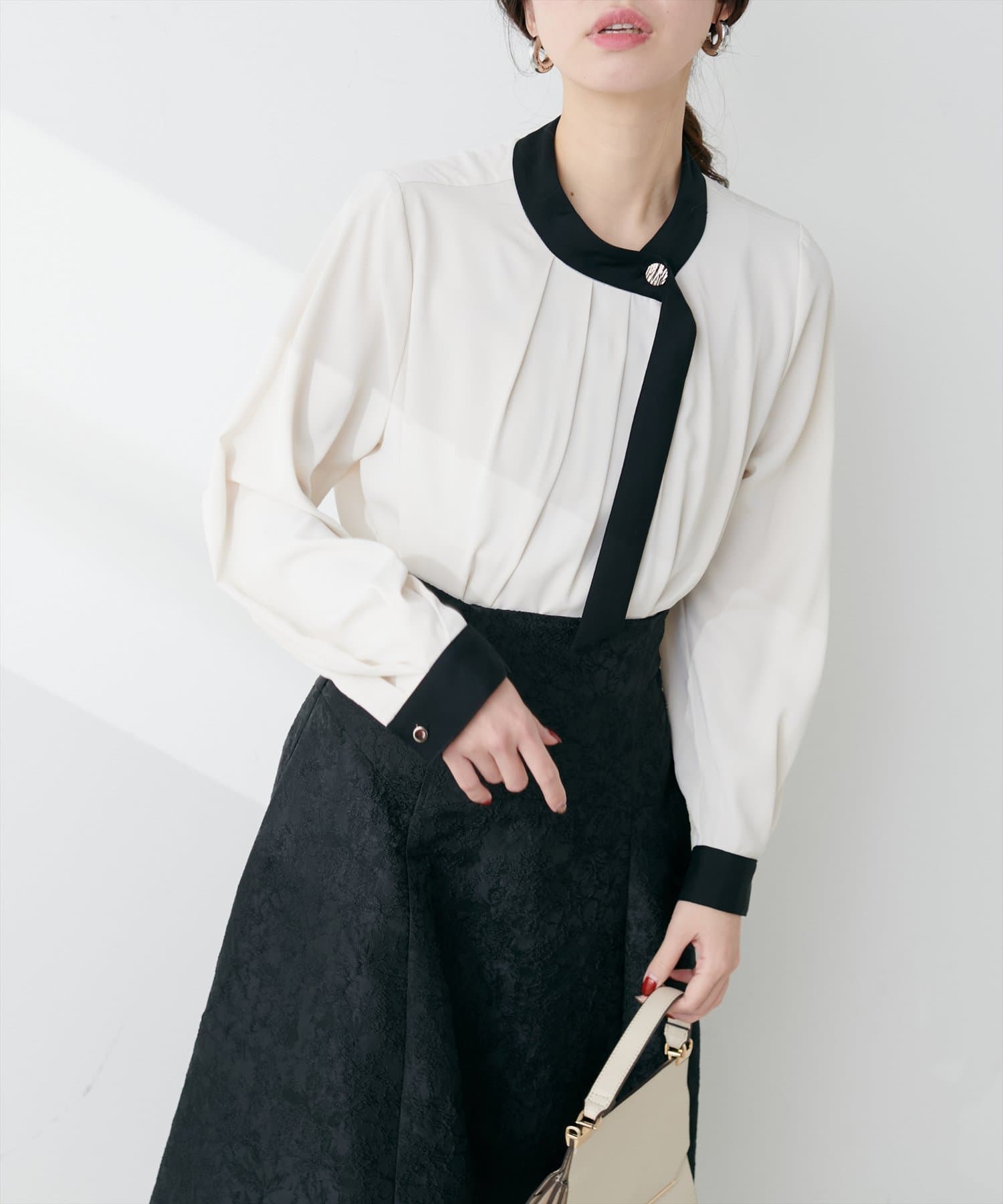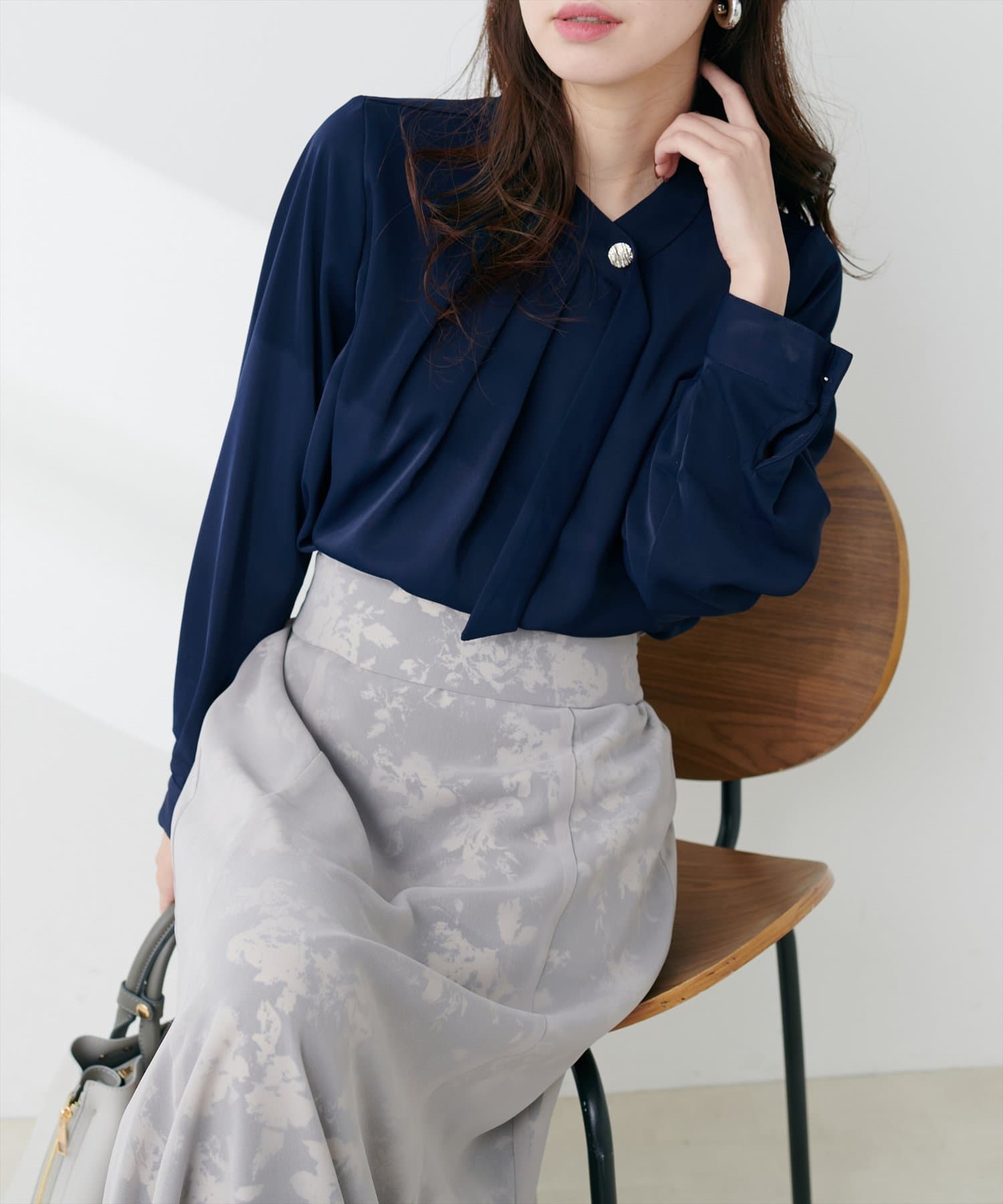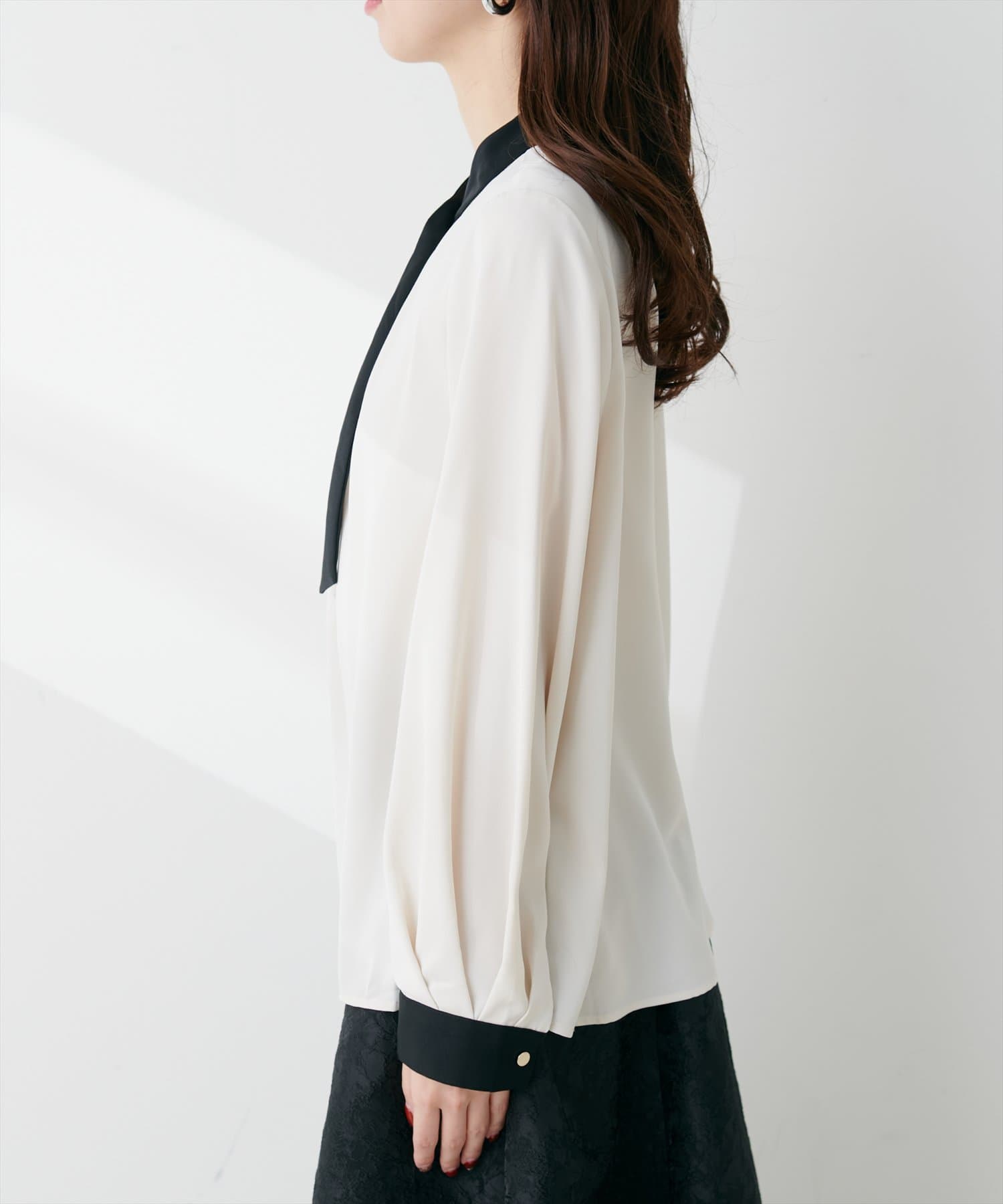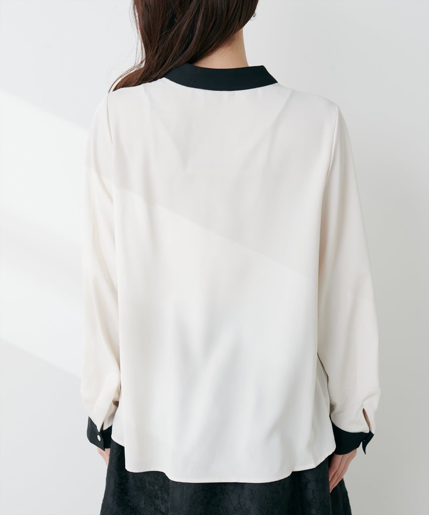 金釦とアシメネックボウタイがポイントの大人上品ブラウス。