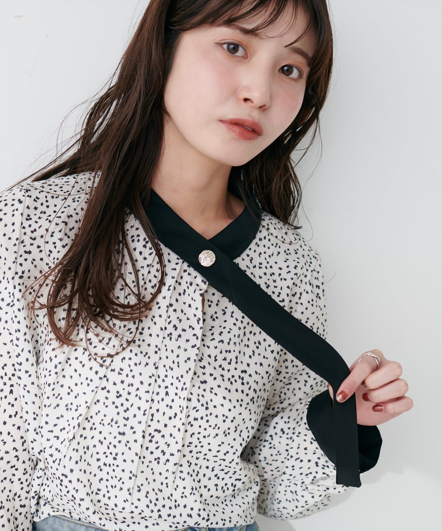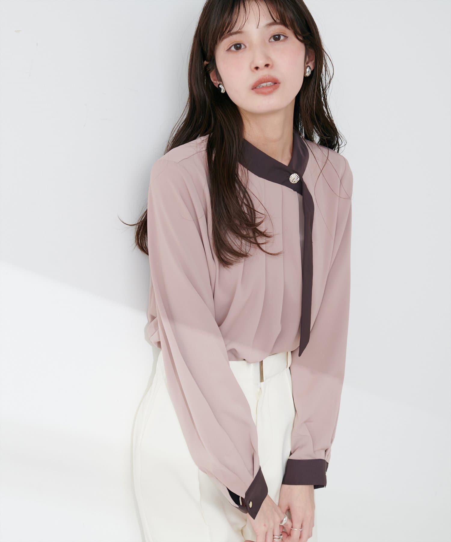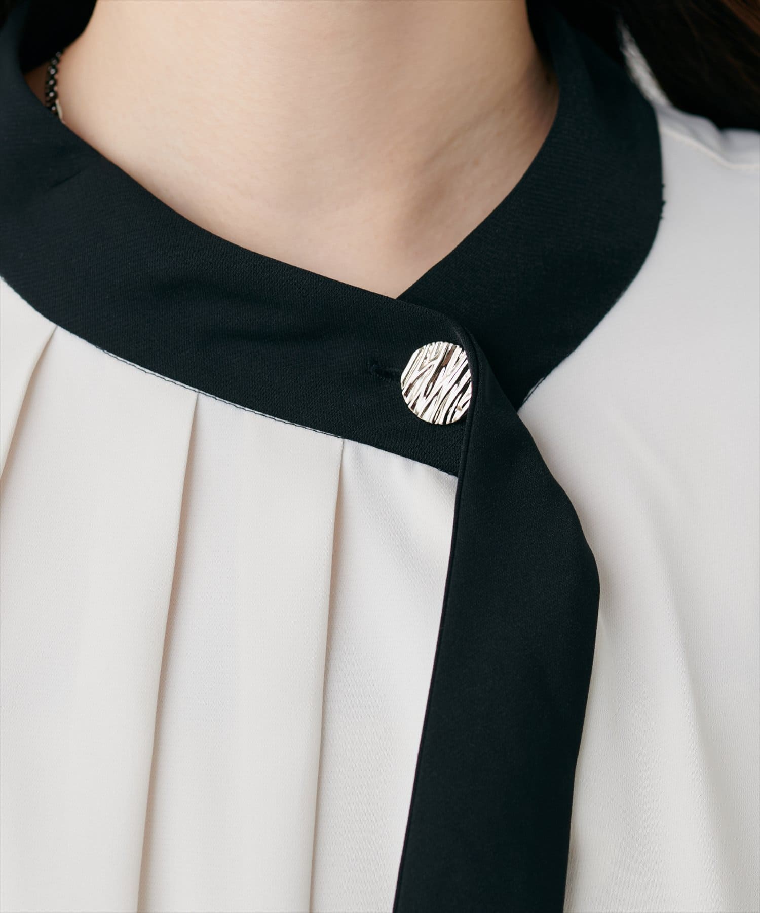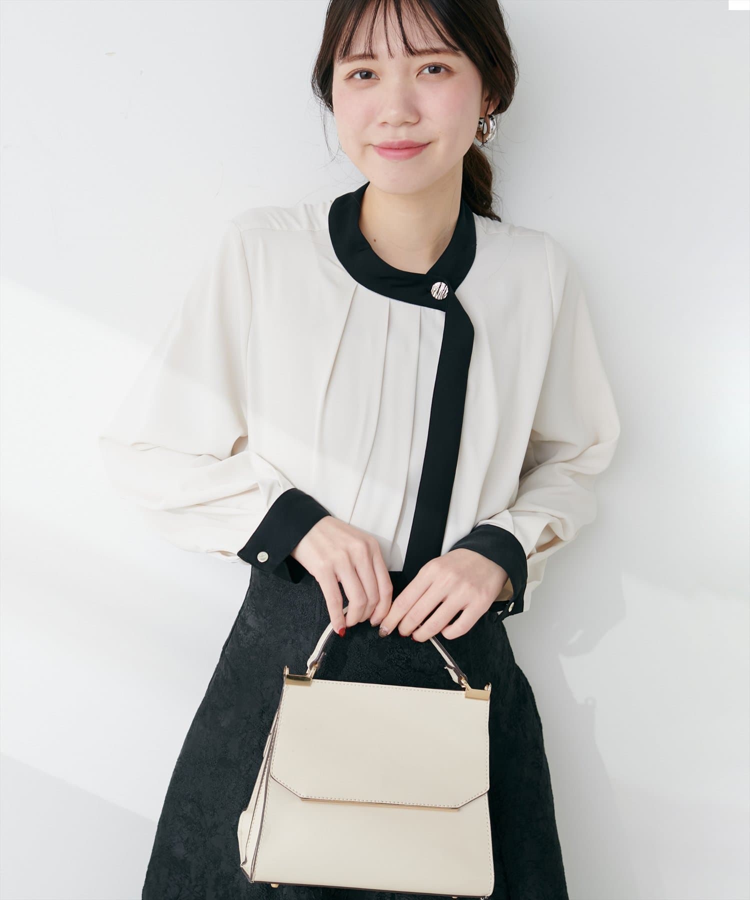 金釦とアシメネックボウタイがポイントの大人上品ブラウス。