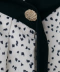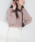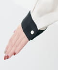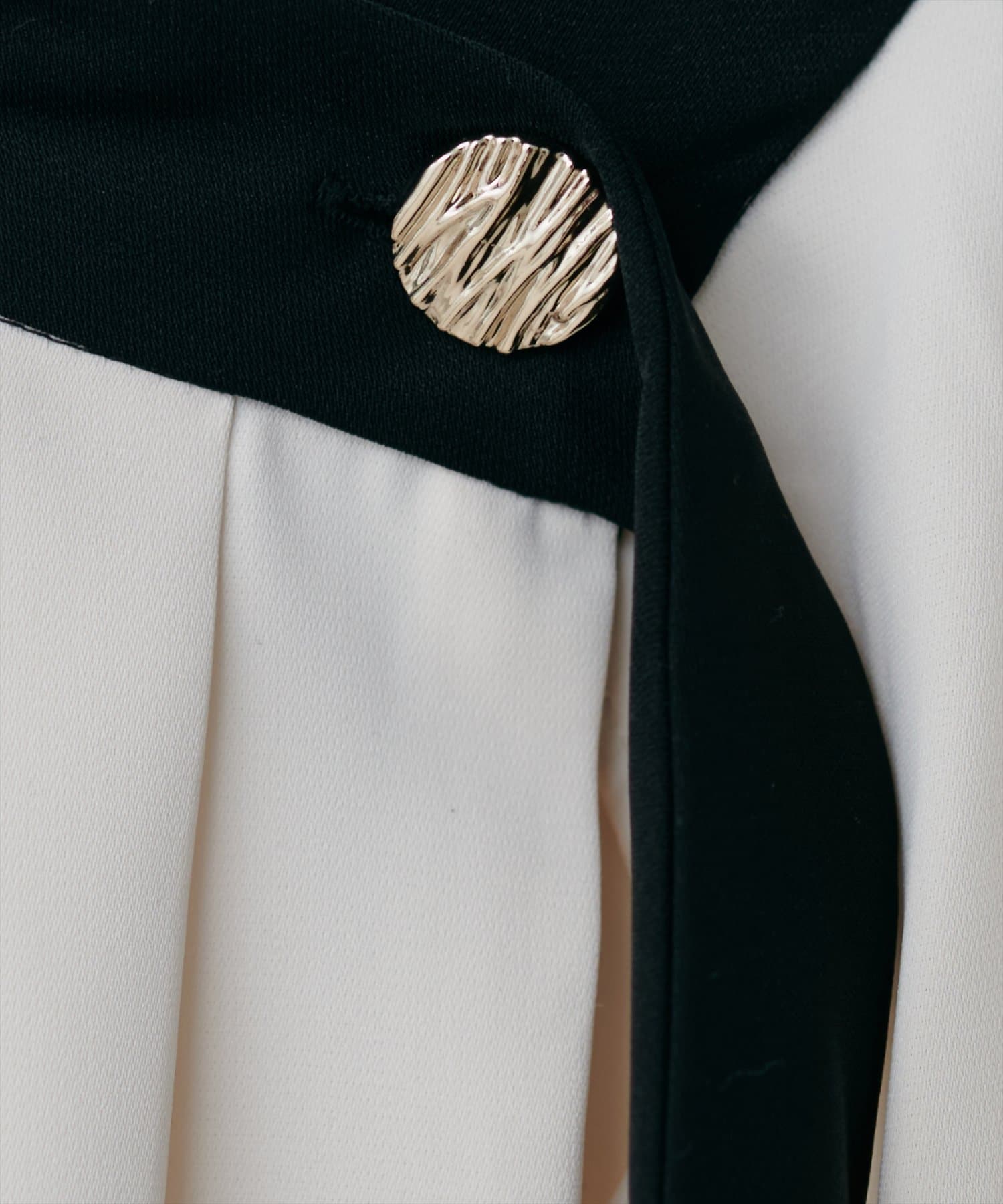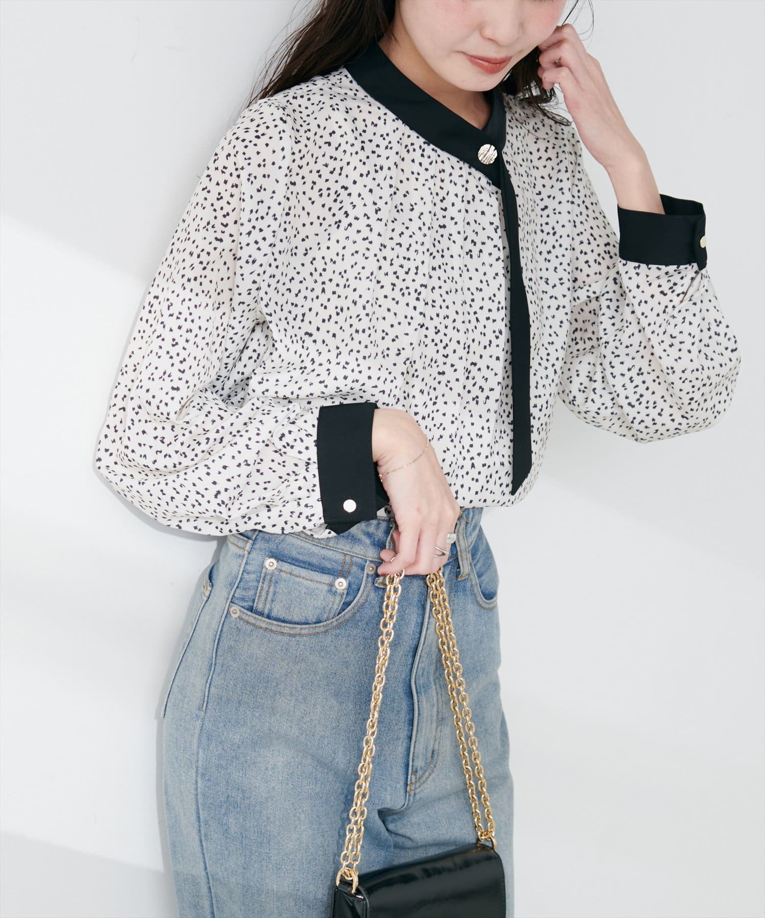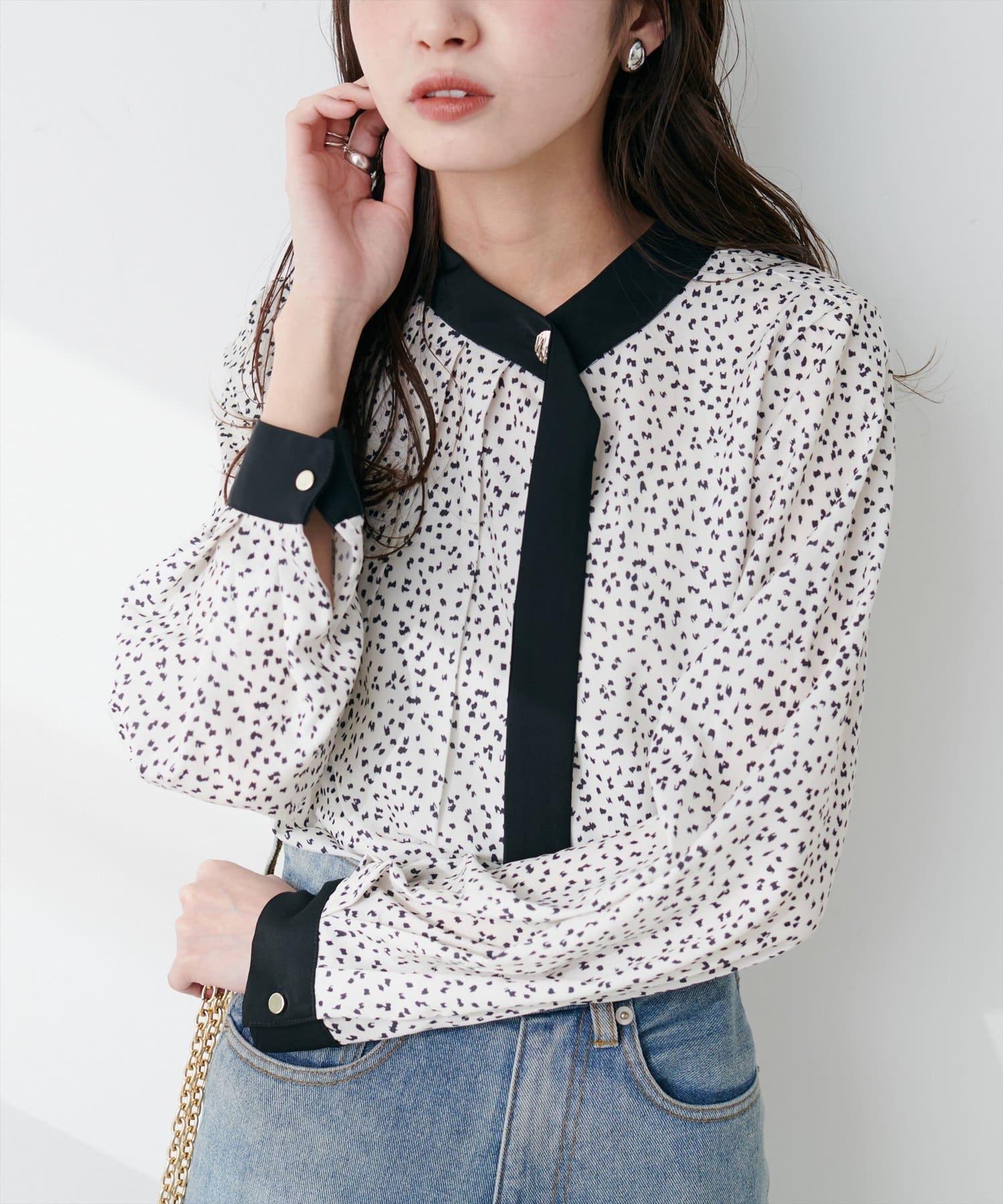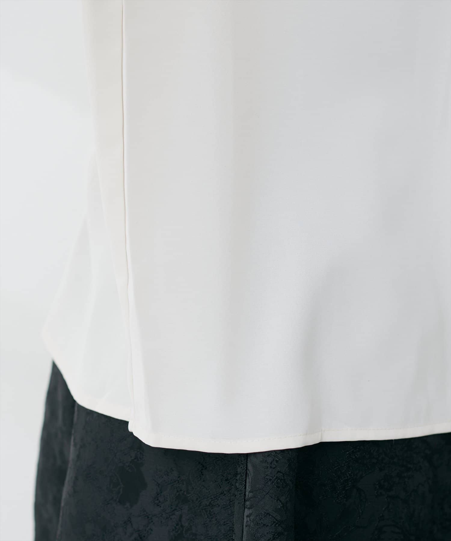 金釦とアシメネックボウタイがポイントの大人上品ブラウス。