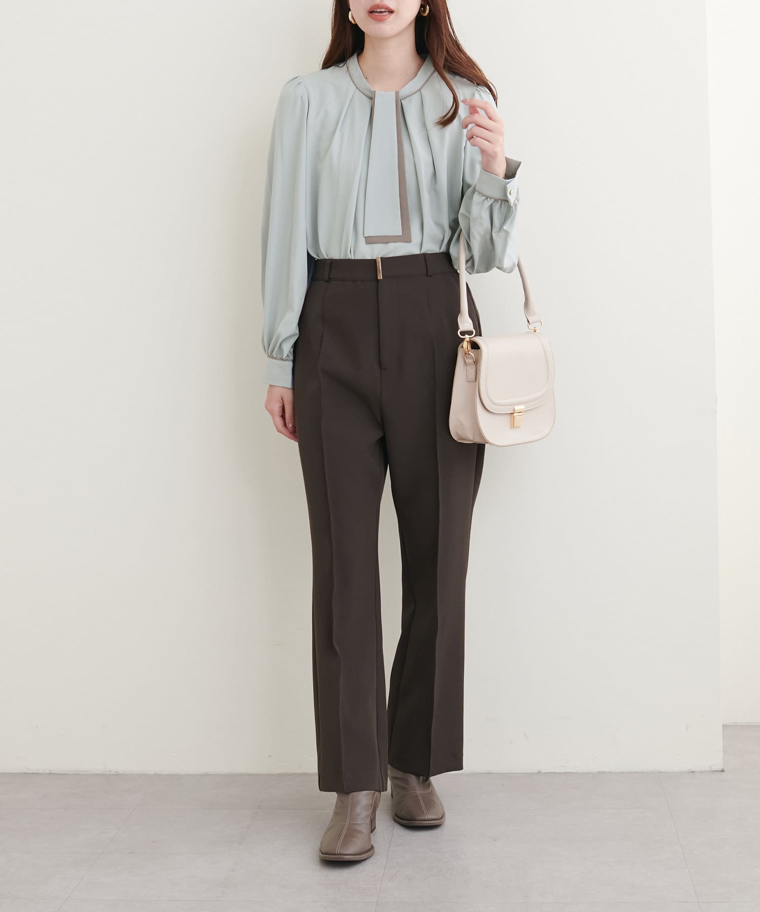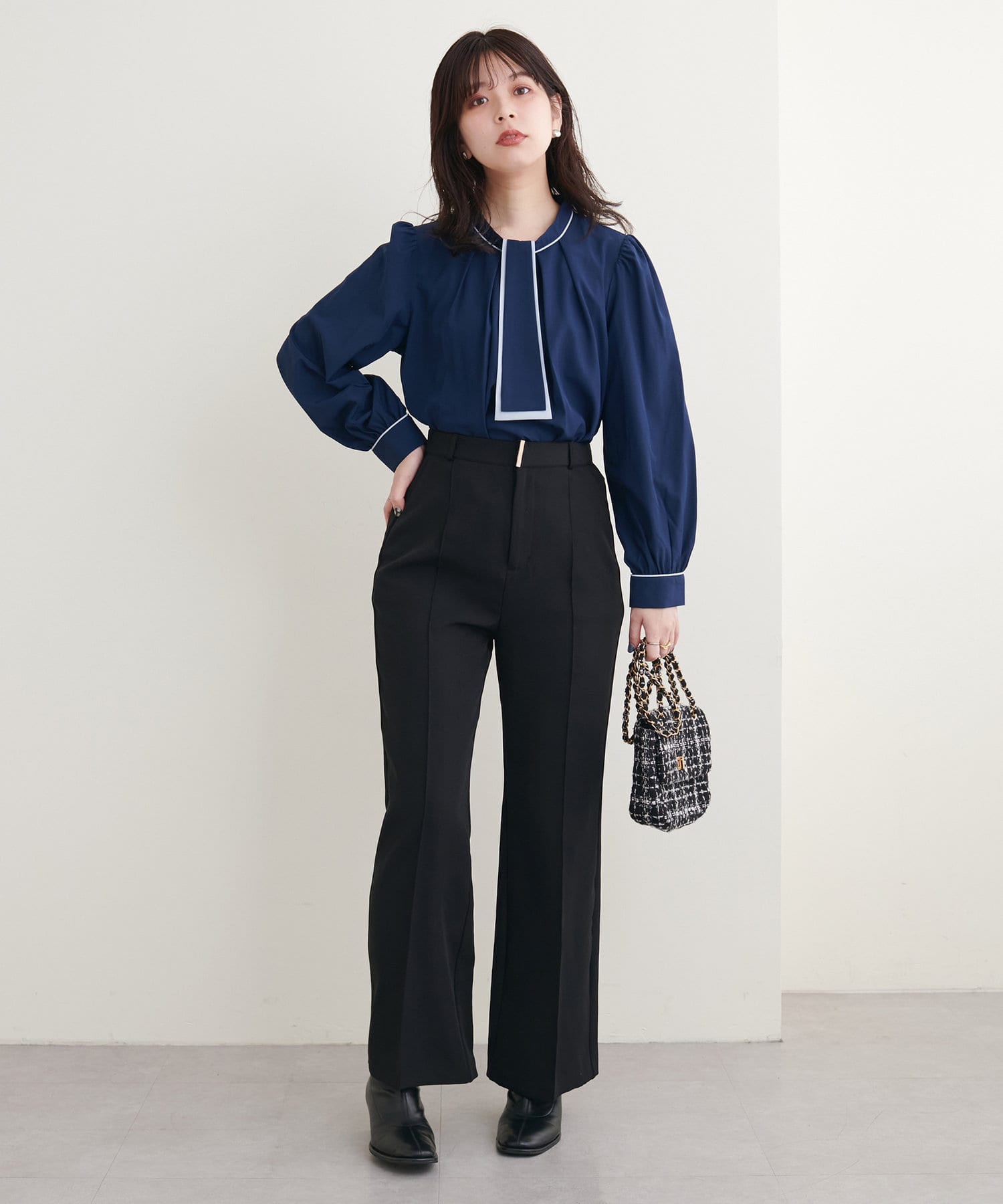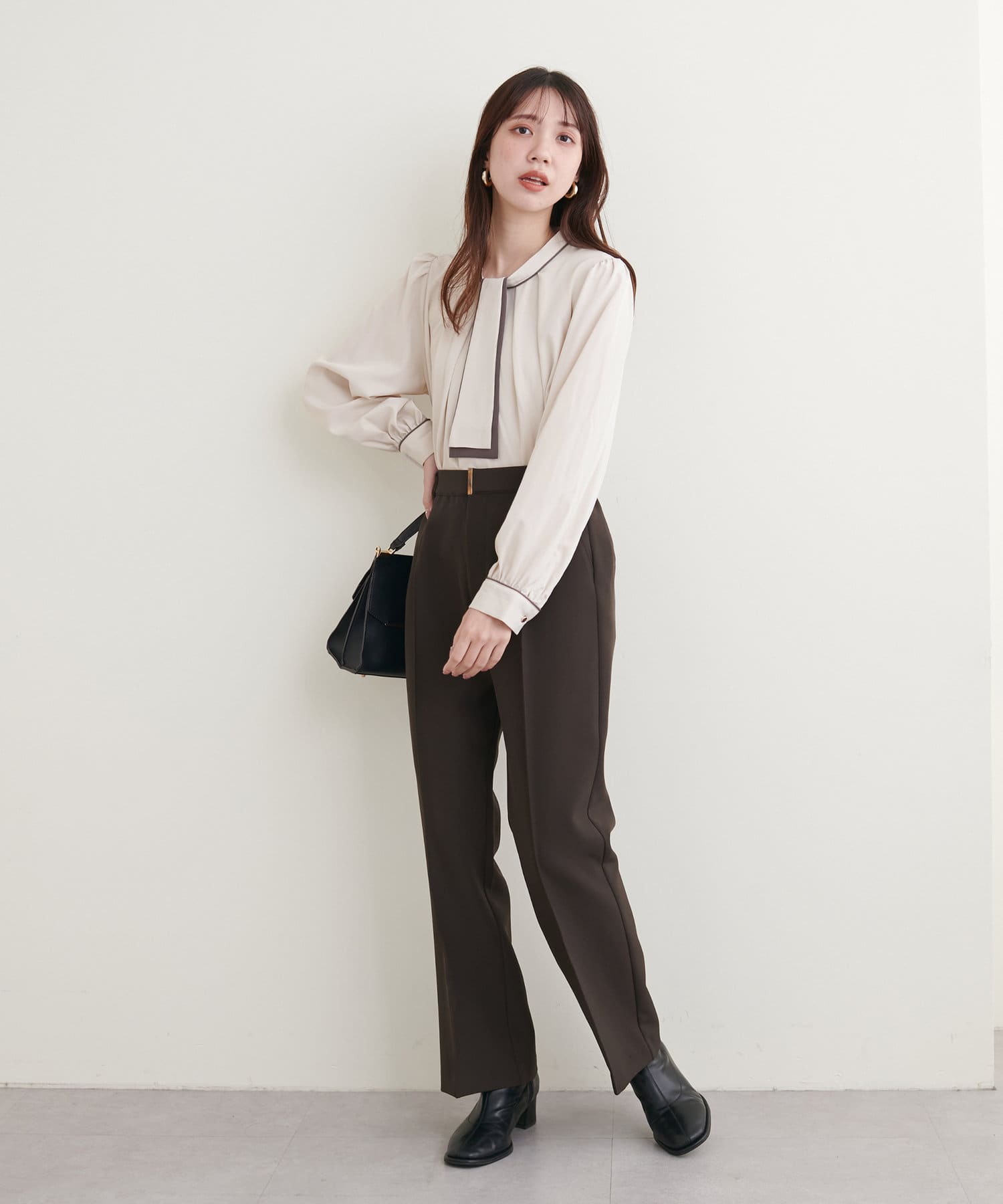ブラウスがさらりとしている分、ボトムは厚みのあるアイテムを合わせて素材感にメリハリを付けるのがおすすめです。