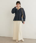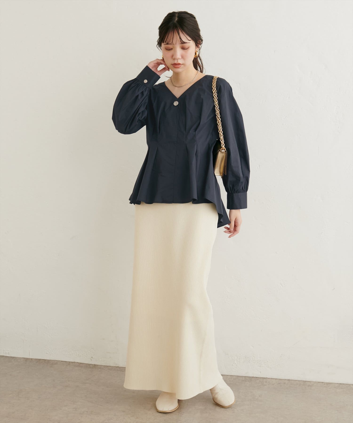 ボトムはナロースカートなど身体に優しく添う形がおすすめです。