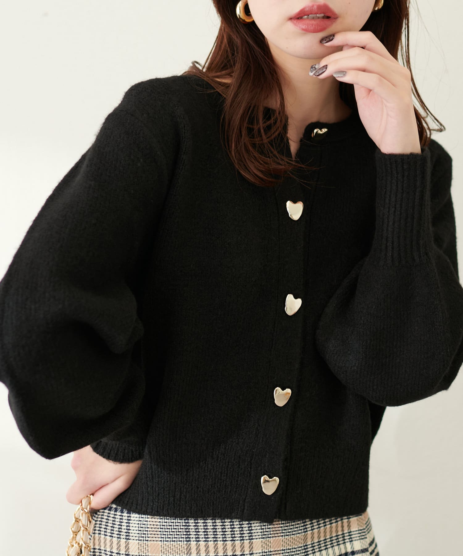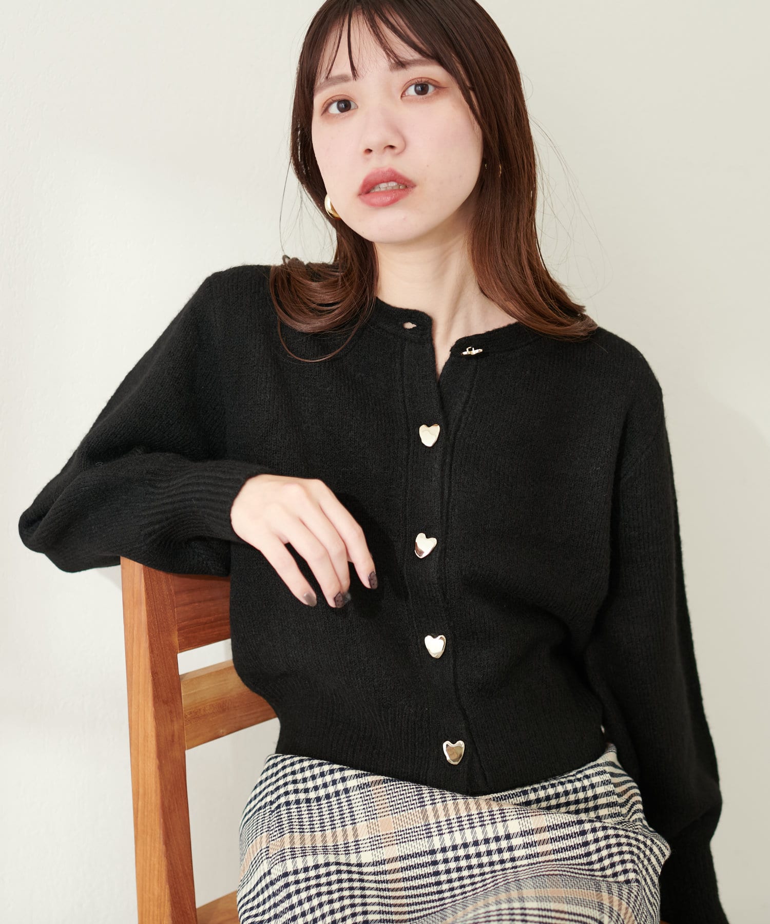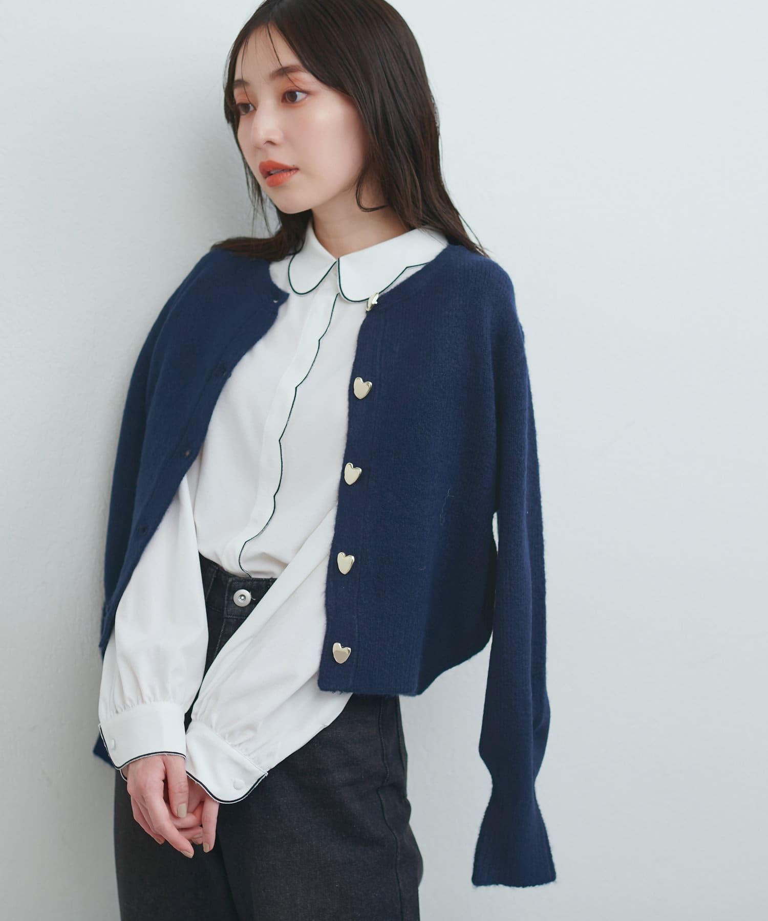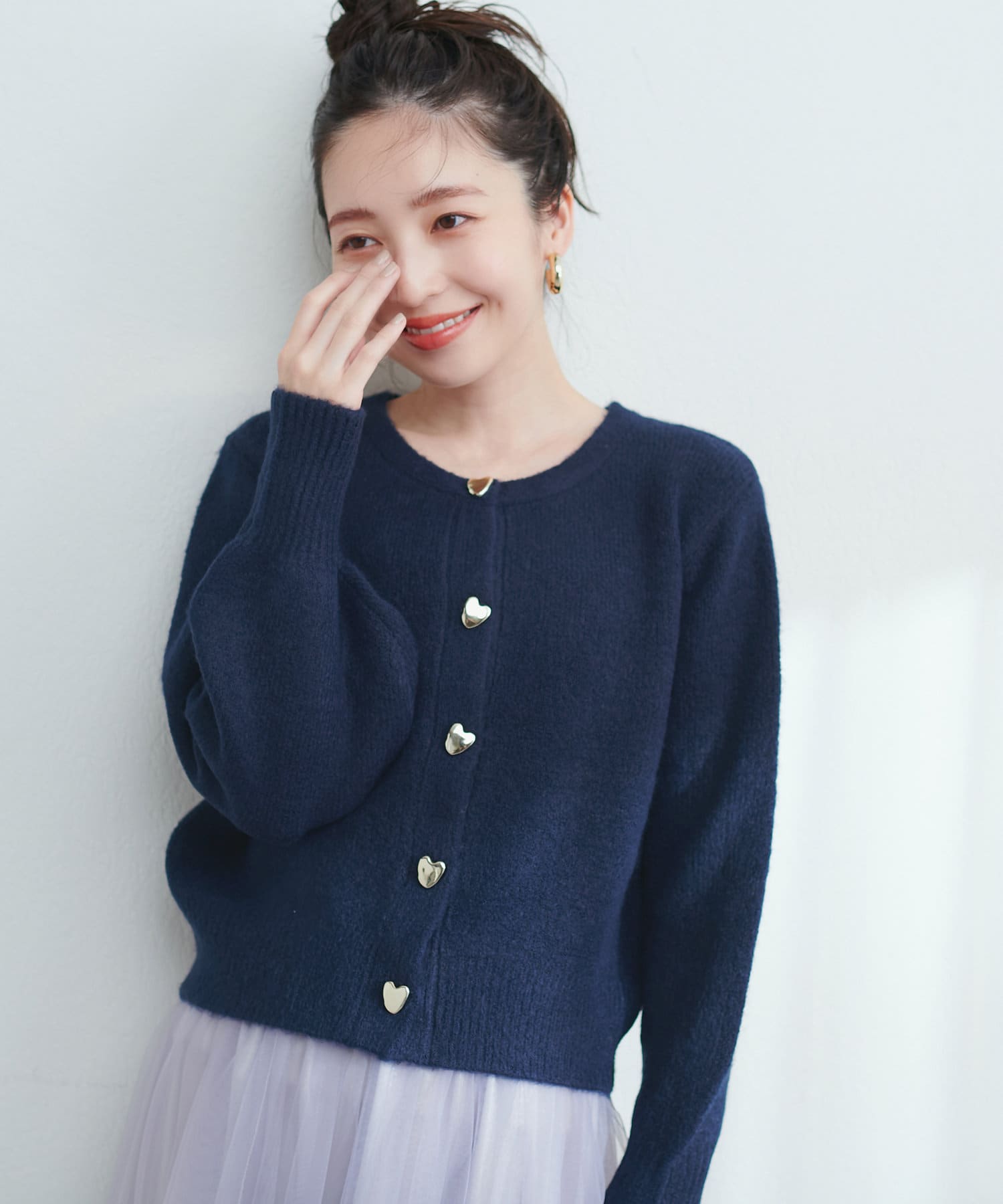コロンとした形が可愛いハート釦は、ニュアンス型にすることで甘さを抑え大人フェミニンな印象に。