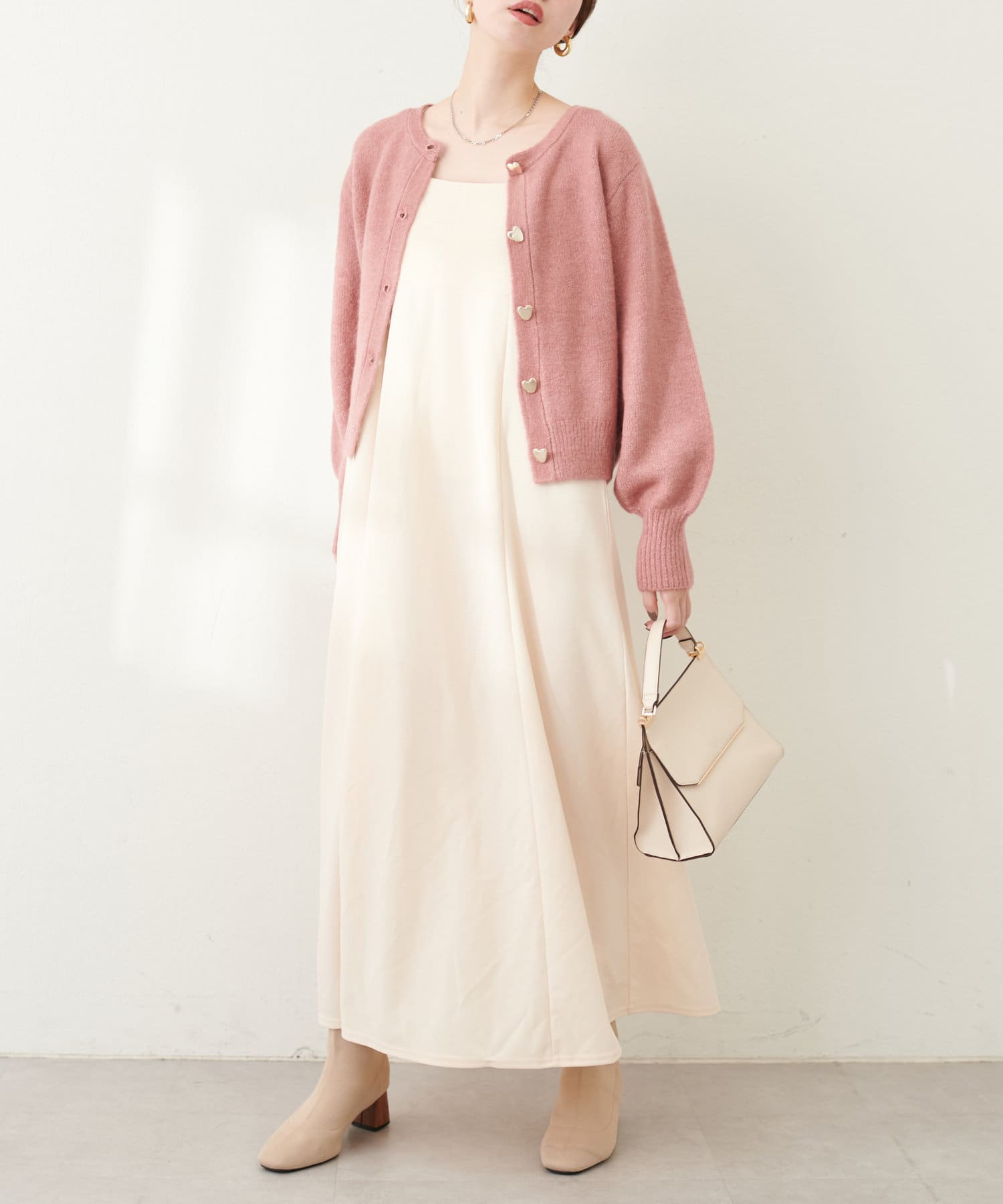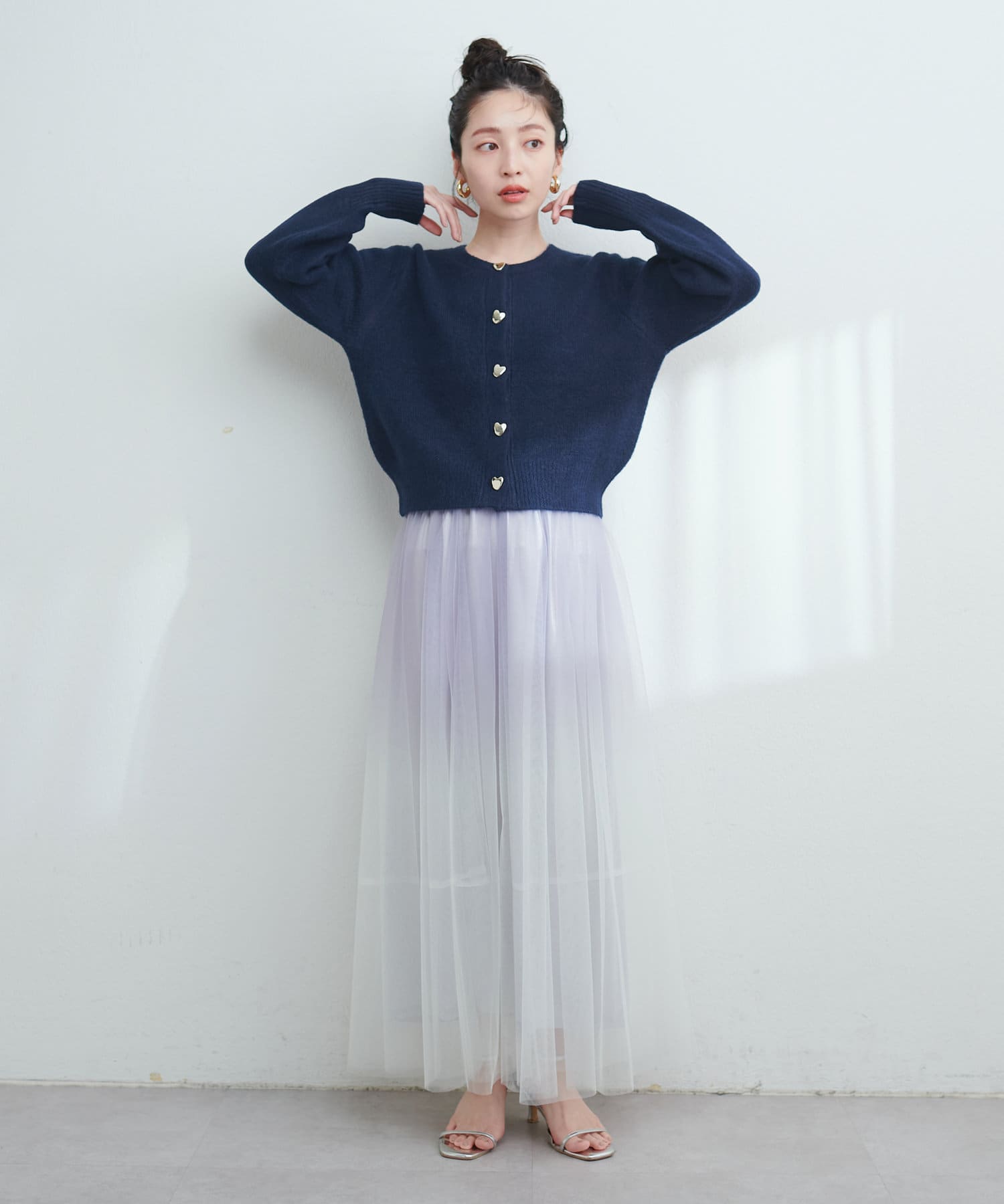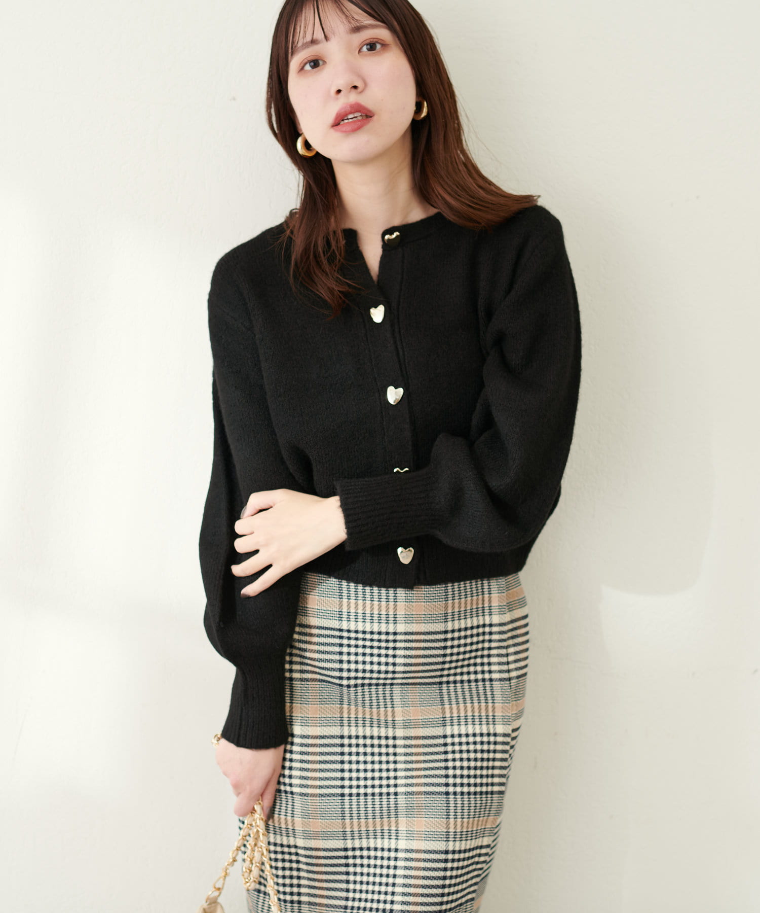 コロンとした形が可愛いハート釦は、ニュアンス型にすることで甘さを抑え大人フェミニンな印象に。