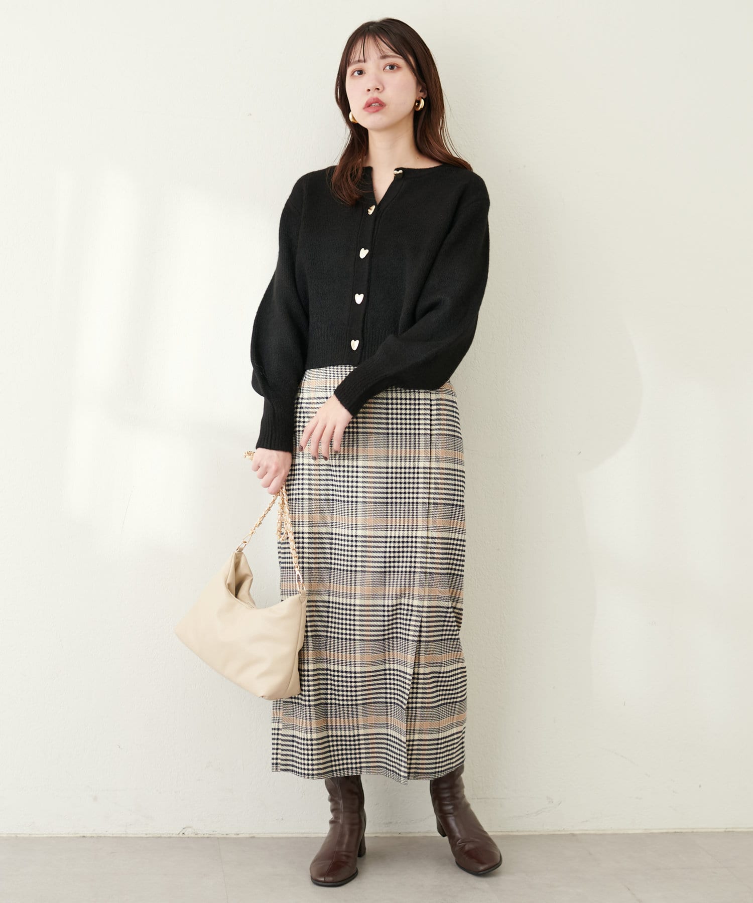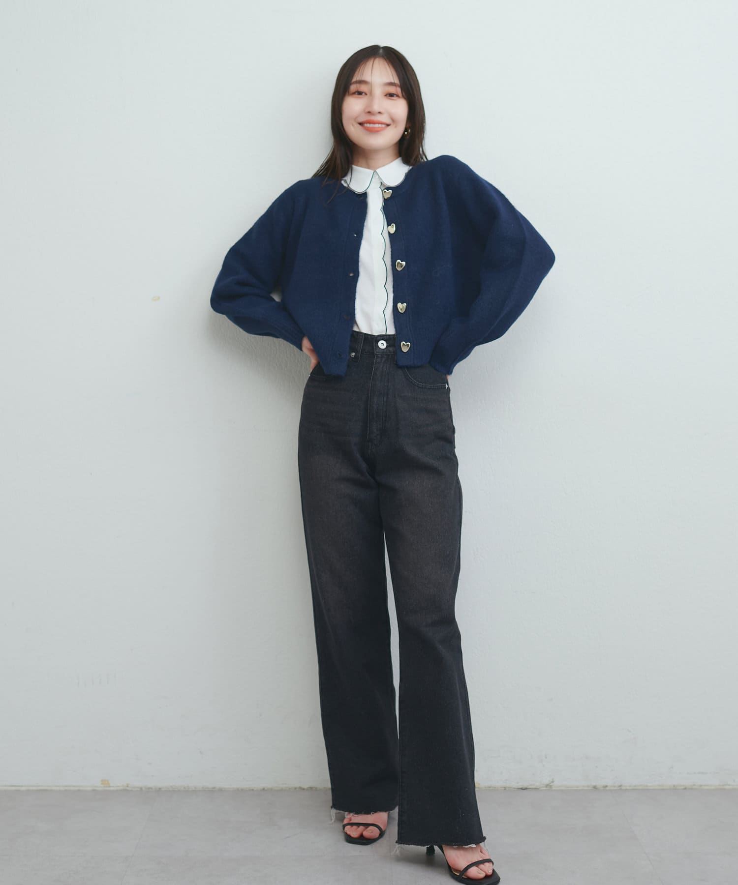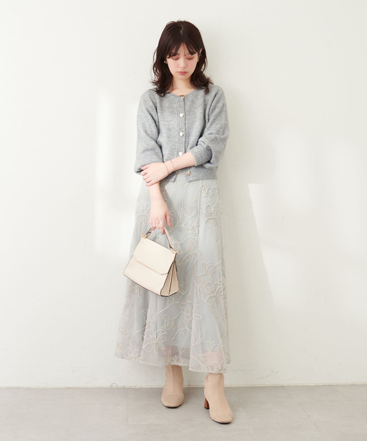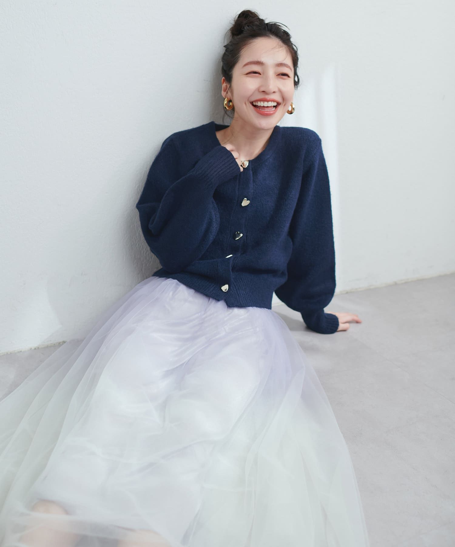 コロンとした形が可愛いハート釦は、ニュアンス型にすることで甘さを抑え大人フェミニンな印象に。