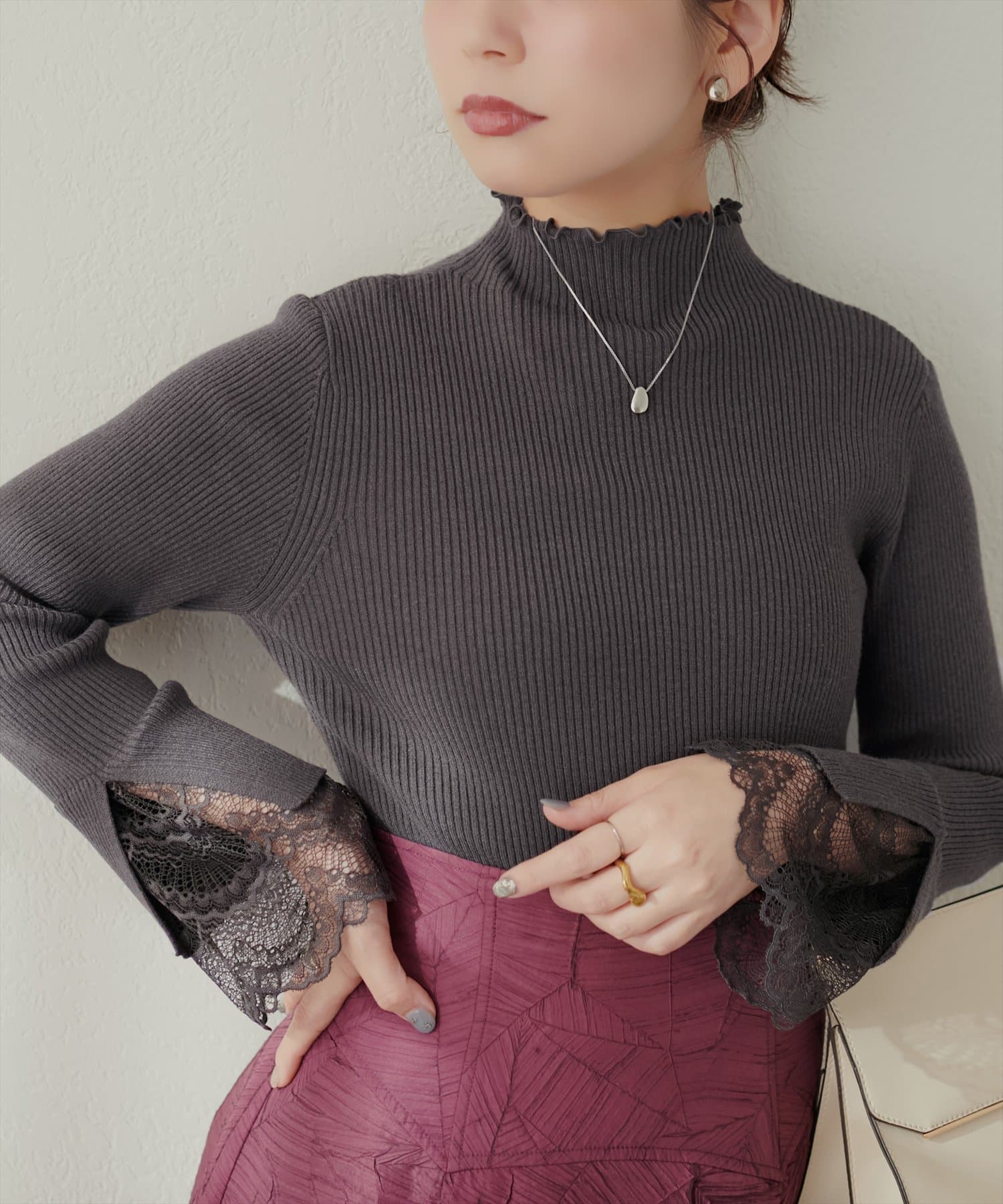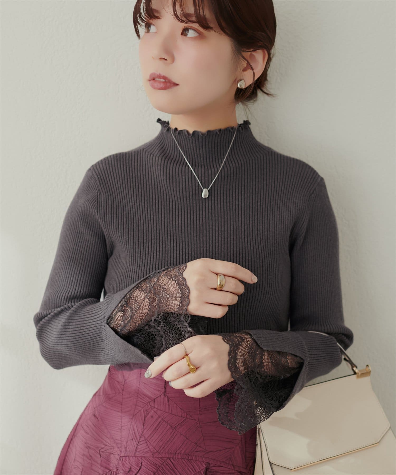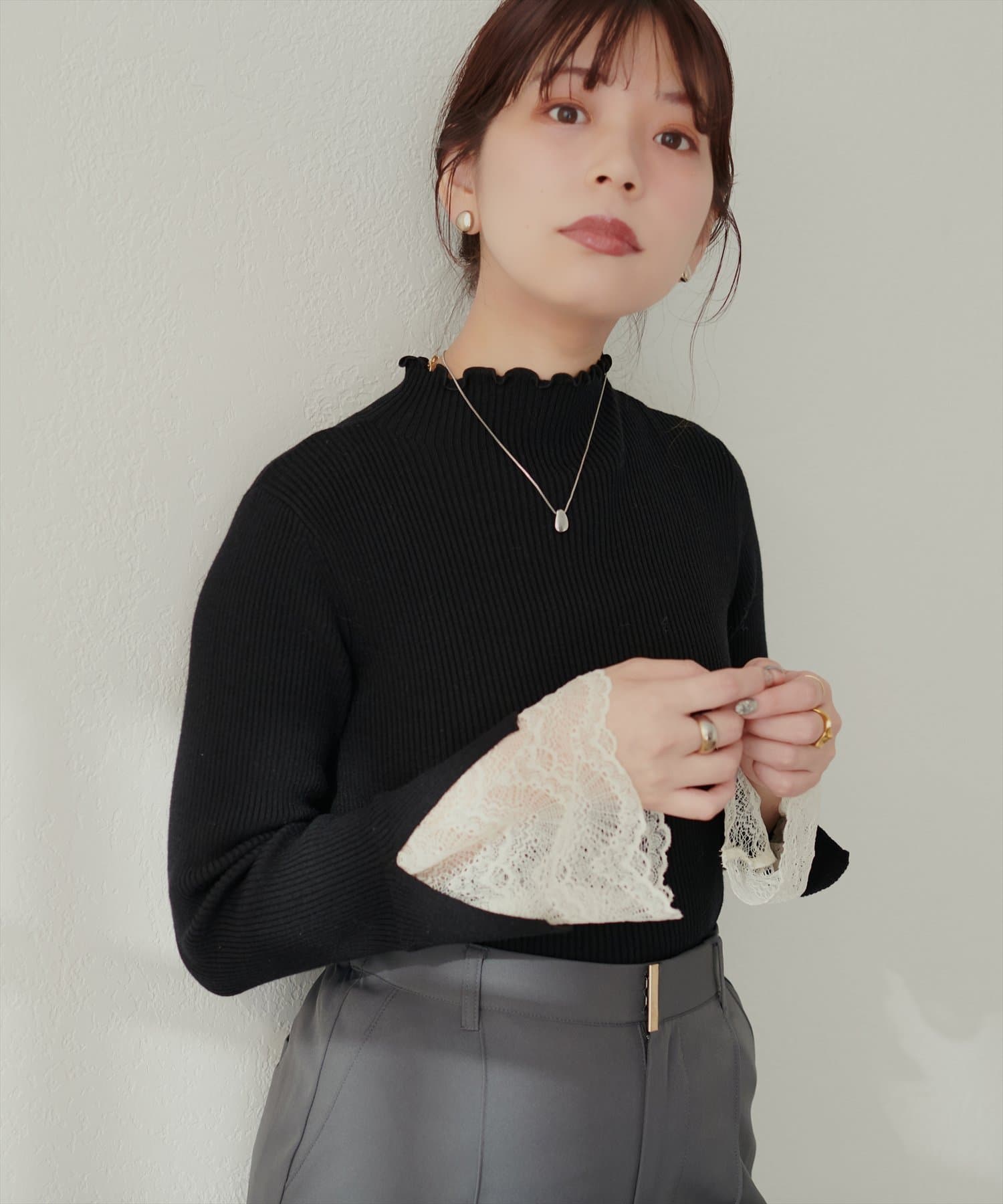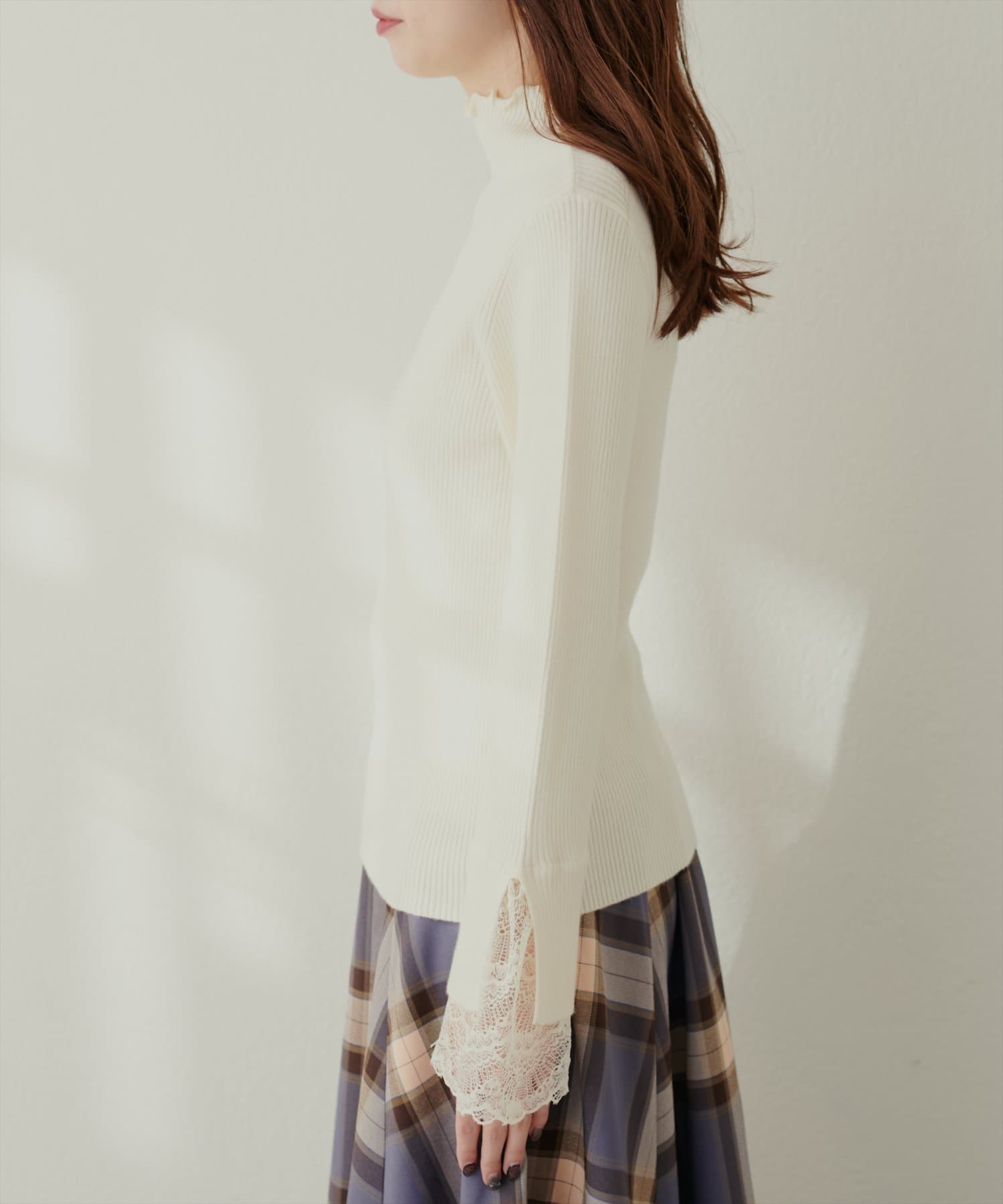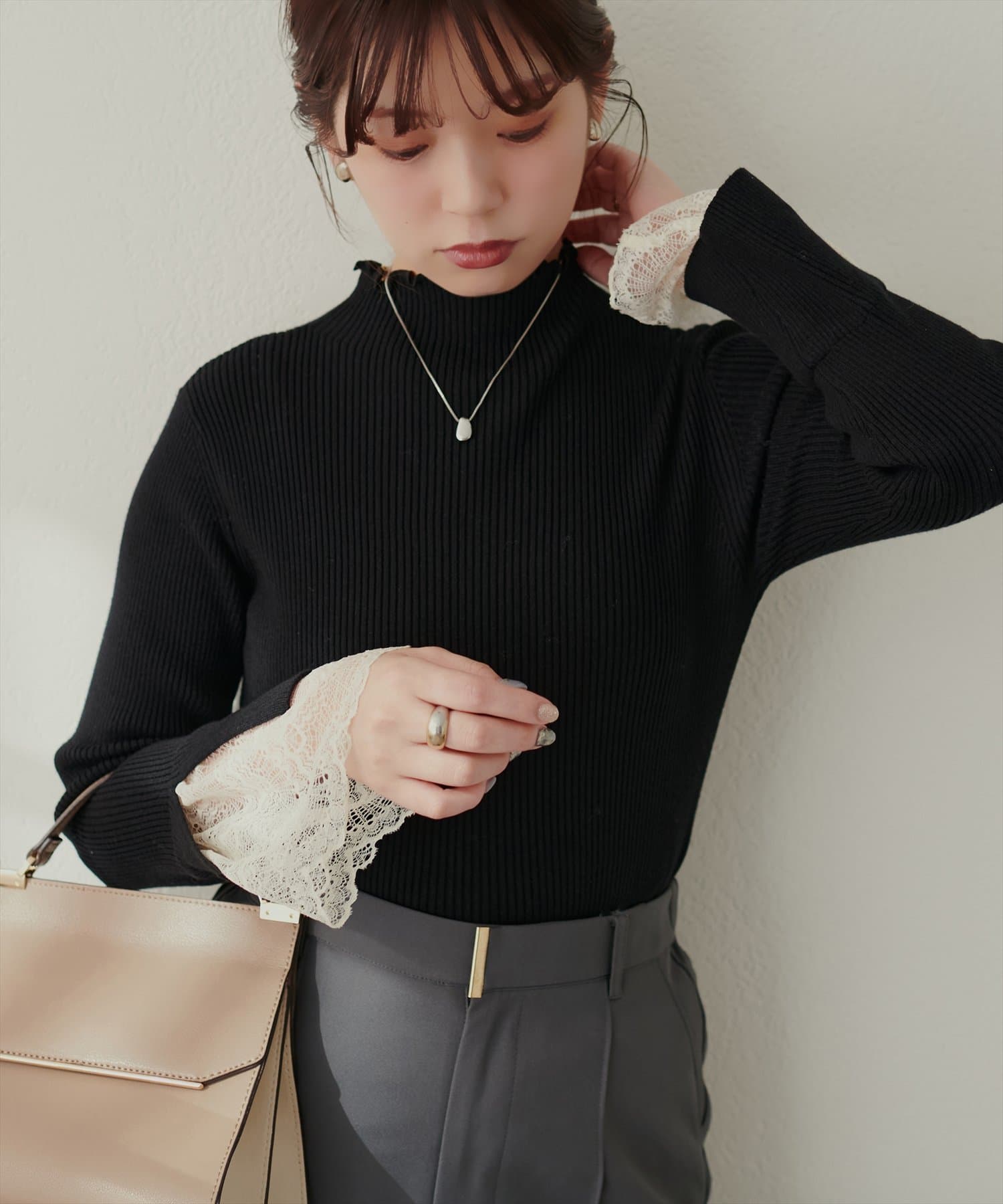 コーディネートを選ばないシンプルなリブニットに袖口のレース切替がフェミニンなハイネックニット。