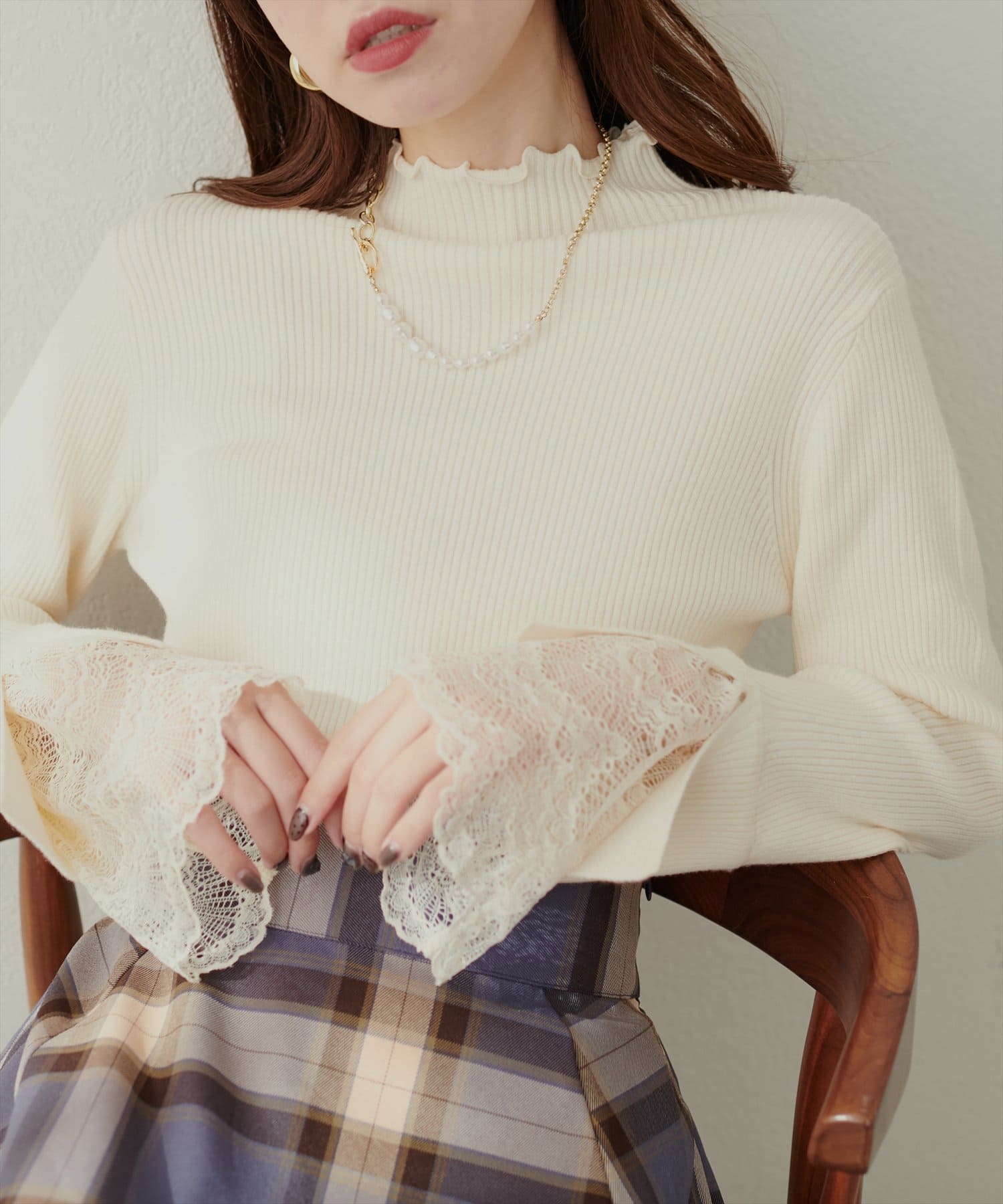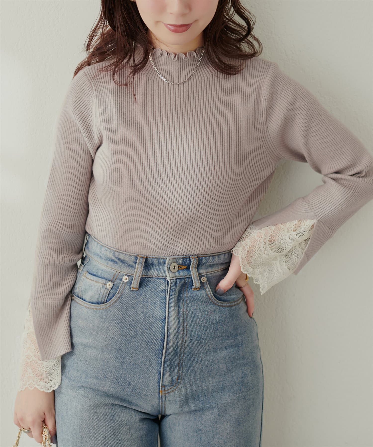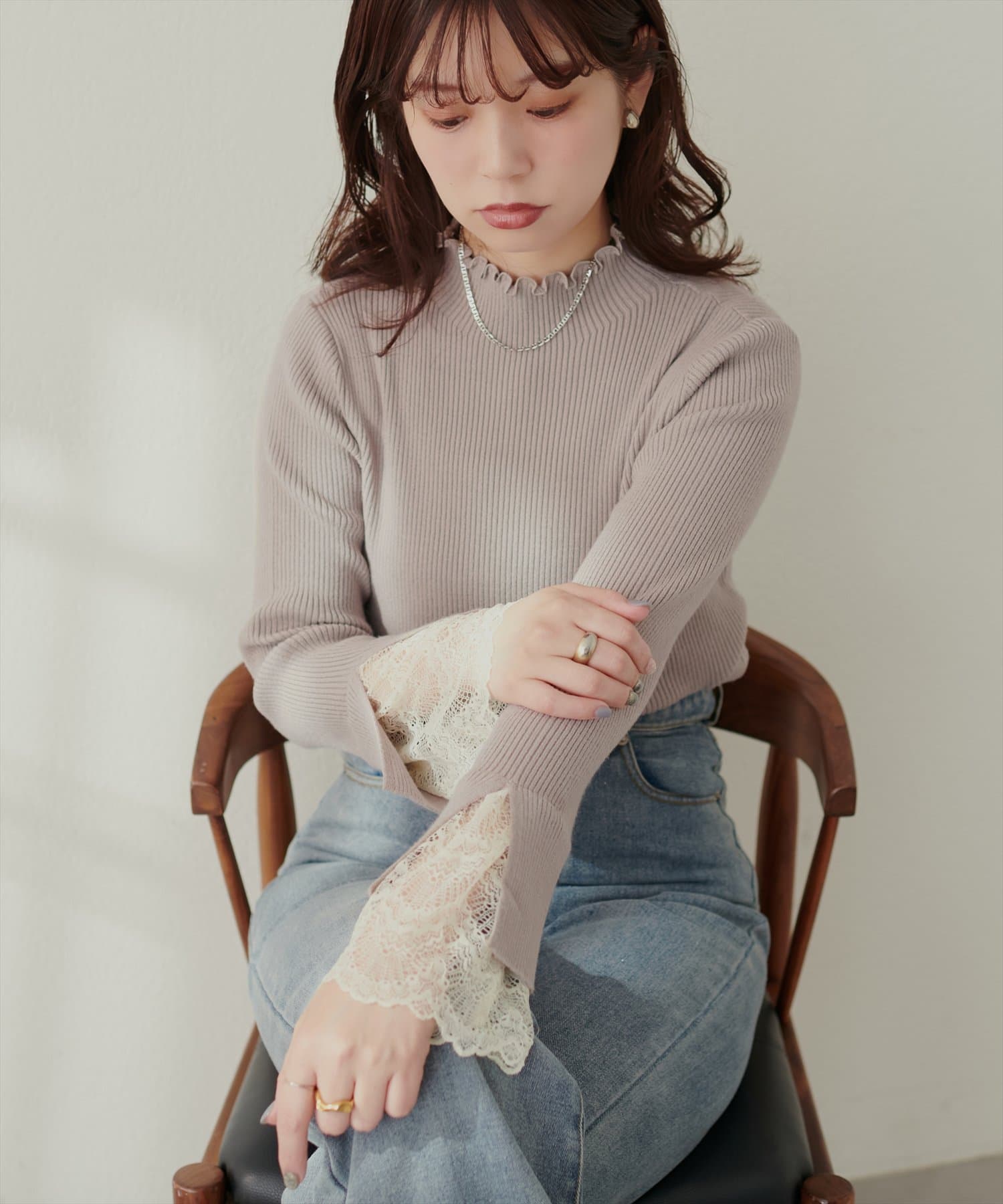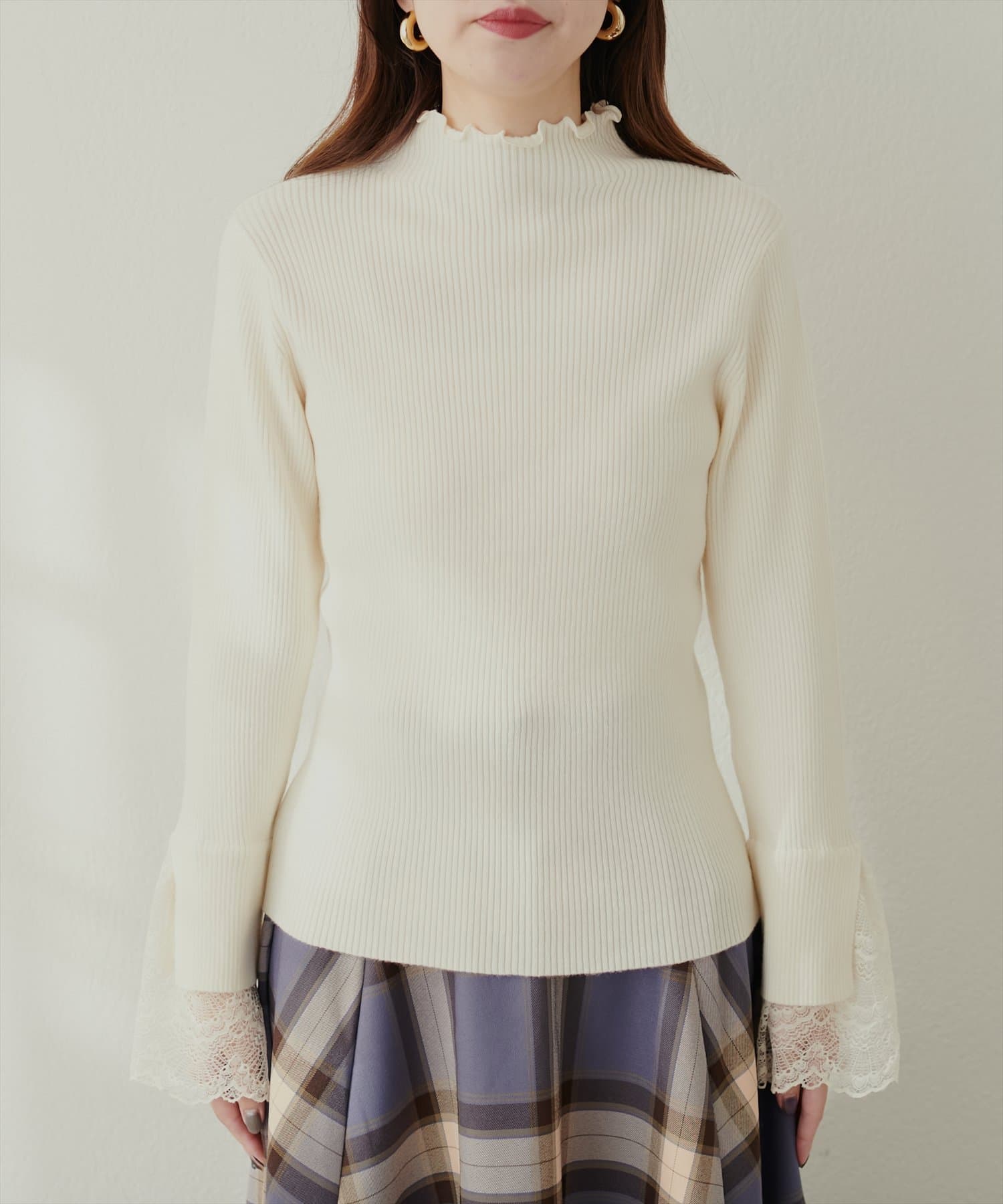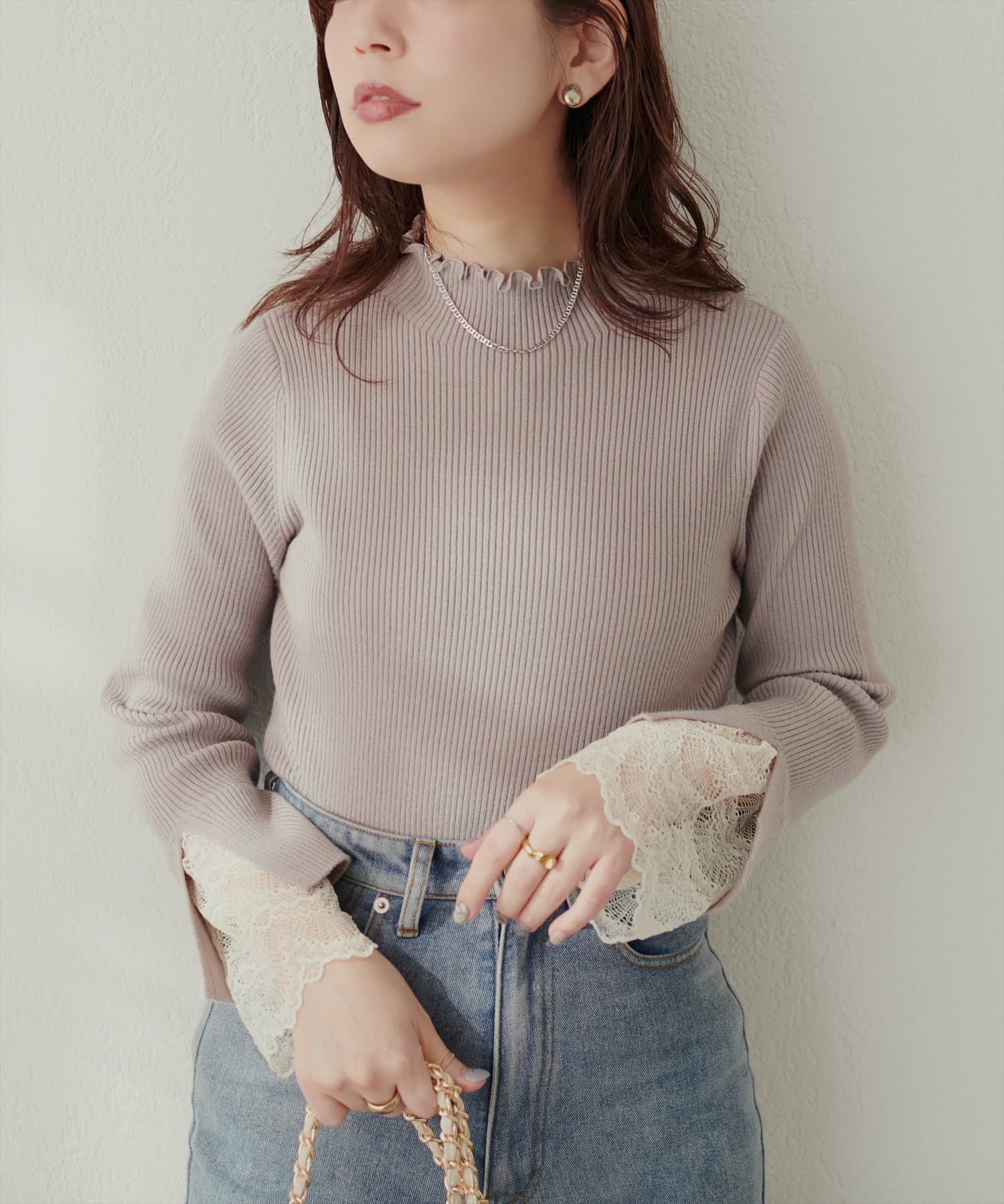 コーディネートを選ばないシンプルなリブニットに袖口のレース切替がフェミニンなハイネックニット。