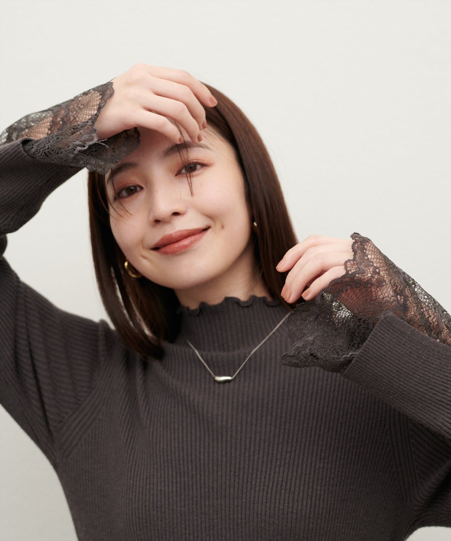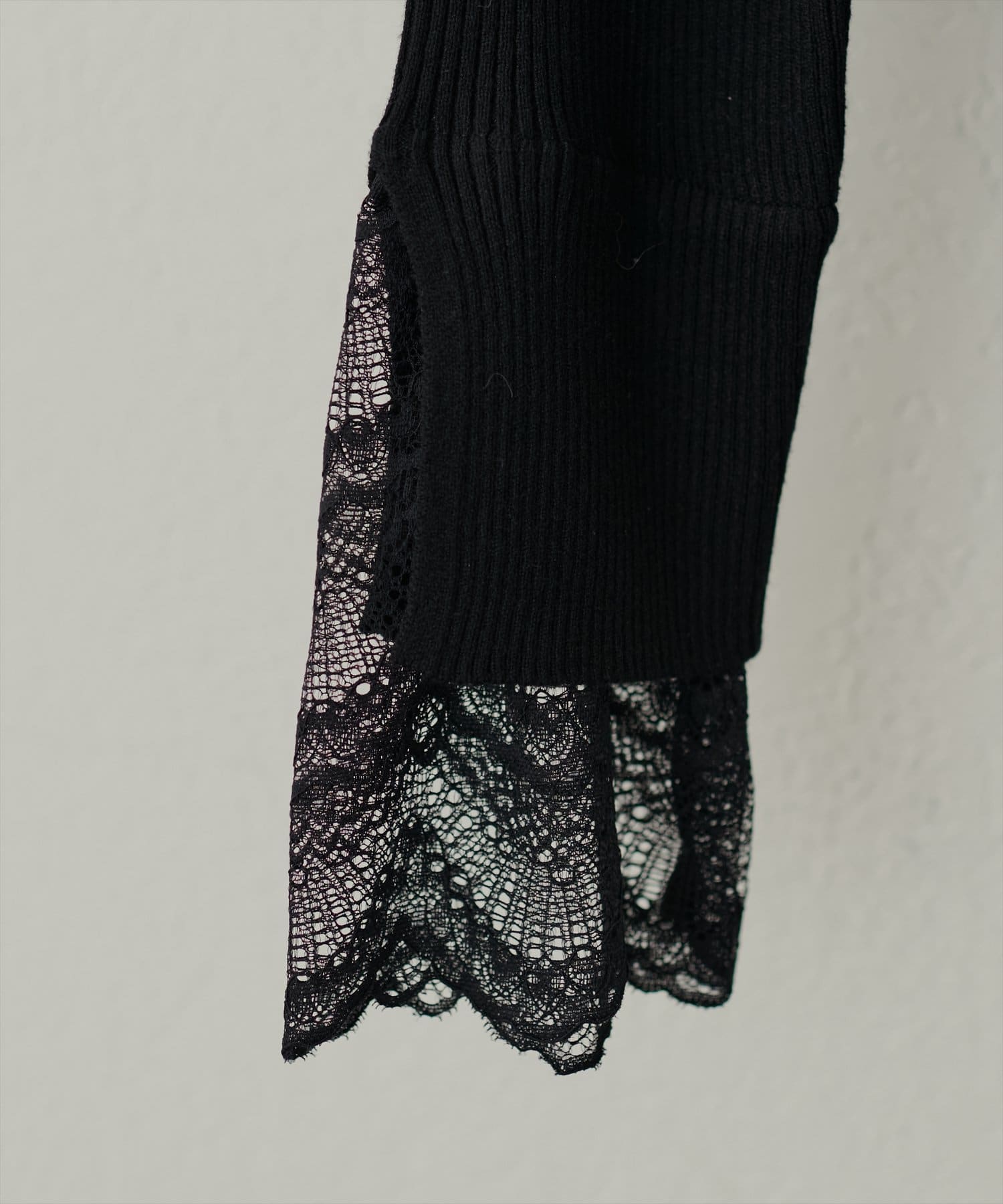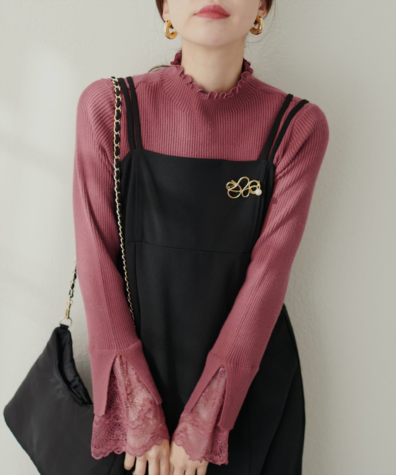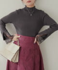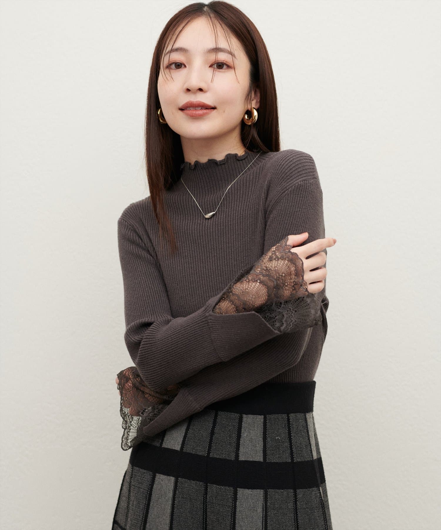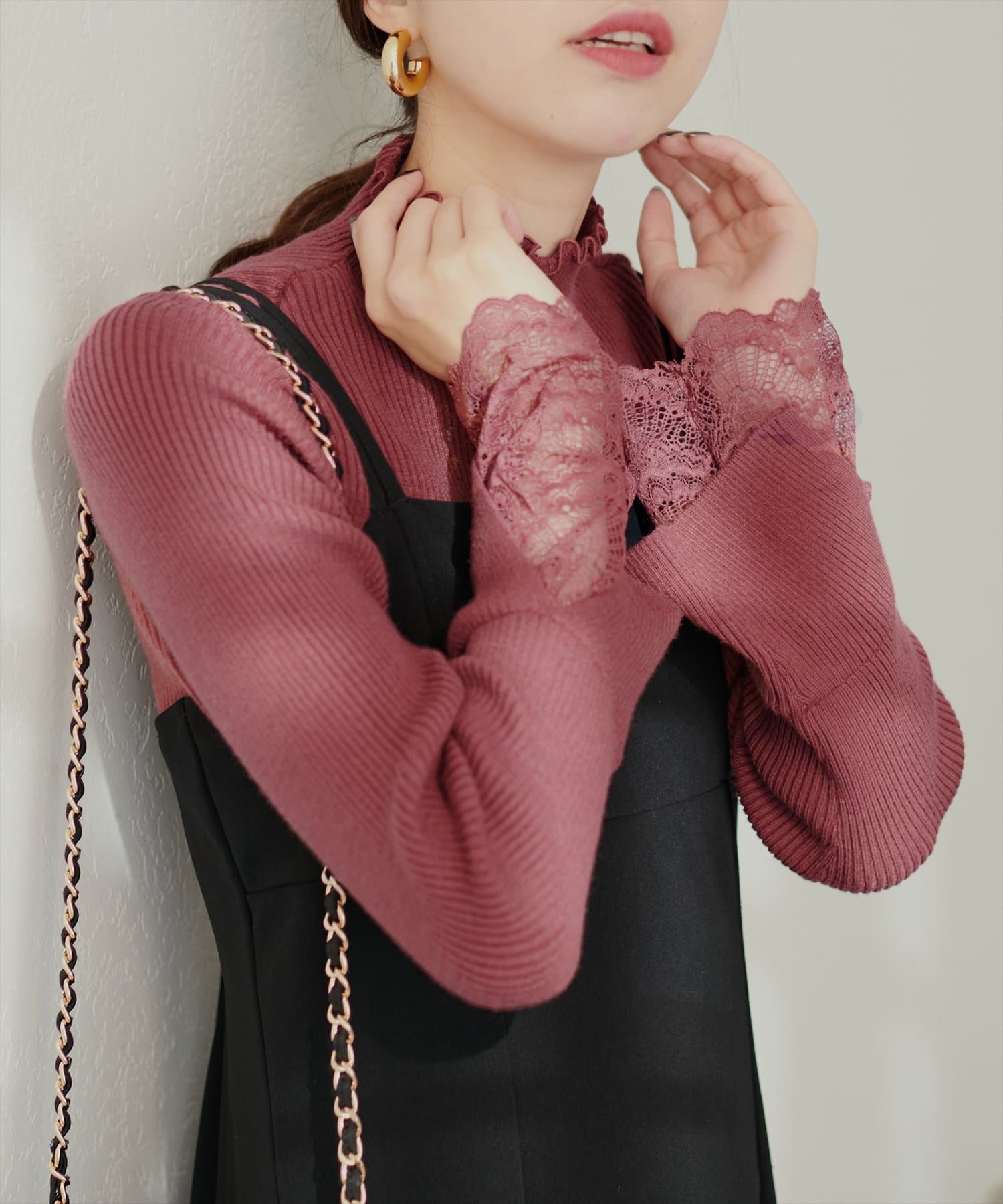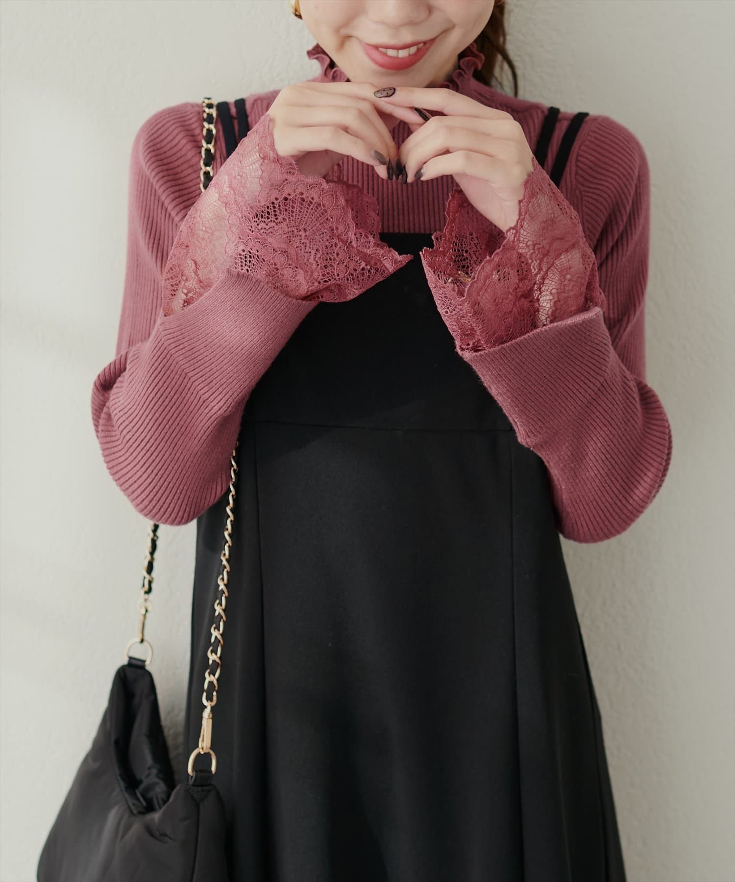 コーディネートを選ばないシンプルなリブニットに袖口のレース切替がフェミニンなハイネックニット。