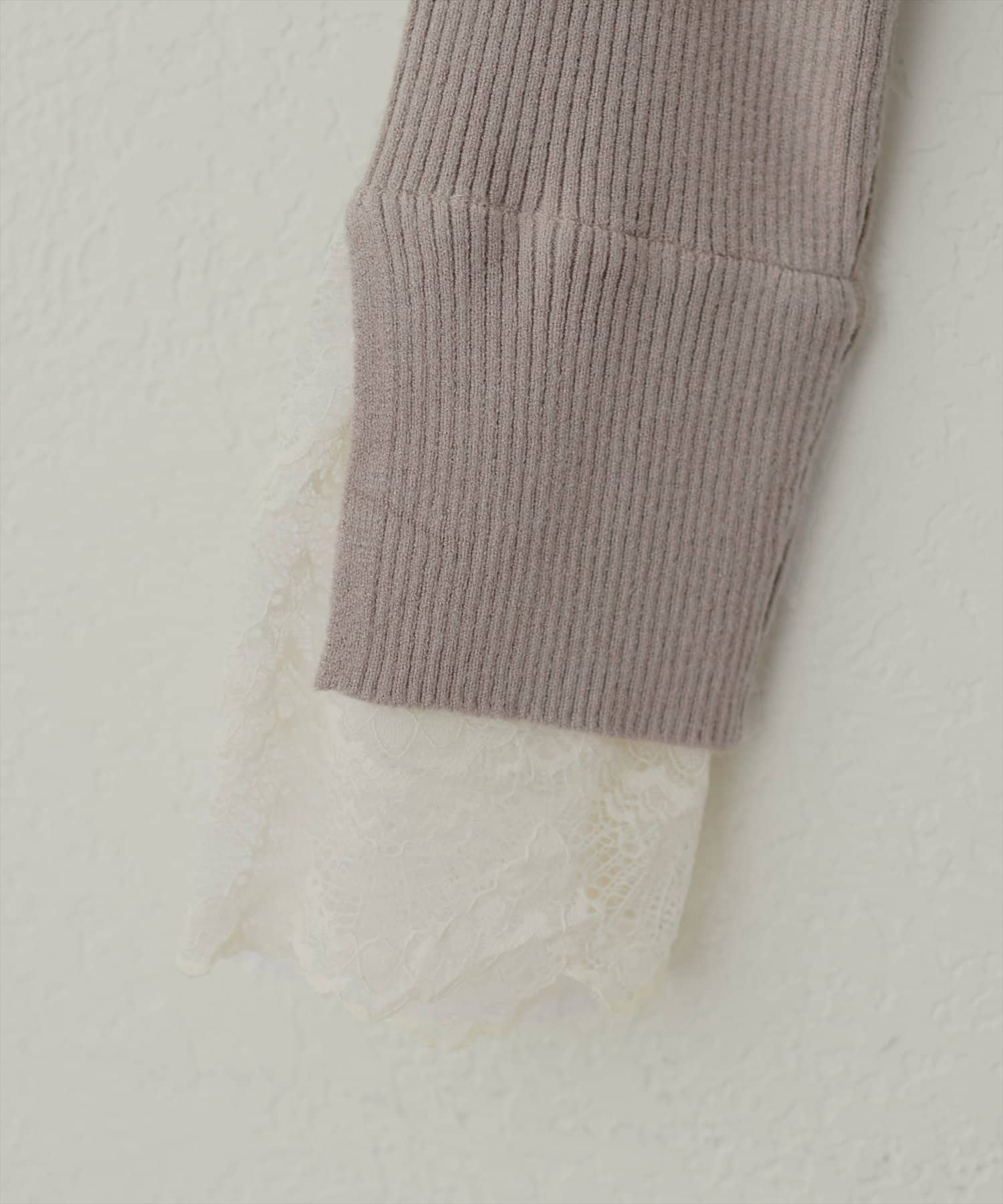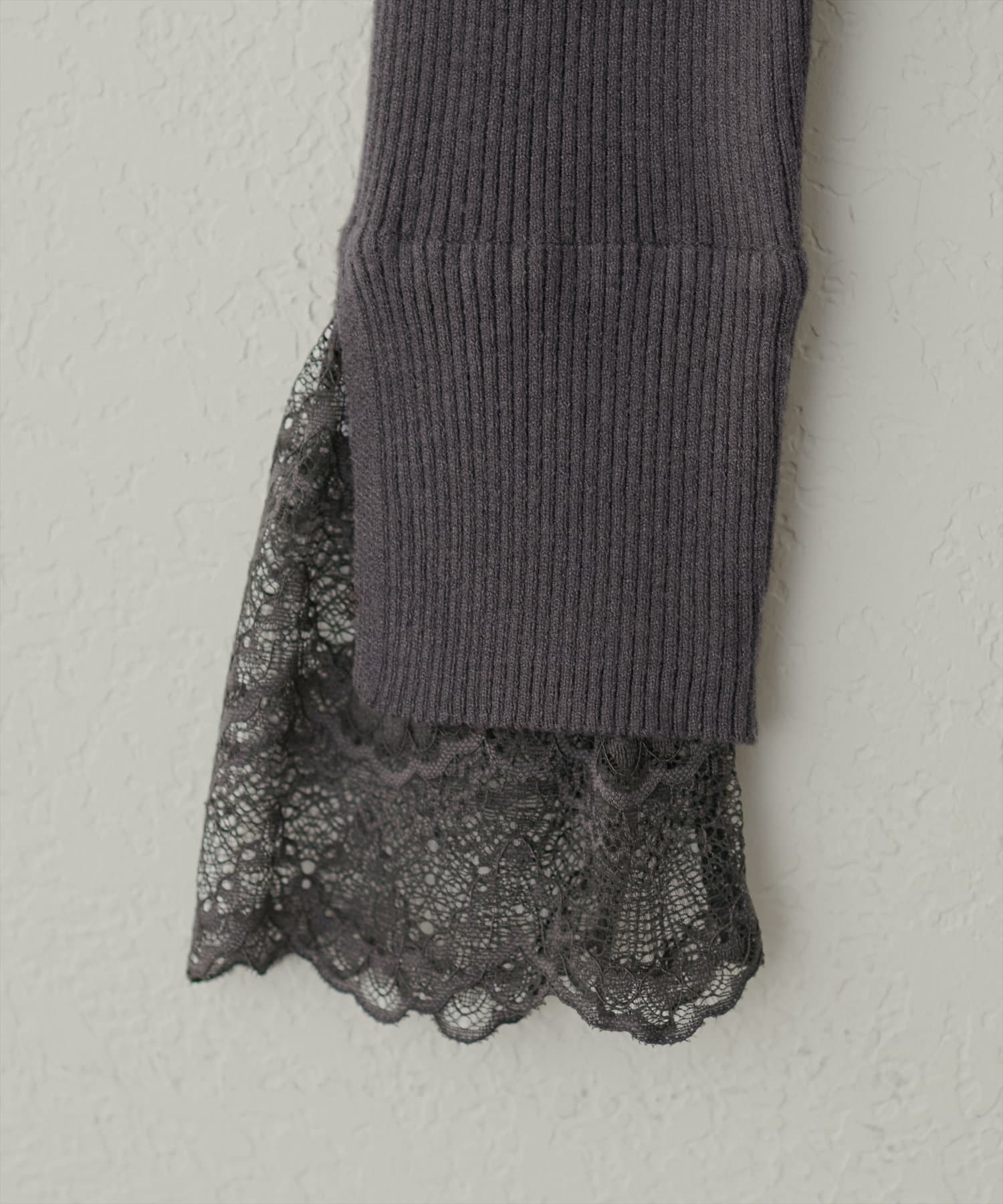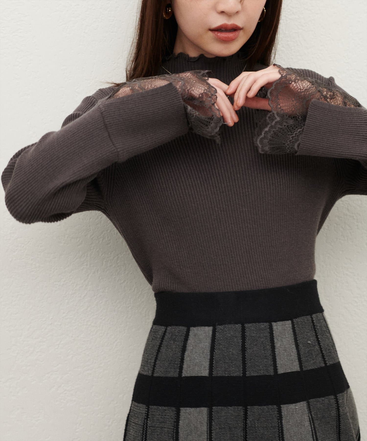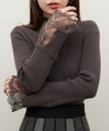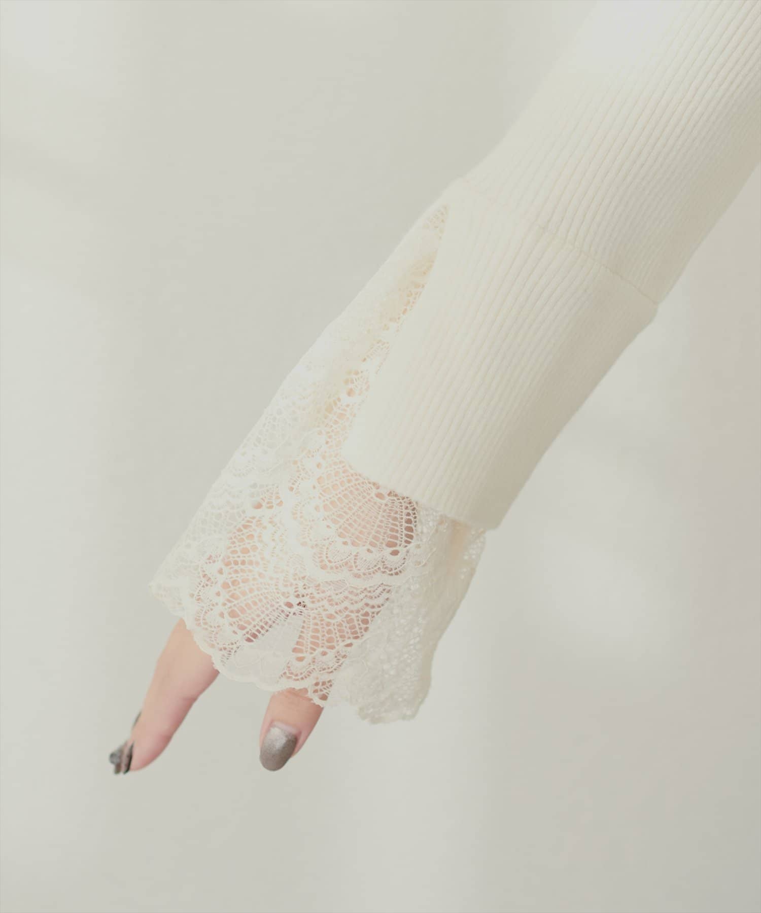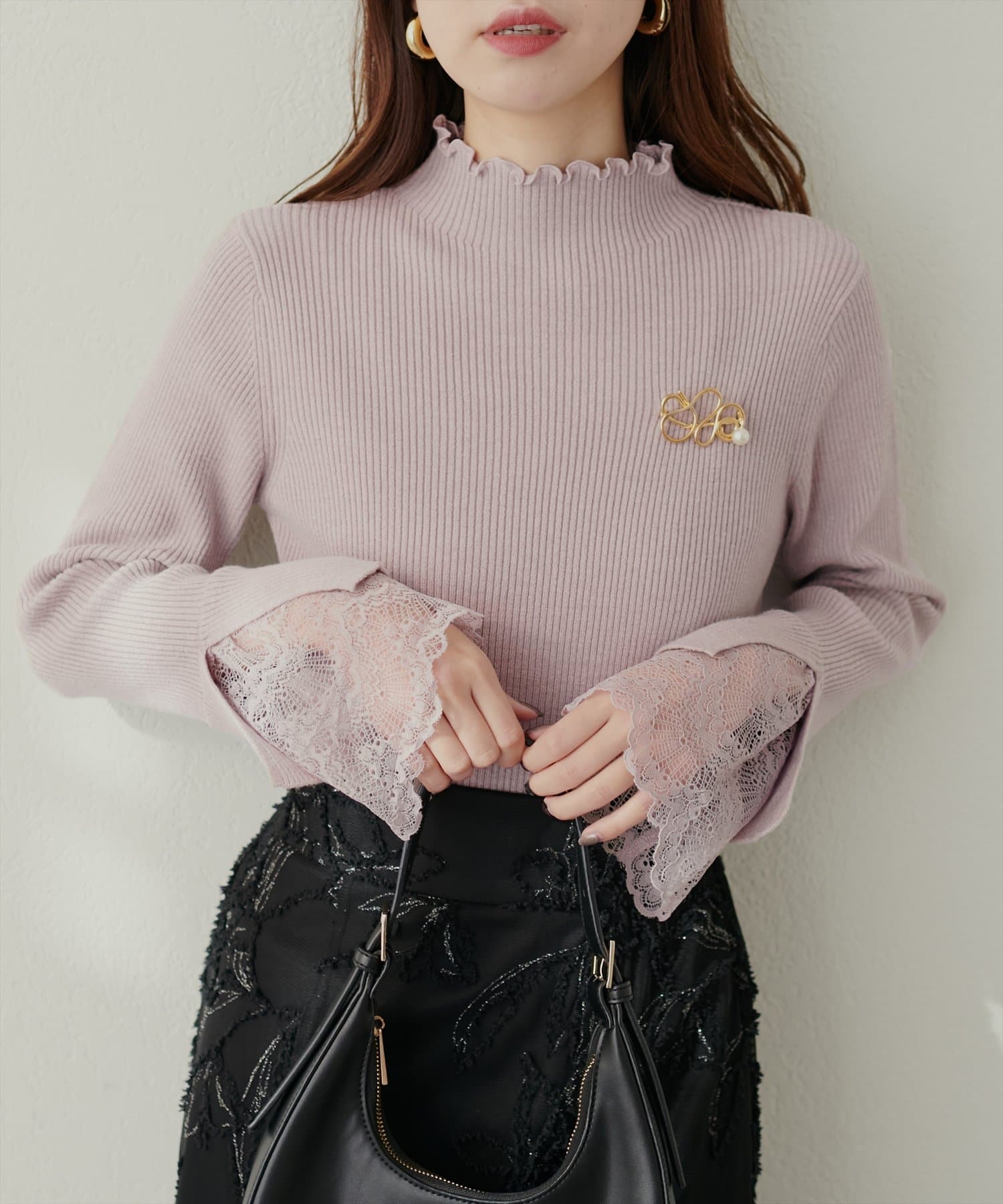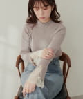 コーディネートを選ばないシンプルなリブニットに袖口のレース切替がフェミニンなハイネックニット。