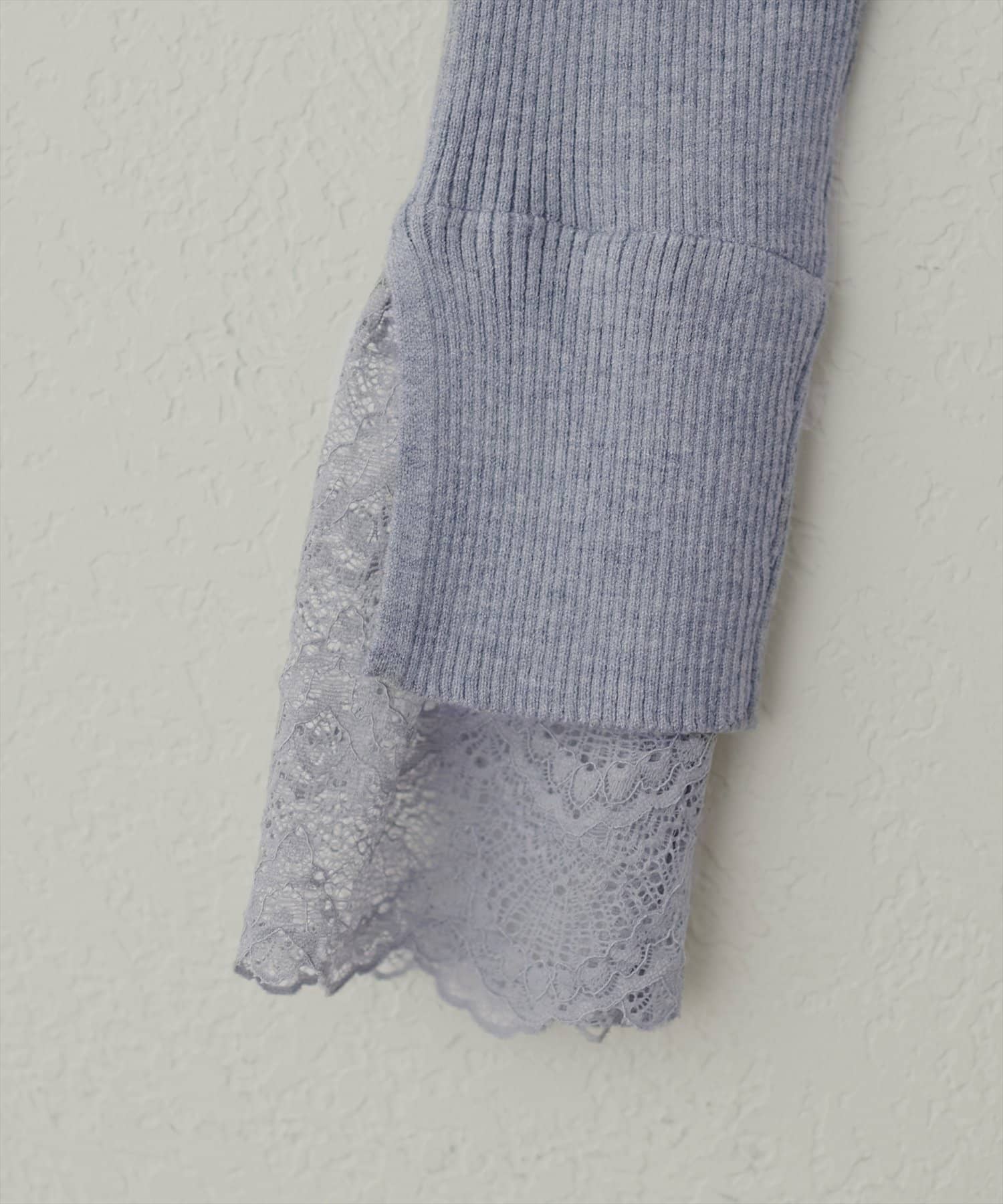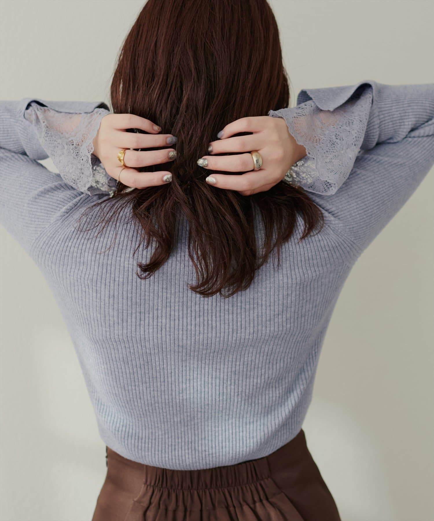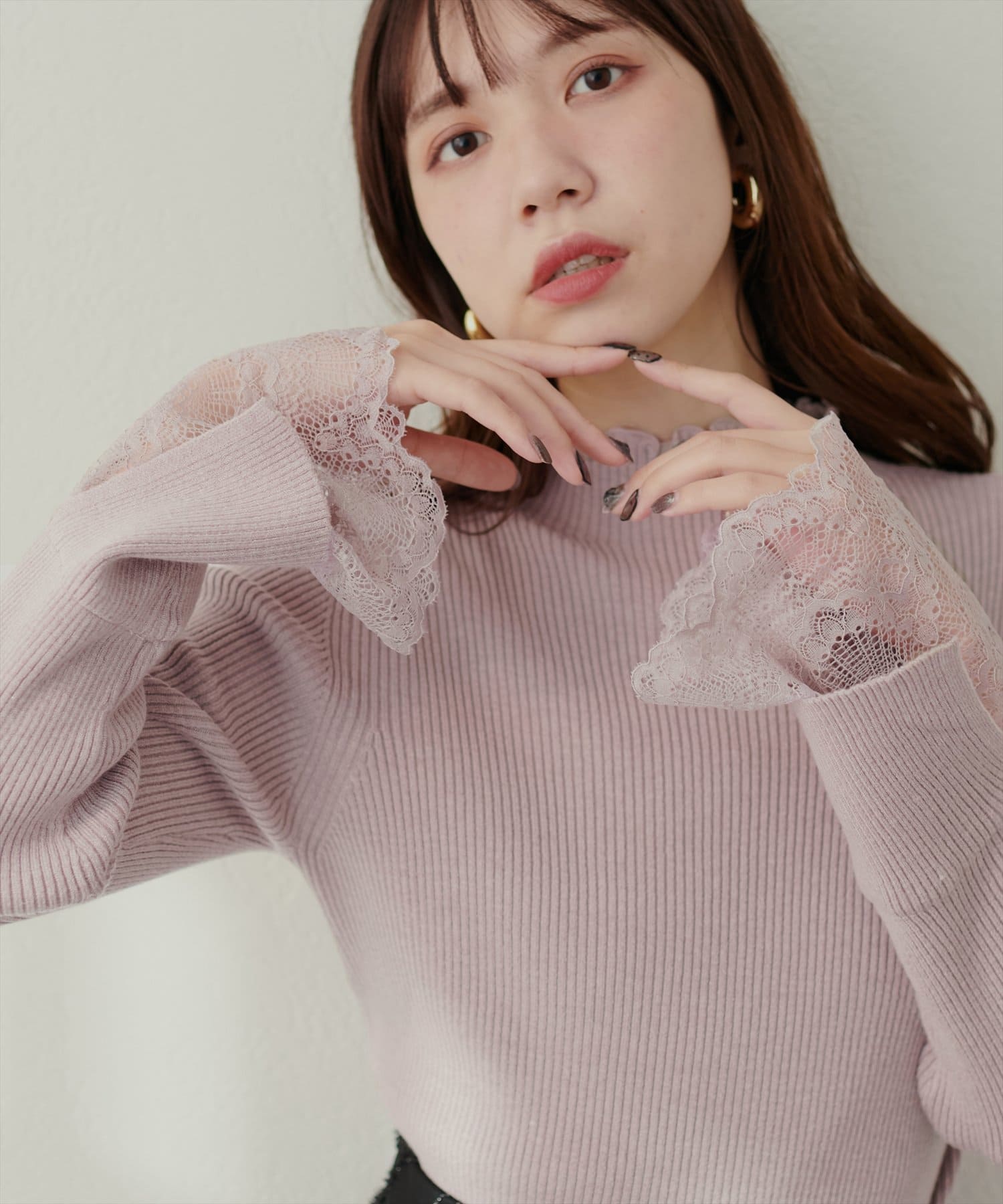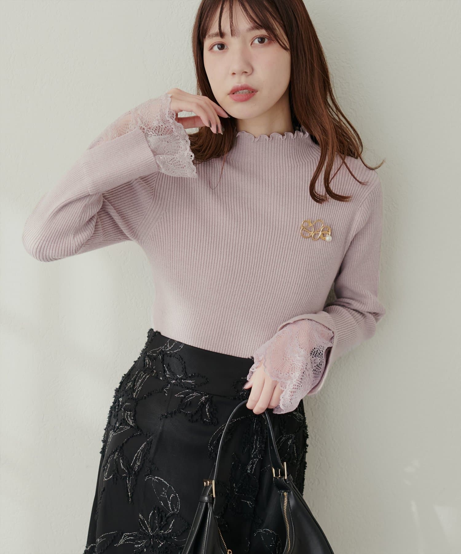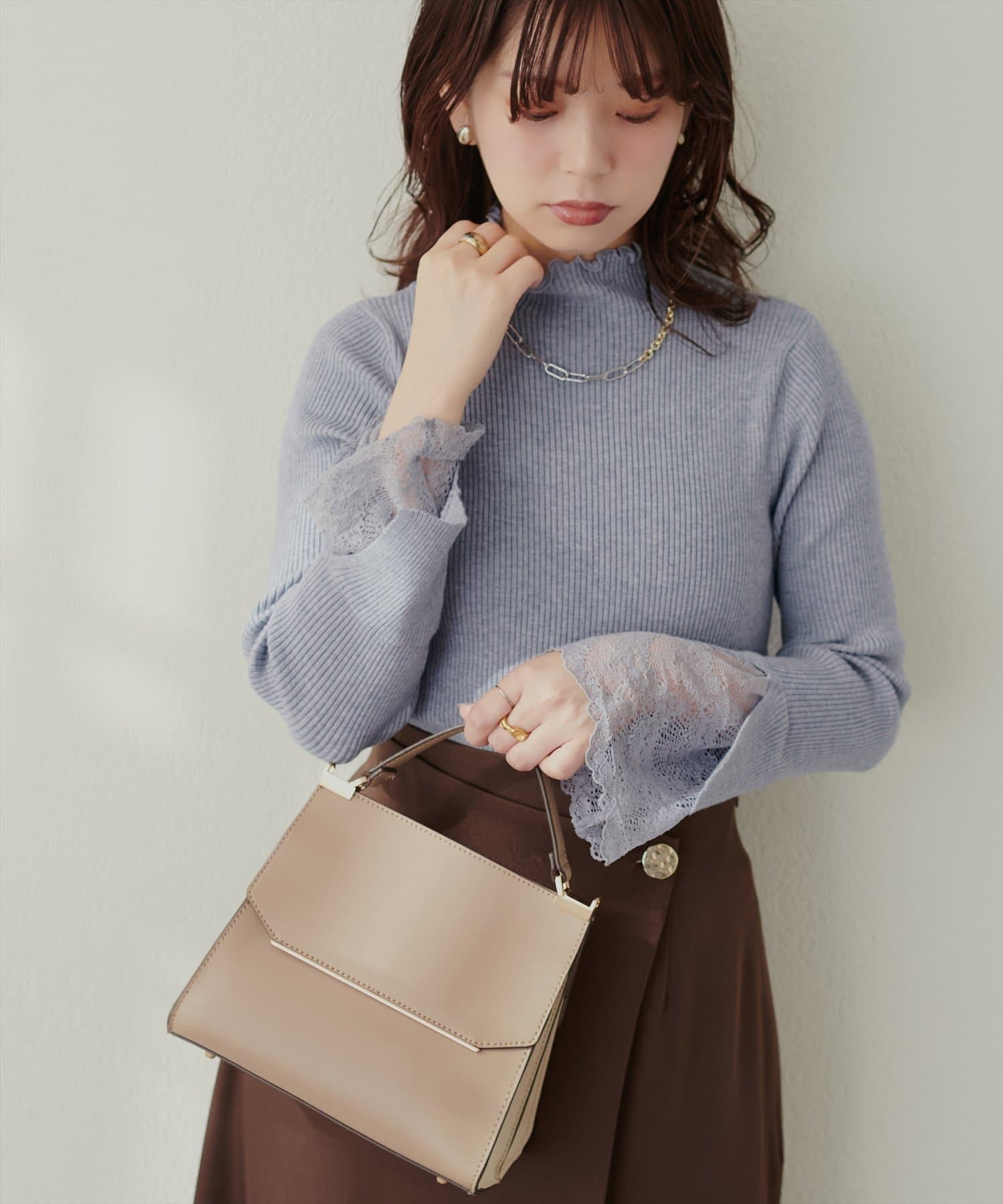 コーディネートを選ばないシンプルなリブニットに袖口のレース切替がフェミニンなハイネックニット。