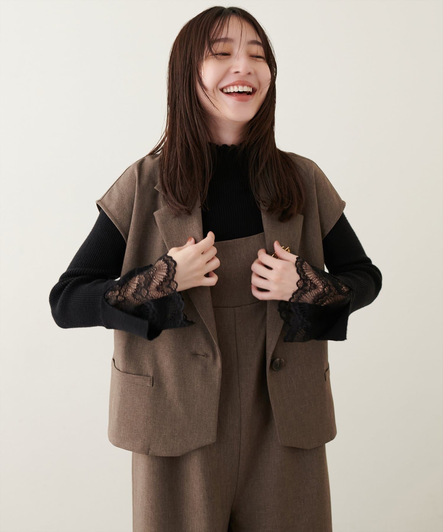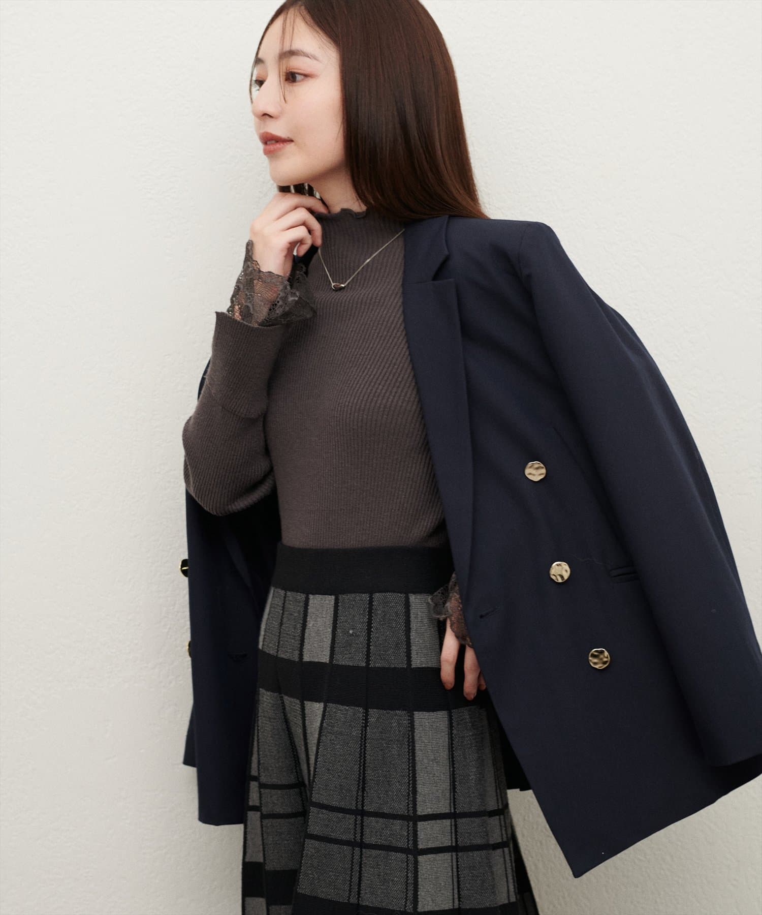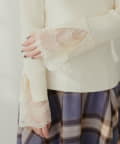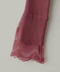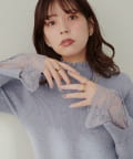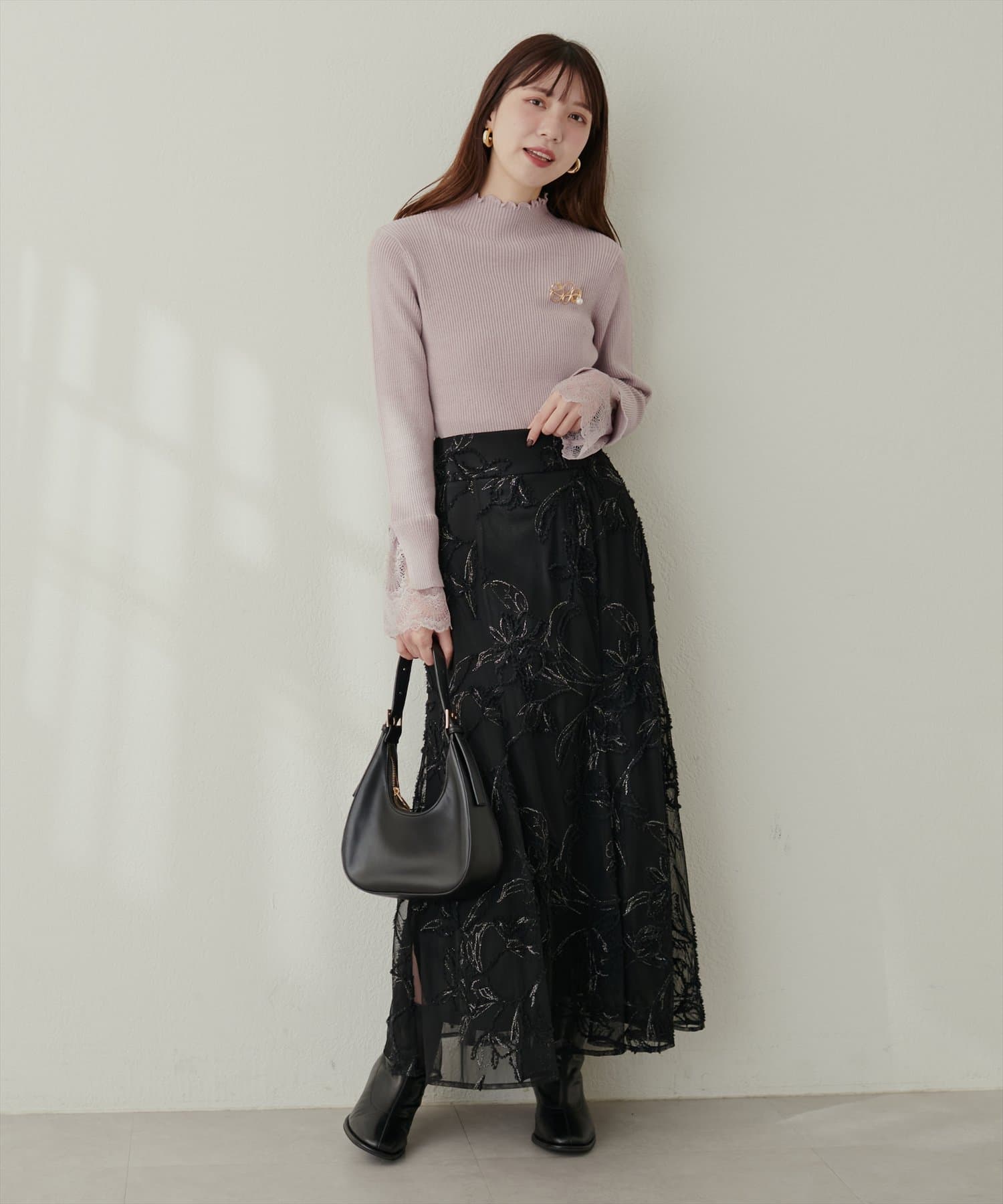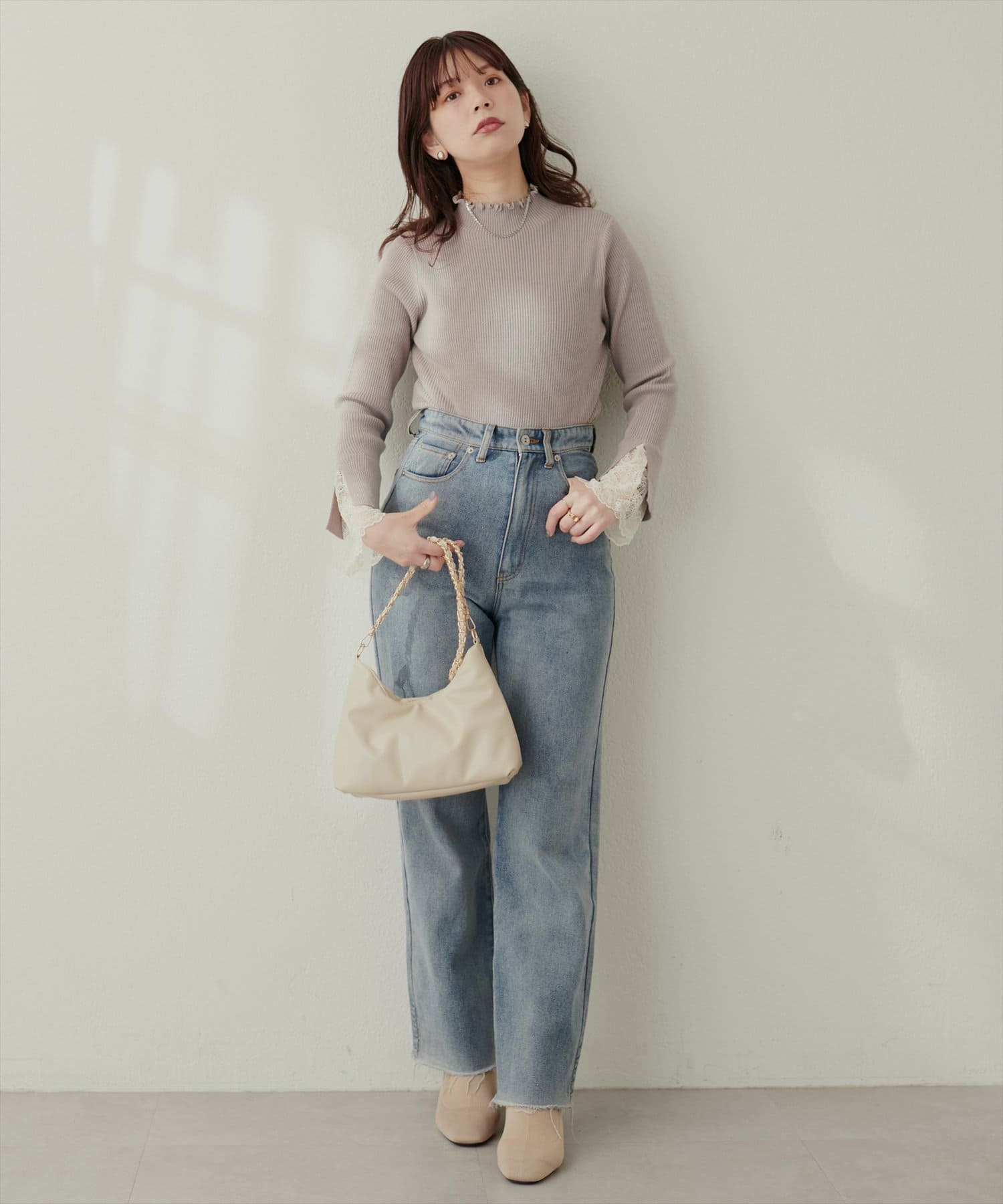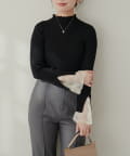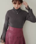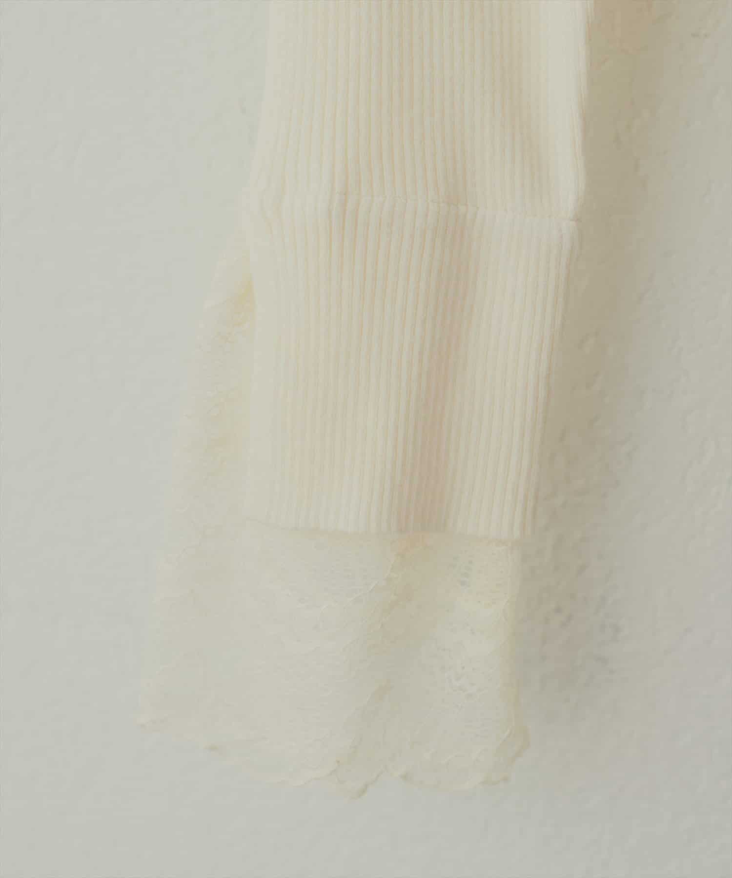 コーディネートを選ばないシンプルなリブニットに袖口のレース切替がフェミニンなハイネックニット。