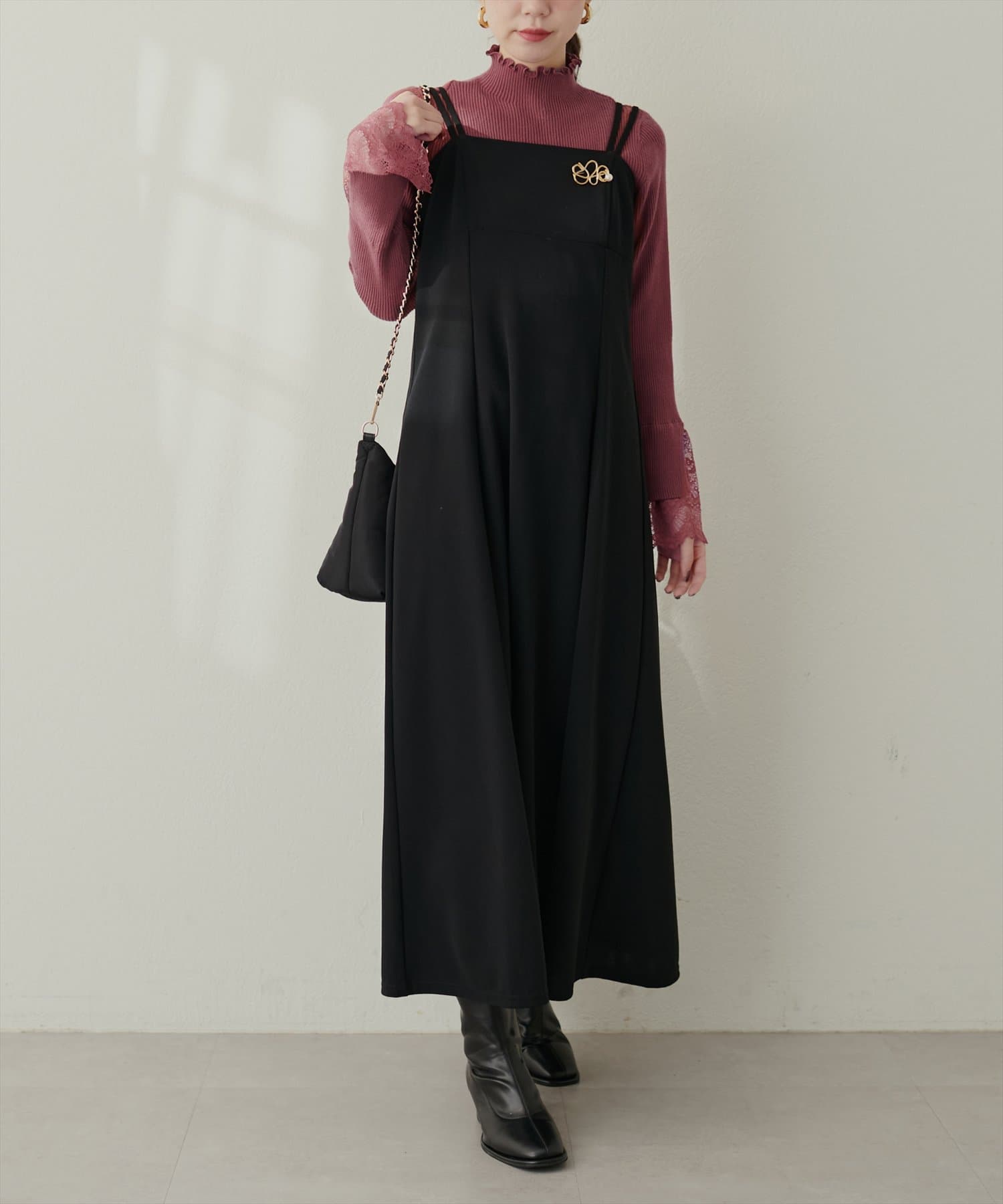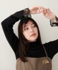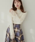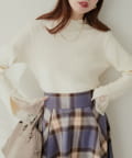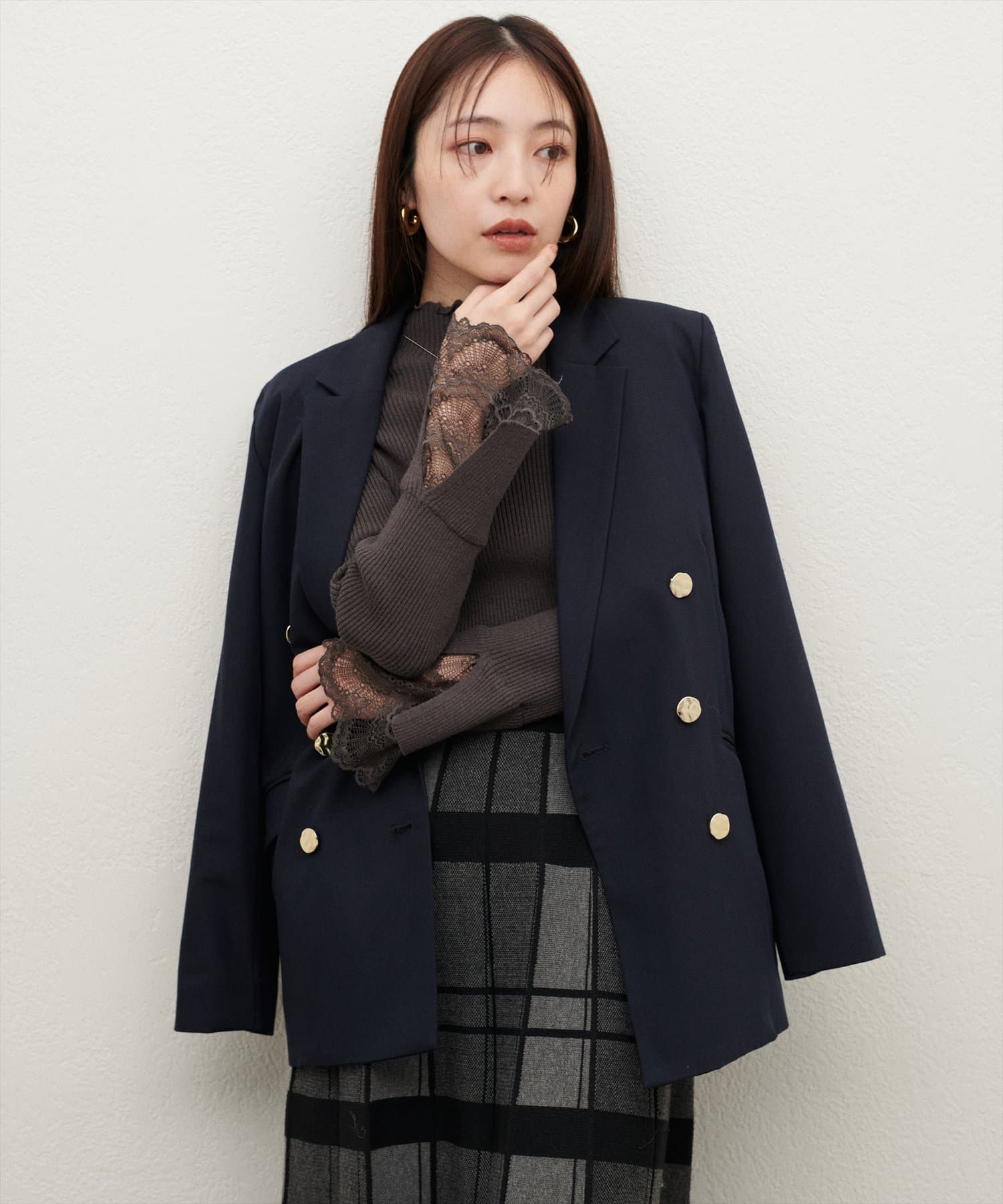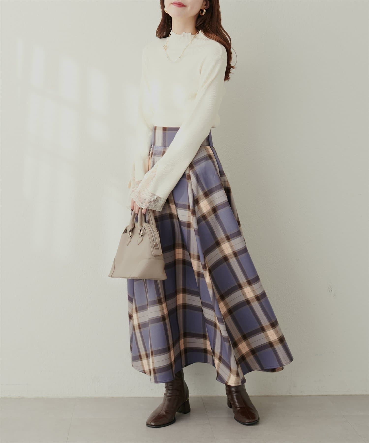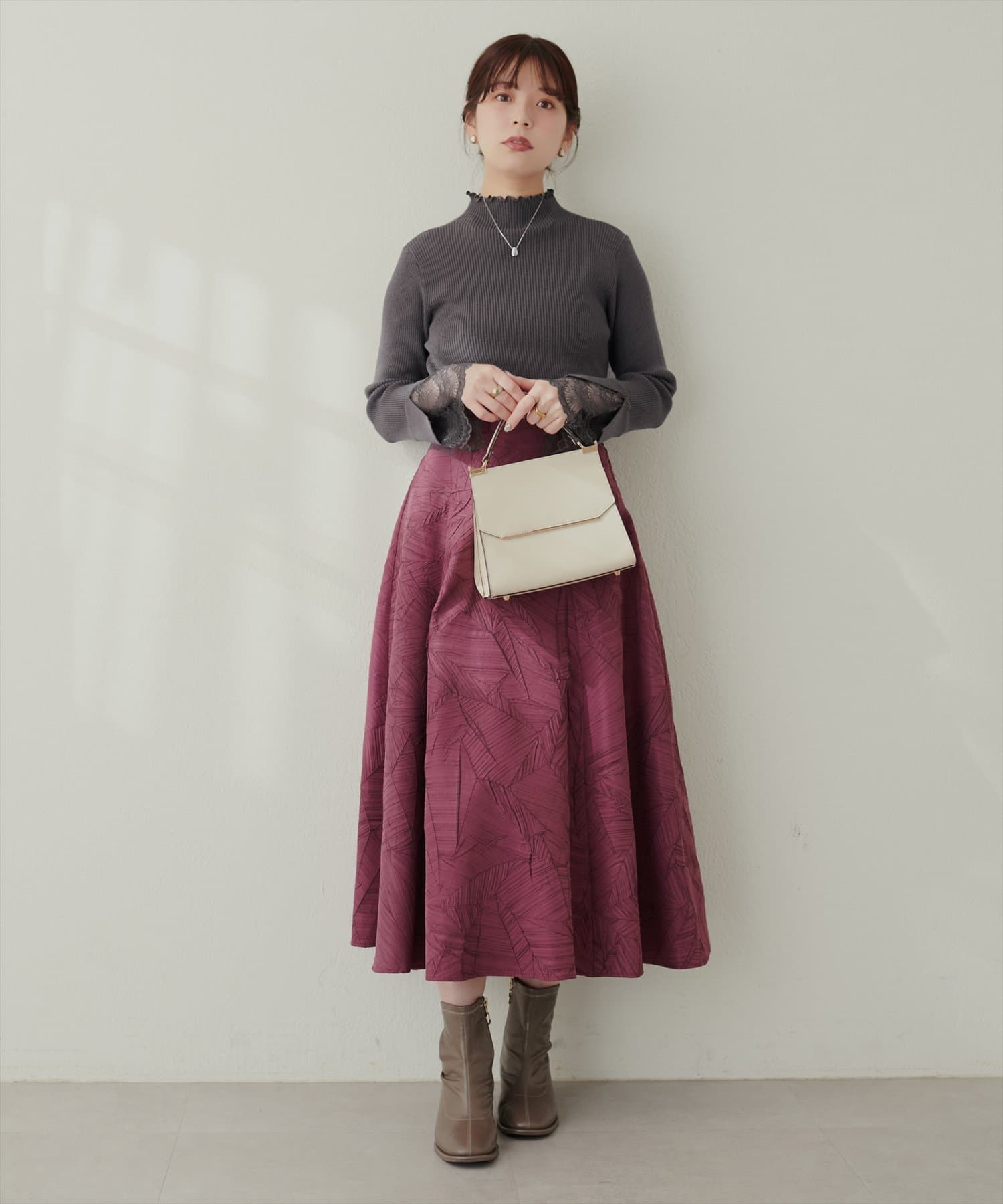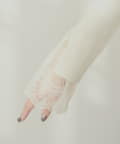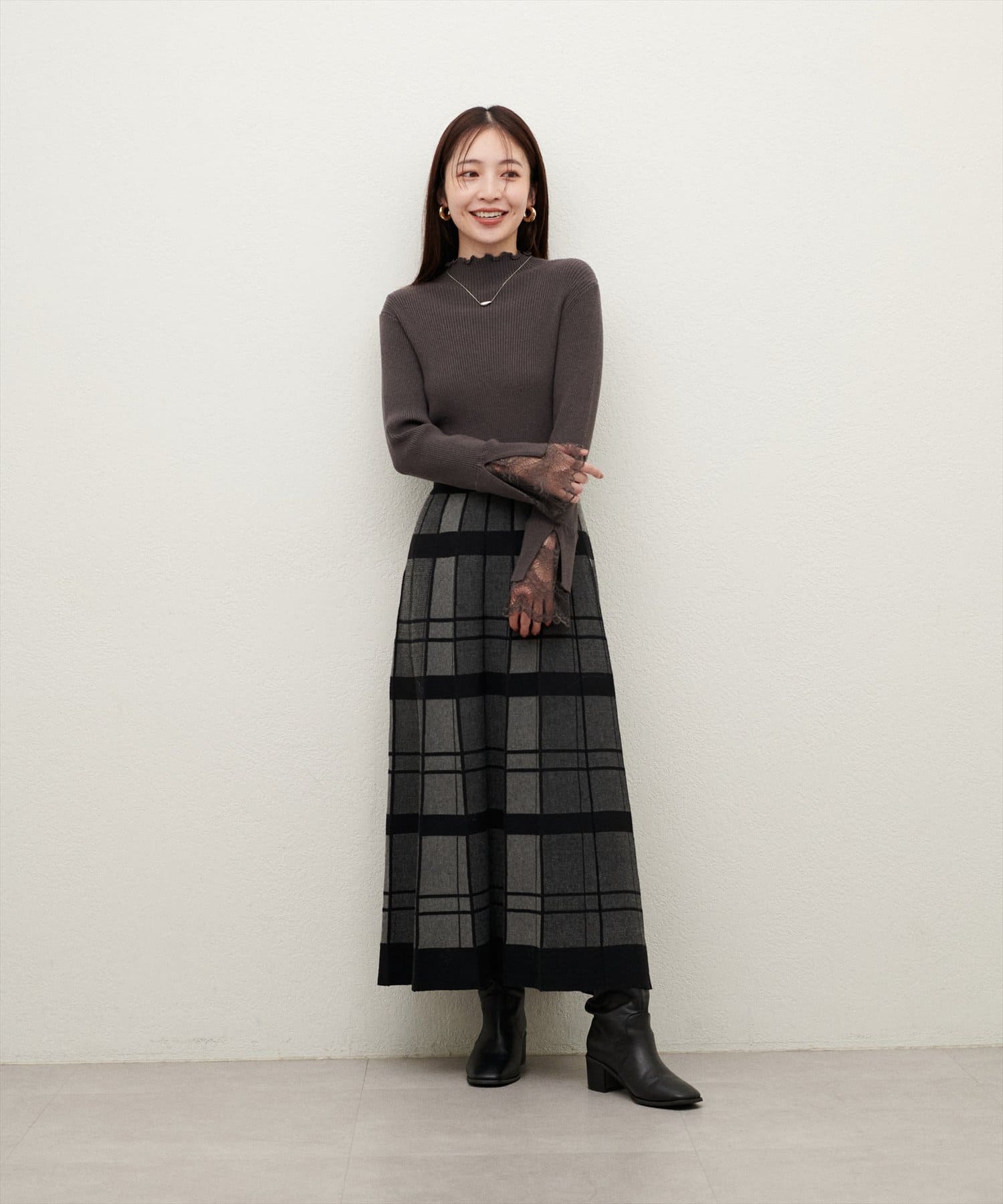 コーディネートを選ばないシンプルなリブニットに袖口のレース切替がフェミニンなハイネックニット。