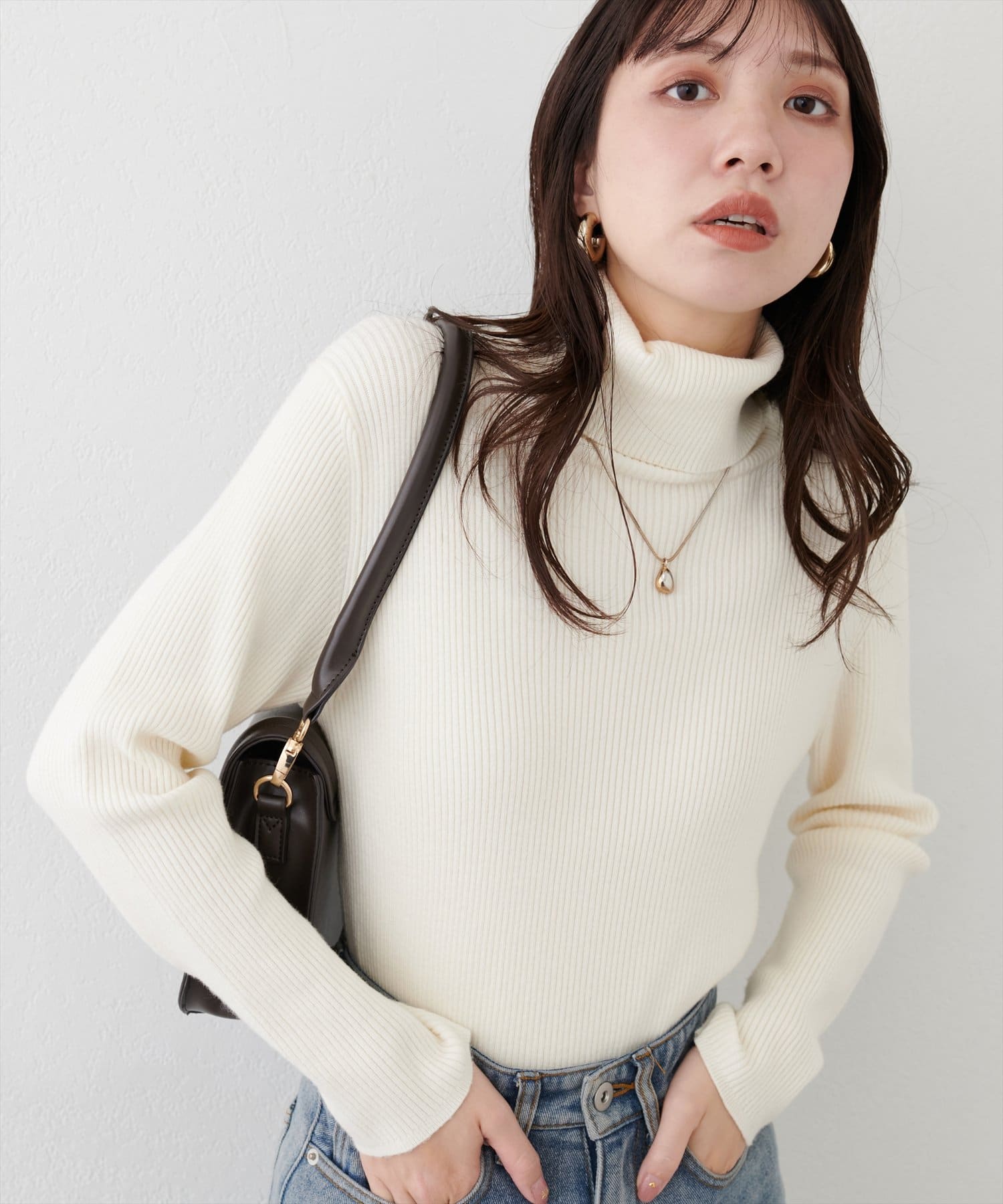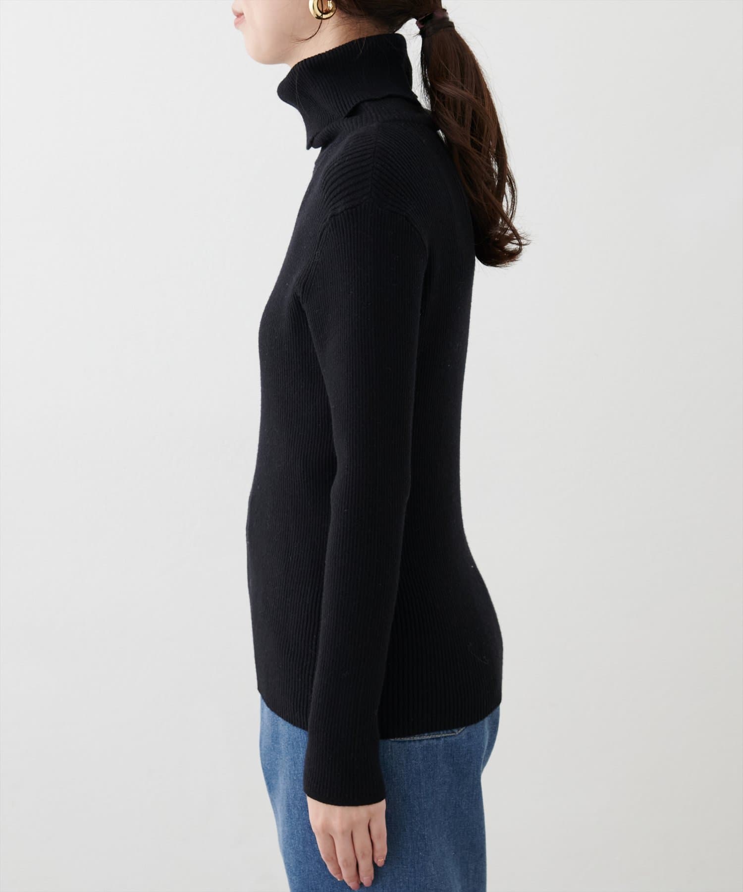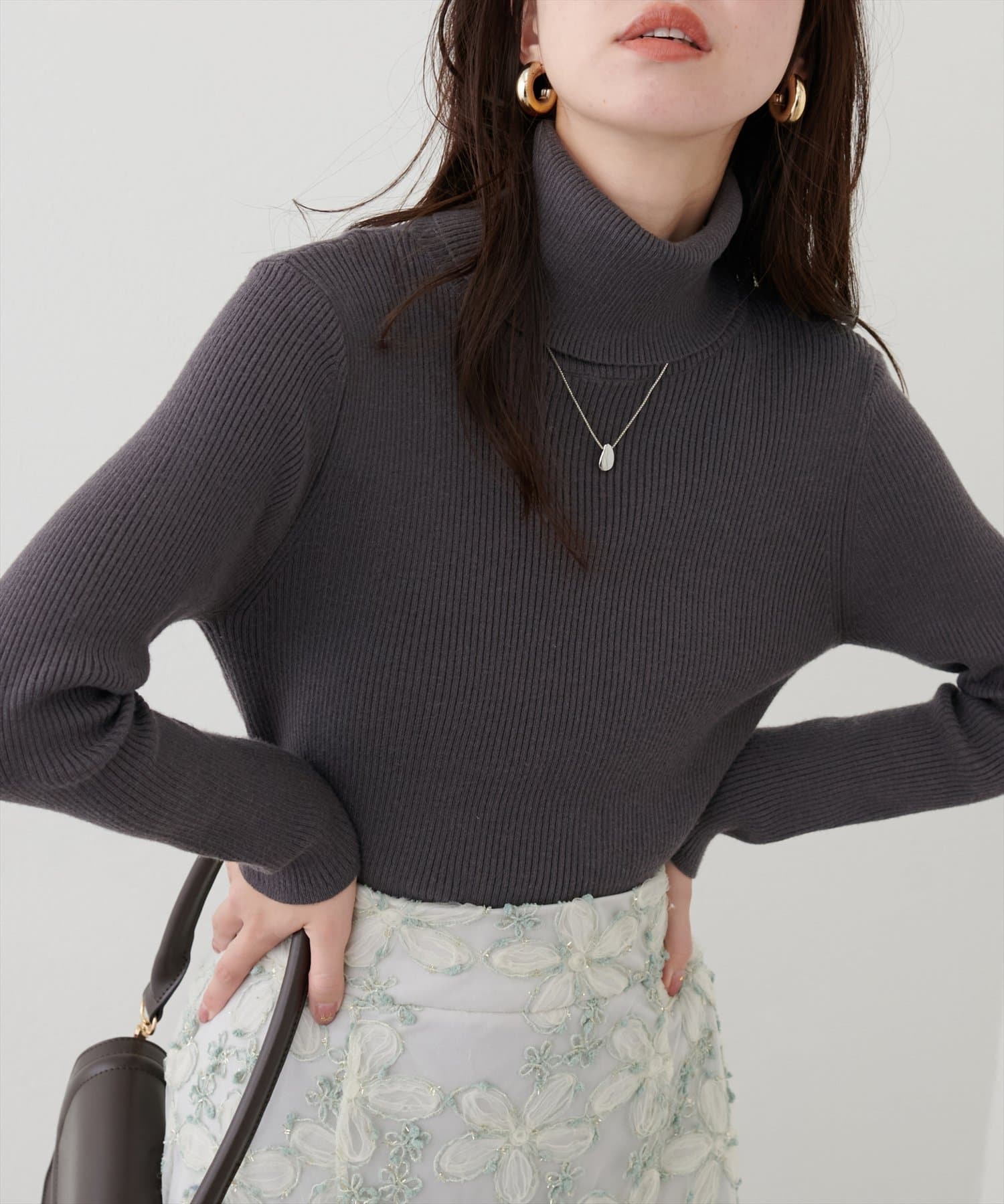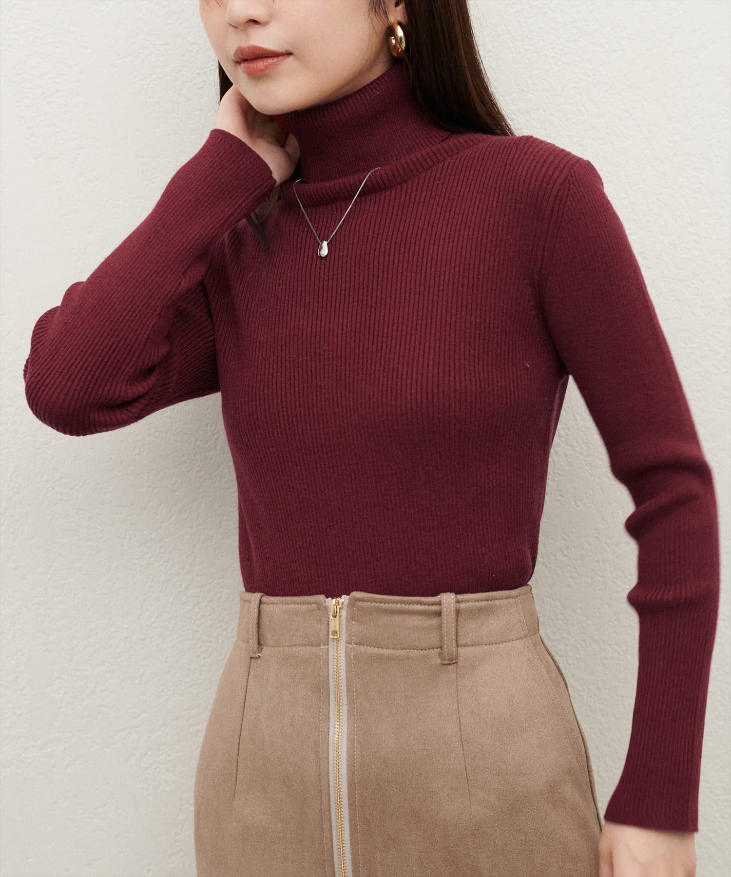 すっきりシンプルなデザインで着回しのきくリブタートルネック。