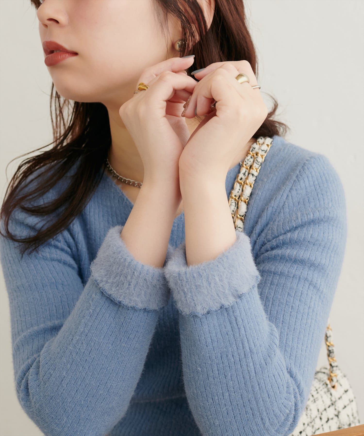 裏側が配色のシャギー素材になっていて、袖口を折返すと、異素材でさりげなくこなれ感を演出してくれます。